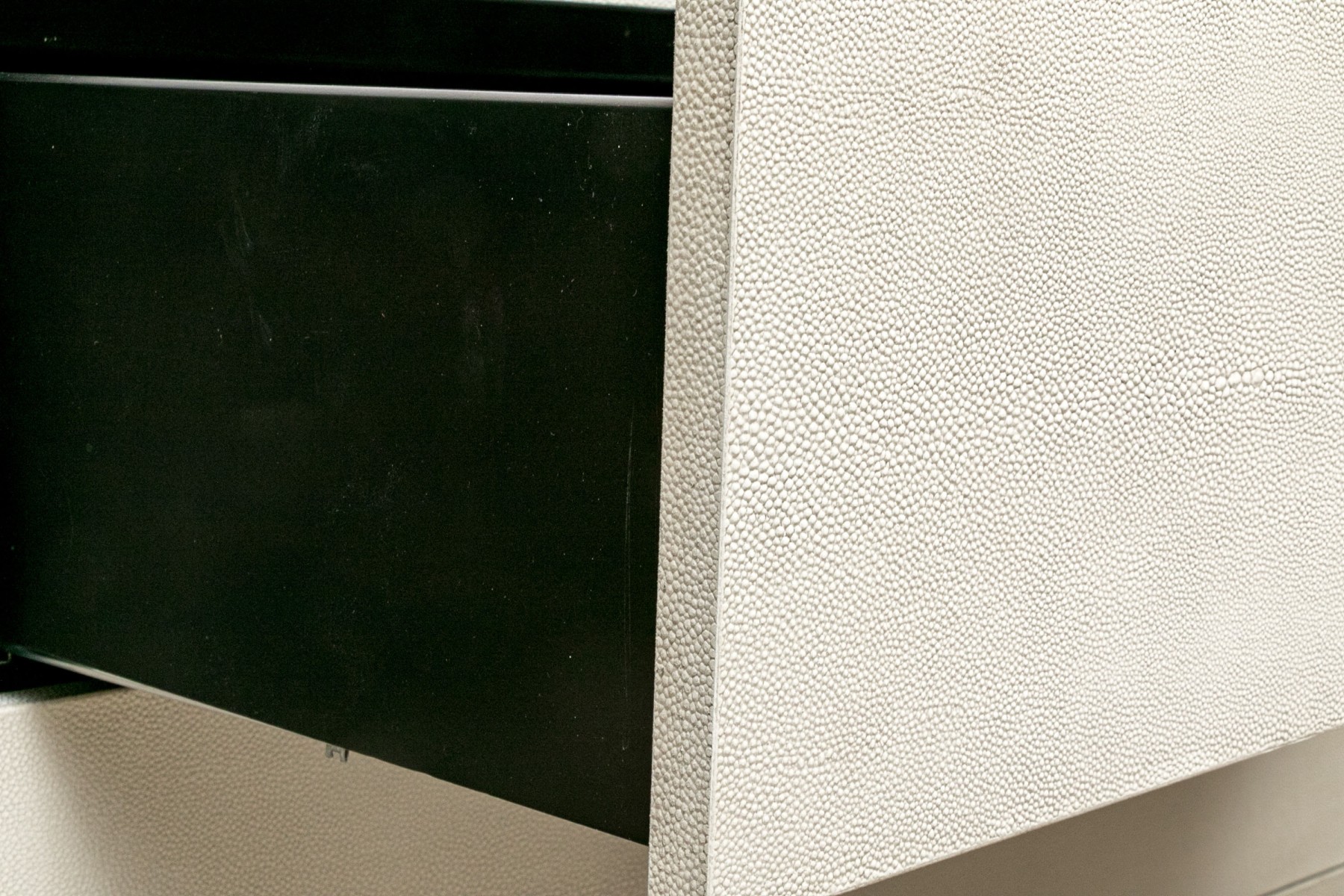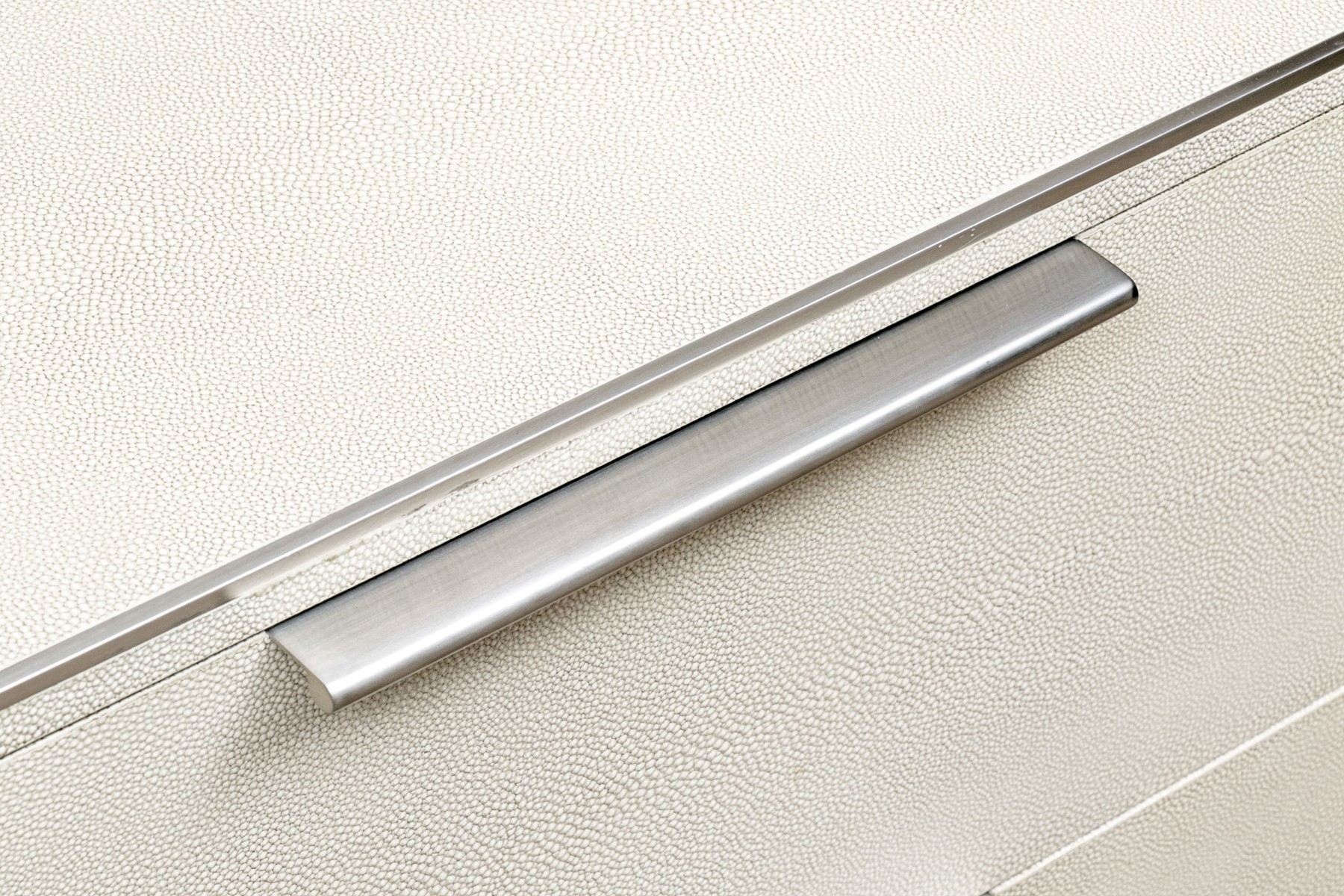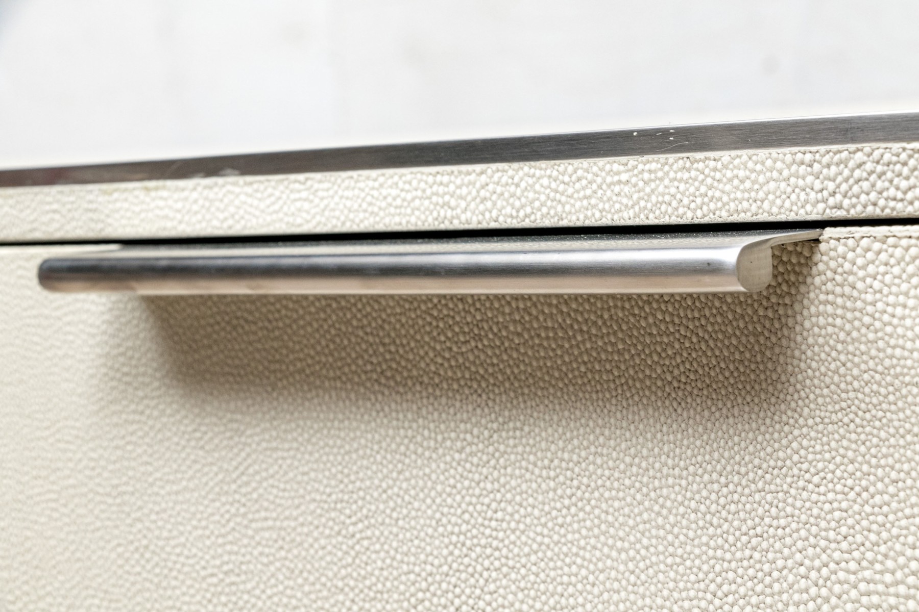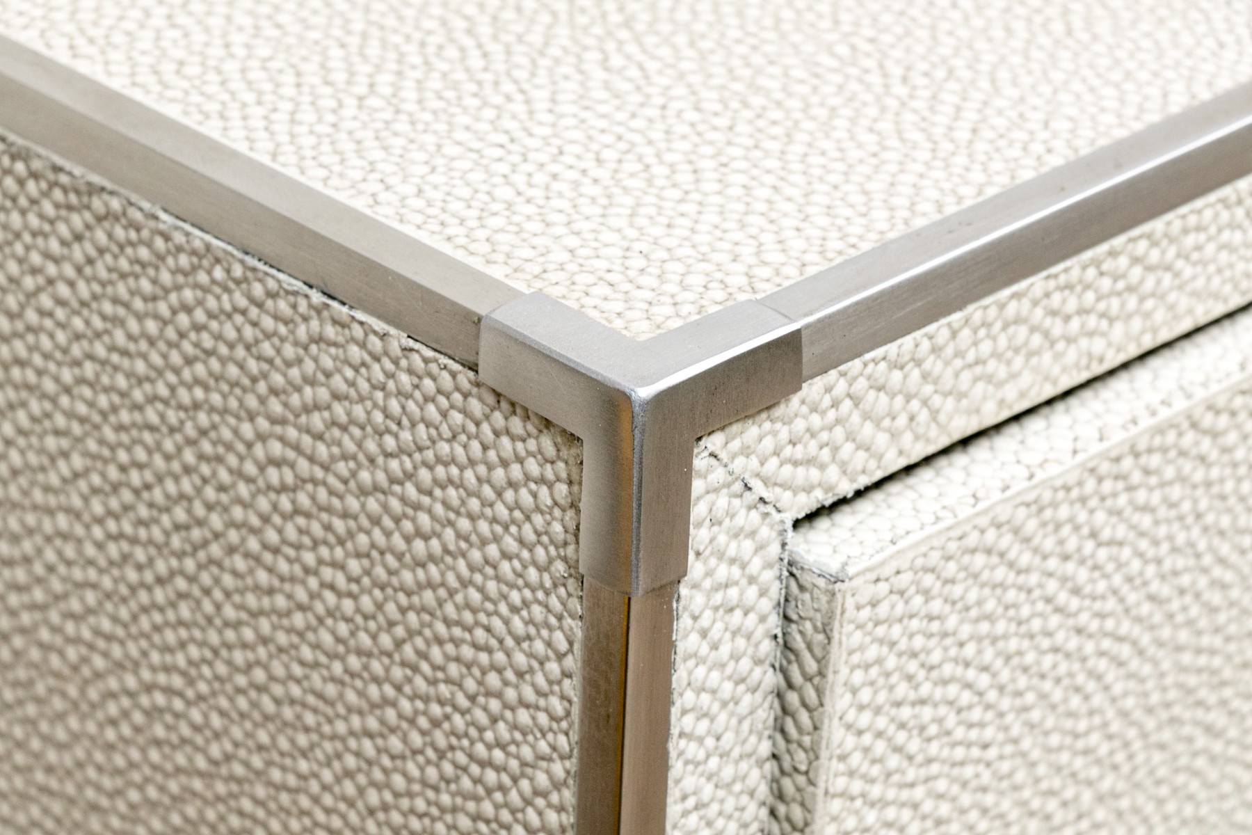 A pale faux shagreen covered chest with elegant metal trim on the top and side edges. Matching flat metal drawer pulls.