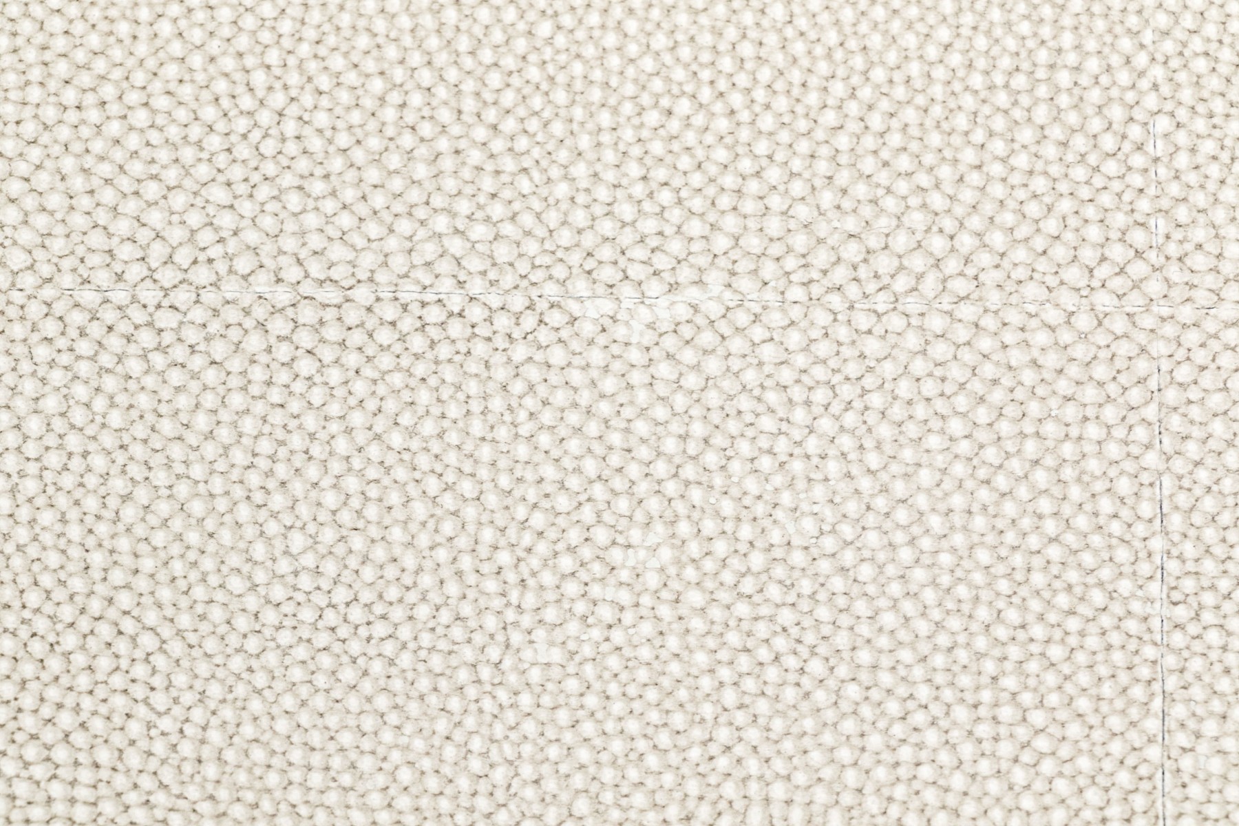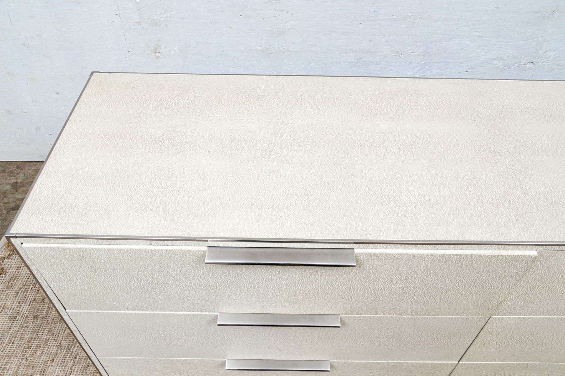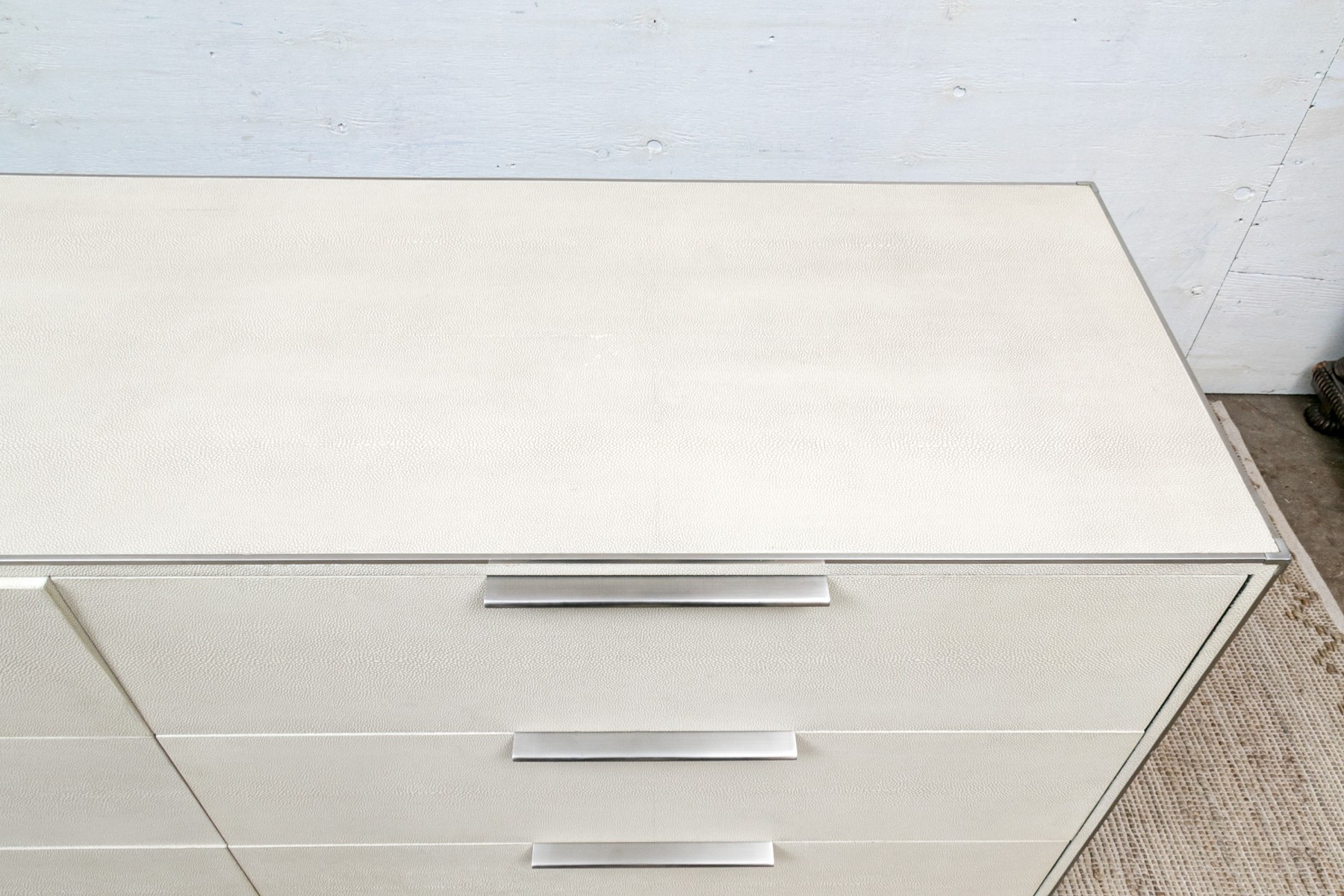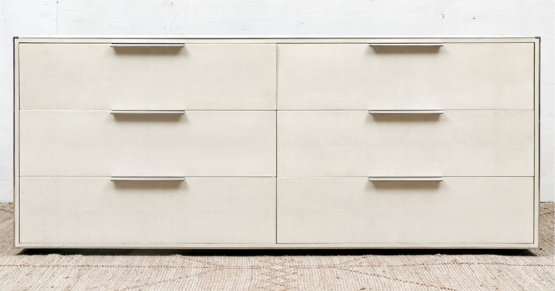 A pale faux shagreen covered chest with elegant metal trim on the top and side edges. Matching flat metal drawer pulls.