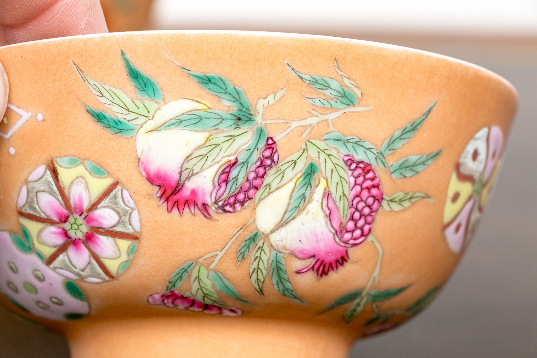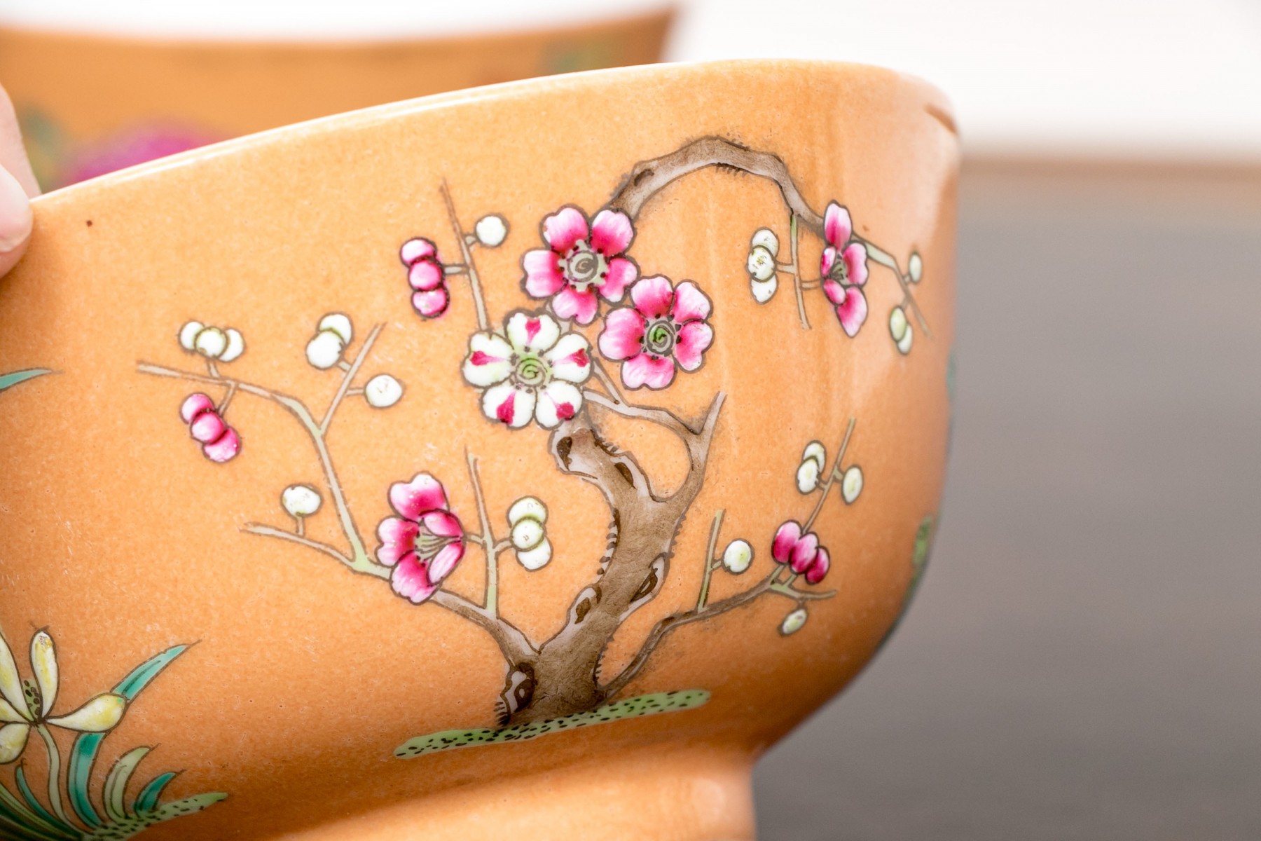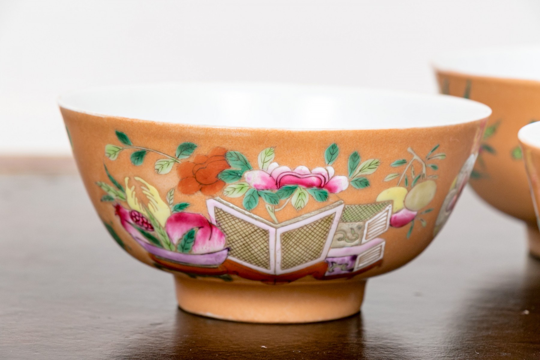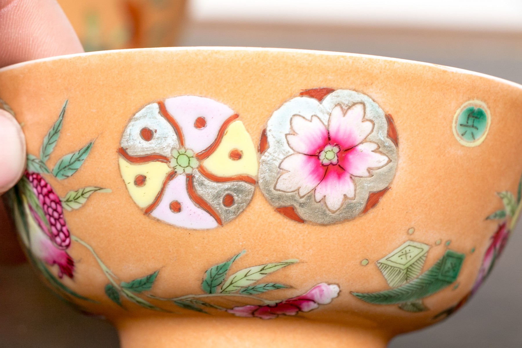 Condition: Very minor wear overall with minor nics and rim frits to the mouth trim and gentle wear to the enameled finish but overall presents really well as a lot of four tea bowls.