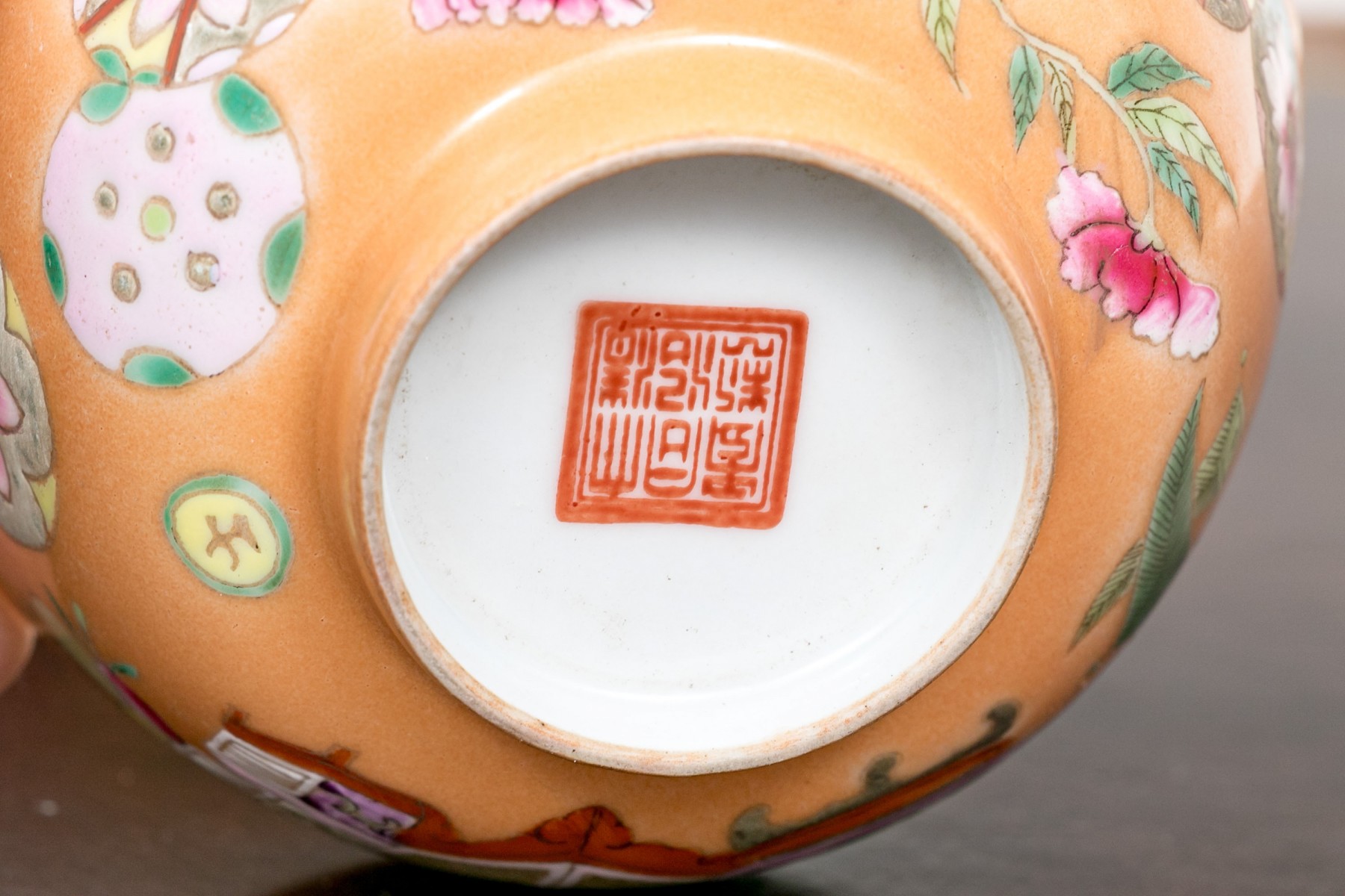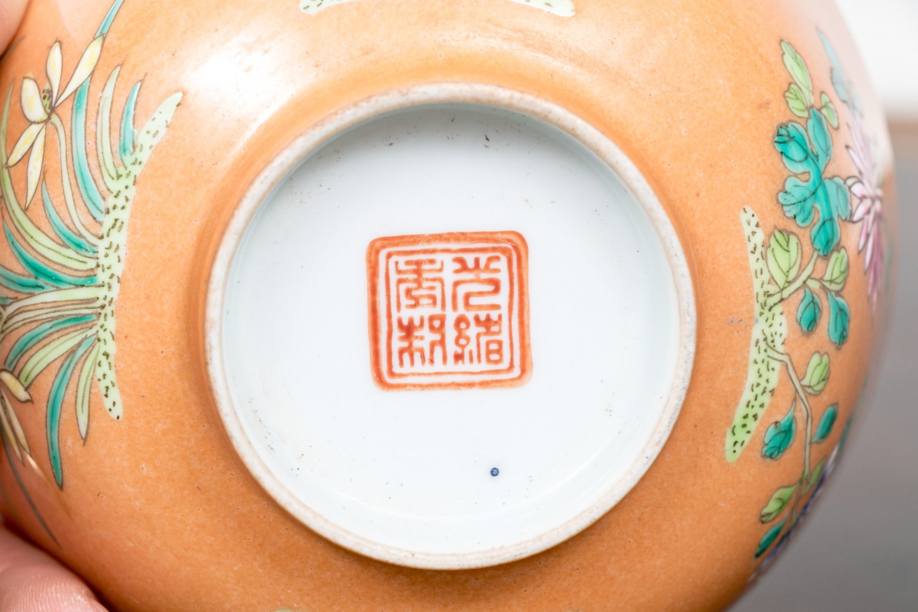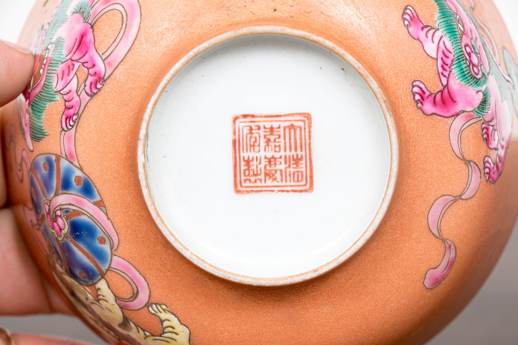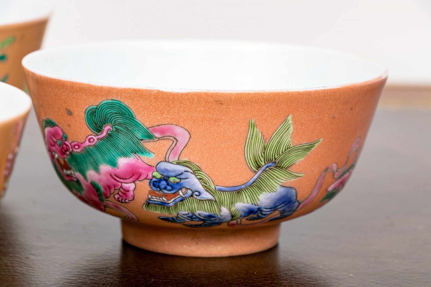 Condition: Very minor wear overall with minor nics and rim frits to the mouth trim and gentle wear to the enameled finish but overall presents really well as a lot of four tea bowls.