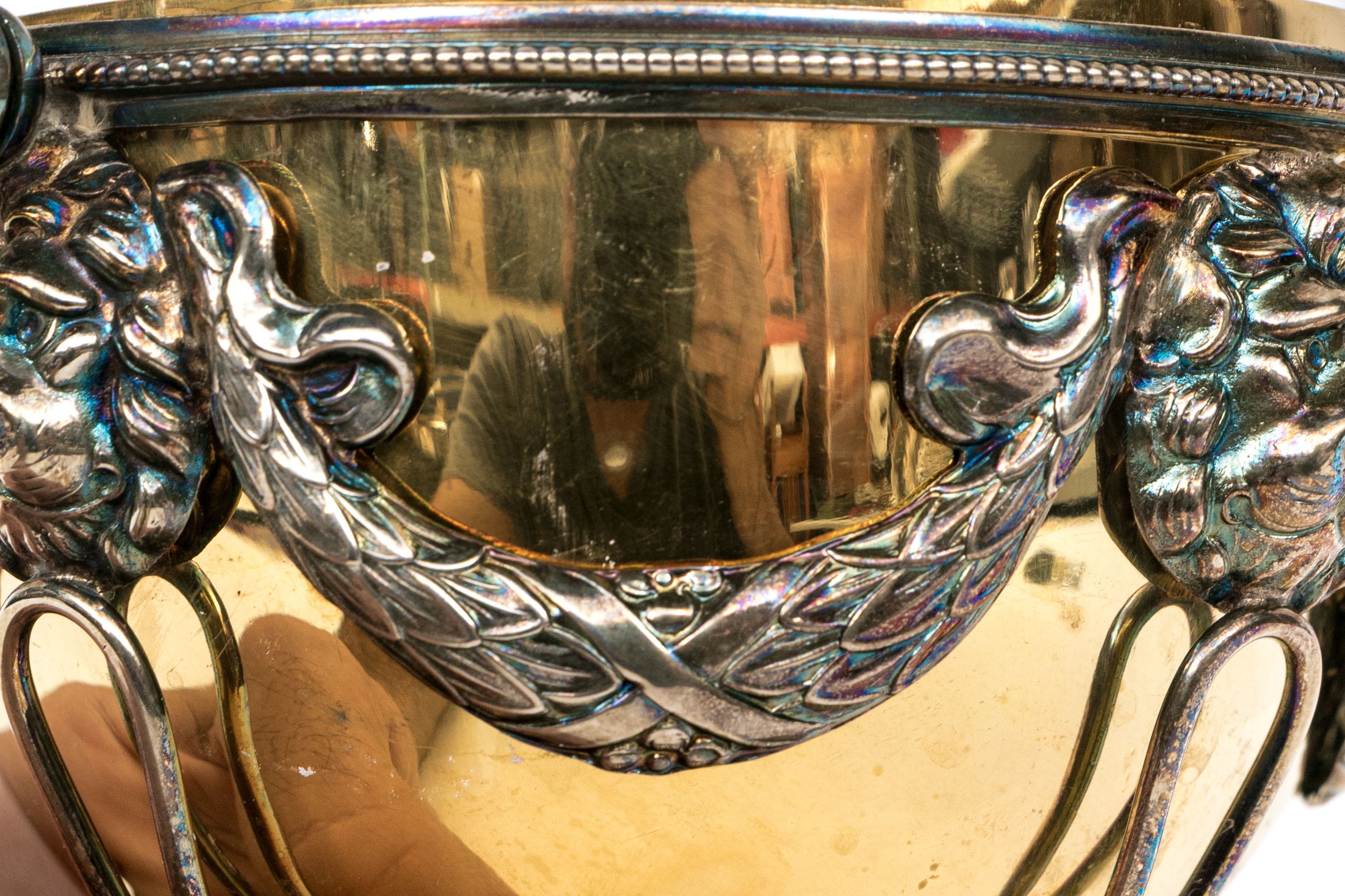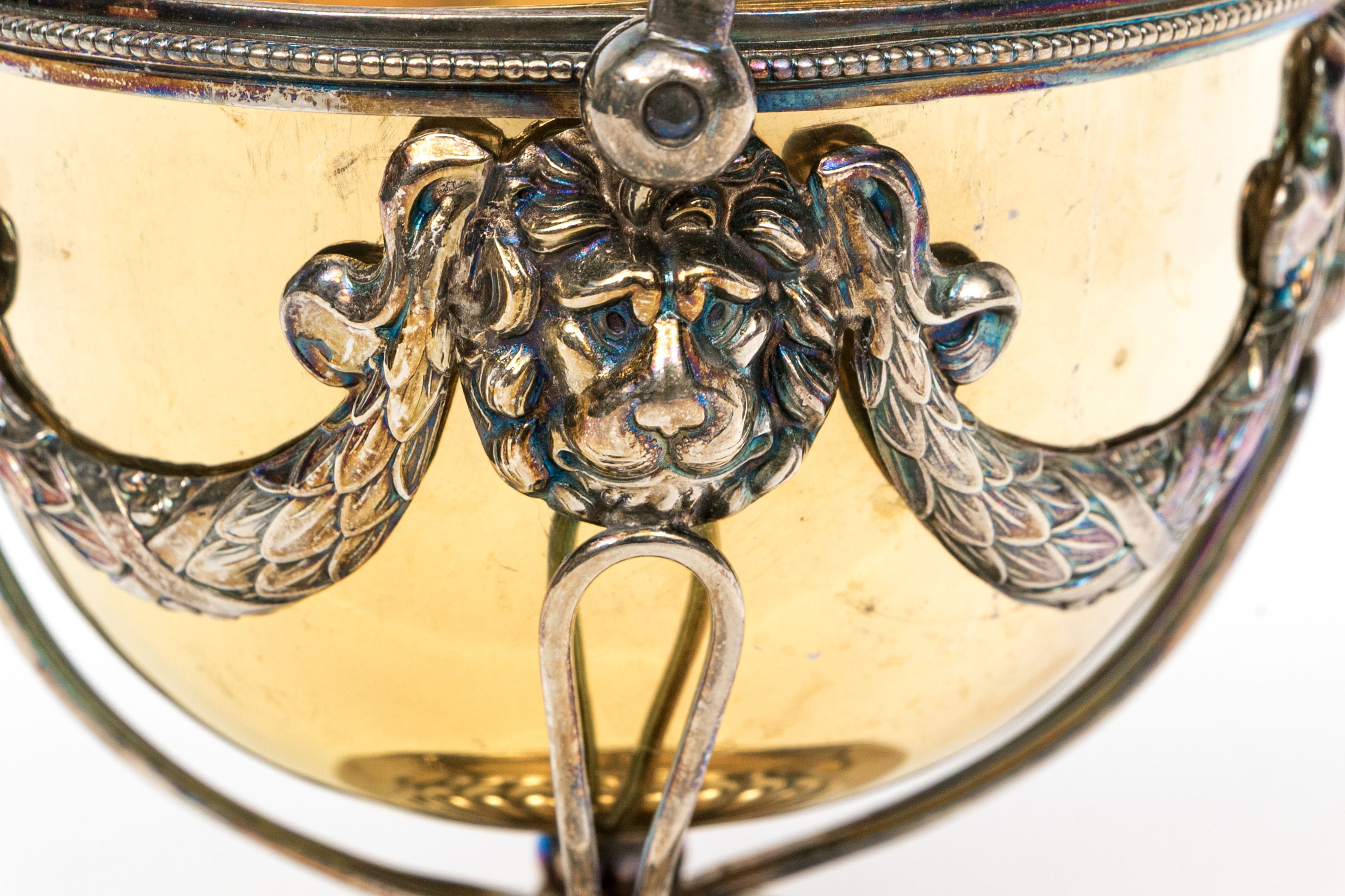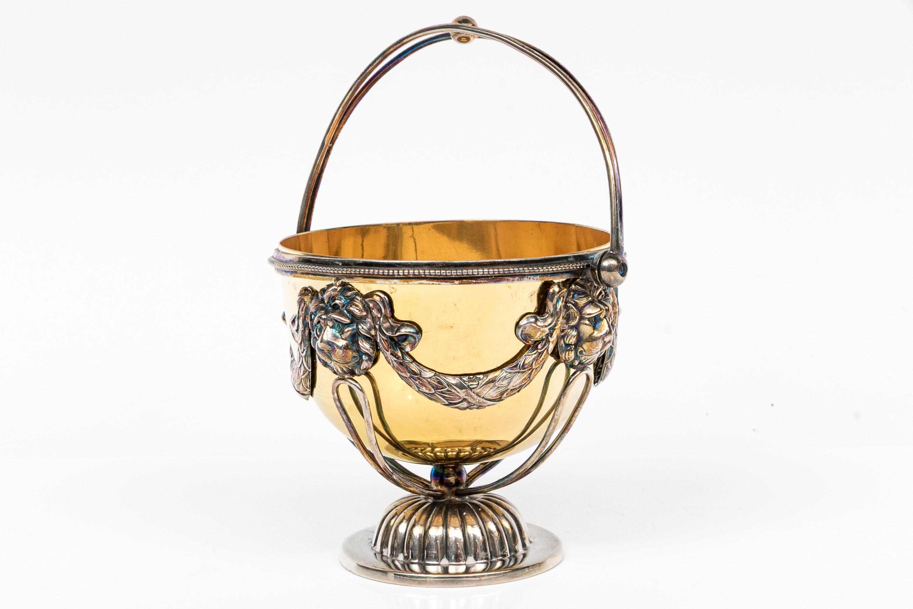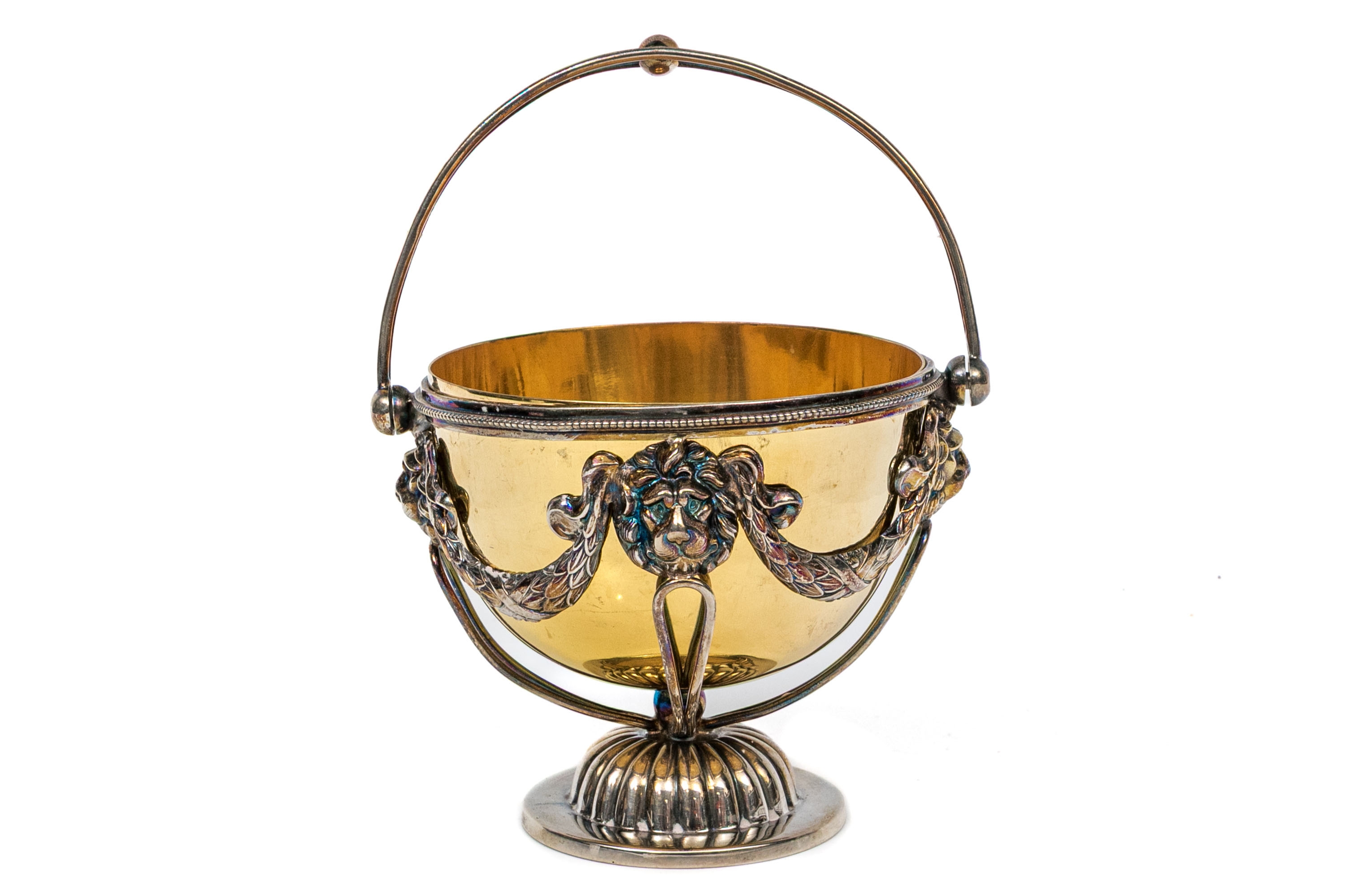 A footed cup- shaped bowl with applied high relief swags and lion masks. With four open supports on a ribbed foot. With a swing handle.