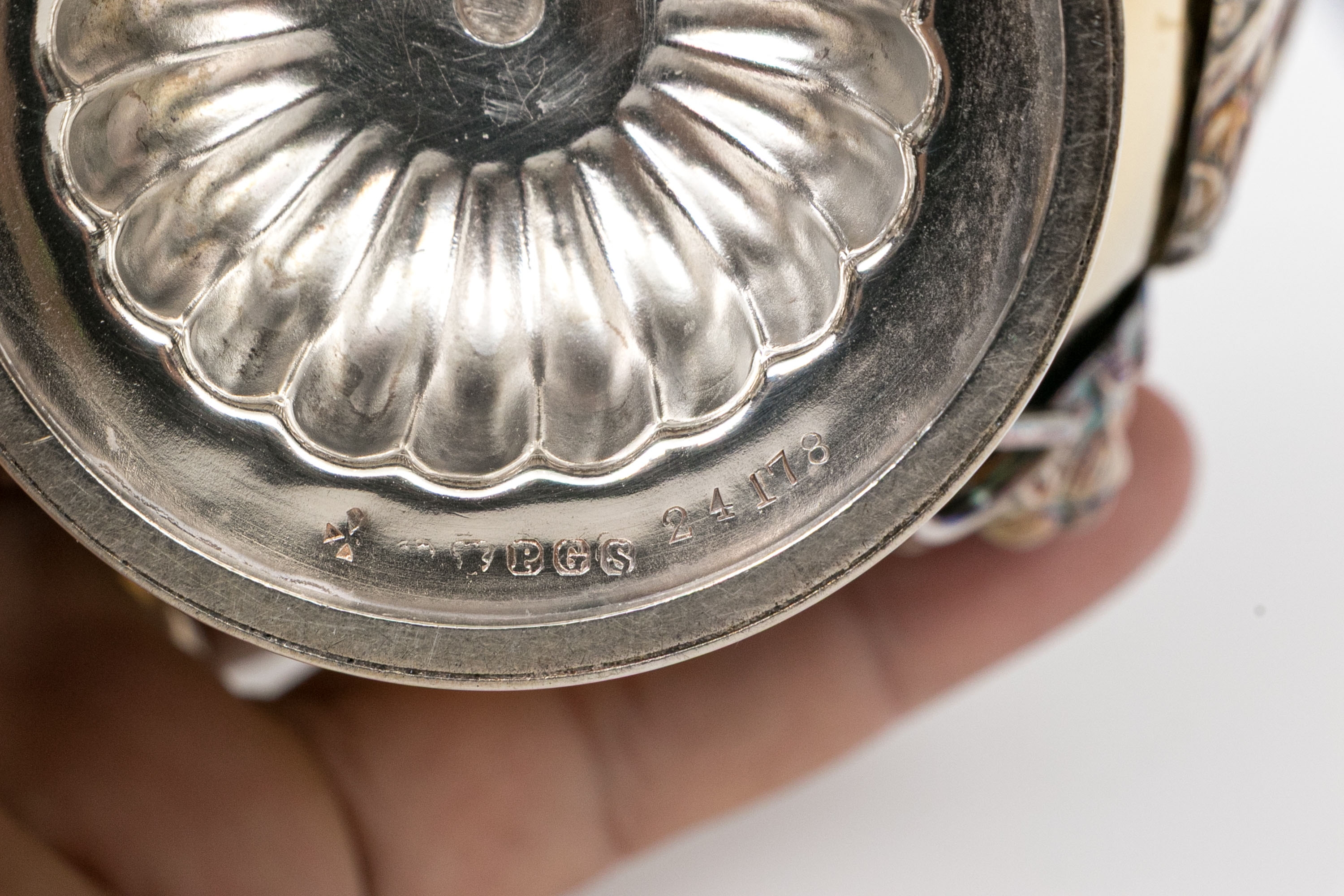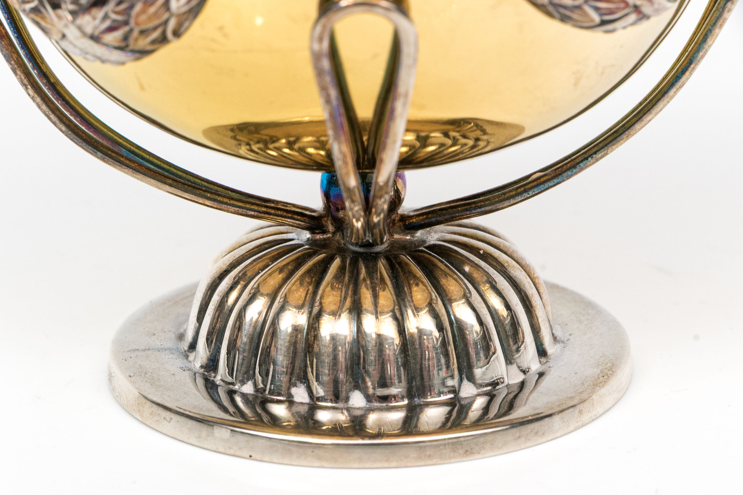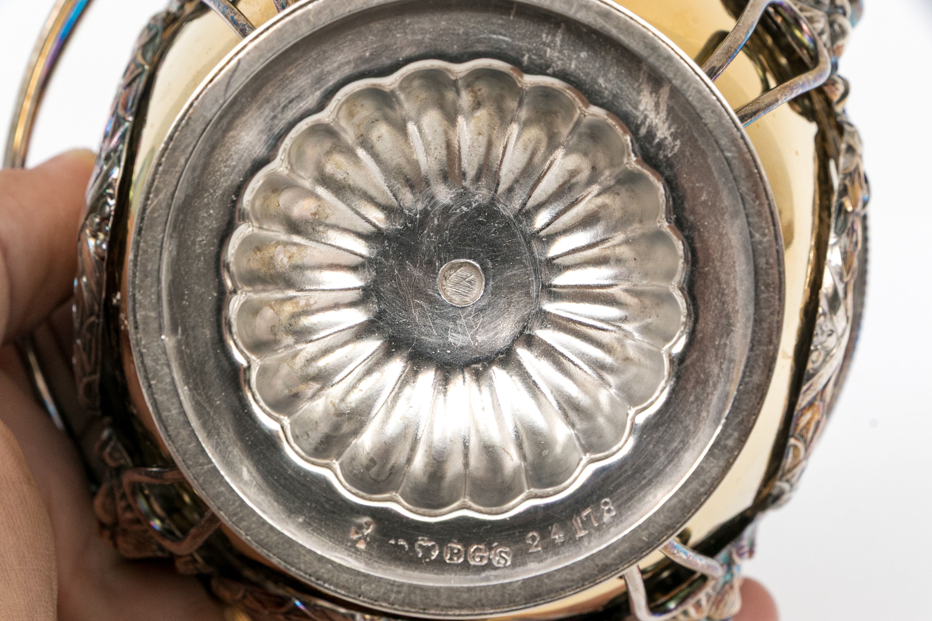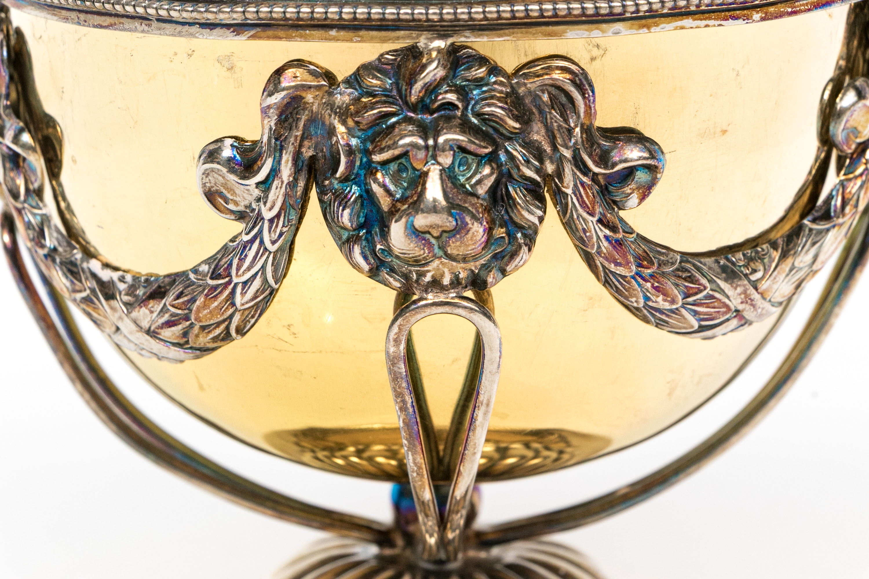 A footed cup- shaped bowl with applied high relief swags and lion masks. With four open supports on a ribbed foot. With a swing handle.