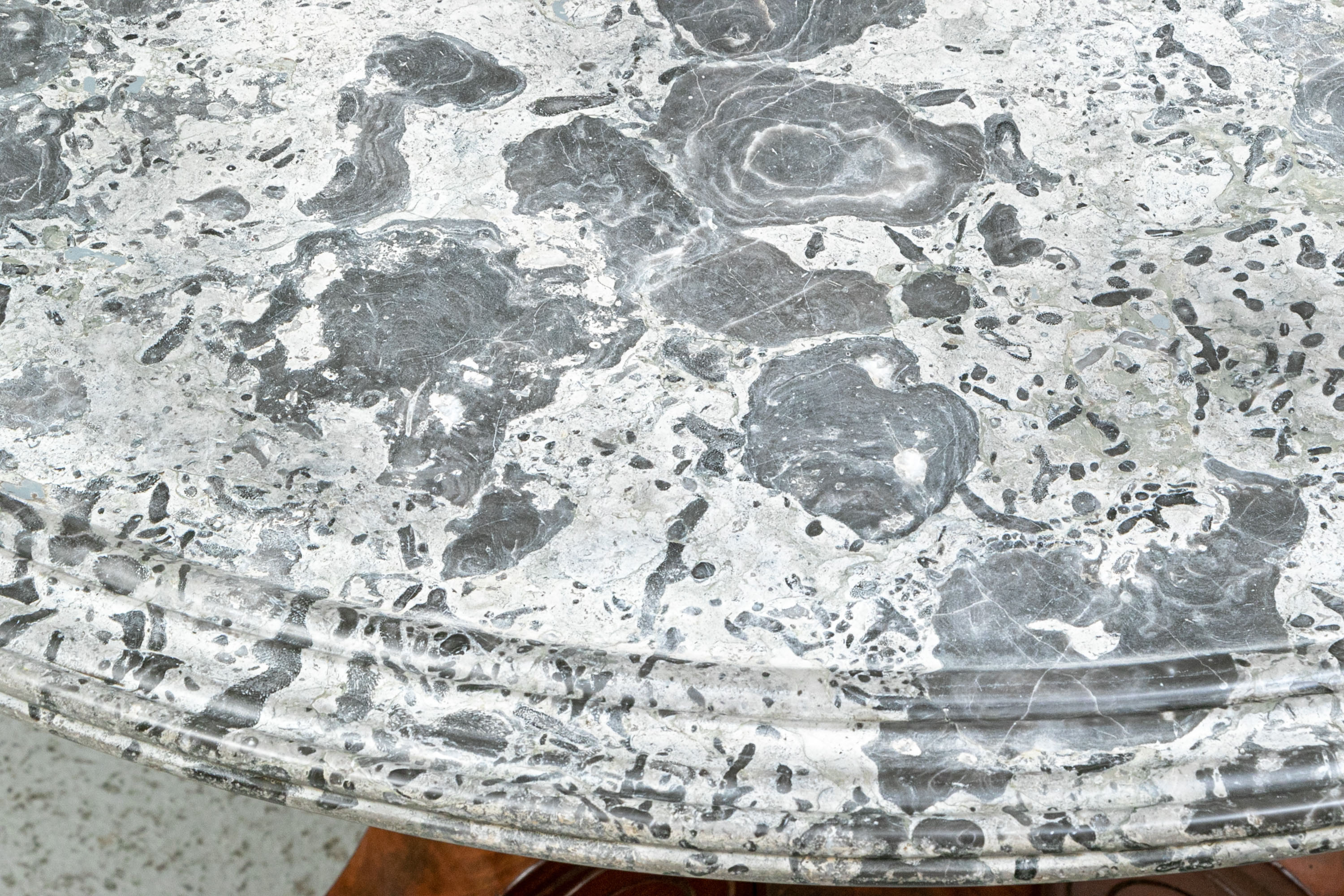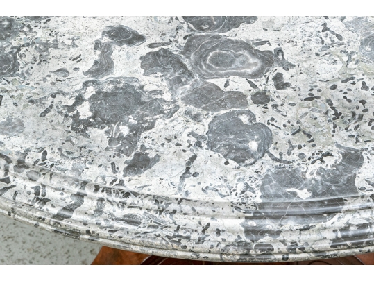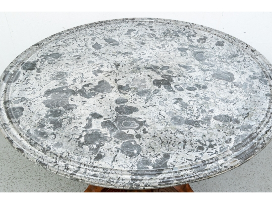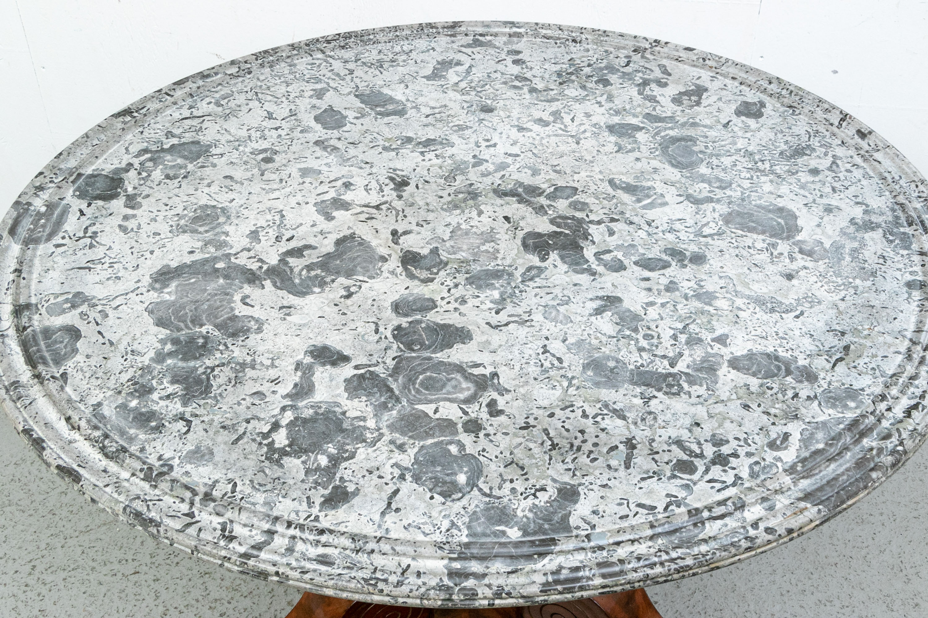 With a gray fossilized stone top with carved edge. Mounted on a fine faceted baluster support and carved tripod base. The carved scrolled upper legs end in carved half rosettes. Mounted on the three legs ending in carved lion's paw feet on casters. Wonderful patina.