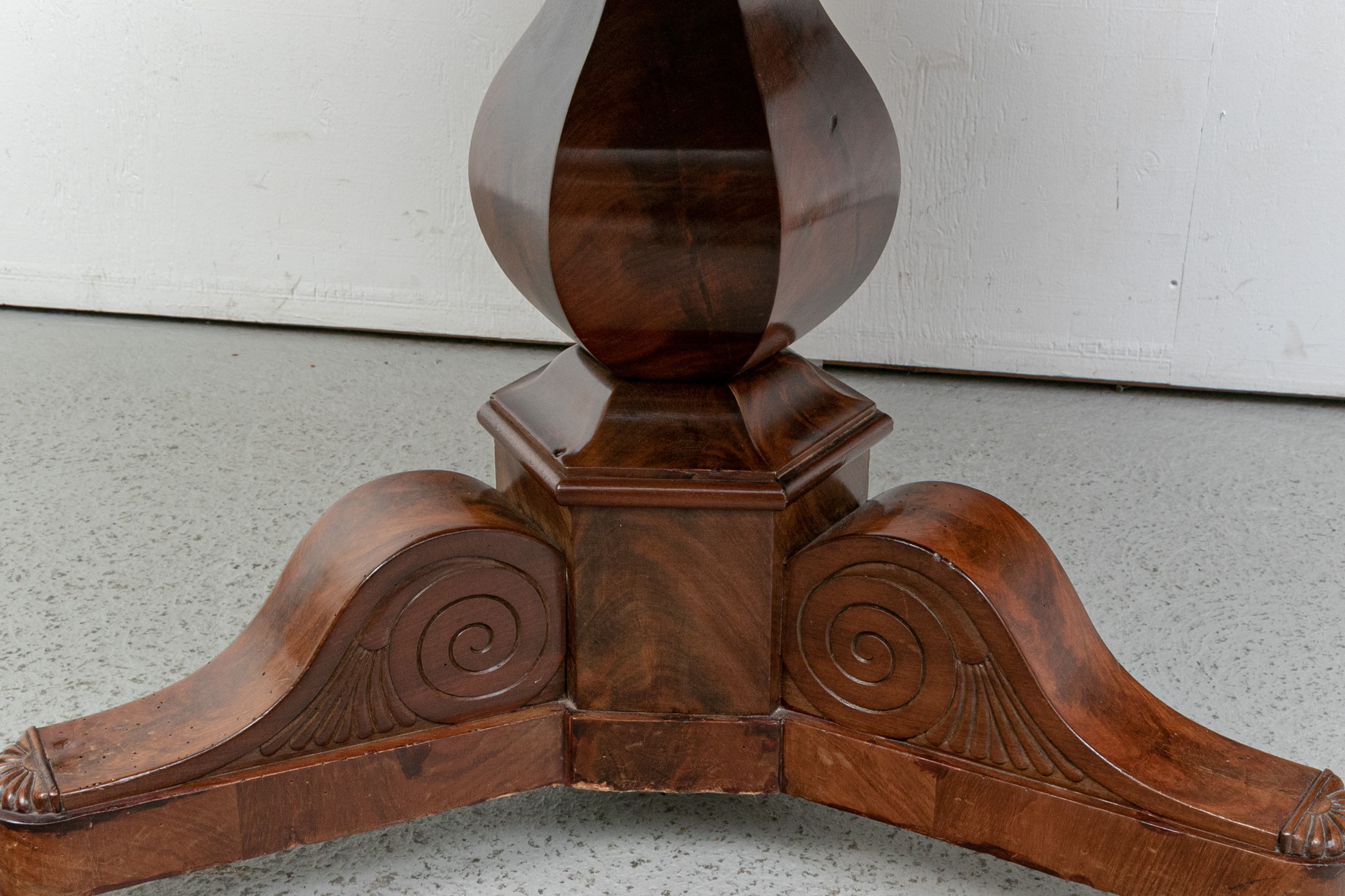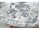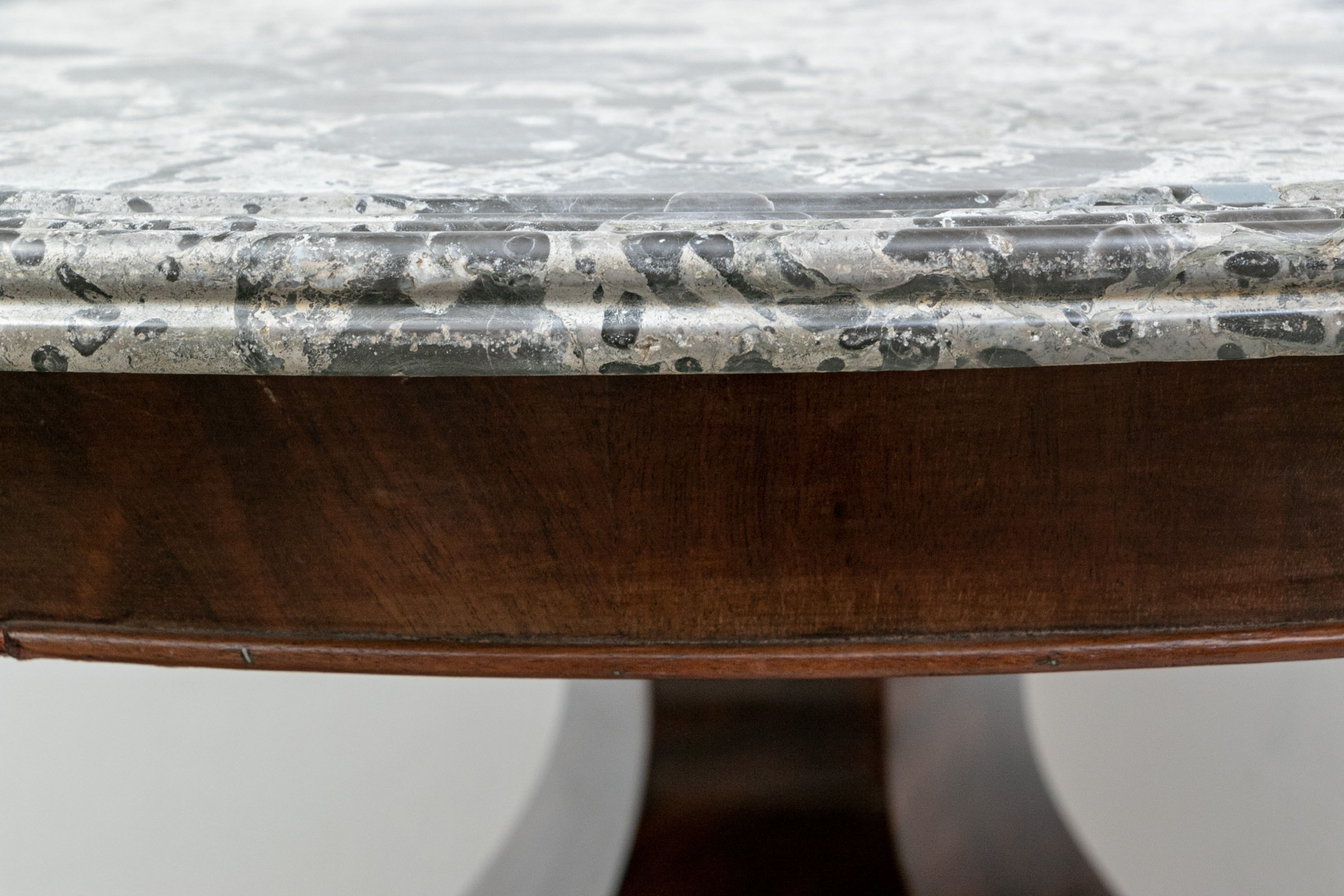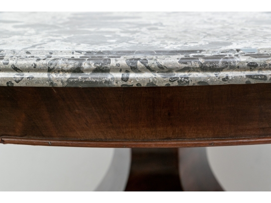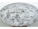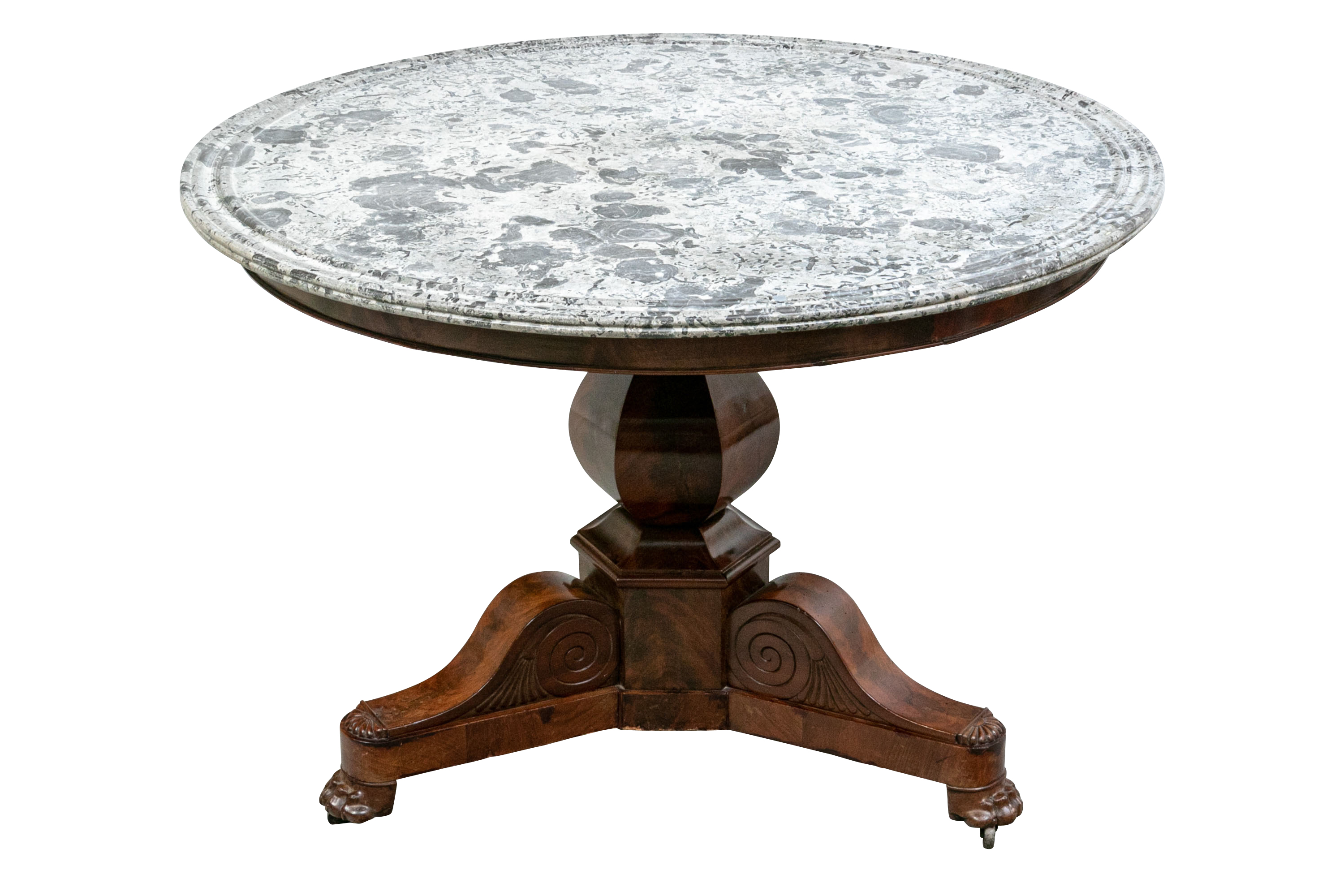 With a gray fossilized stone top with carved edge. Mounted on a fine faceted baluster support and carved tripod base. The carved scrolled upper legs end in carved half rosettes. Mounted on the three legs ending in carved lion's paw feet on casters. Wonderful patina.