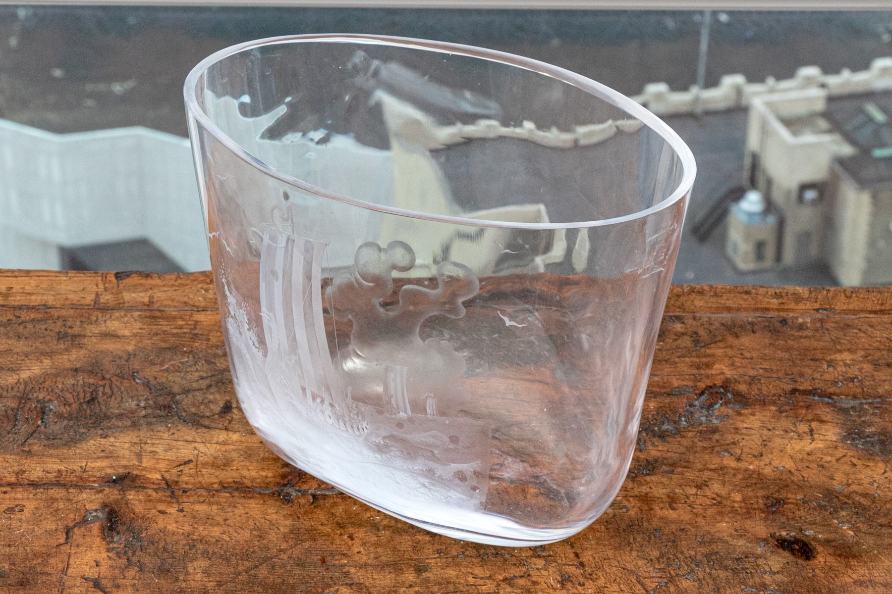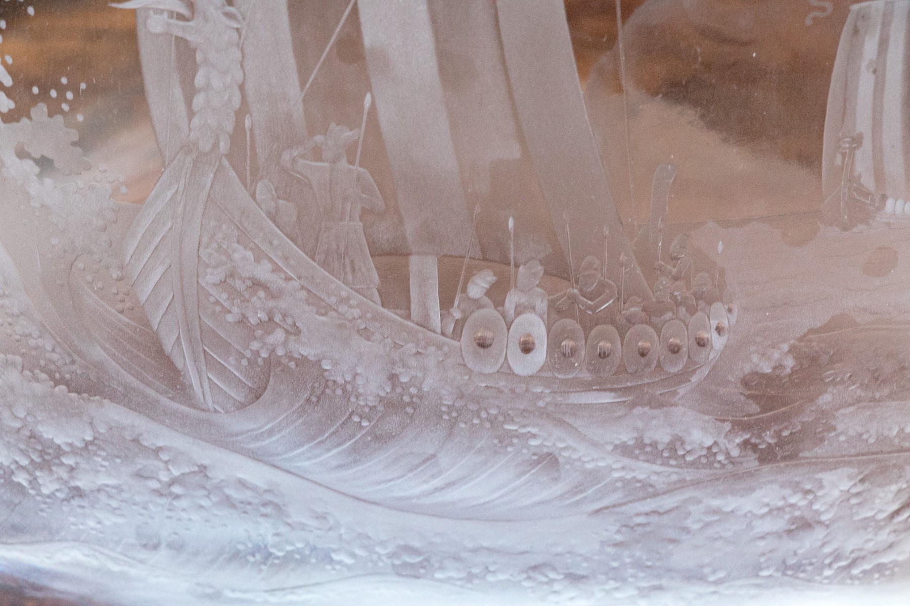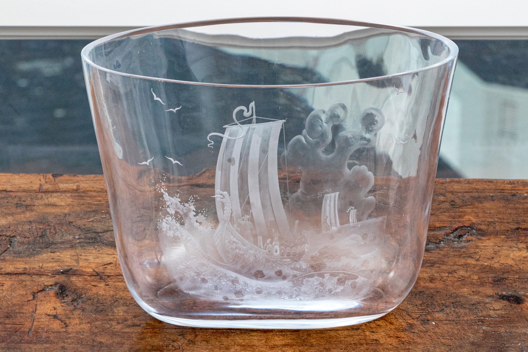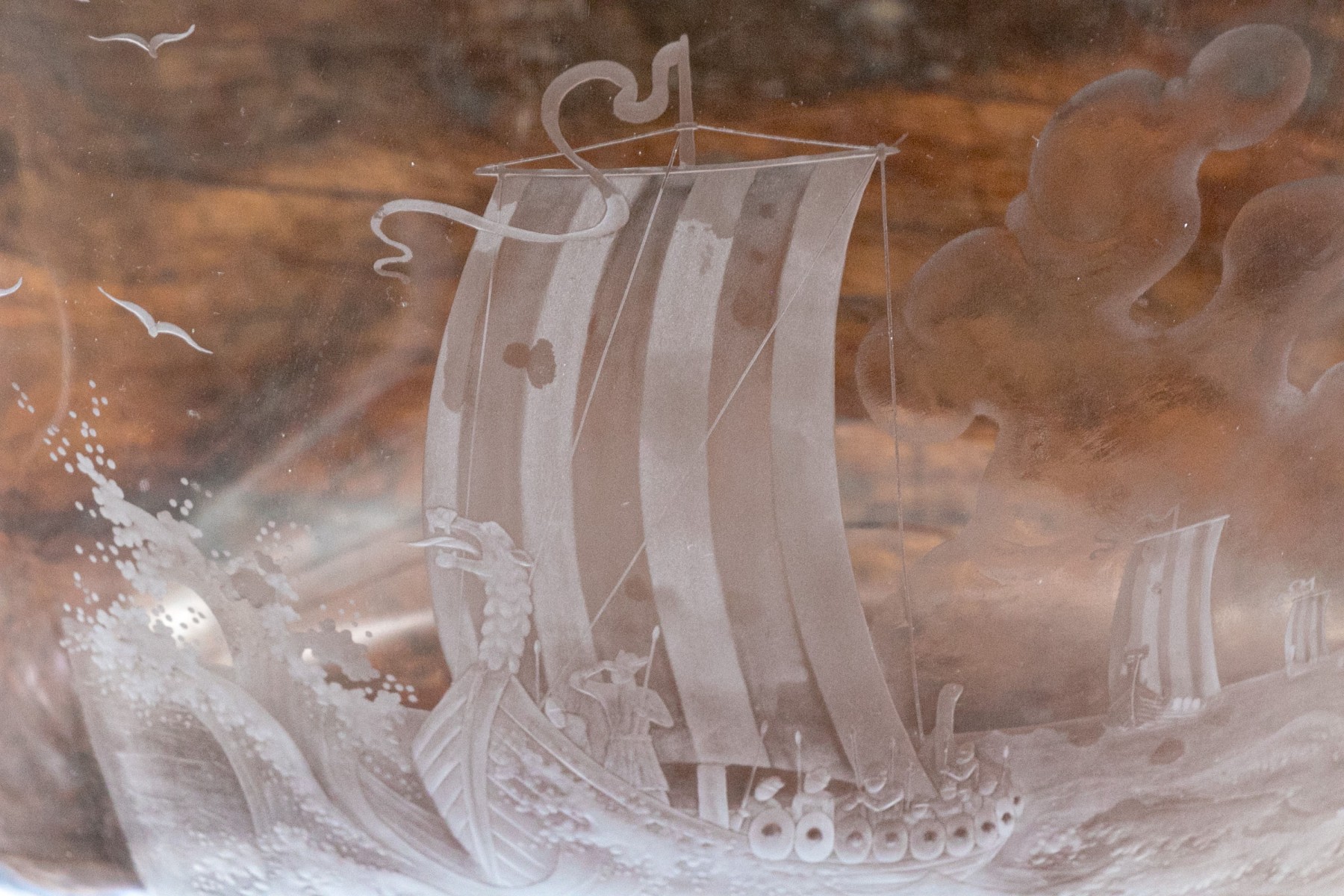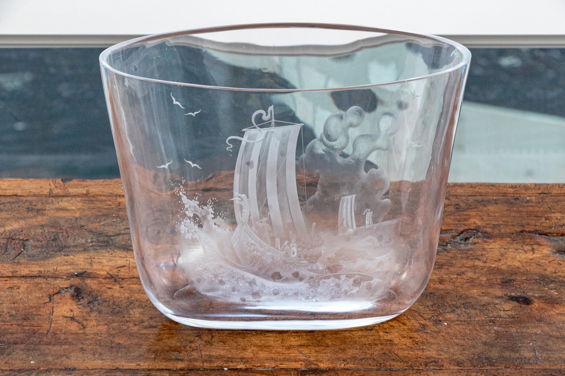 By the artisan Nils Landberg, a Swedish glass ware designer (1907-1991). Marked with 5781.RP. A lovely oval crystal vase with a large etched design of Viking ships with their striped sails and oarsmen on rough high seas under billowy clouds with seagulls in the sky.