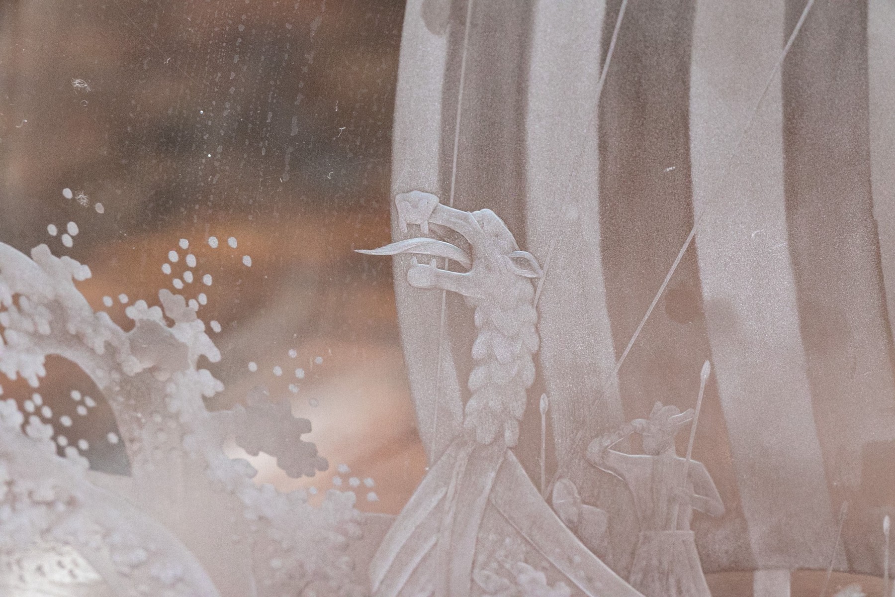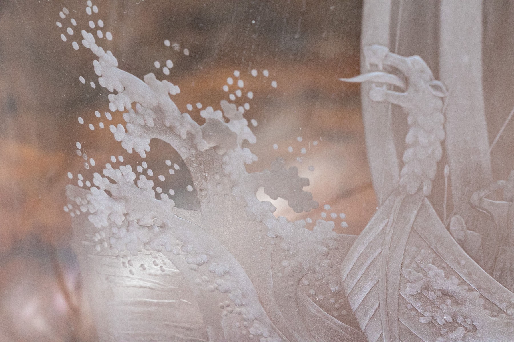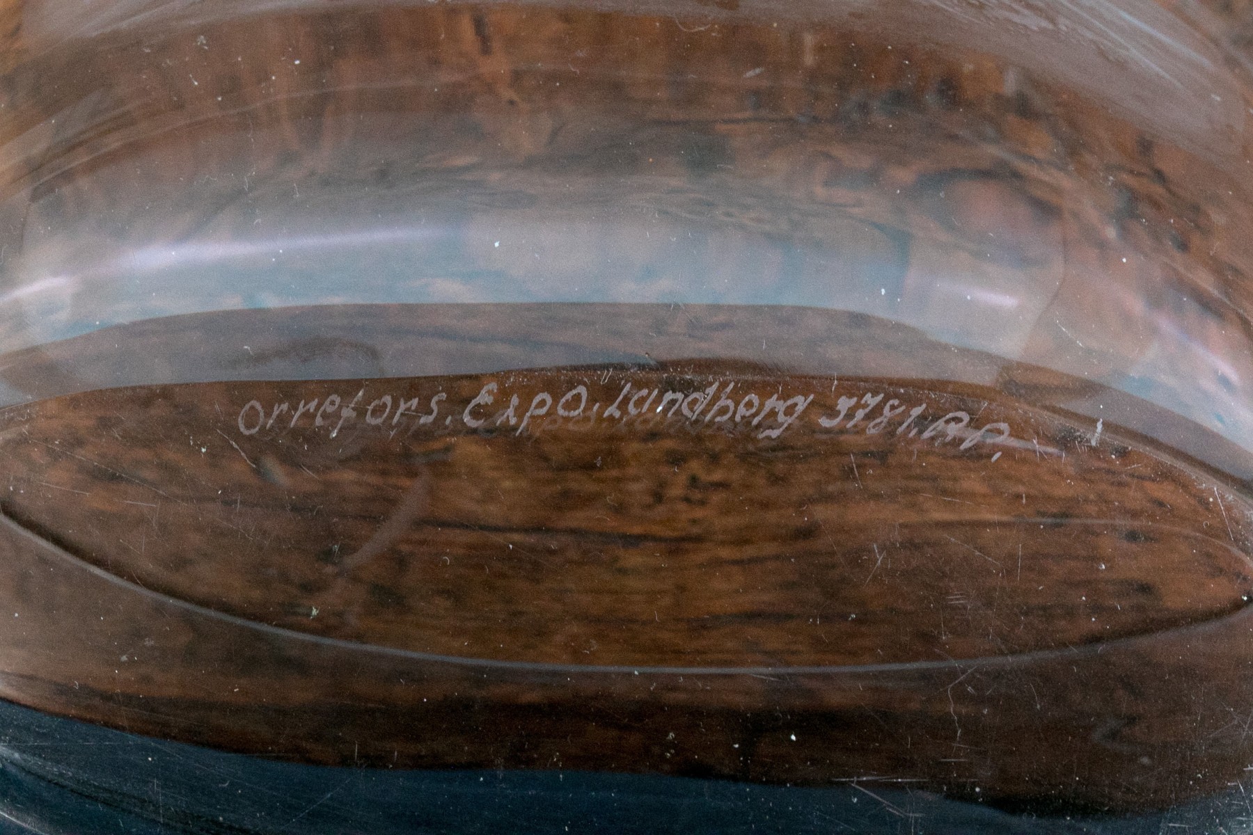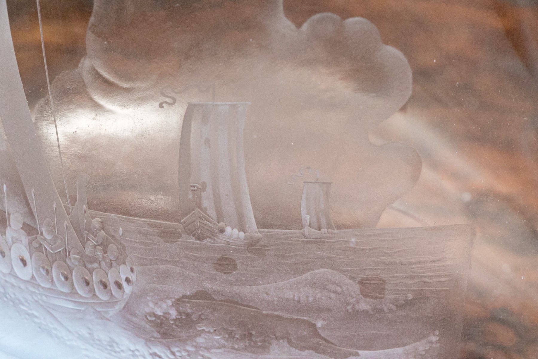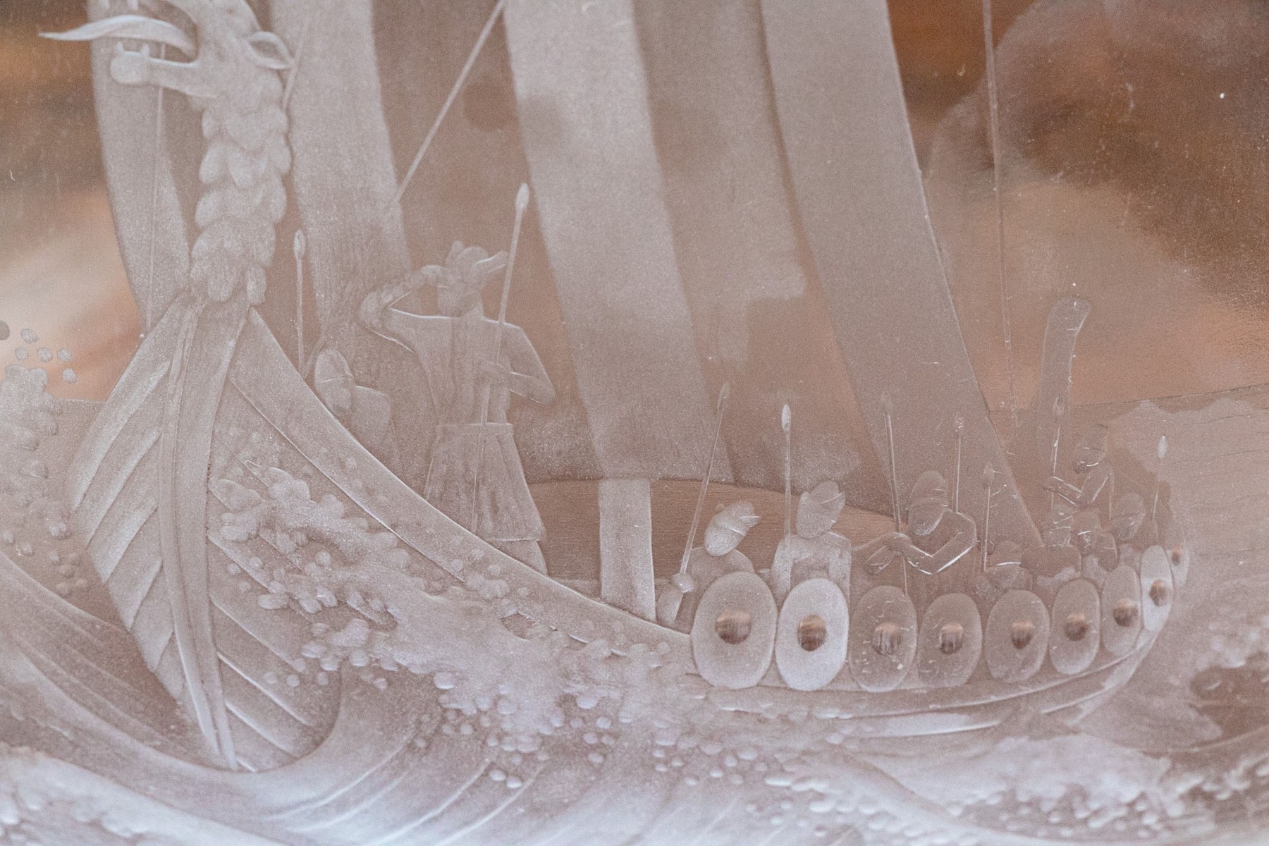 By the artisan Nils Landberg, a Swedish glass ware designer (1907-1991). Marked with 5781.RP. A lovely oval crystal vase with a large etched design of Viking ships with their striped sails and oarsmen on rough high seas under billowy clouds with seagulls in the sky.