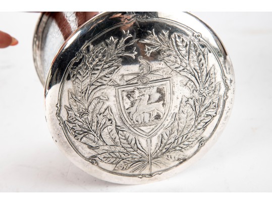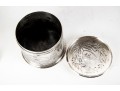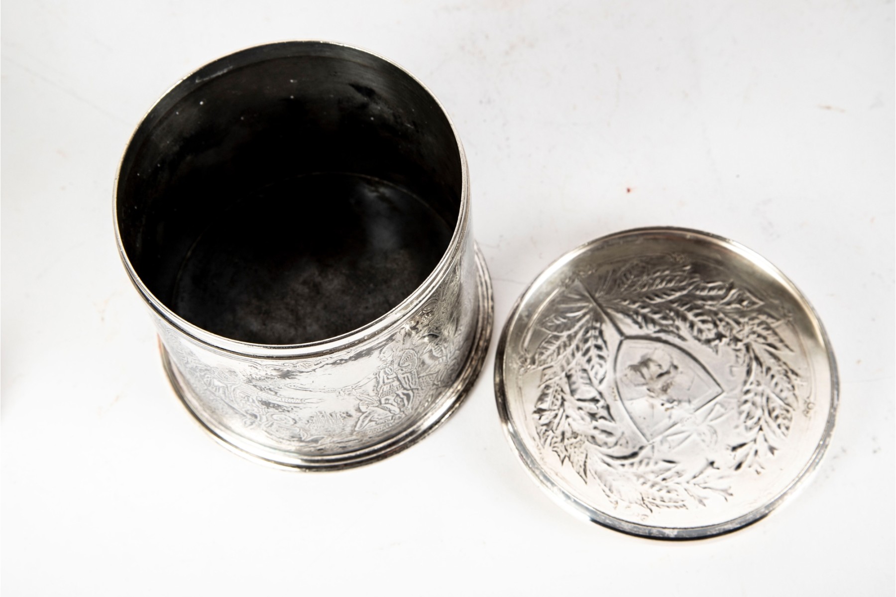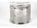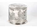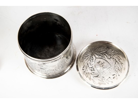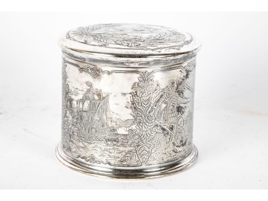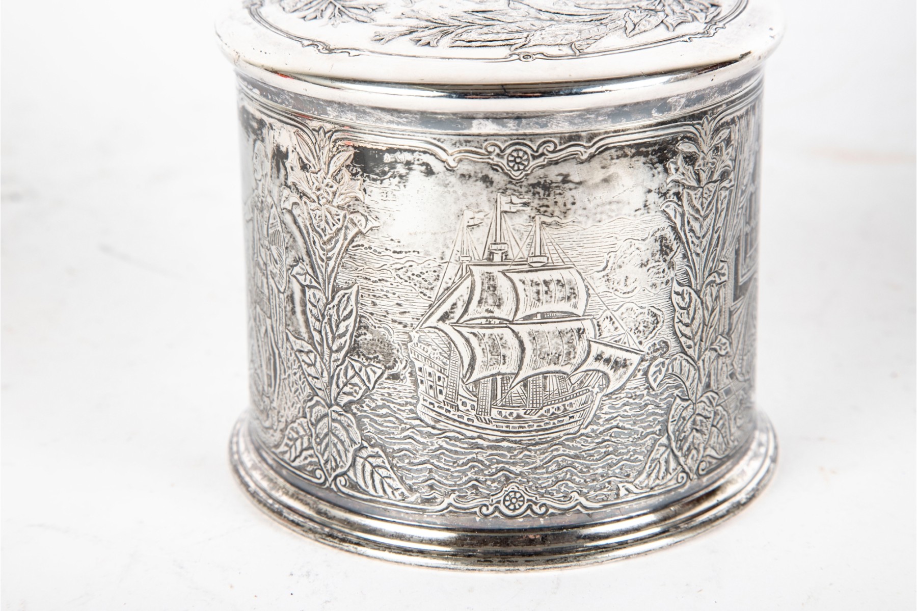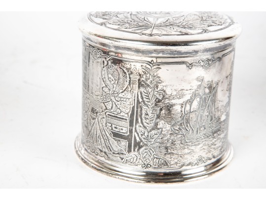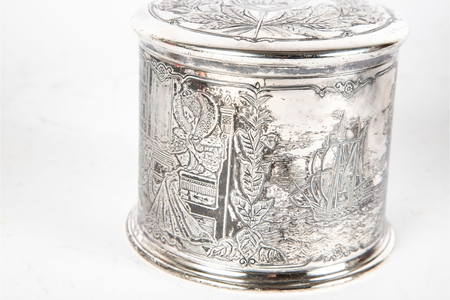A wonderful Reed & Barton silverplated tobacco caddy in cylindrical form with a heraldic motif and foliate wreath on the lid. The body is finely decorated with ornate scenes of Sir Walter Raleigh, favorite of Queen Elizabeth I, as well as ships sailing on the sea, meeting with Native Americans. Marked underfoot.