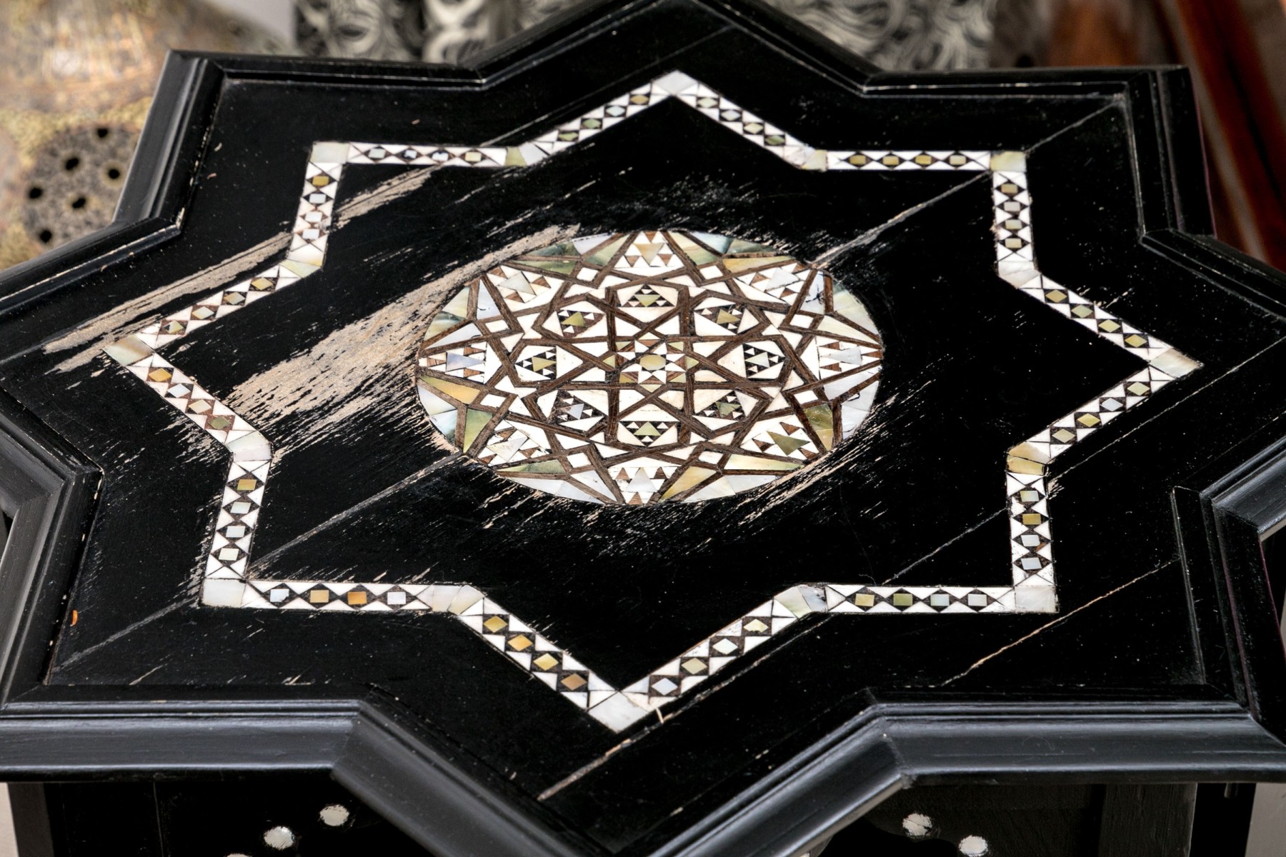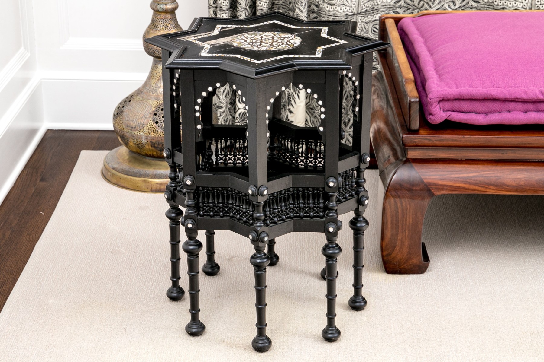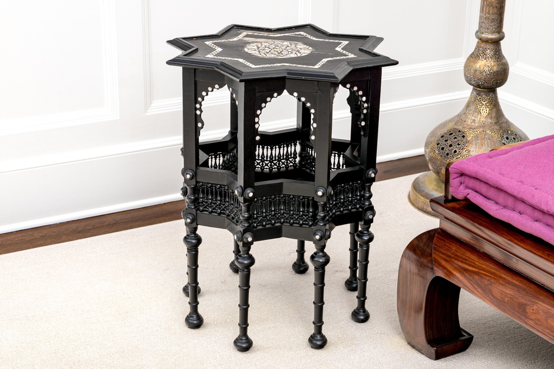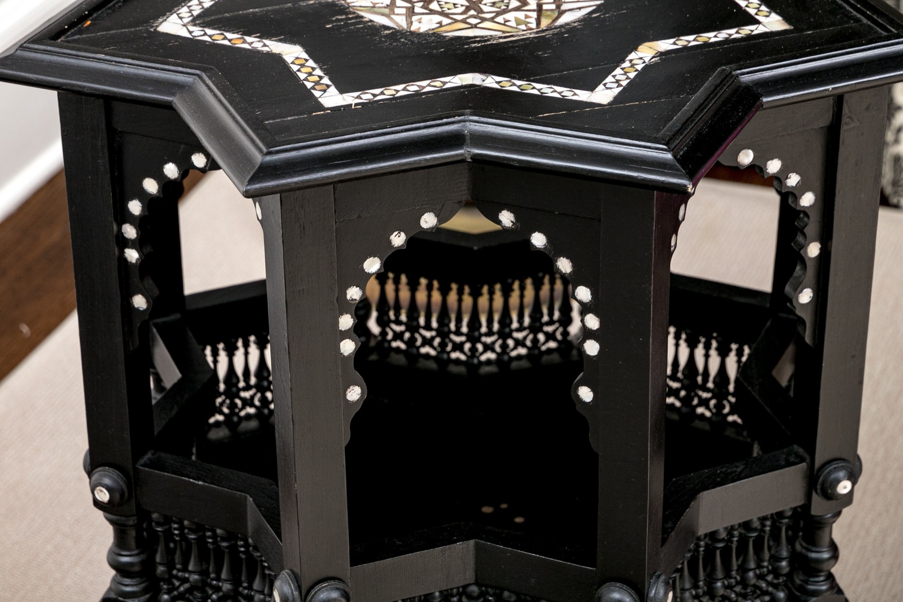 A gorgeous Moorish accent table in a black finish crafted with fine attention to detail, showcasing a star shaped top inlaid with bone and mother of pearl designs and finished with a beveled edge over arched galleries leading to fine spindle supports adding excellent visual interest and texture around a lower shelf. Raised on ringed legs with bun feet.