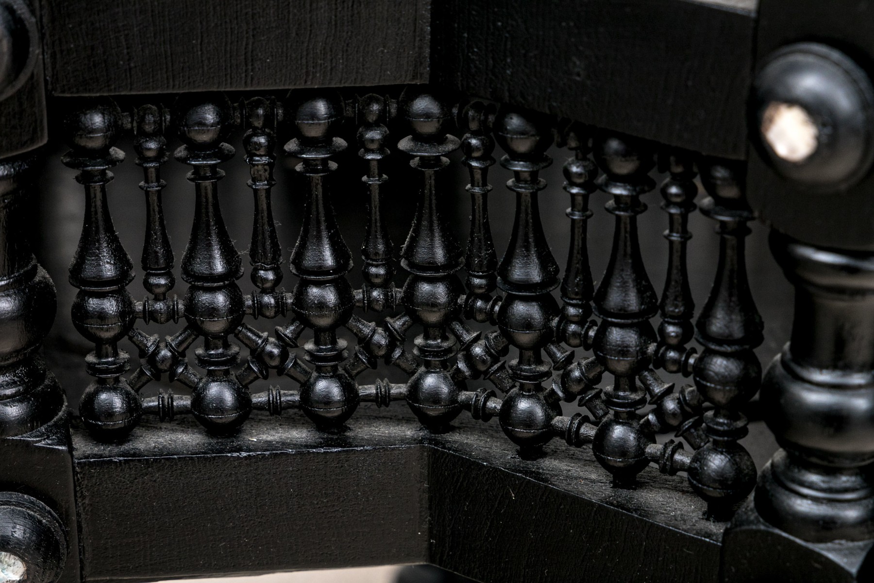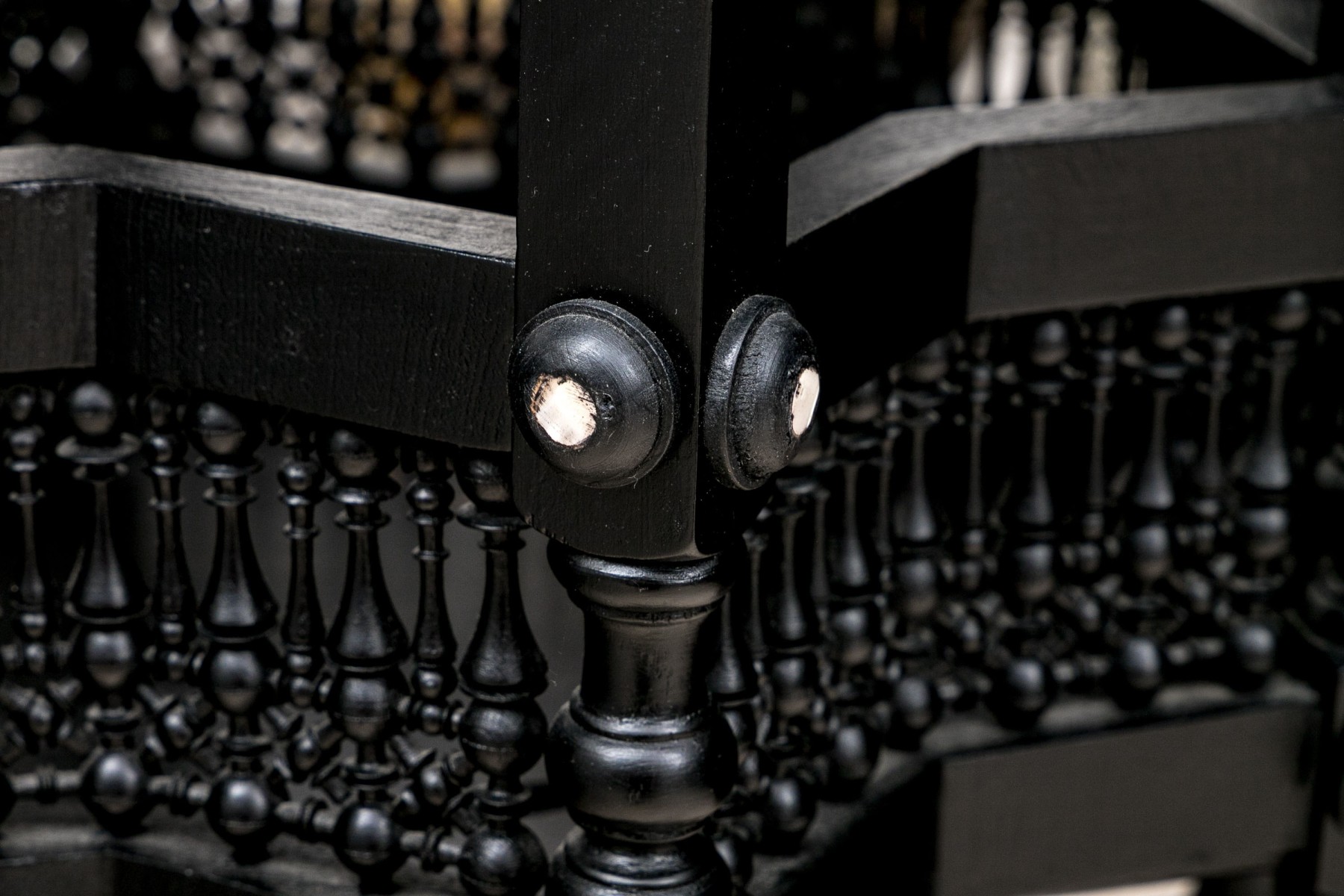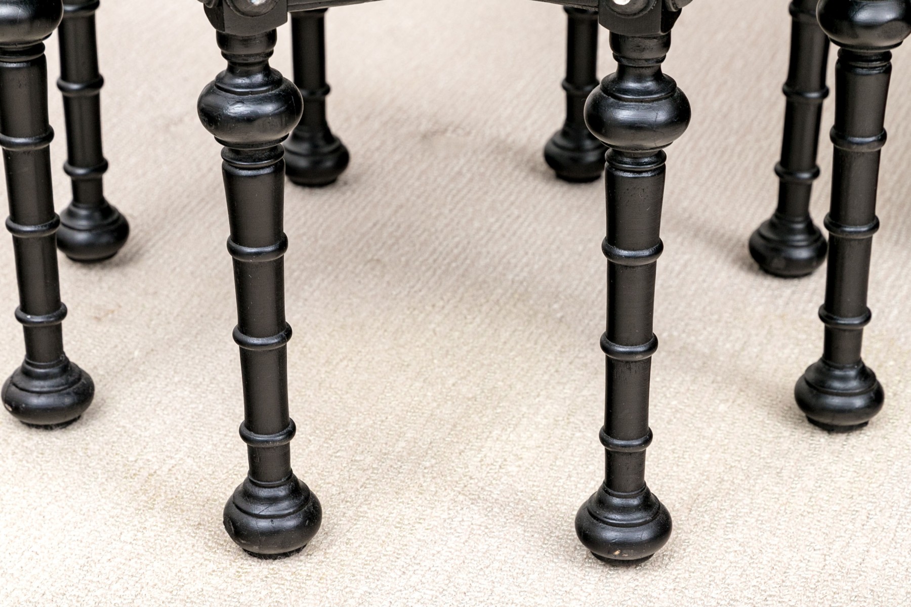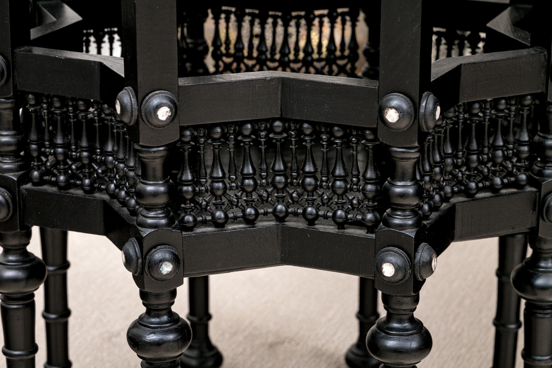 A gorgeous Moorish accent table in a black finish crafted with fine attention to detail, showcasing a star shaped top inlaid with bone and mother of pearl designs and finished with a beveled edge over arched galleries leading to fine spindle supports adding excellent visual interest and texture around a lower shelf. Raised on ringed legs with bun feet.
