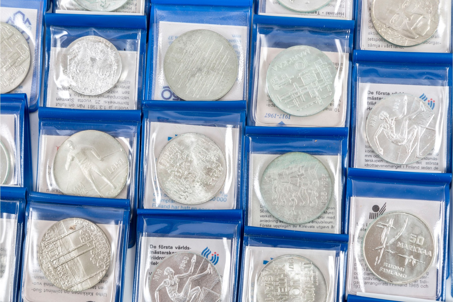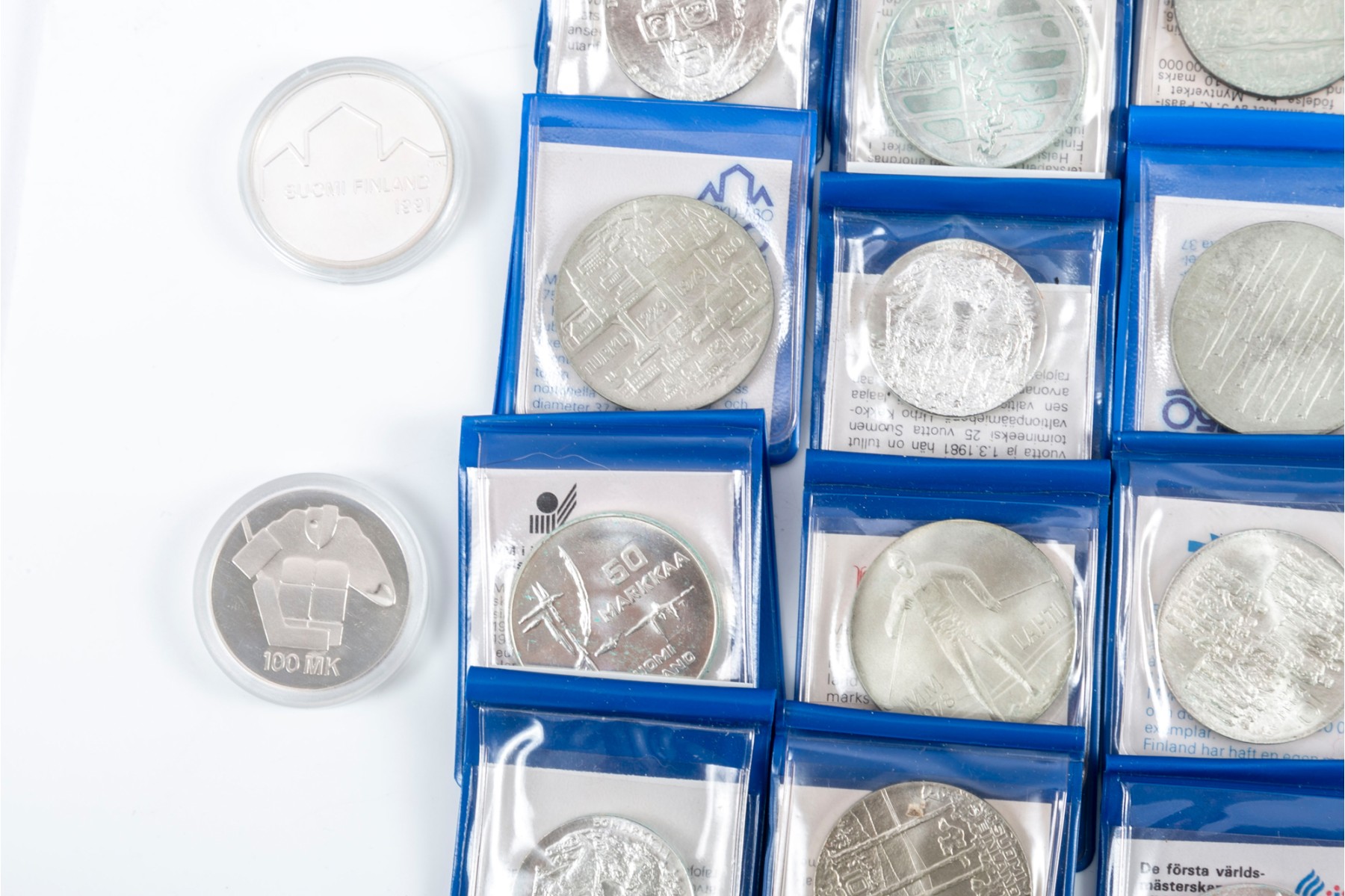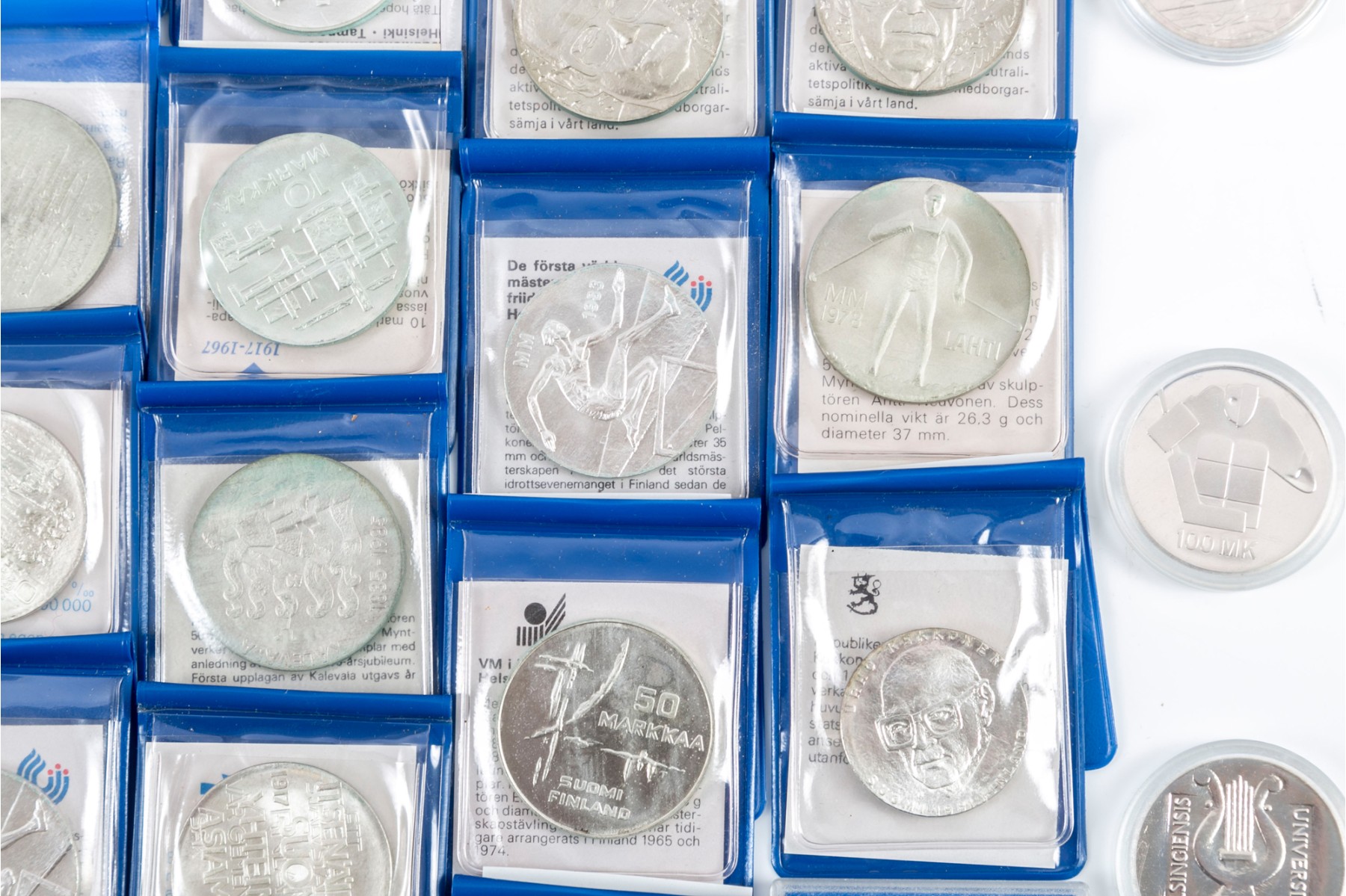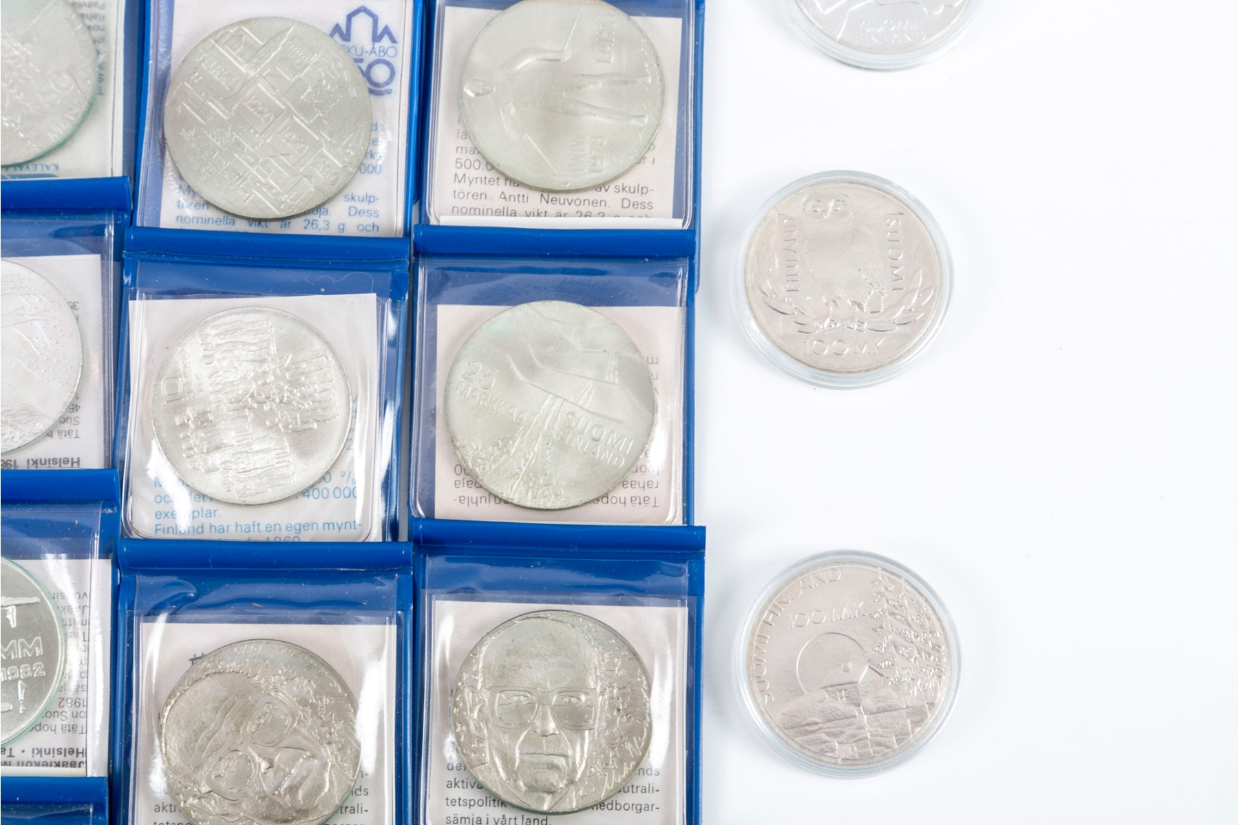 A large collection of Soumi Finland Mint commemorative coins. Mixed dates, a few of which have a silver content of 0.500. contents as shown and sold as is, see photos for details.