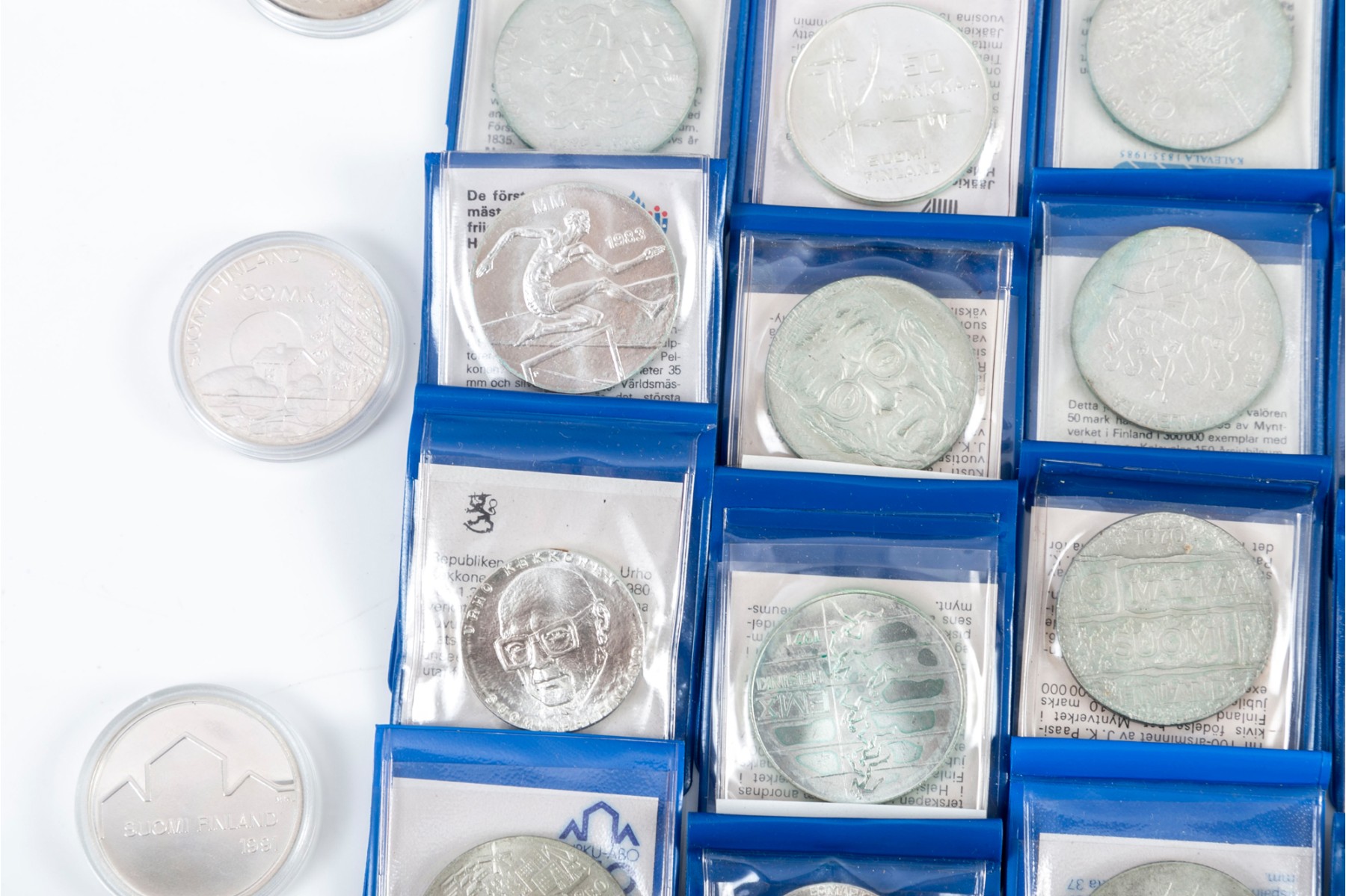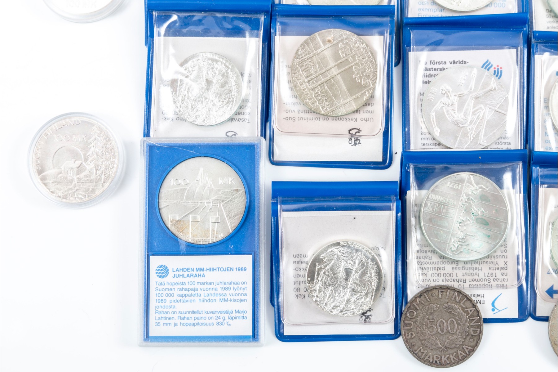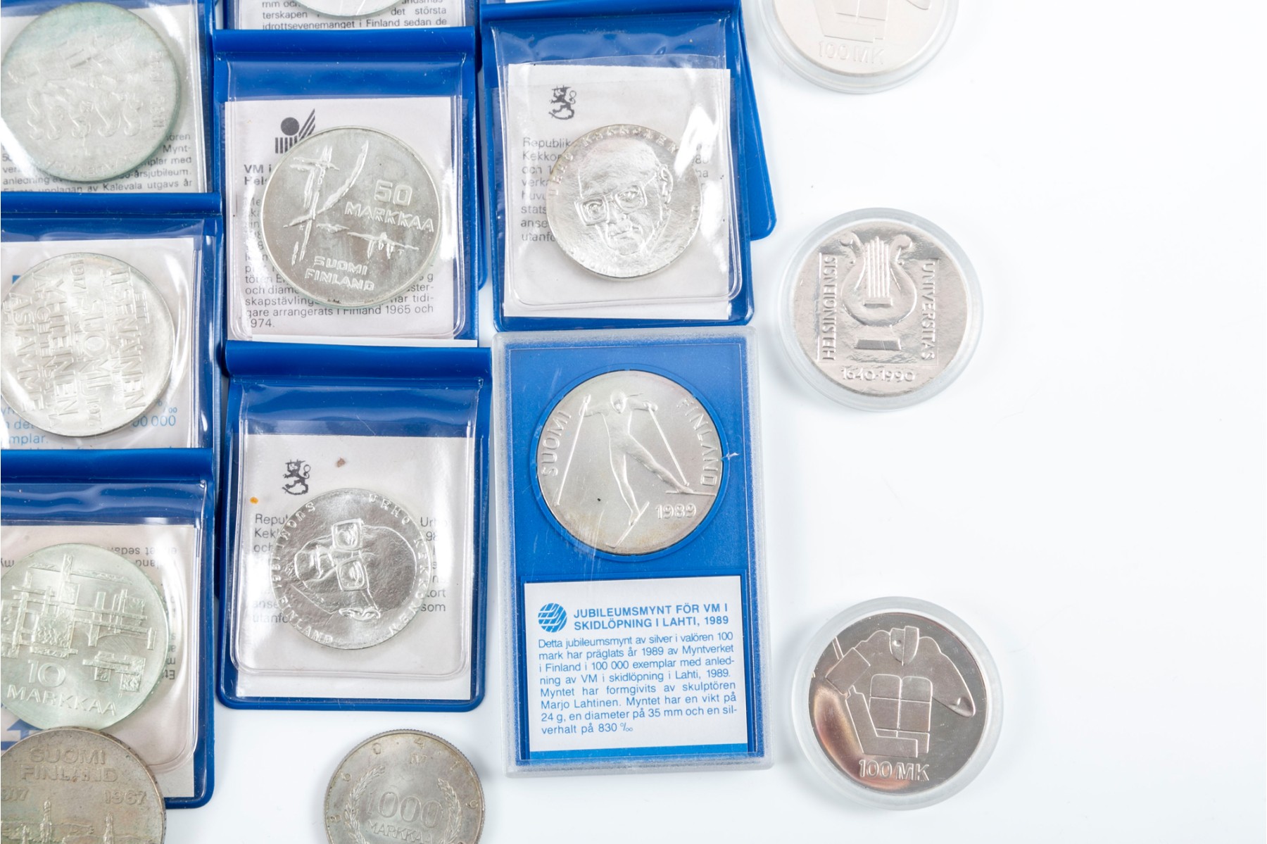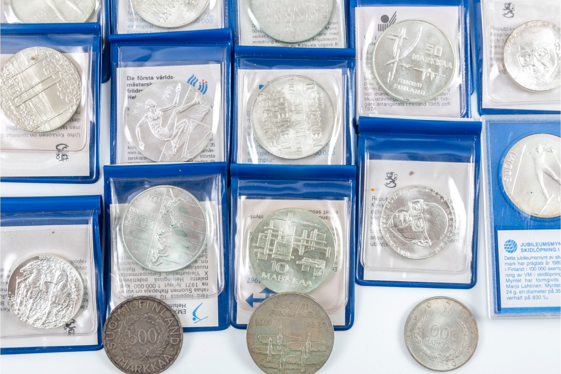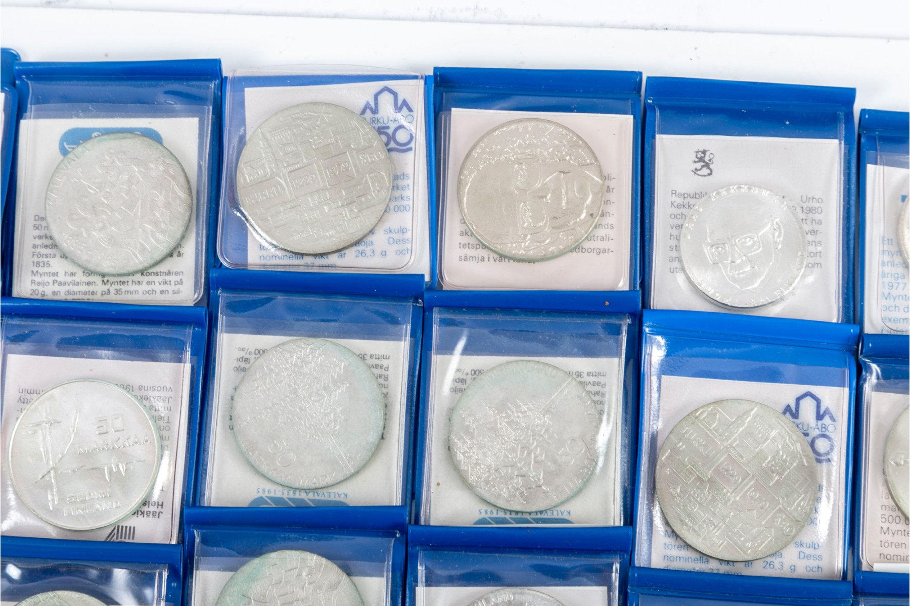 A large collection of Soumi Finland Mint commemorative coins. Mixed dates, a few of which have a silver content of 0.500. contents as shown and sold as is, see photos for details.