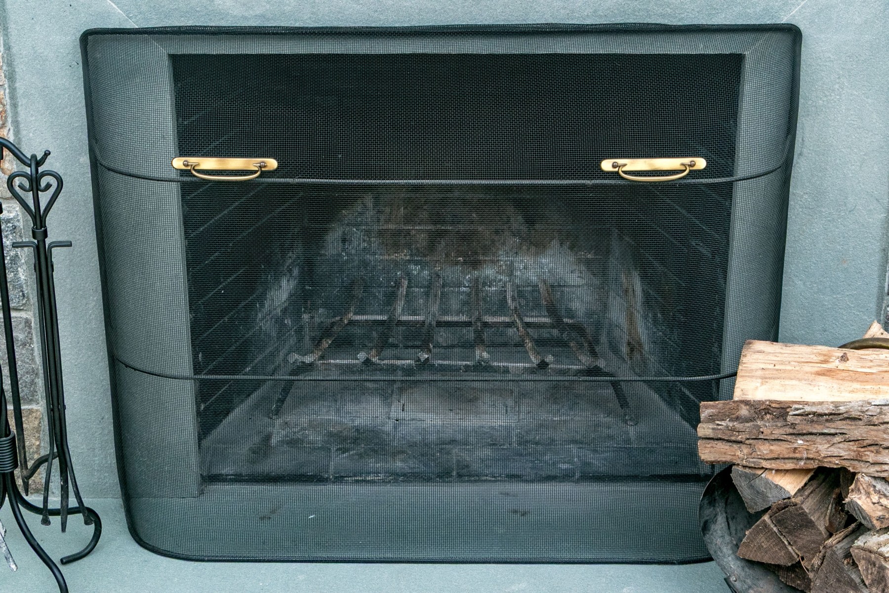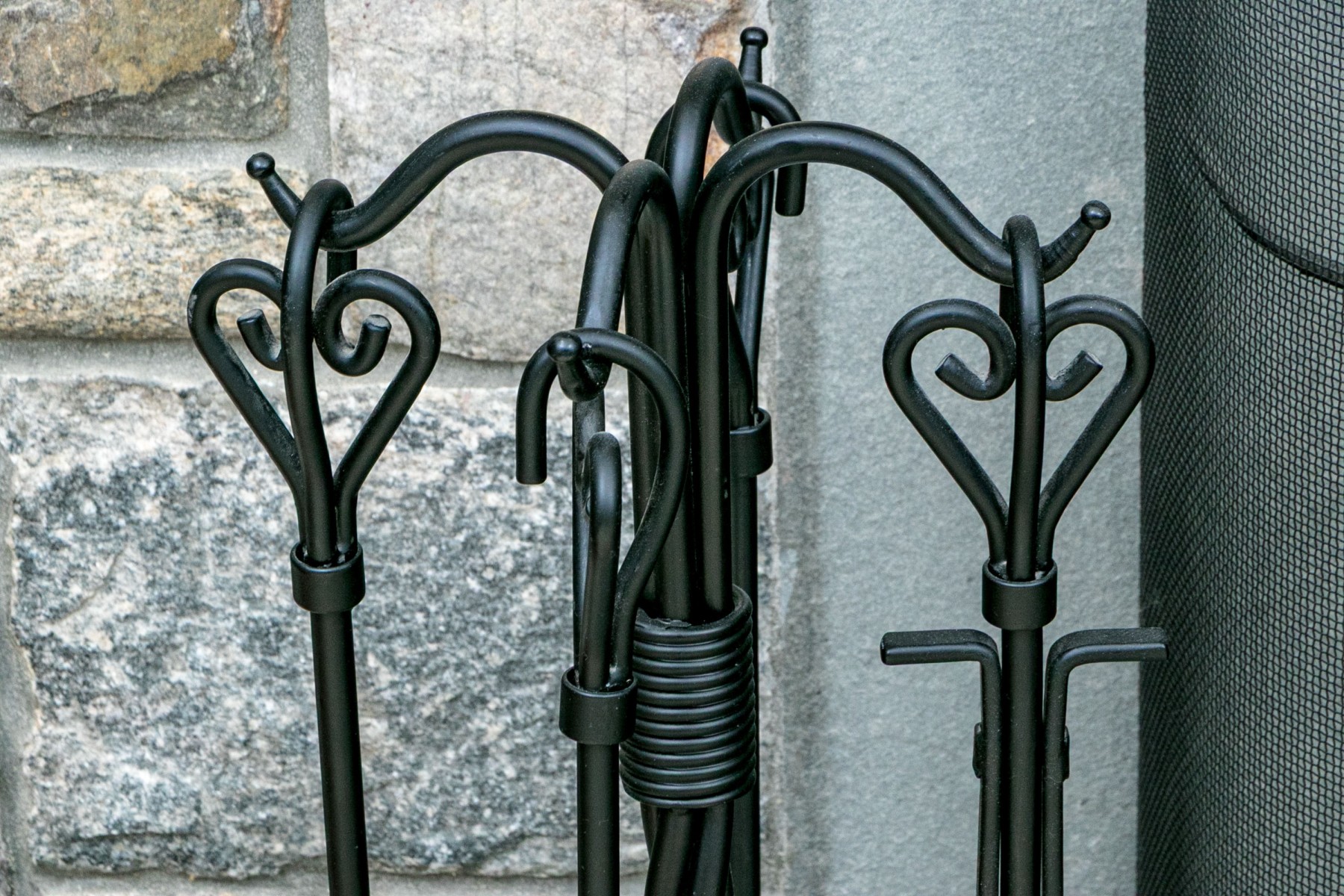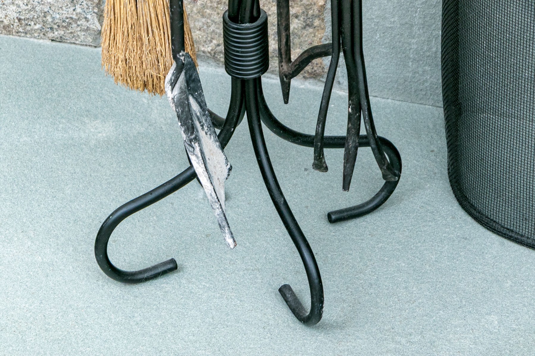 A great suite of fireplace accessories including a set of black wrought iron tools on a stand, a sleek black mesh screen with brass handles, and an iron and brass log basket on scrolled feet.
