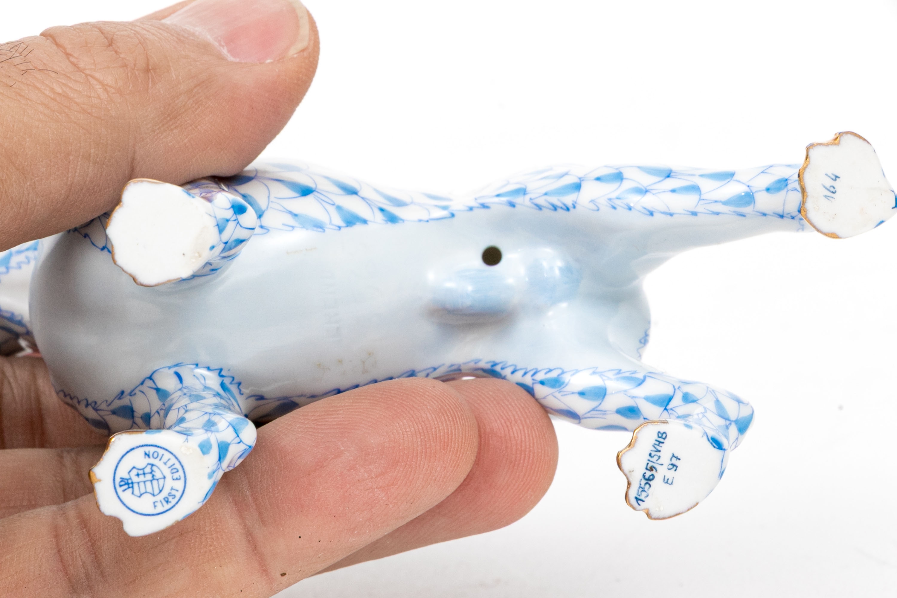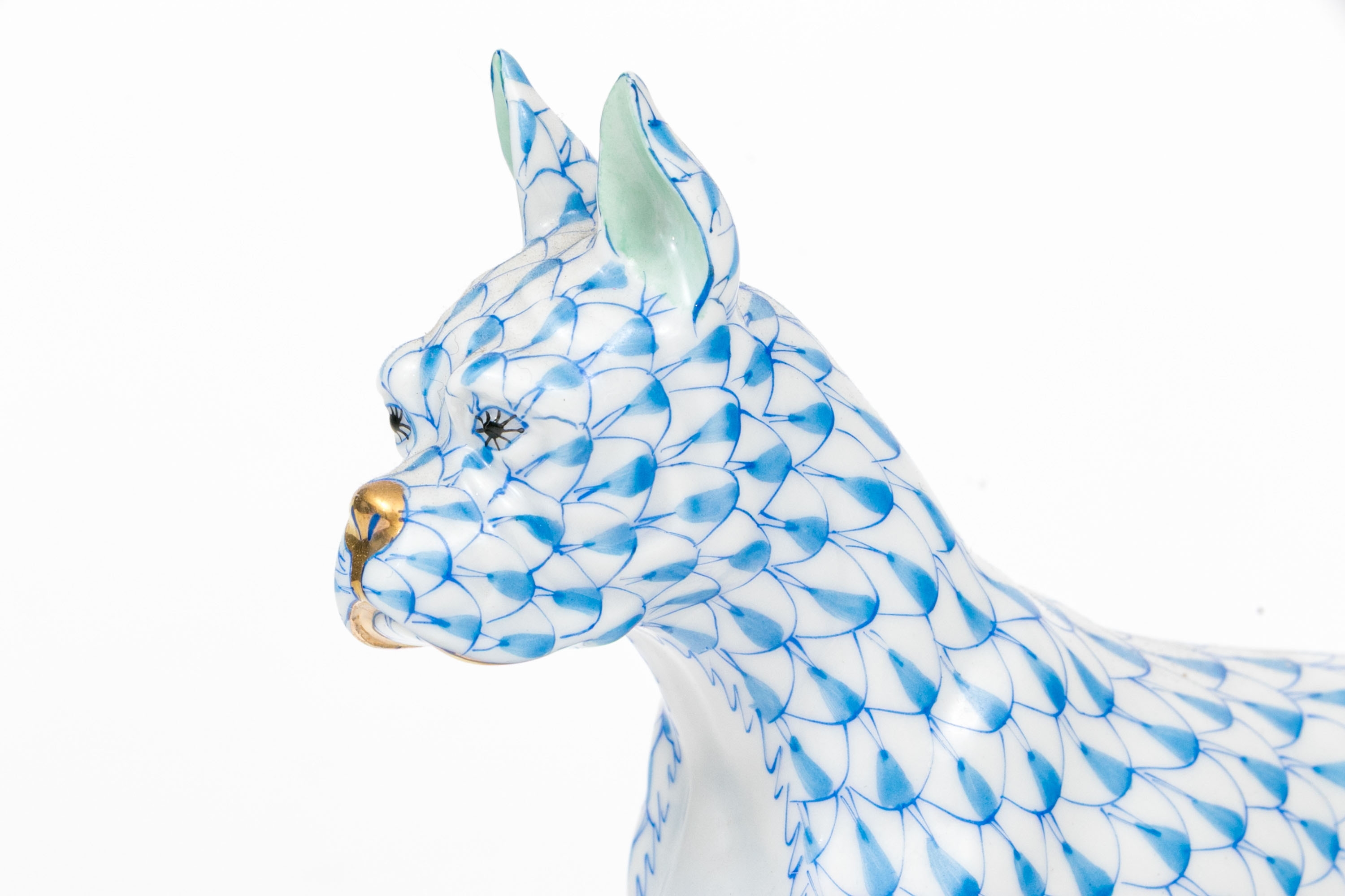 Exquisite hand-painted porcelain figure by Herend Hungary depicting a boxer dog in the classic fishnet blue pattern. The dog stands alert, modeled with precise musculature and an expressive stance, accented with 24K gilt detailing at the paws, nose, and tail tip. The inner ears are painted in soft green tones. Marked on the underside with the blue Herend Hungary shield and crossed paintbrushes, inscribed First Edition, and pattern/model number 15365/VHB.