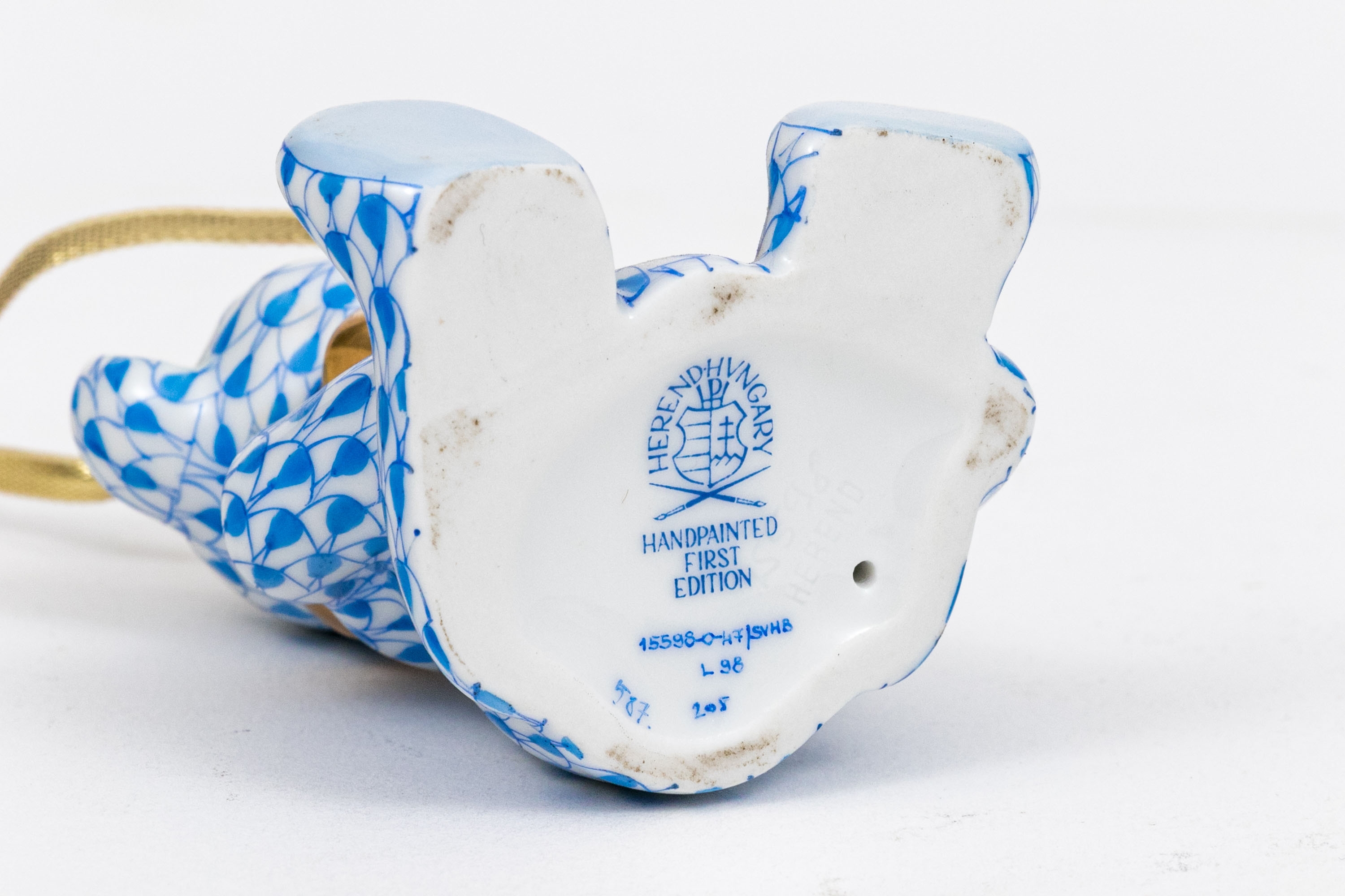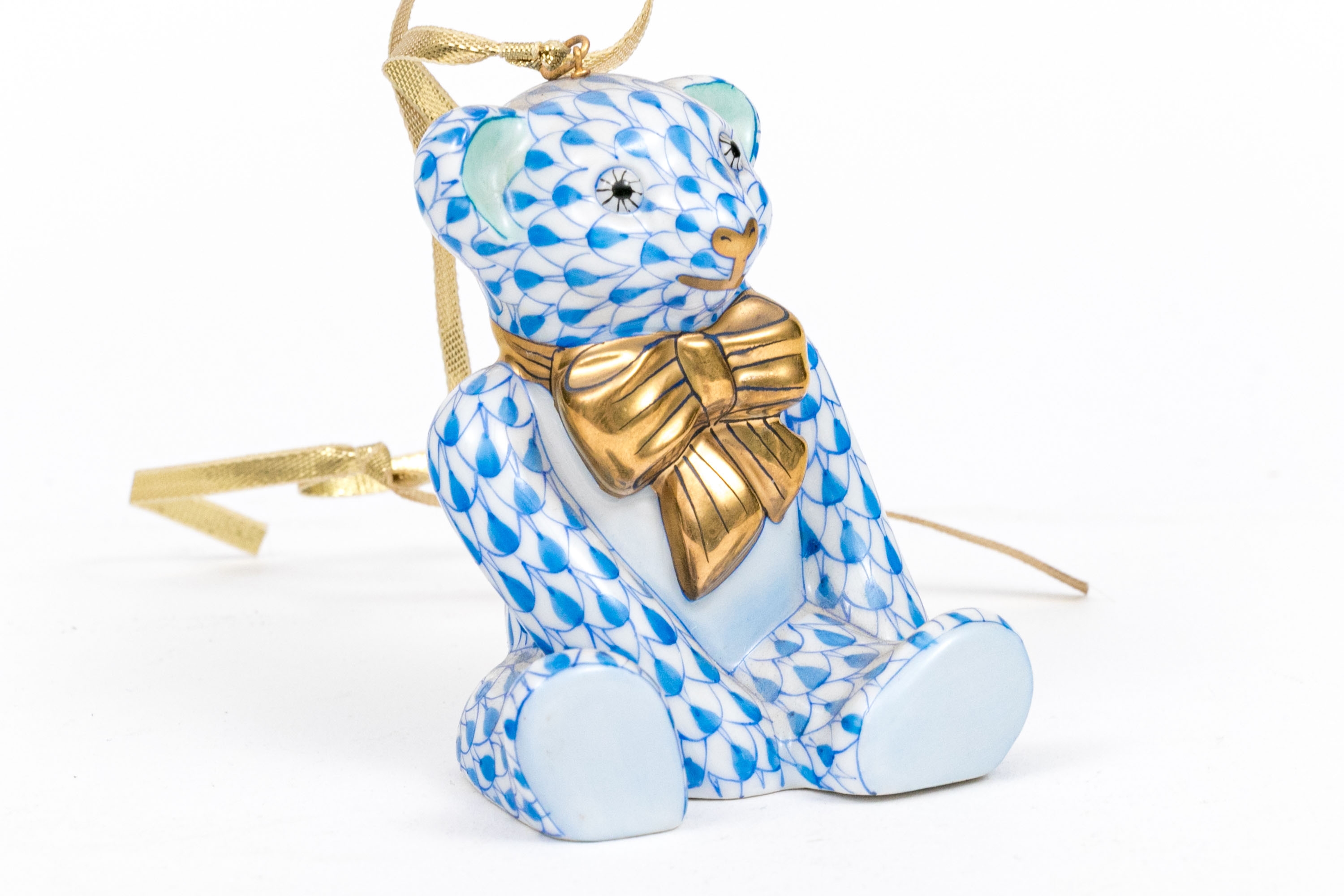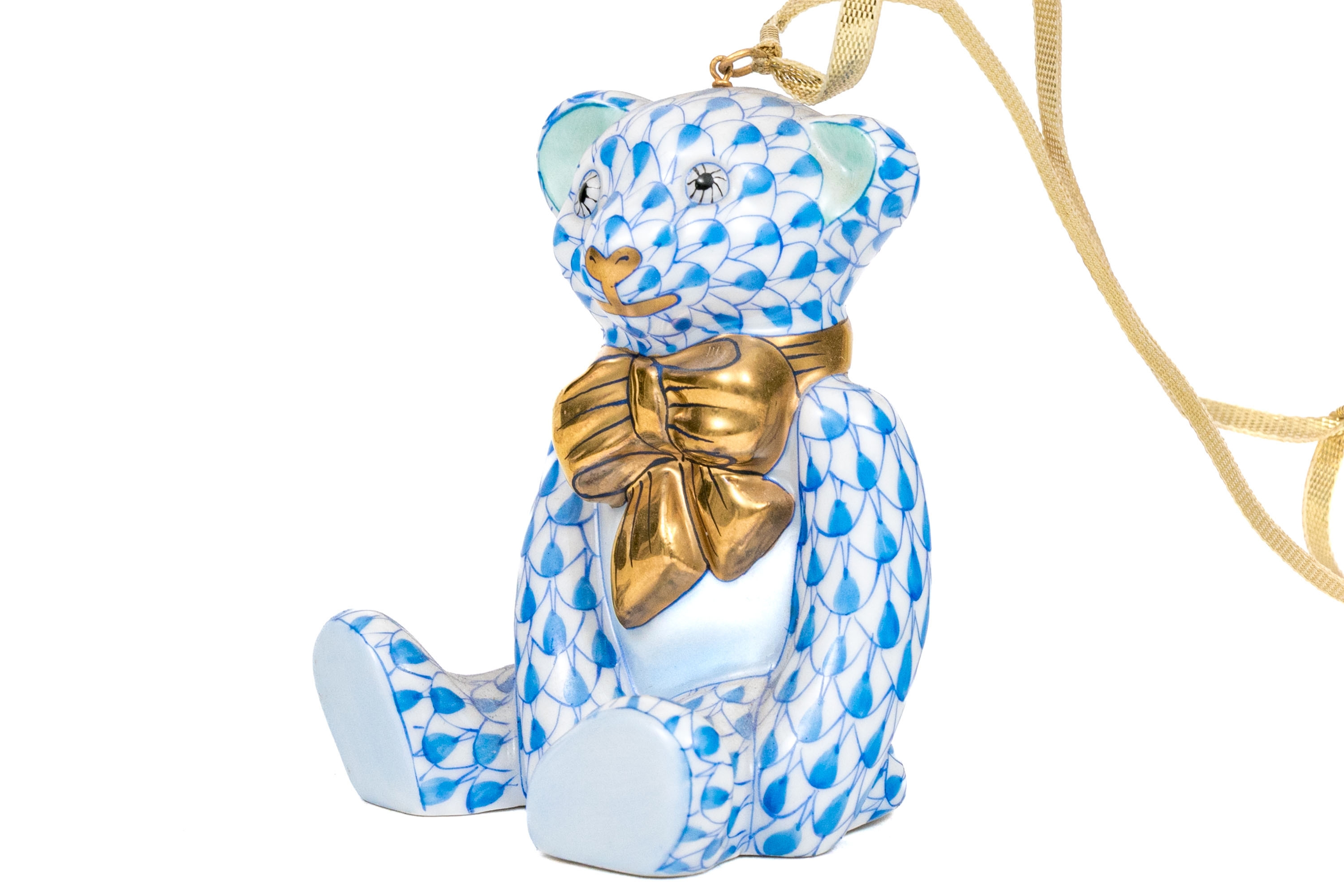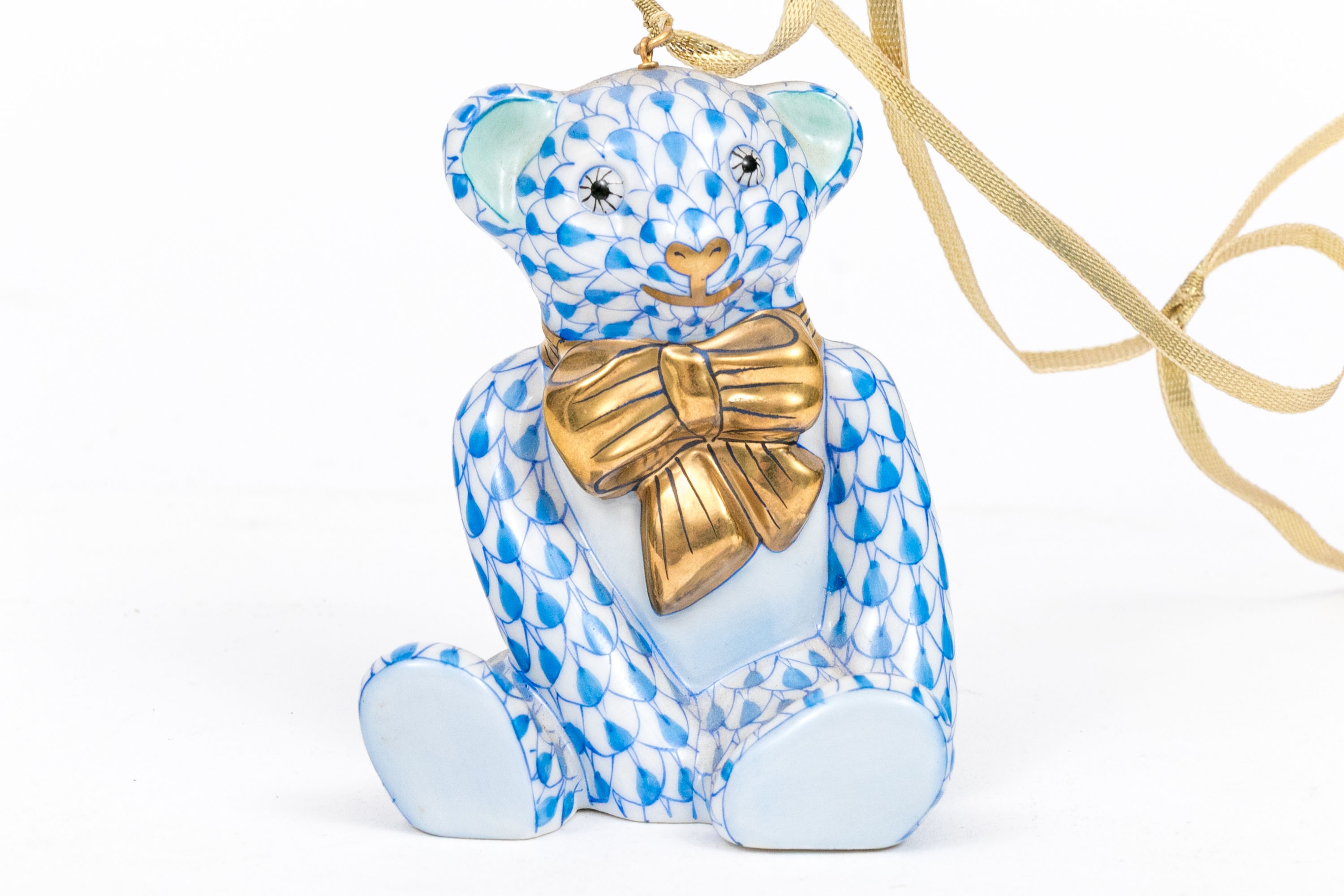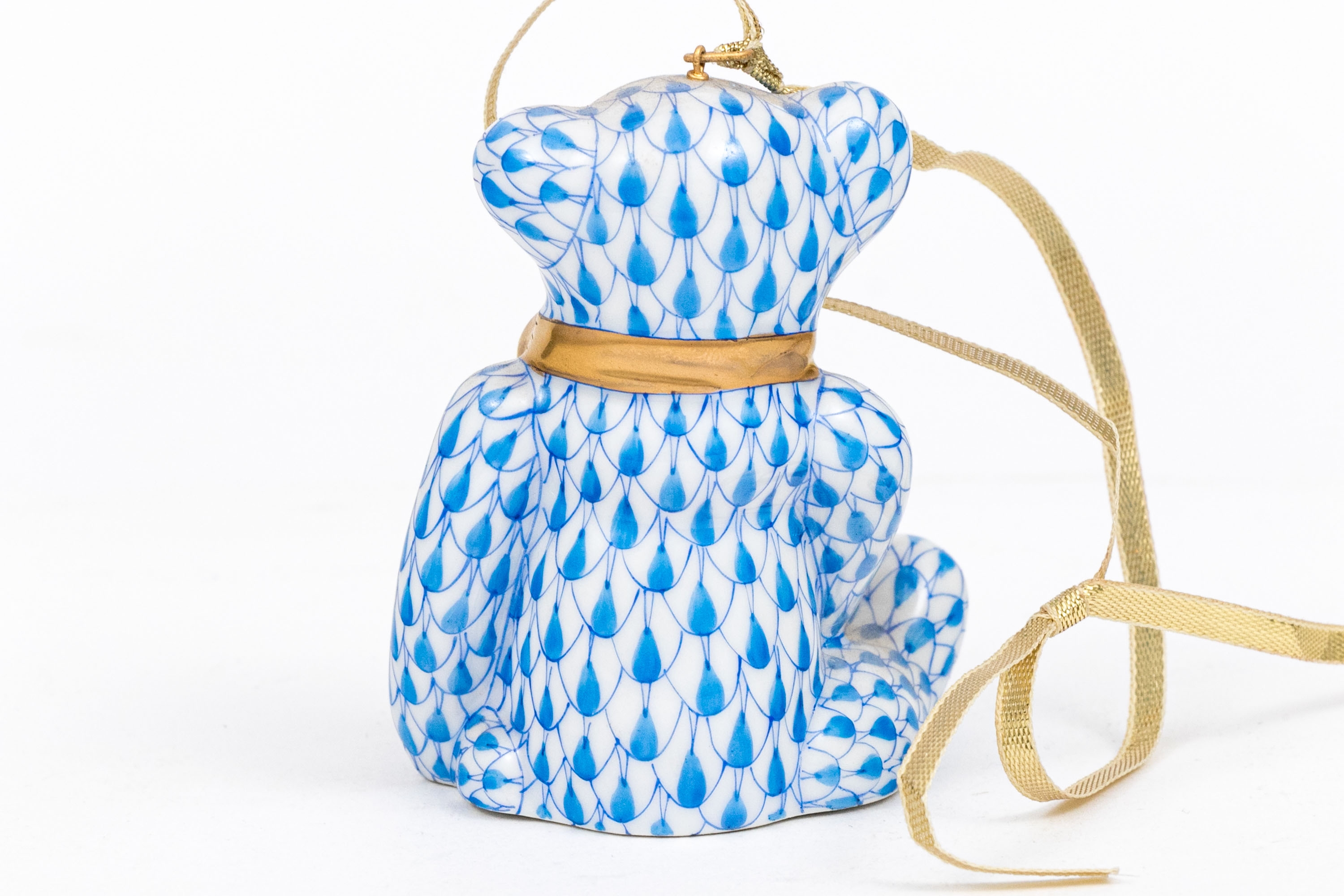 Hand-painted porcelain teddy bear ornament by Herend Hungary, modeled seated with a cheerful expression and finished in the iconic fishnet blue pattern. The ornament figure features a broad 24K gilt bow and gilt nose. A gold hanging ribbon is affixed at the top, making this an ideal ornament or collectible display piece. Marked beneath with the Herend Hungary blue shield and crossed paintbrushes, inscribed Handpainted and First Edition, with model number 15598-0-47/SVHB.