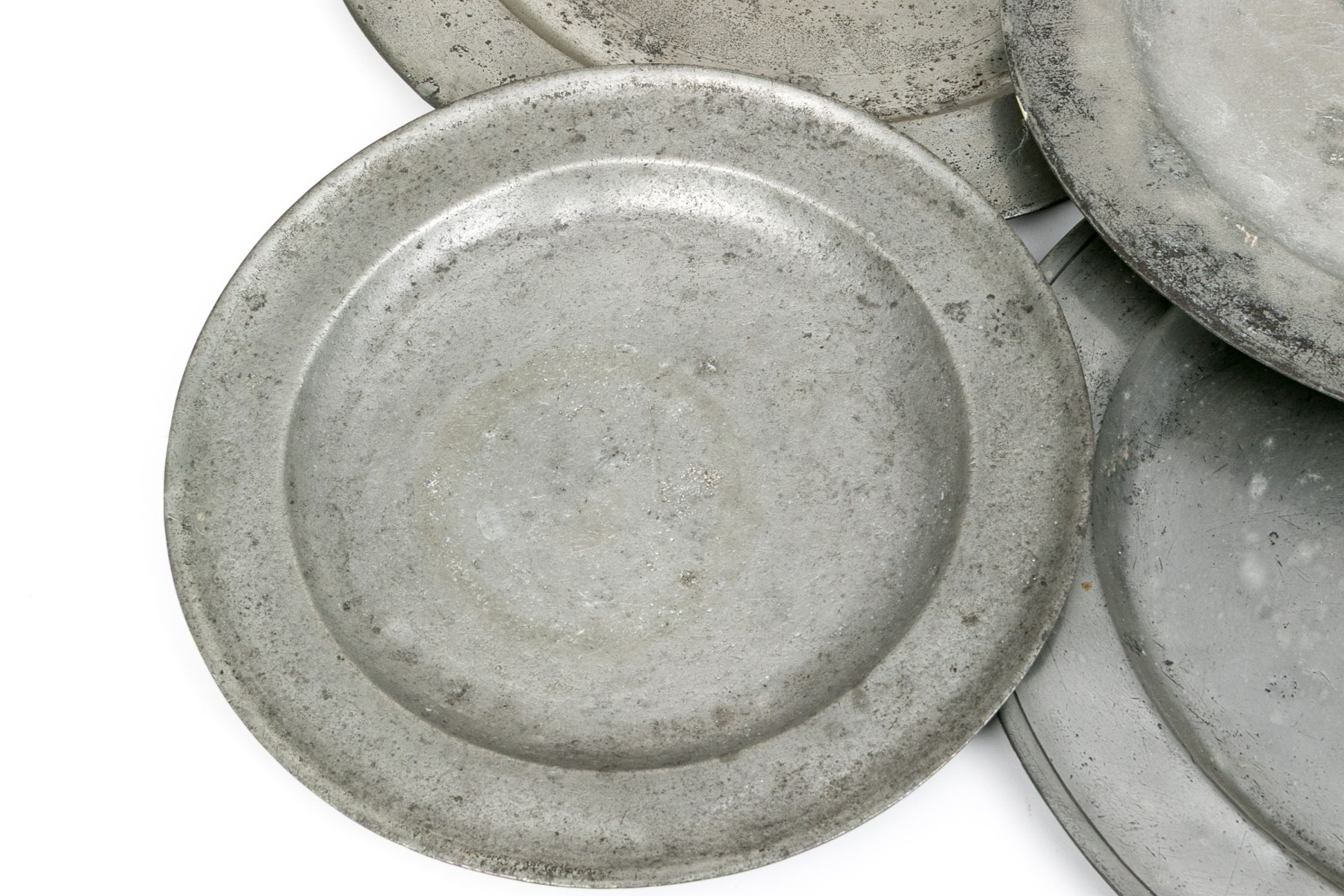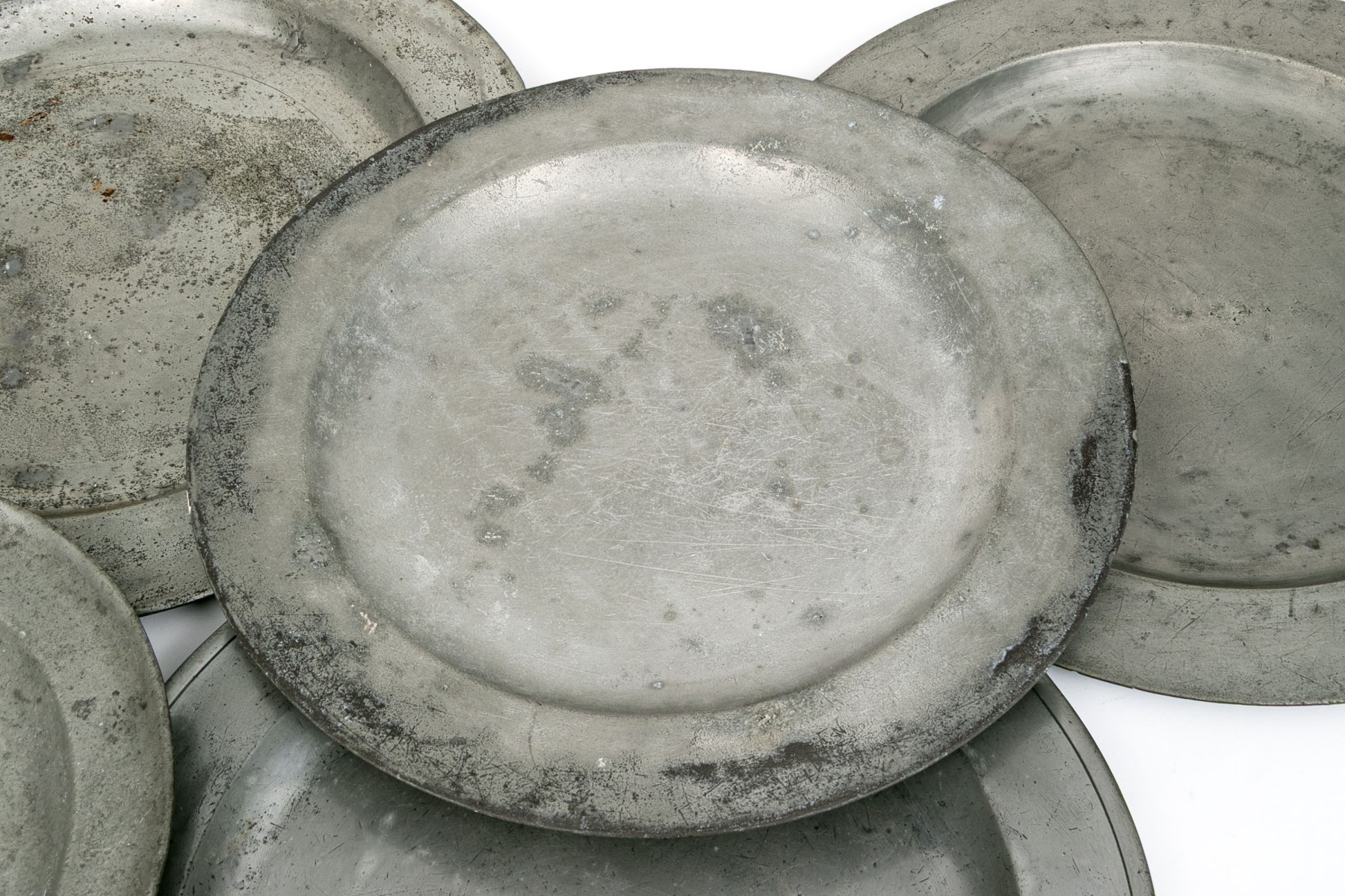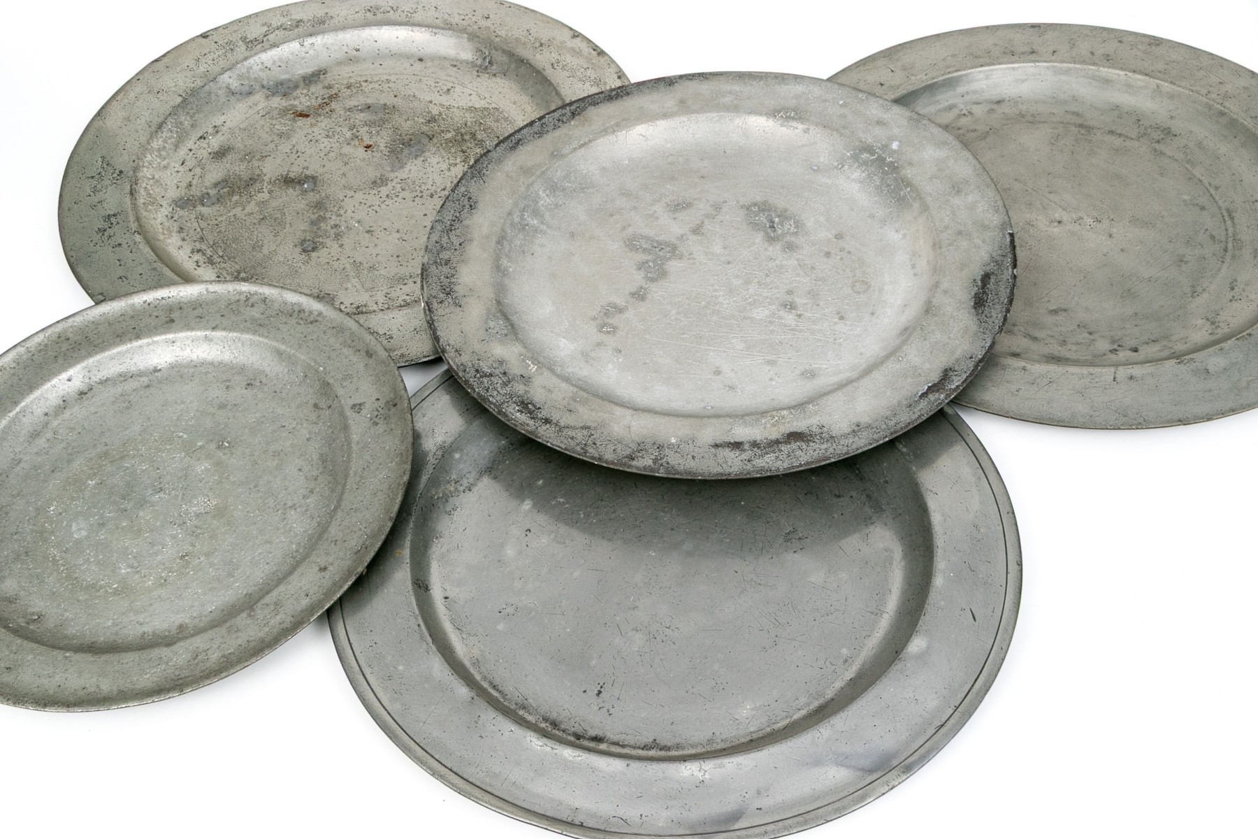 A lovely group of five well sized pewter chargers with gently raised rims.