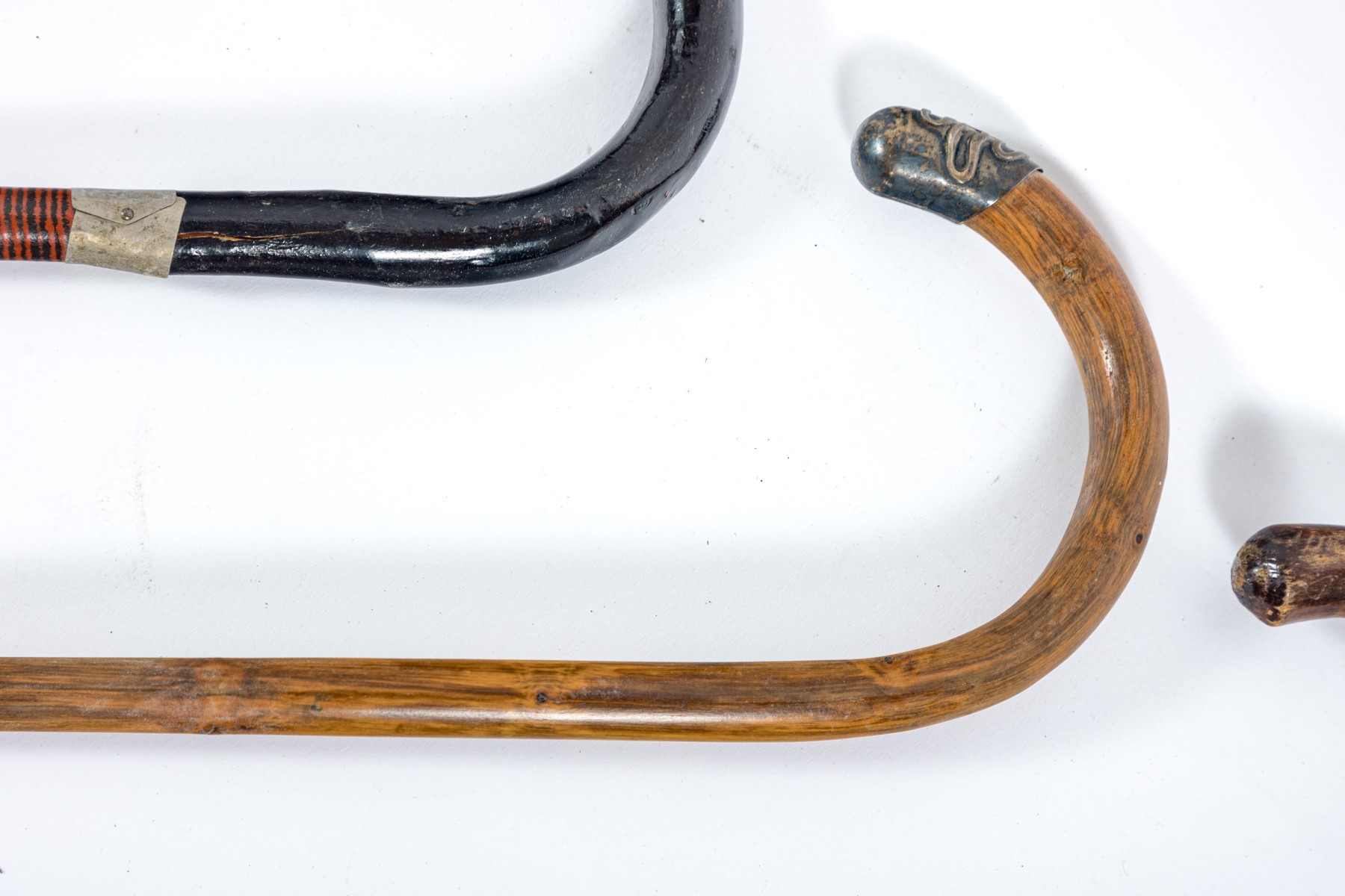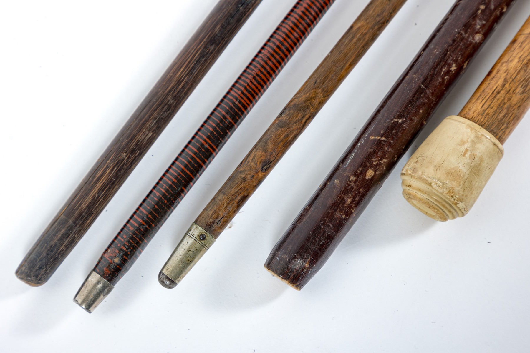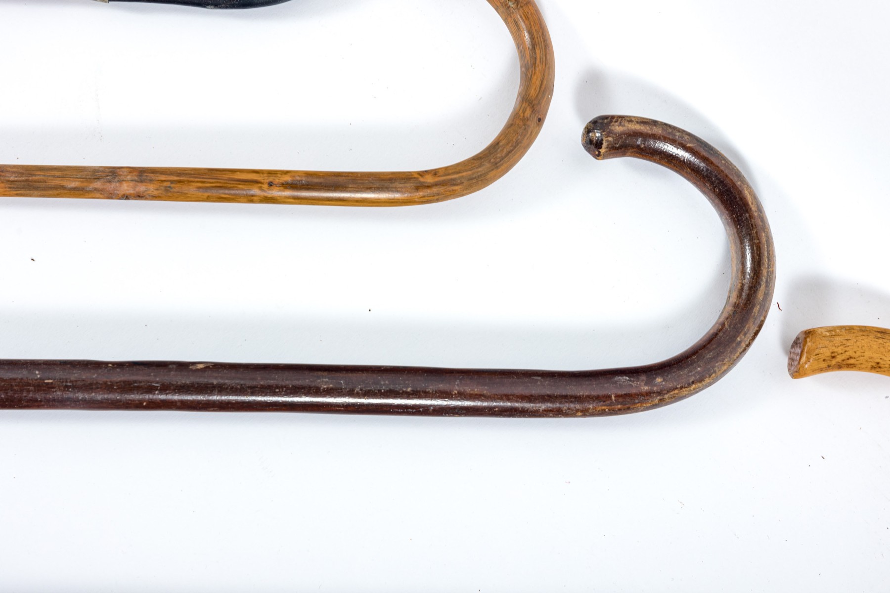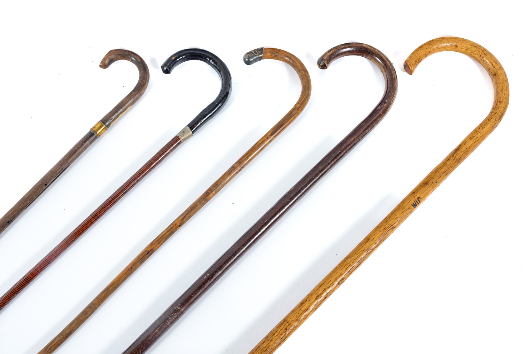 A variety of five antique canes. Traditional in design with looped handles and simple wood construction.
