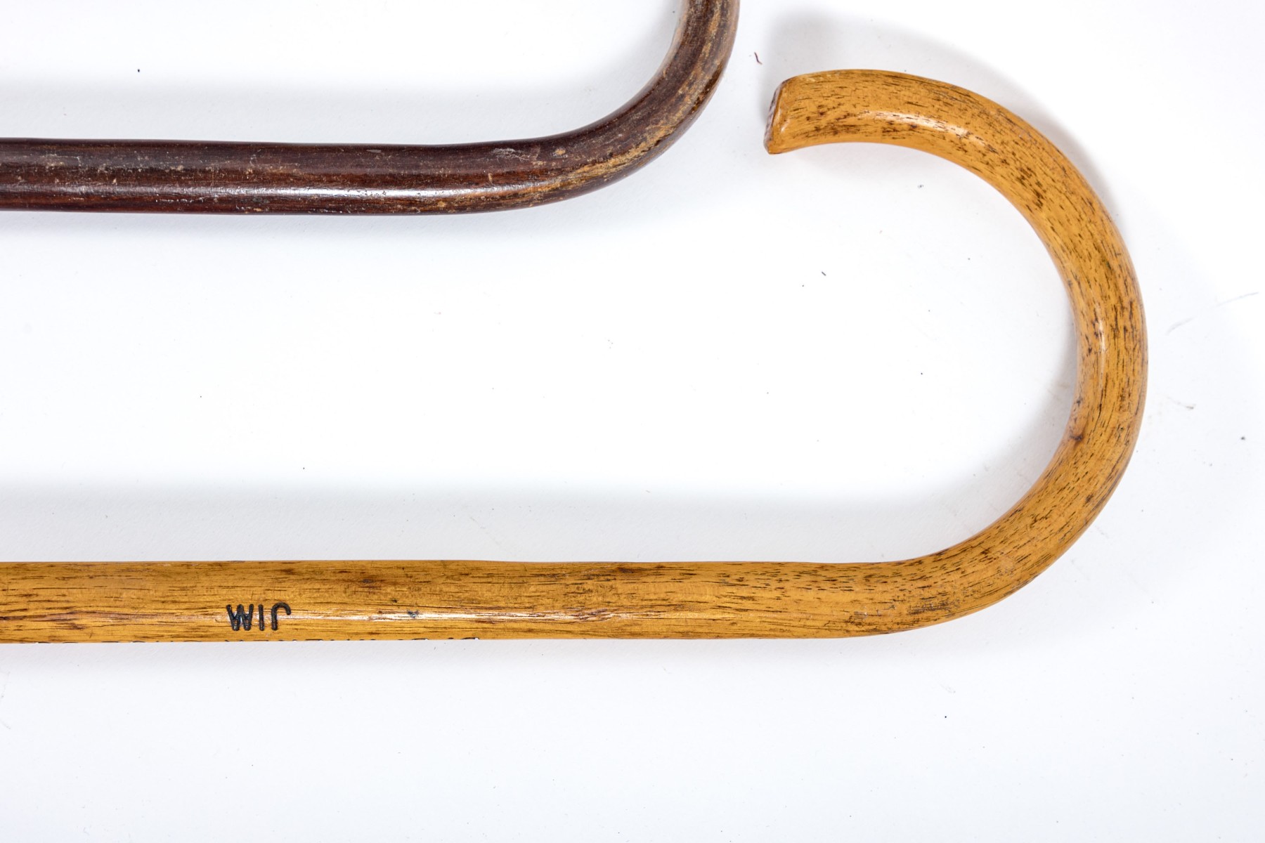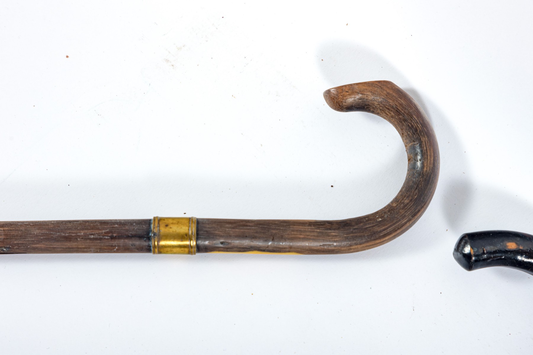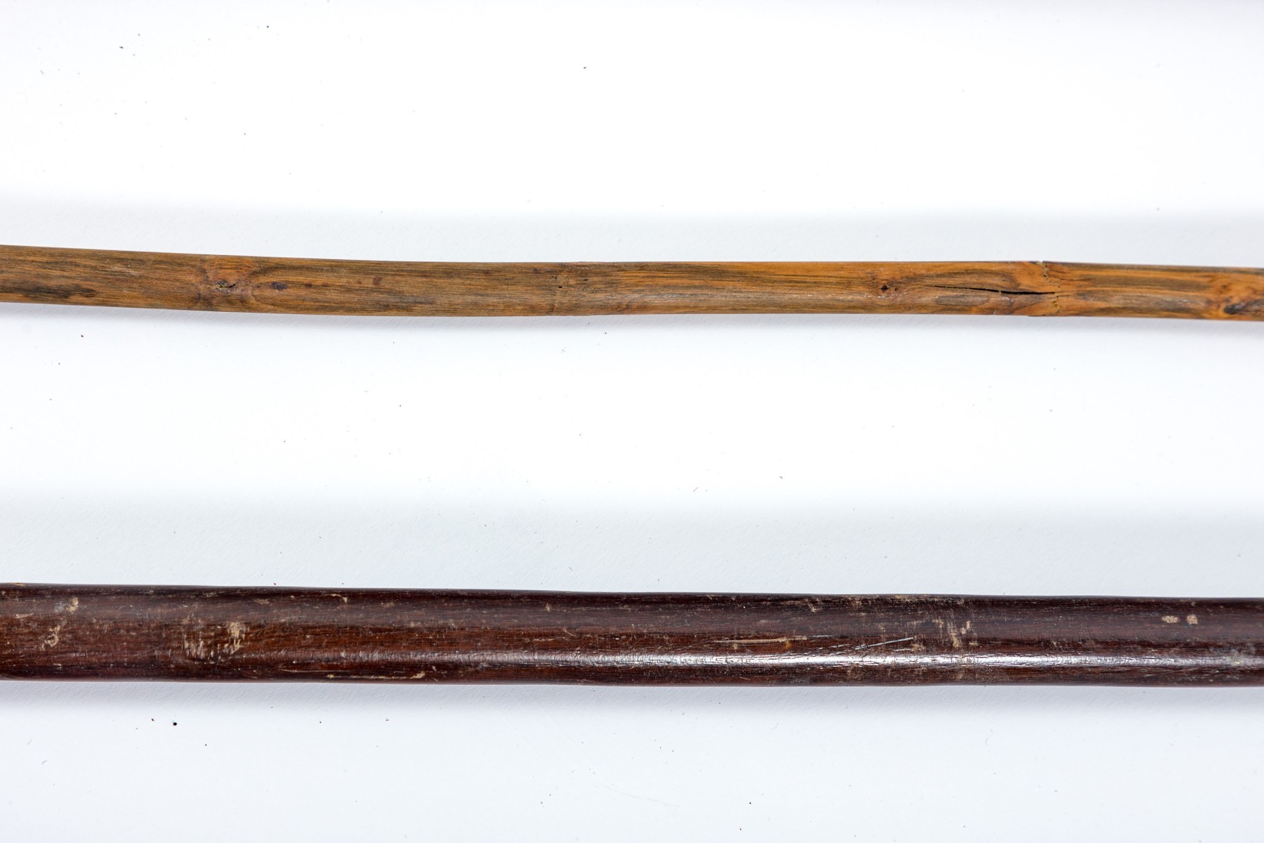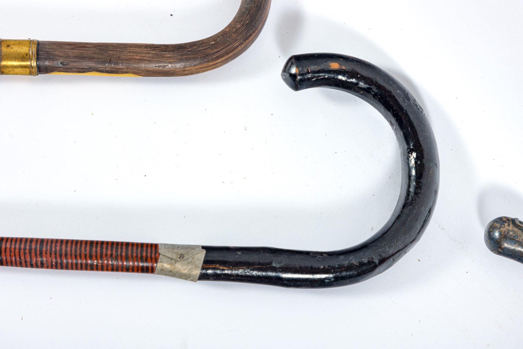 A variety of five antique canes. Traditional in design with looped handles and simple wood construction.