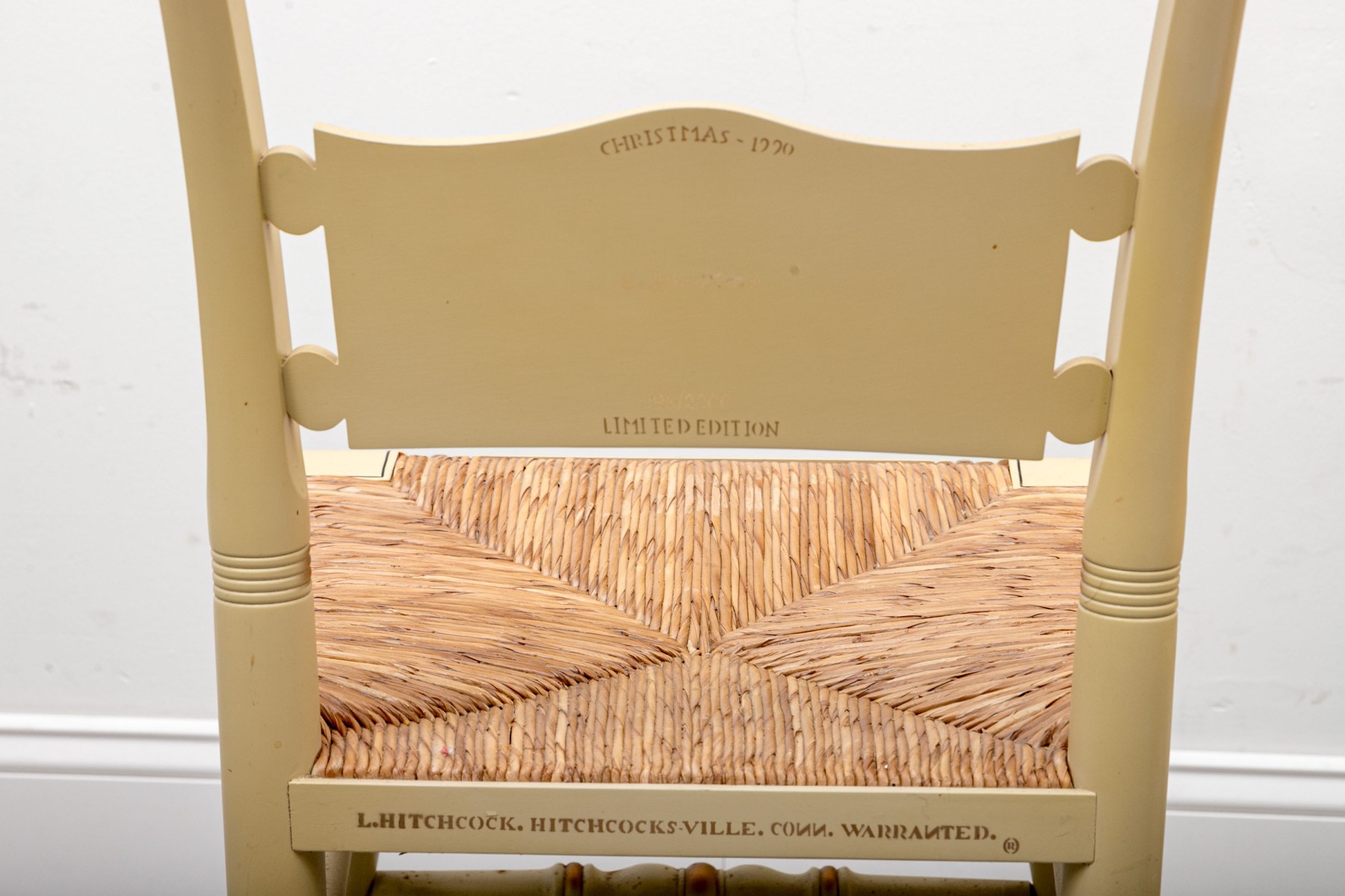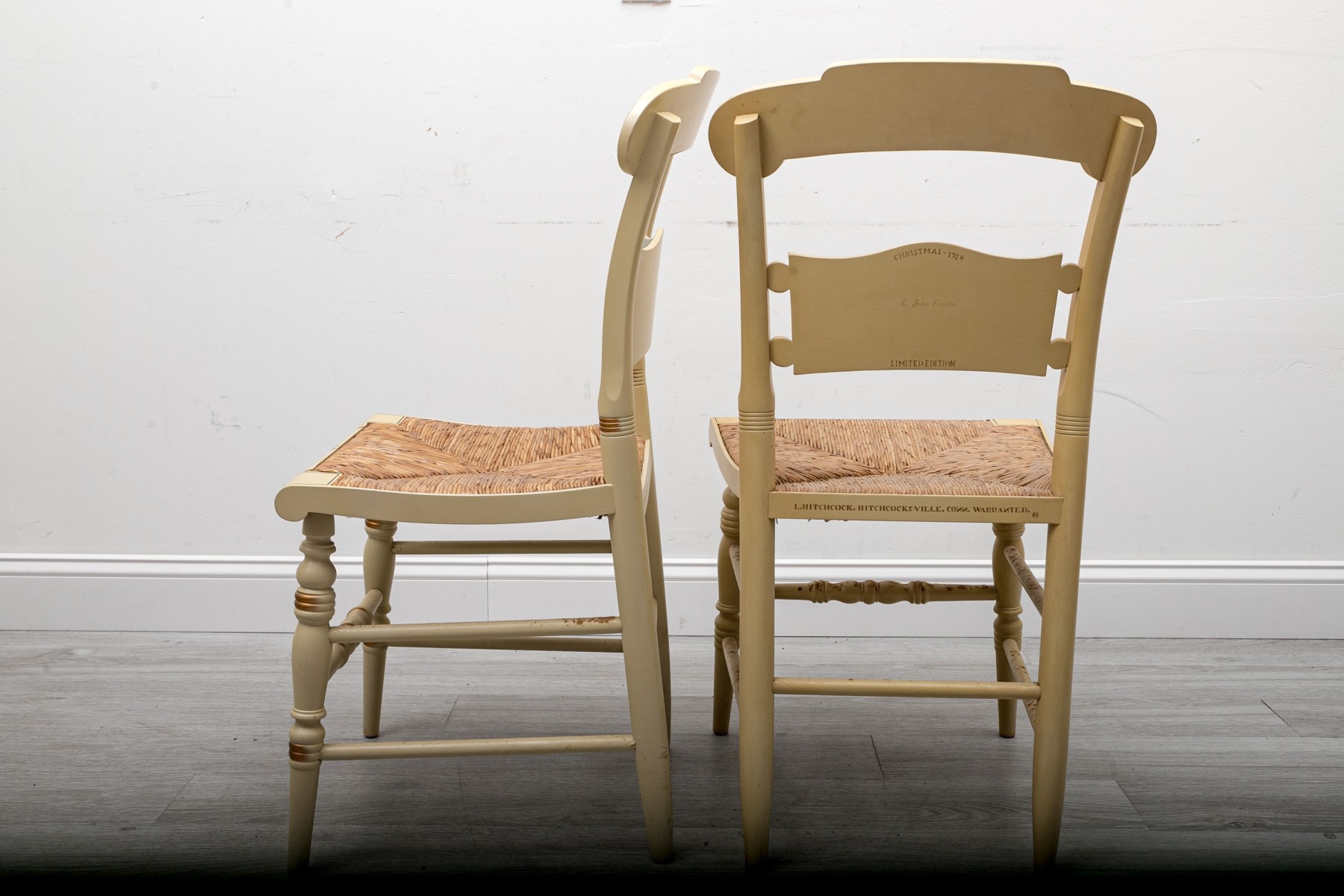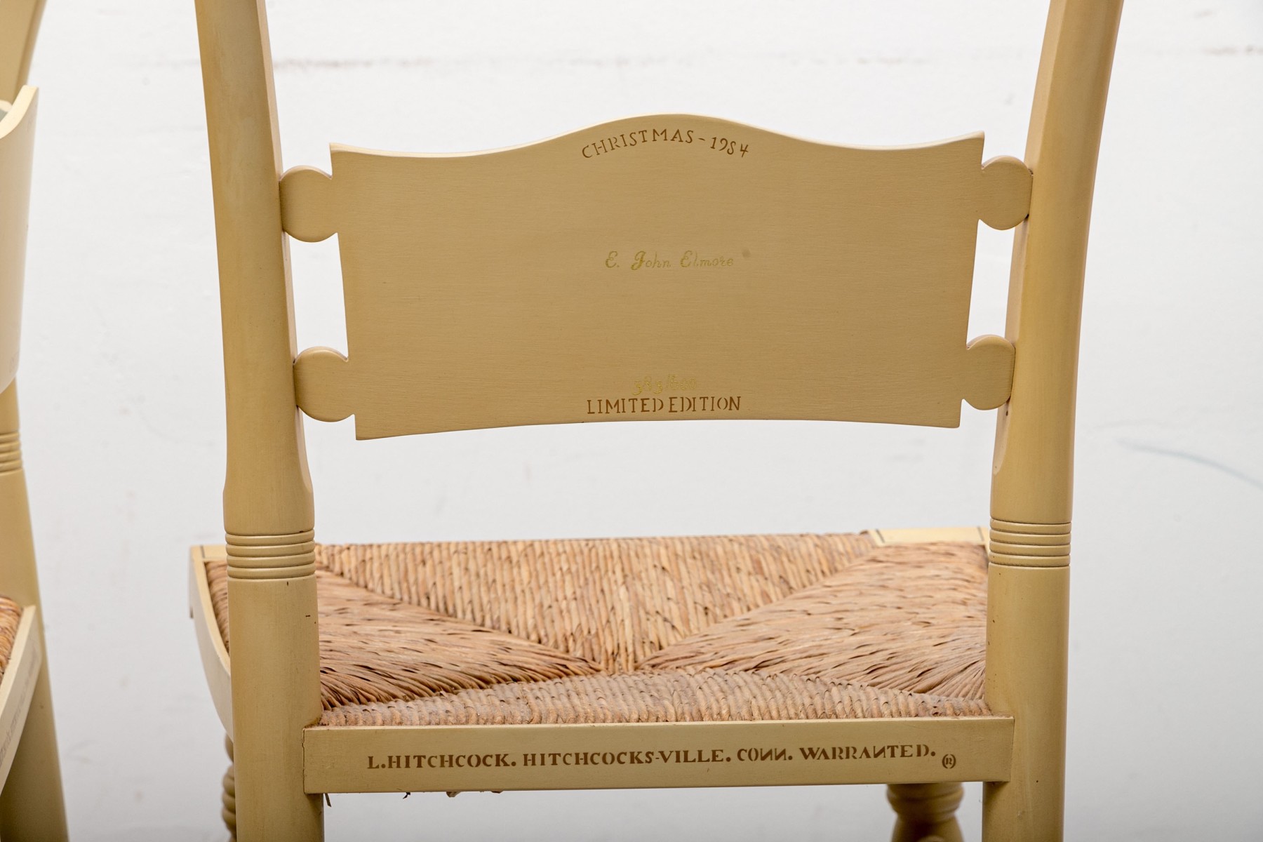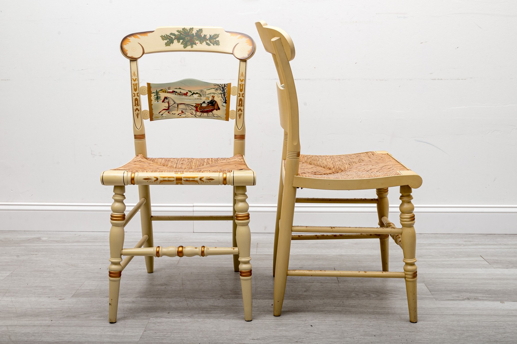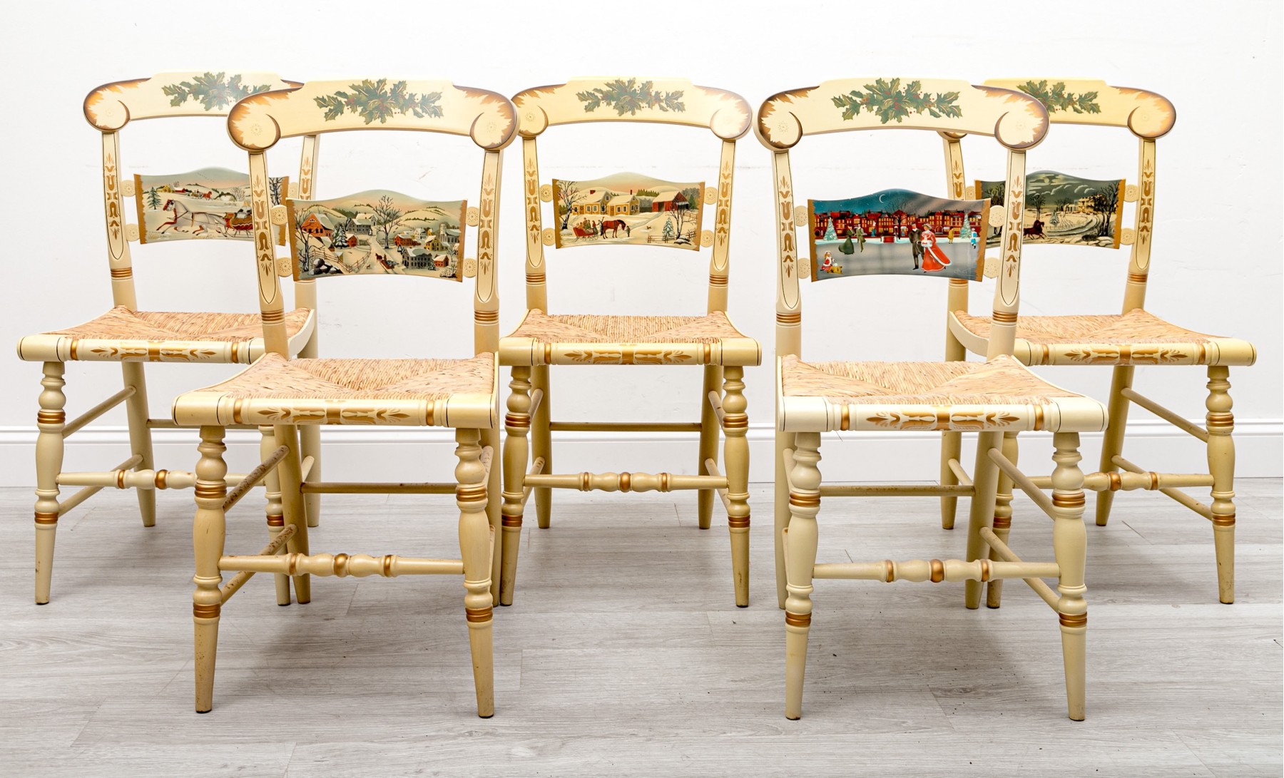 A set of five Lambert Hitchcock (Commissioned by John Elmore) 1984 - 1991 limited edition Colonial Christmas chairs with detailed stencil overlays, rush seats, and solid wood construction painted cream.