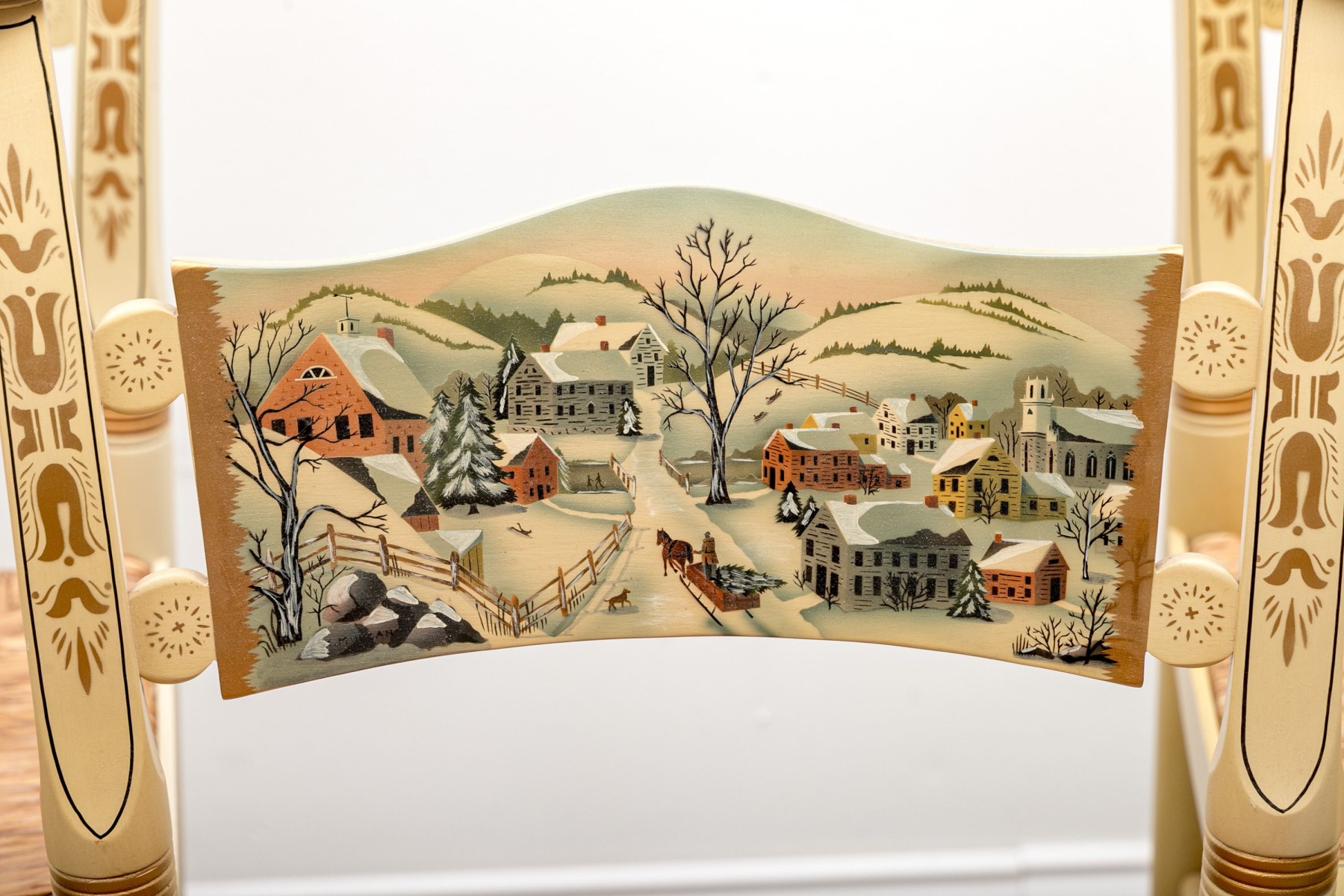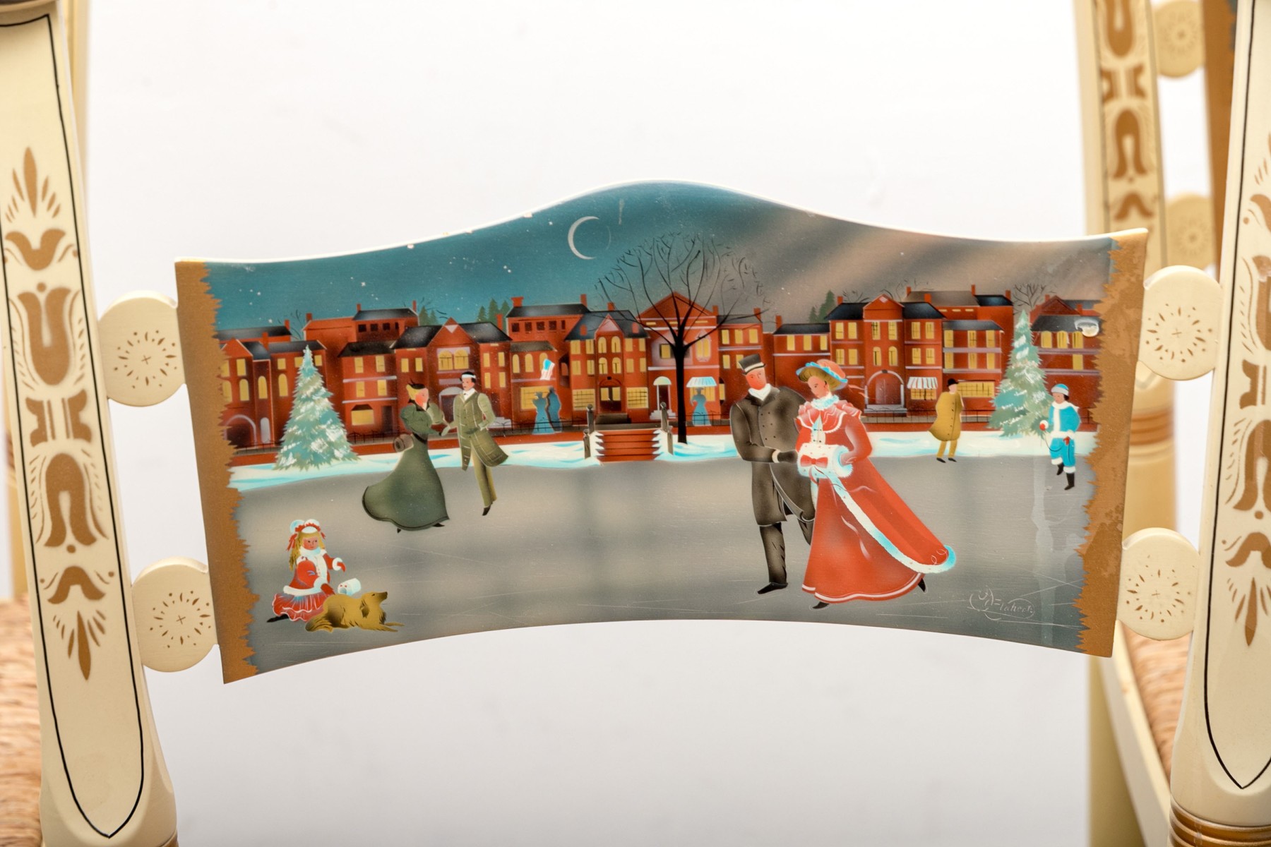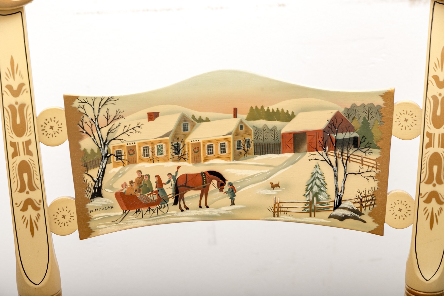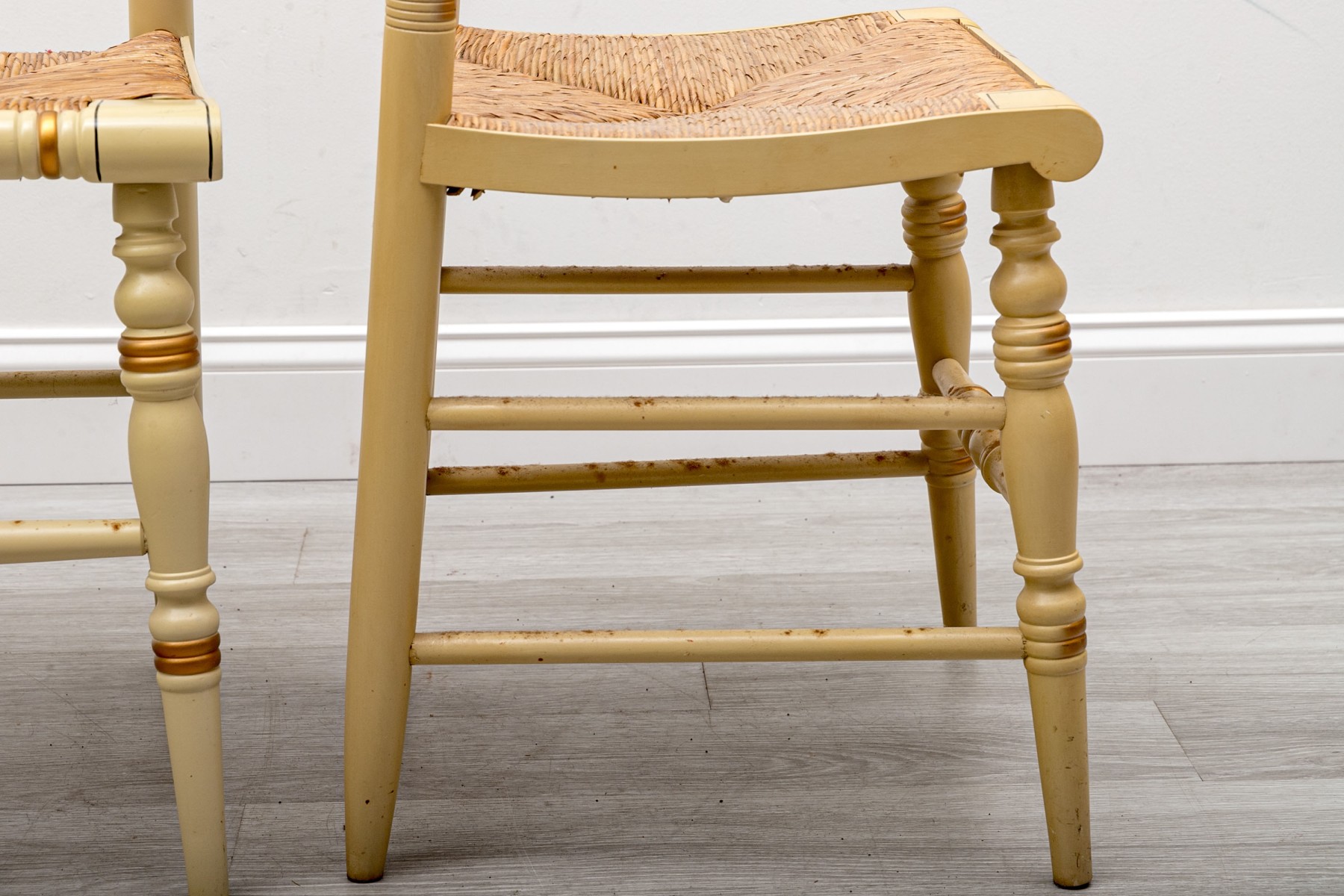 A set of five Lambert Hitchcock (Commissioned by John Elmore) 1984 - 1991 limited edition Colonial Christmas chairs with detailed stencil overlays, rush seats, and solid wood construction painted cream.
