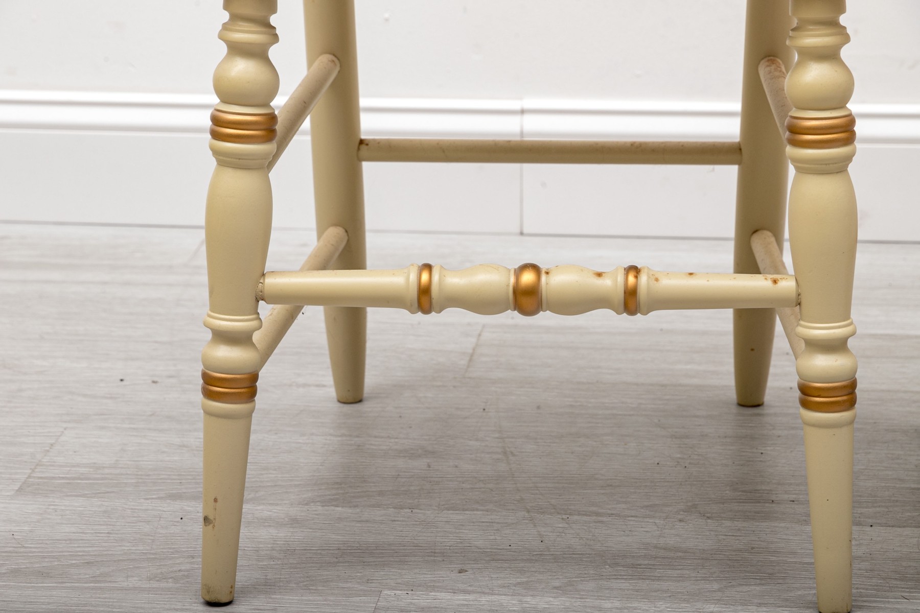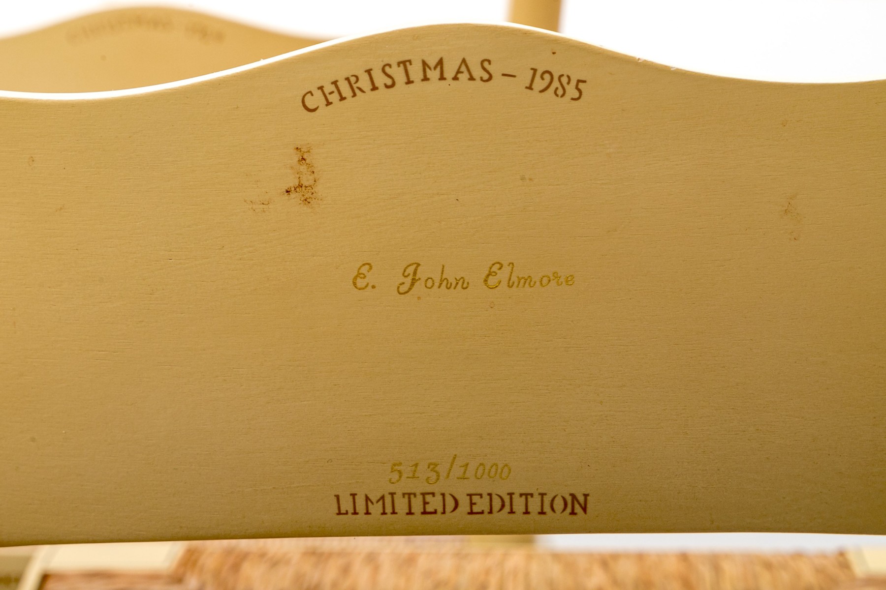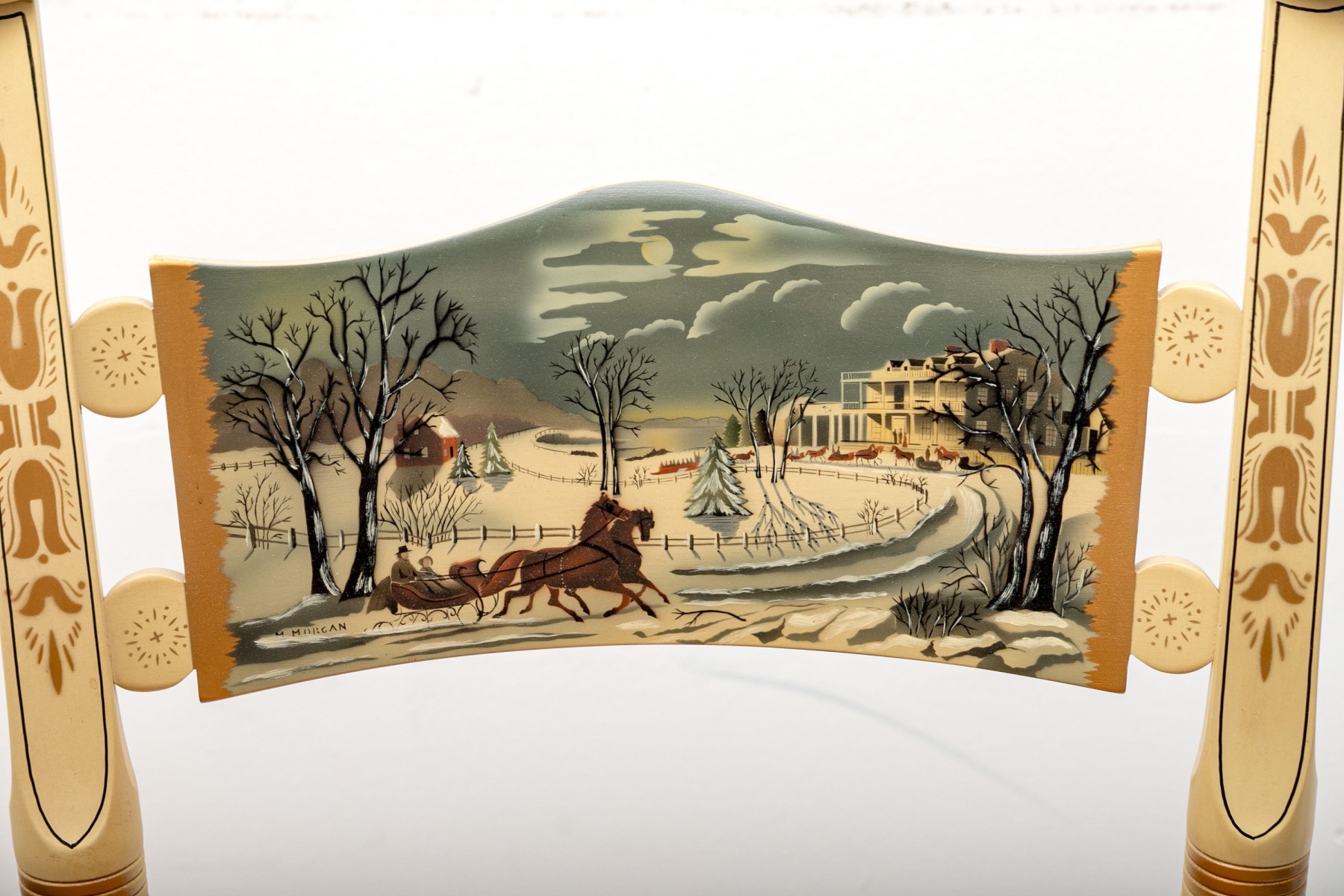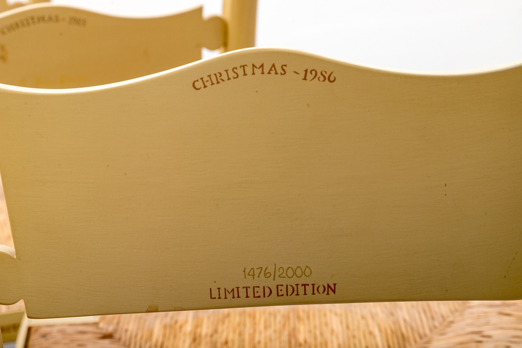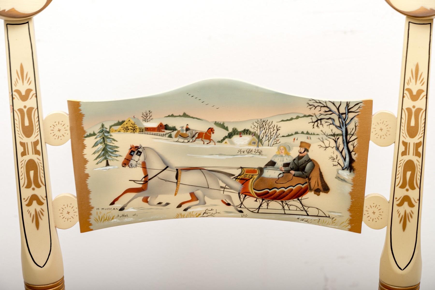 A set of five Lambert Hitchcock (Commissioned by John Elmore) 1984 - 1991 limited edition Colonial Christmas chairs with detailed stencil overlays, rush seats, and solid wood construction painted cream.