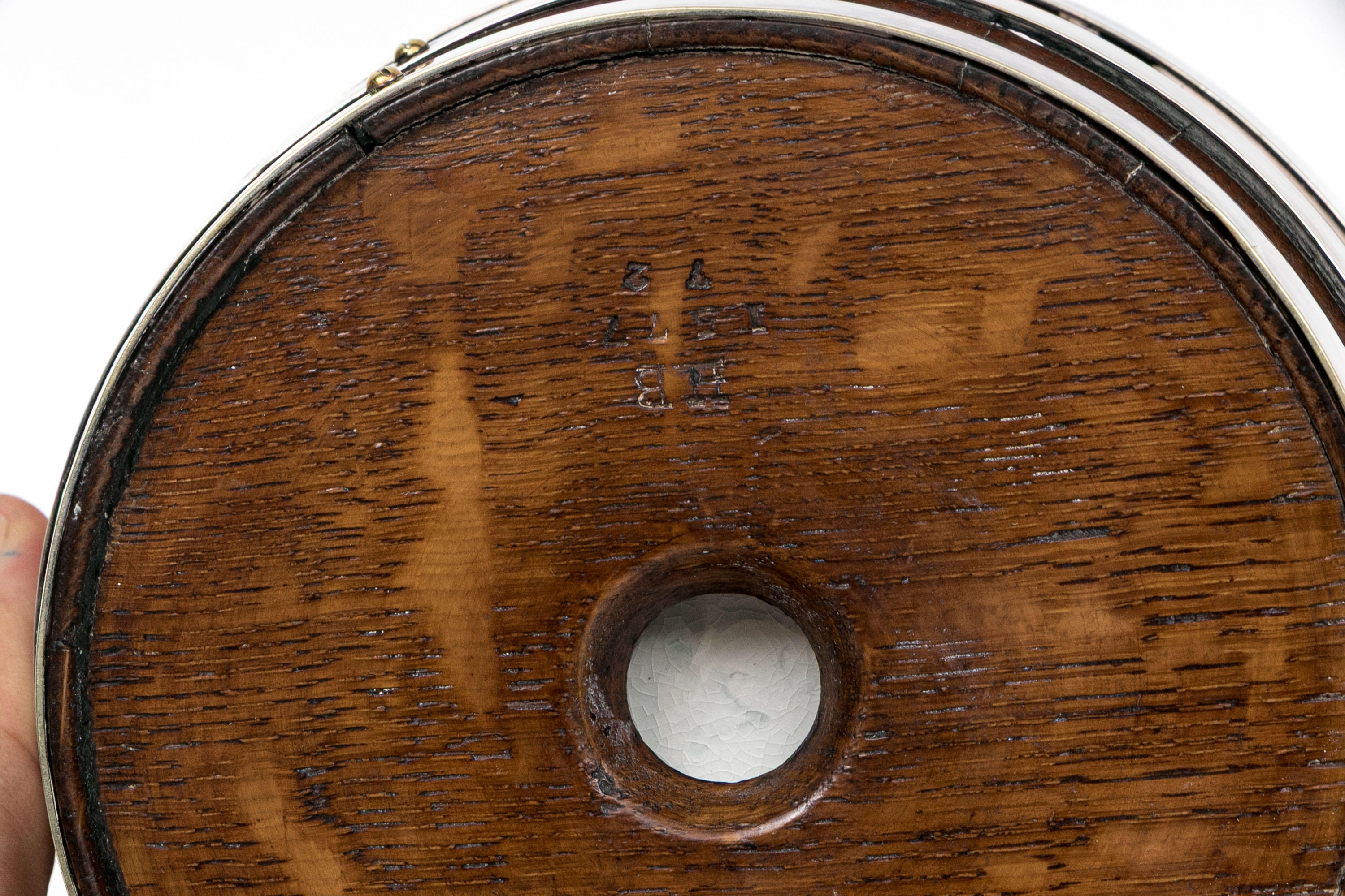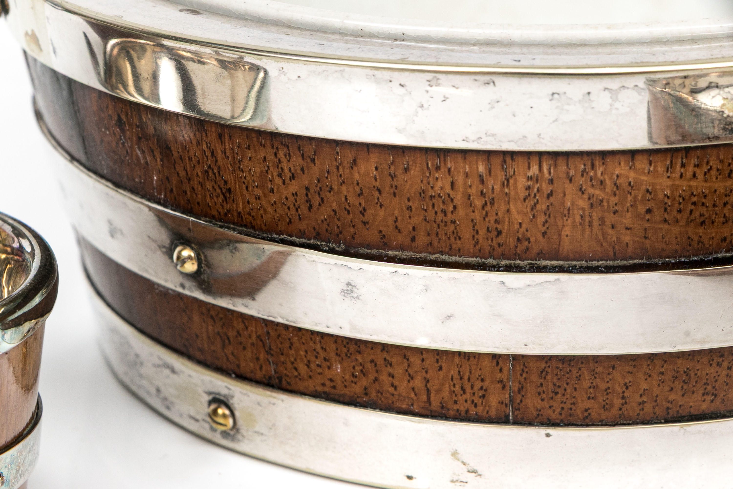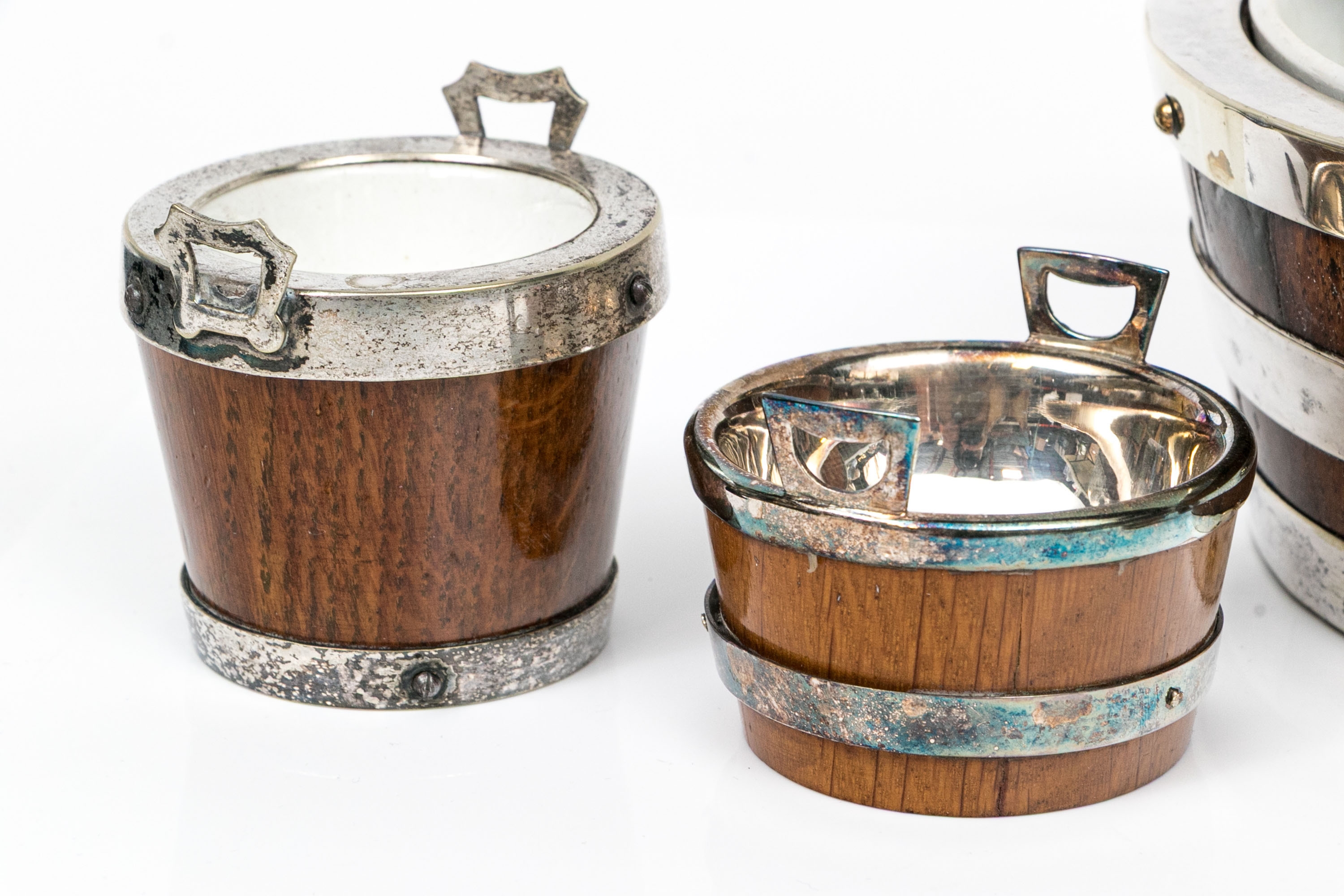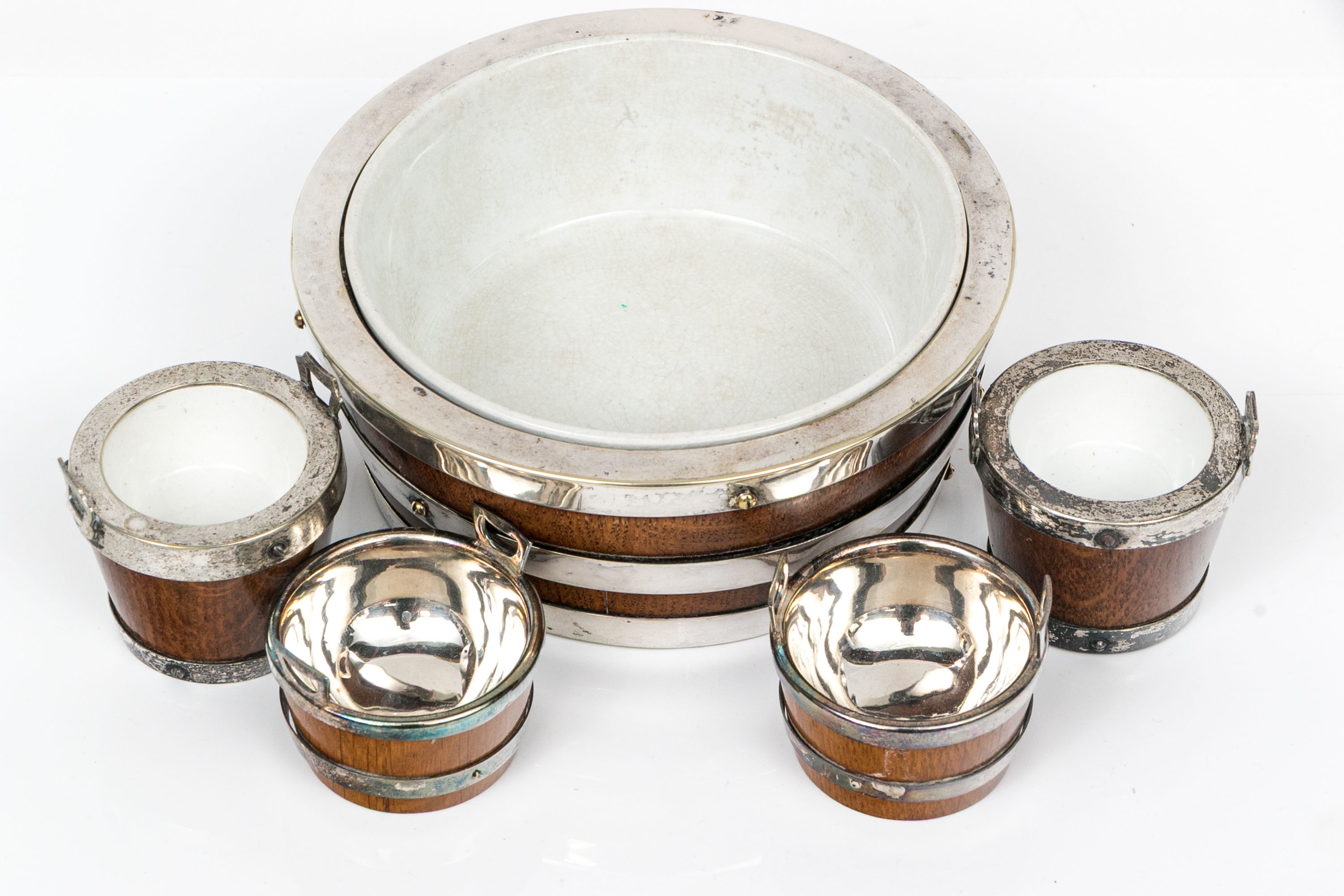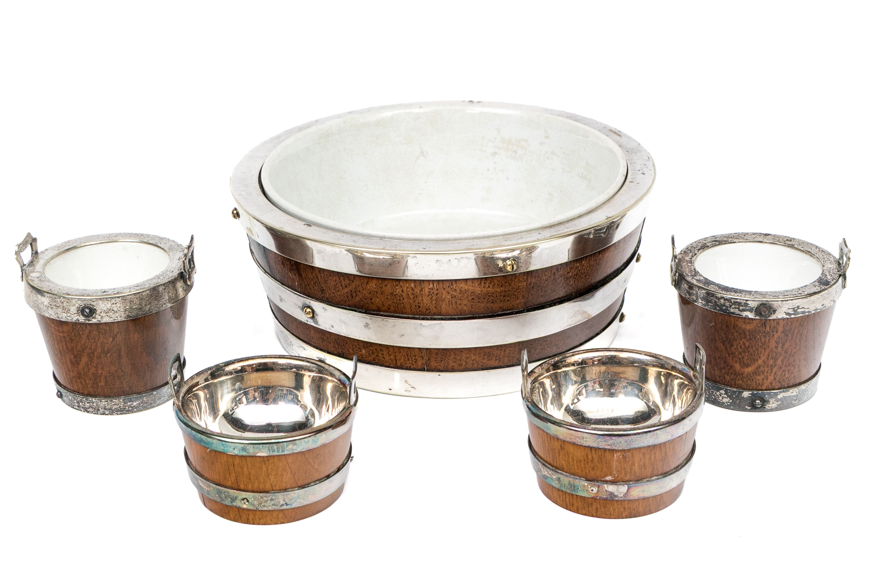 Condition: The ceramic bowl has stains and the wooden bowl is worn and stained inside. Some wear to the wooden bases. Tarnished silverplate.