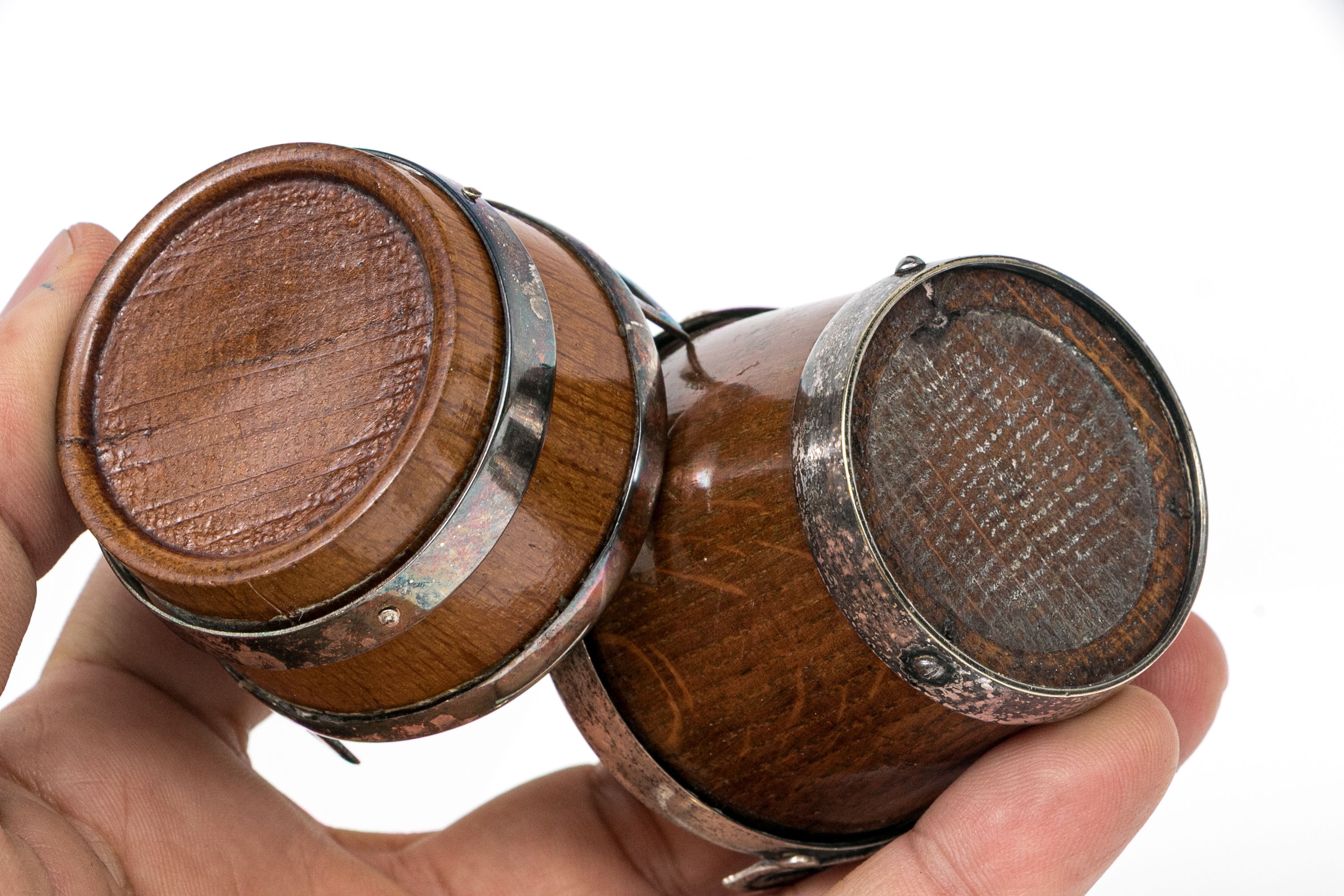 and a pair of ceramic lined bucket shaped salts or condiment containers