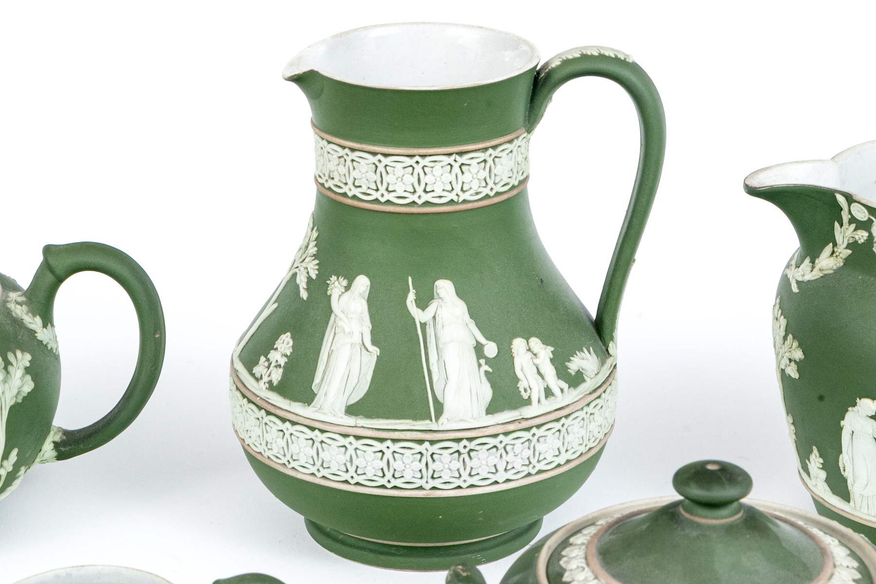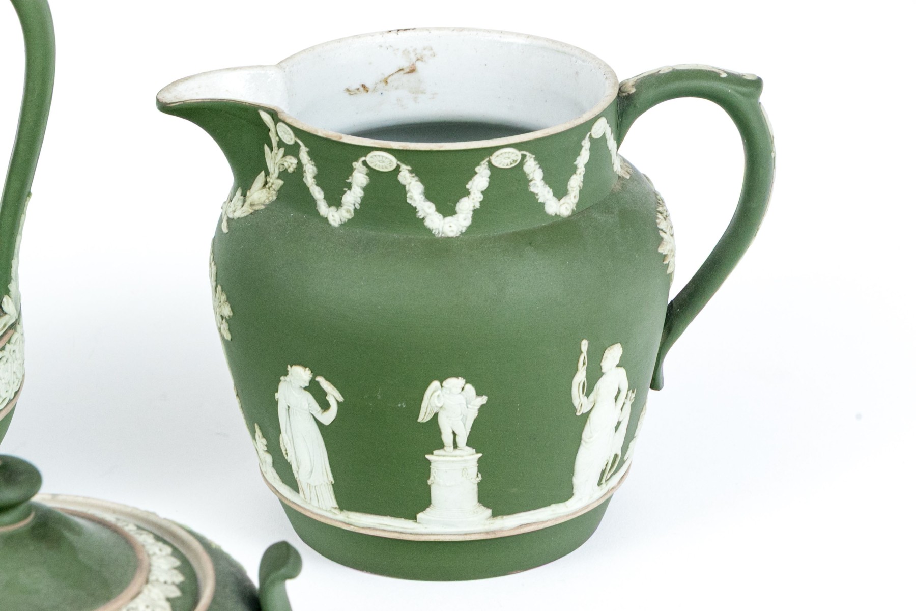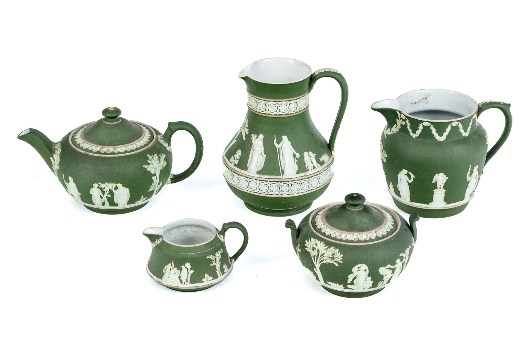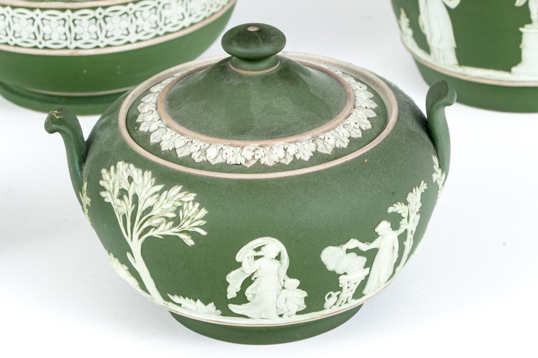 A charming five piece Wedgwood tea set including a lidded teapot, two jugs, a lidded sugar, and creamer in rich green bisque with neoclassical white relief scenes.