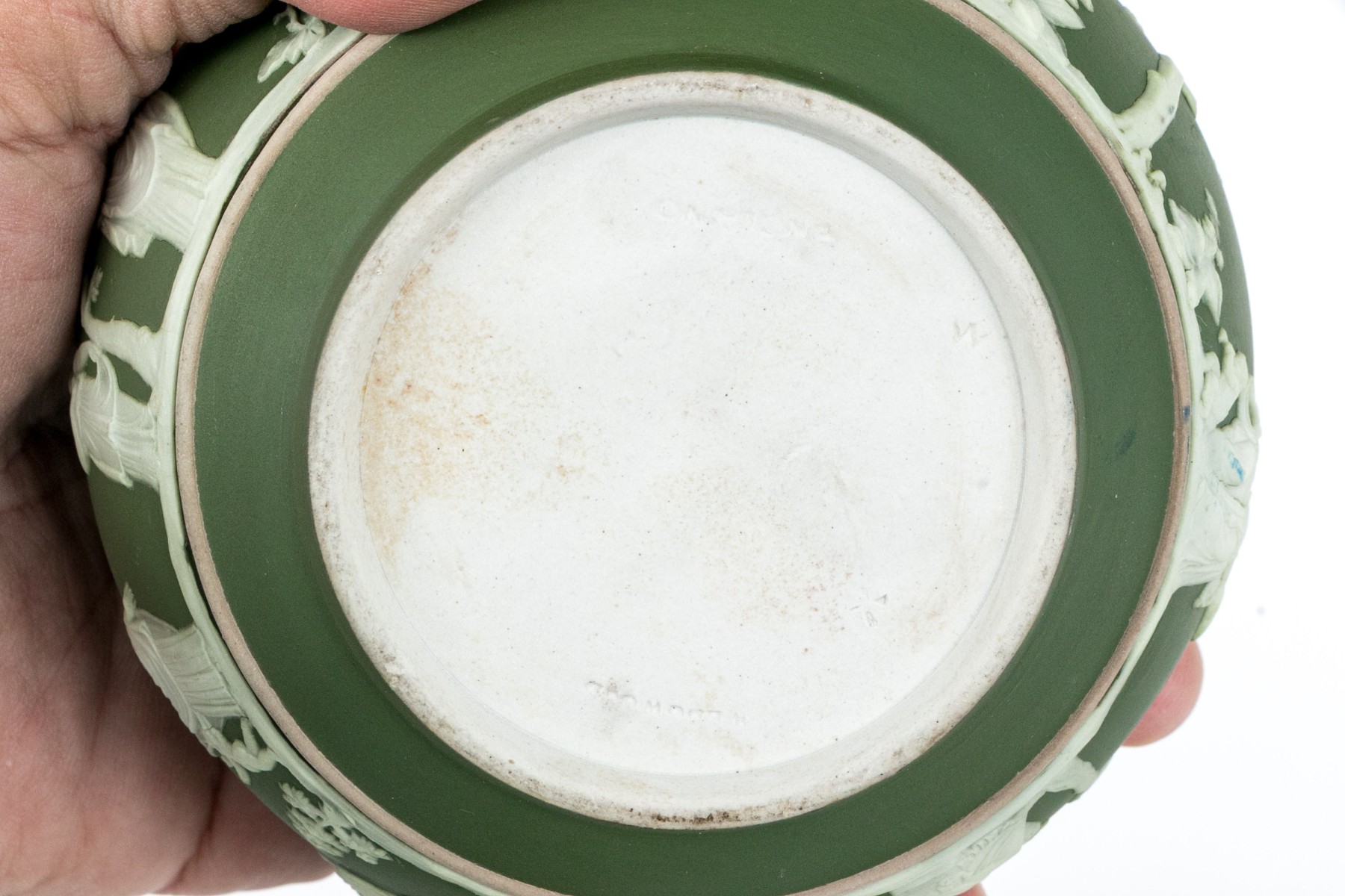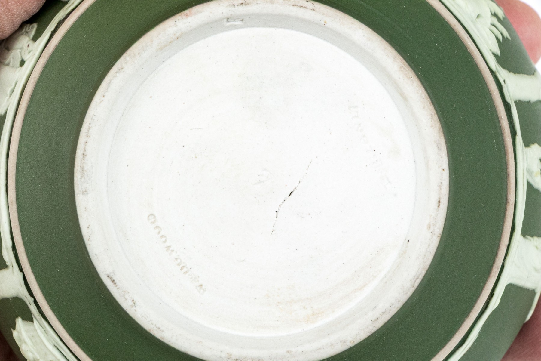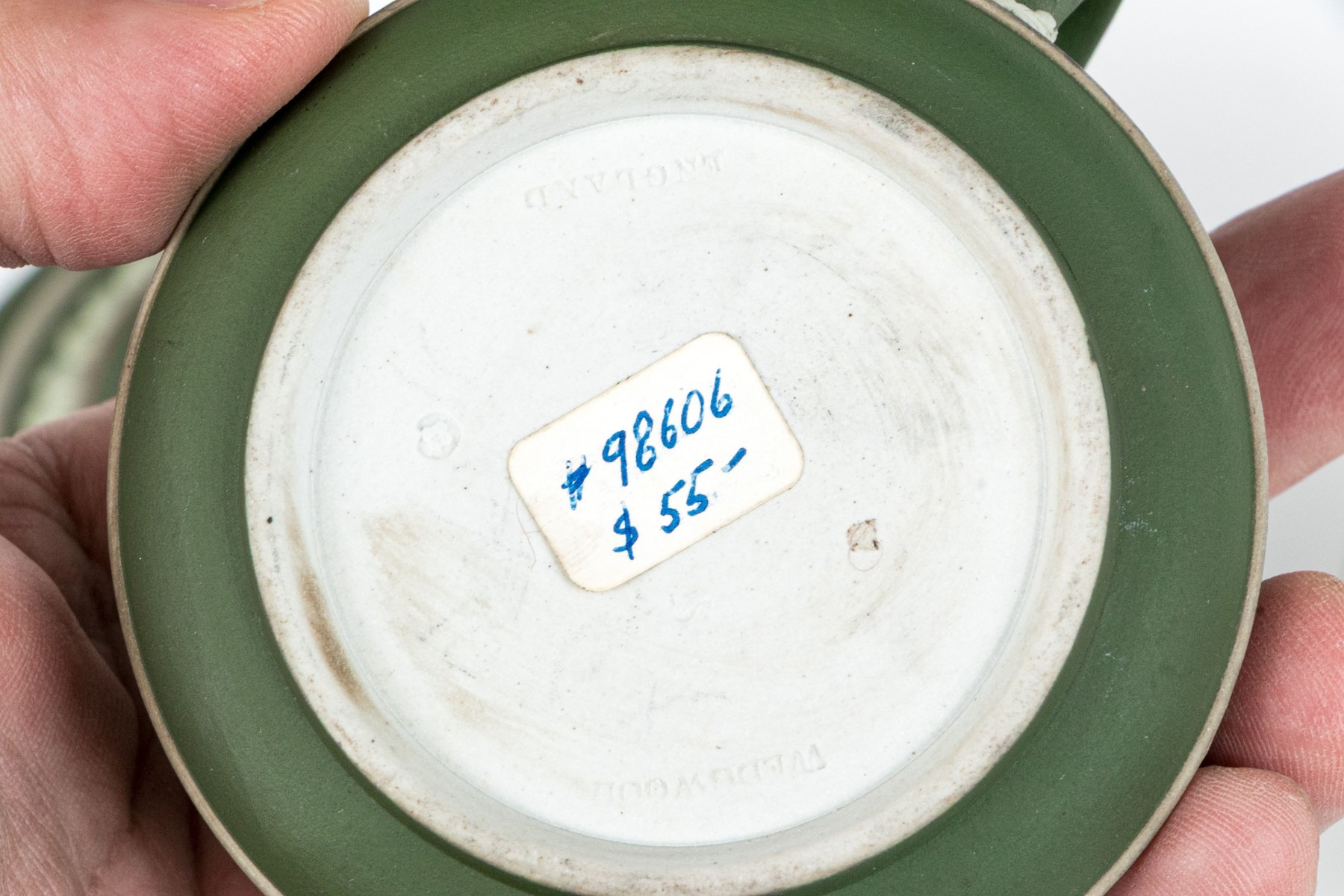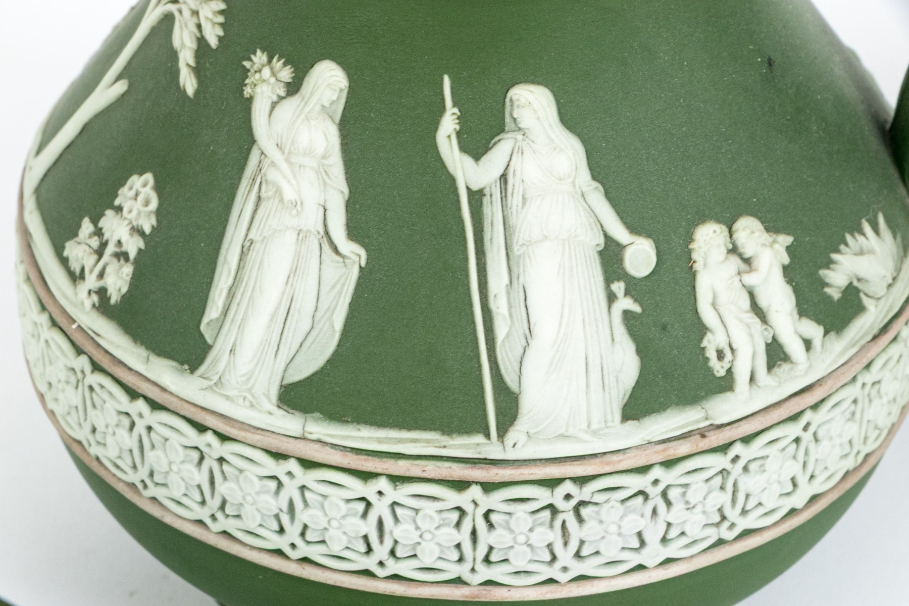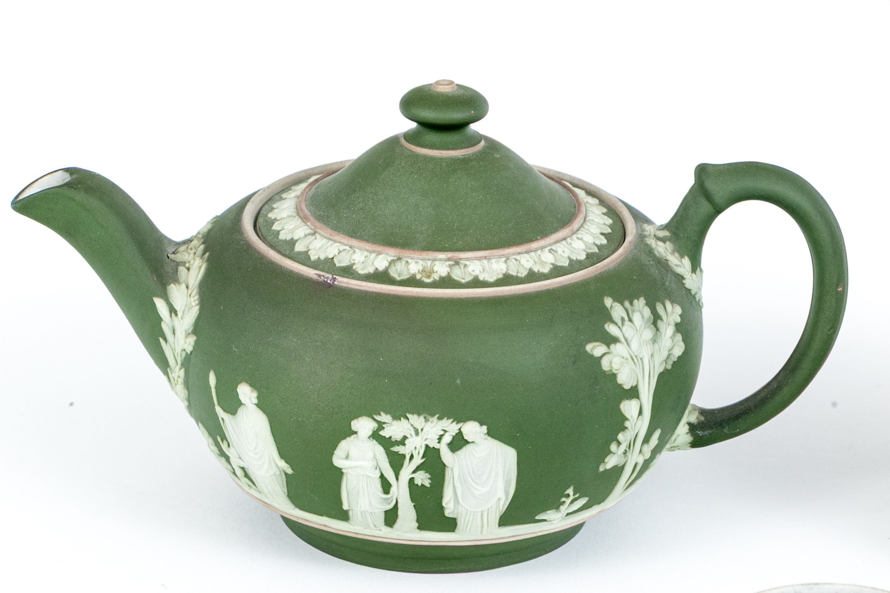 A charming five piece Wedgwood tea set including a lidded teapot, two jugs, a lidded sugar, and creamer in rich green bisque with neoclassical white relief scenes.