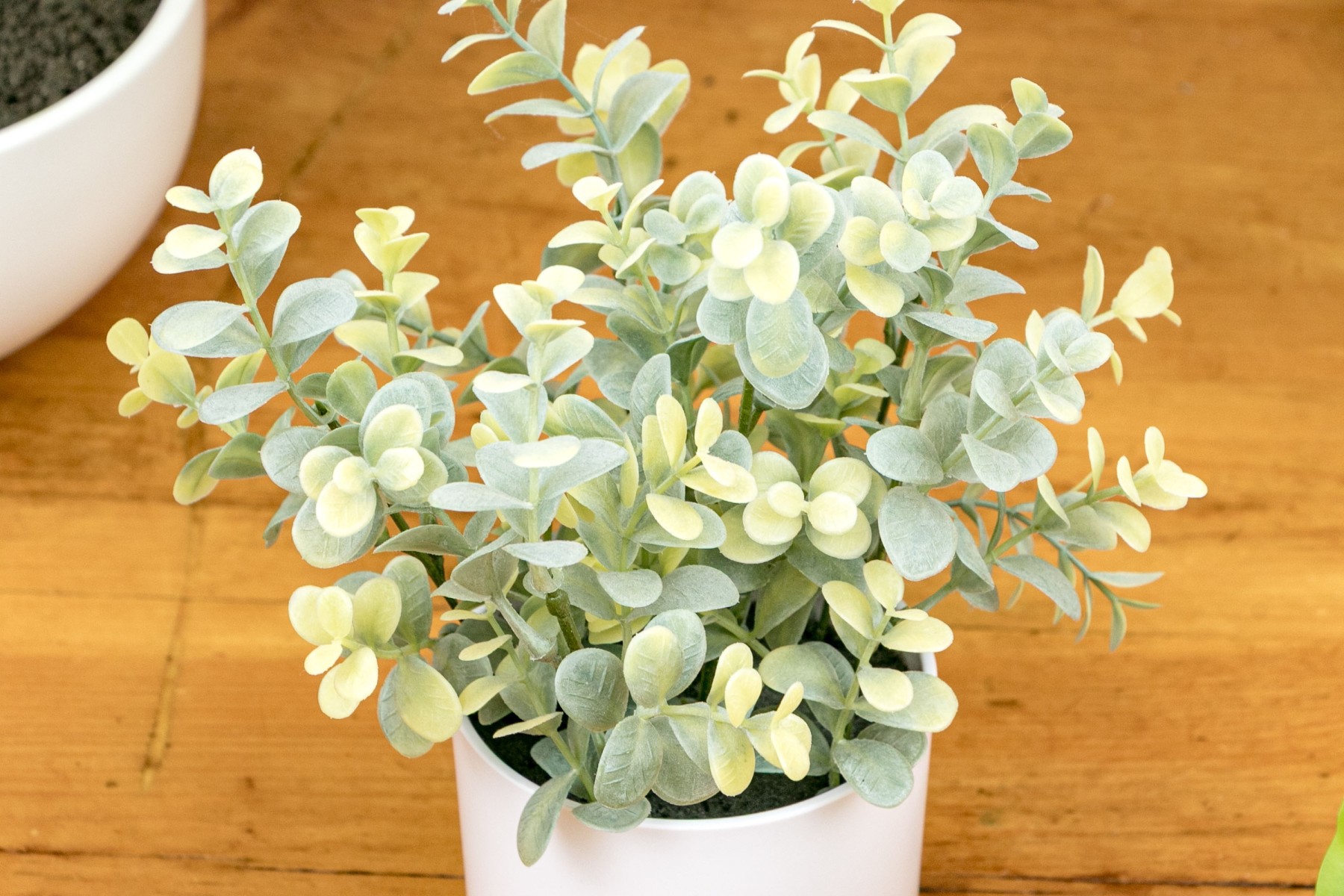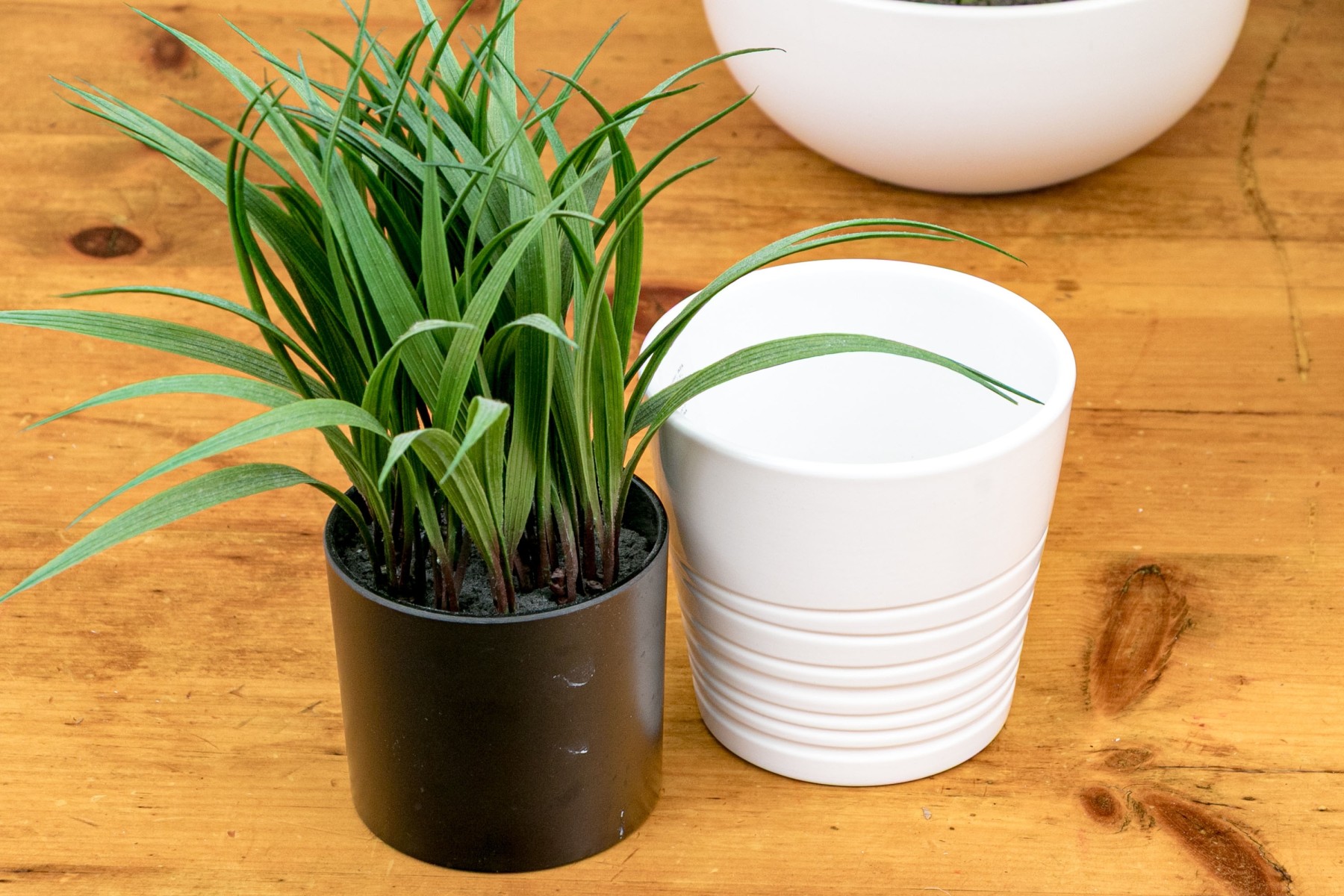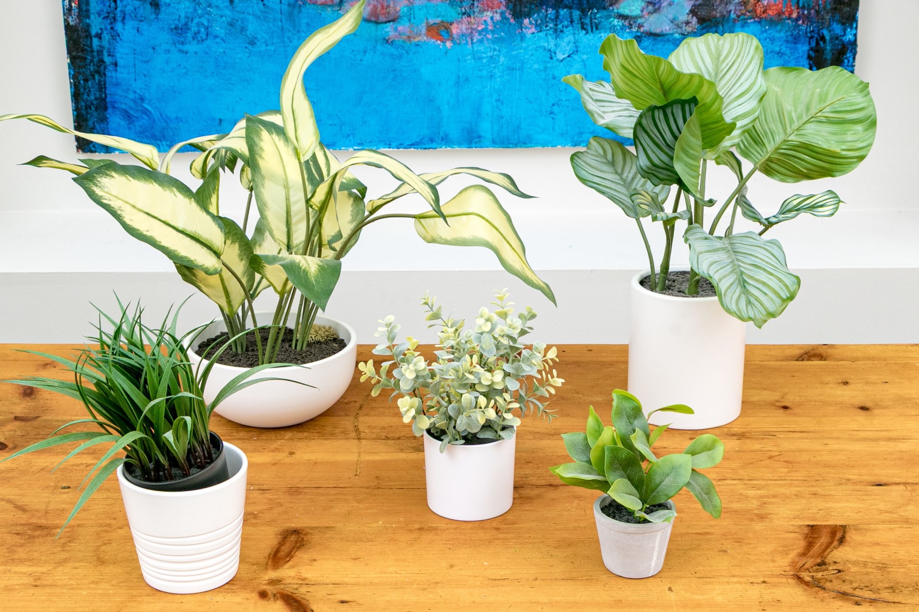 Comprised of decorative faux plants and ceramic planters of differing form and size.