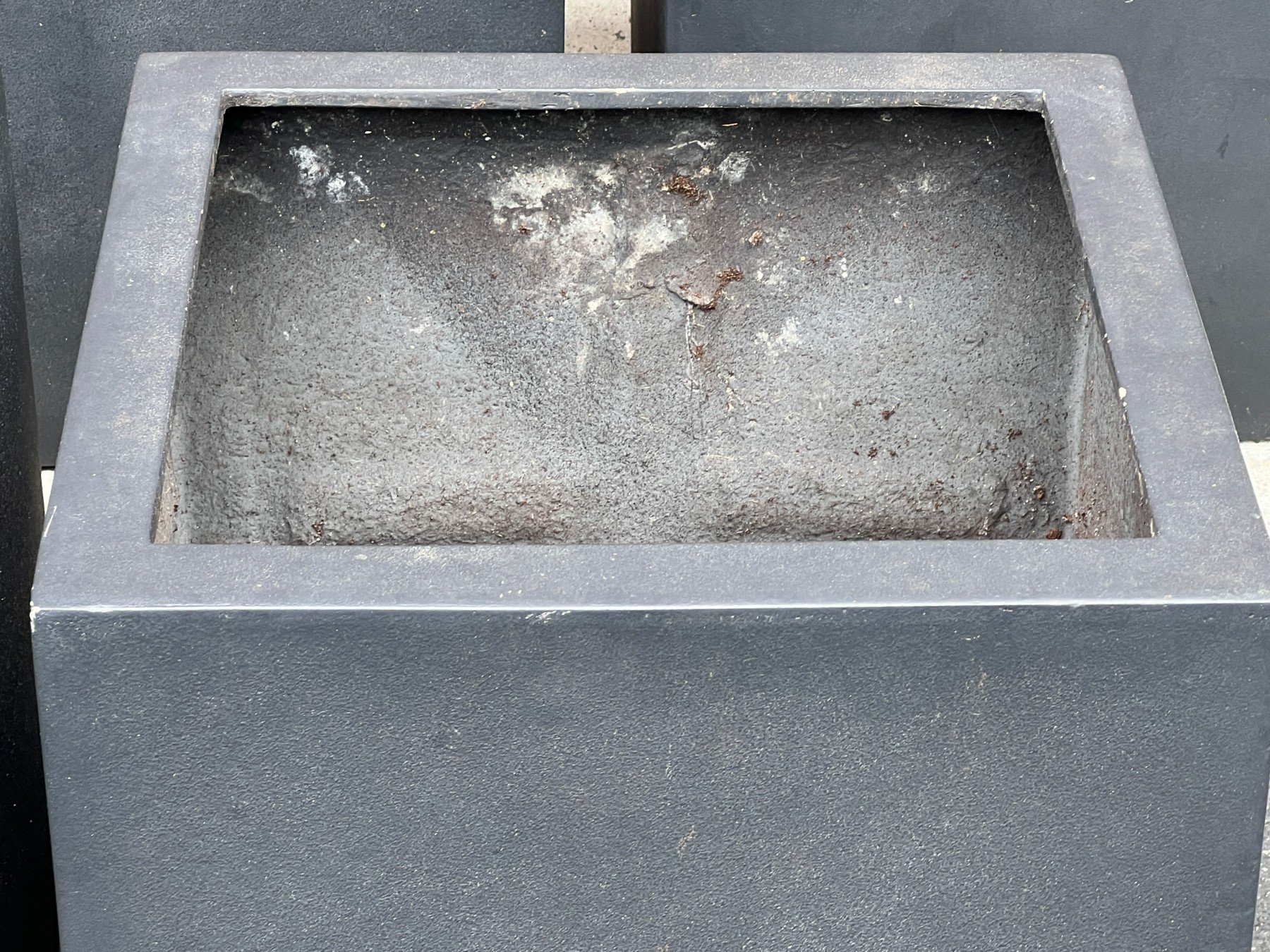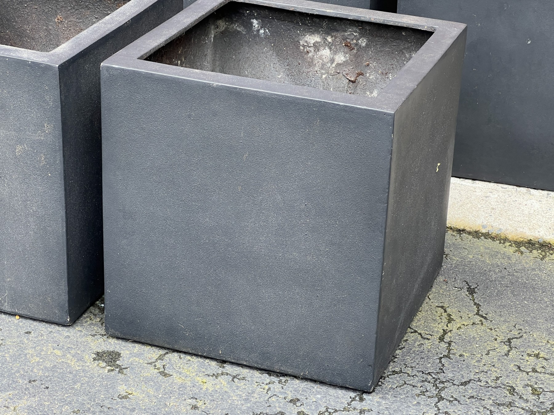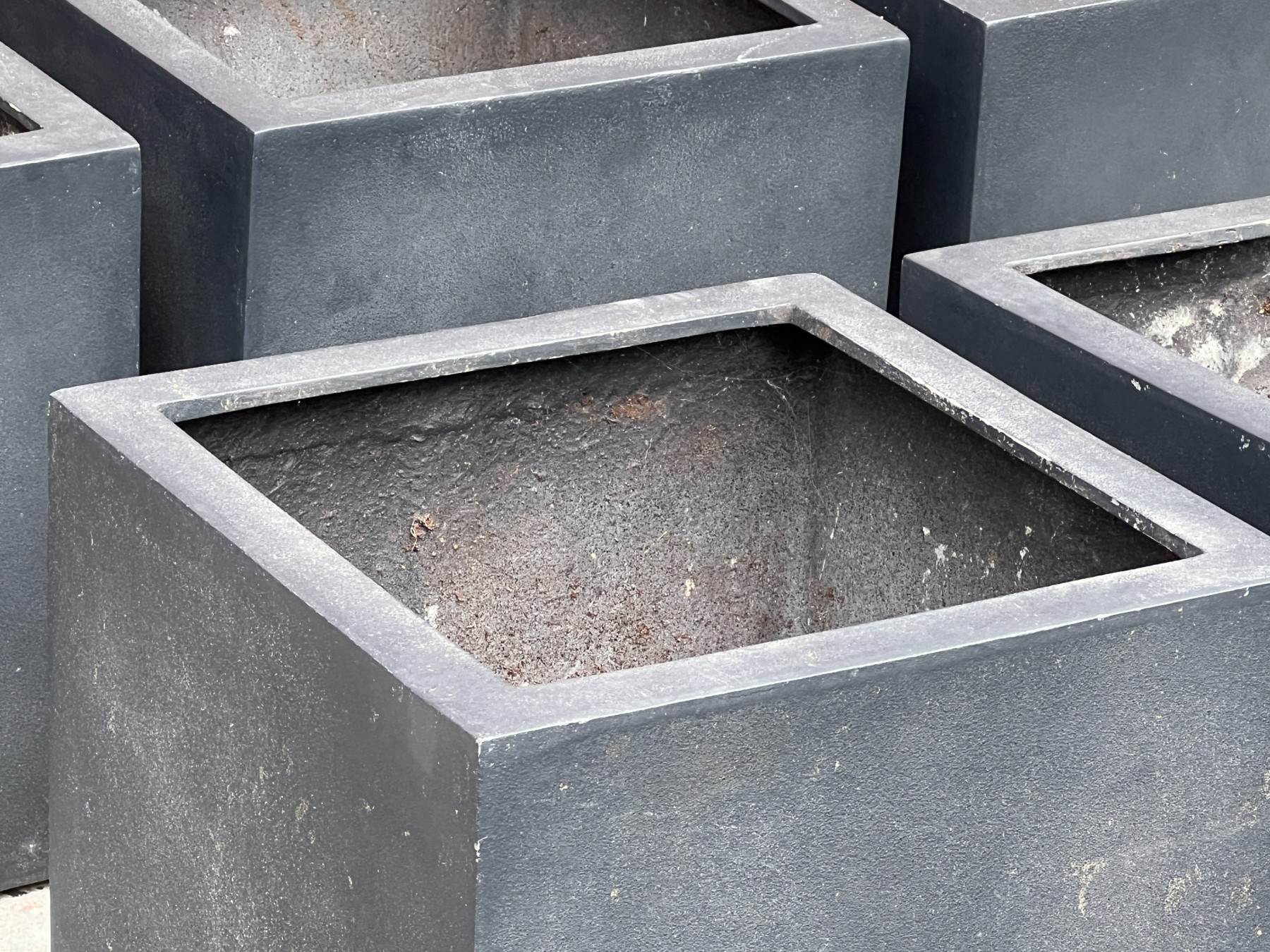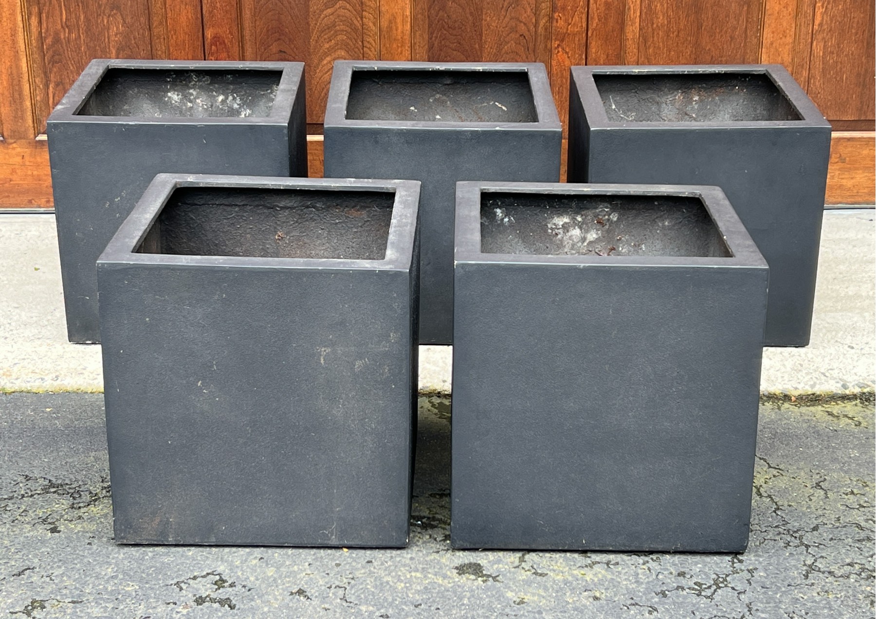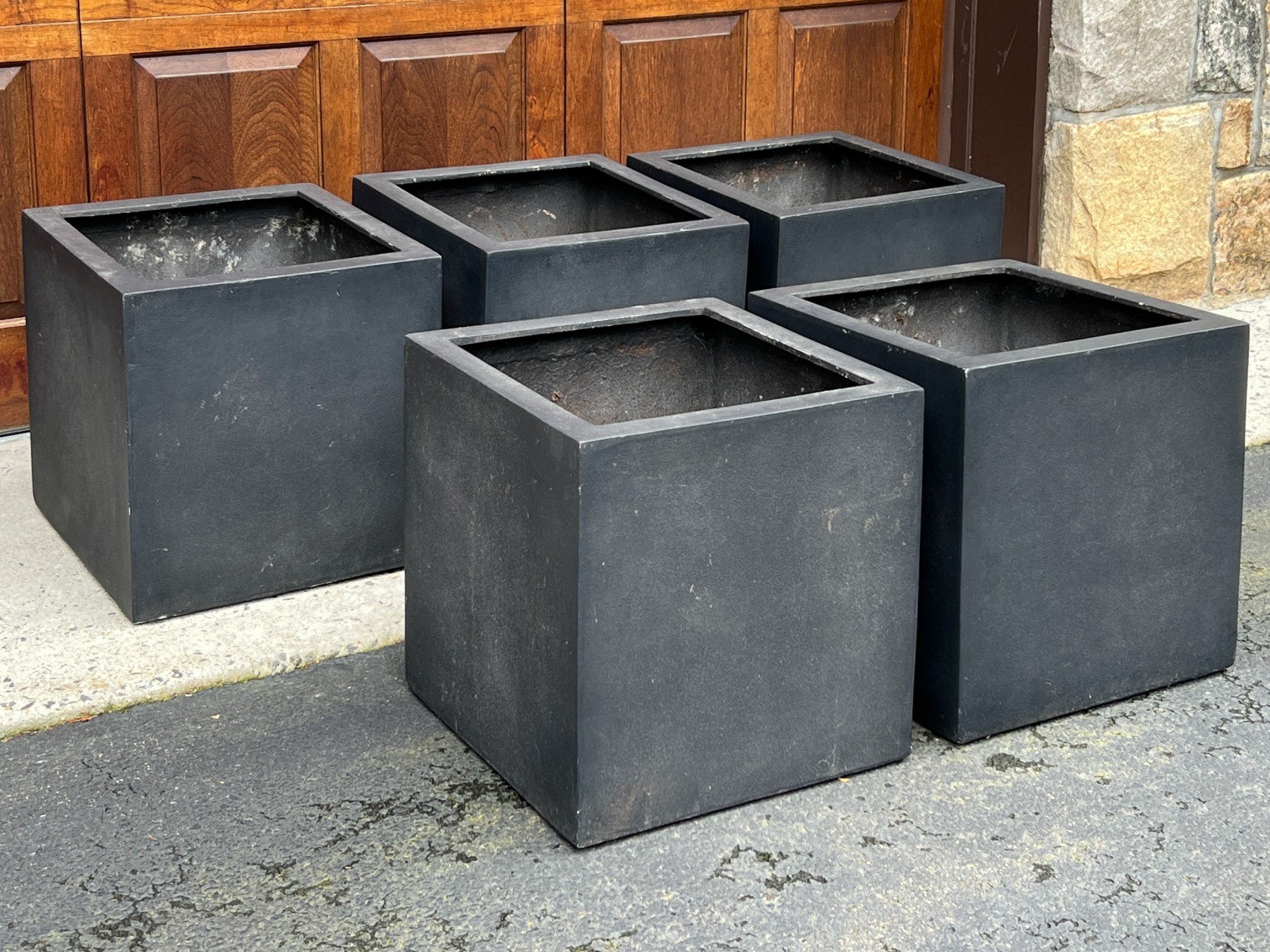 Five black fiberglass planters in a faux stone finish.