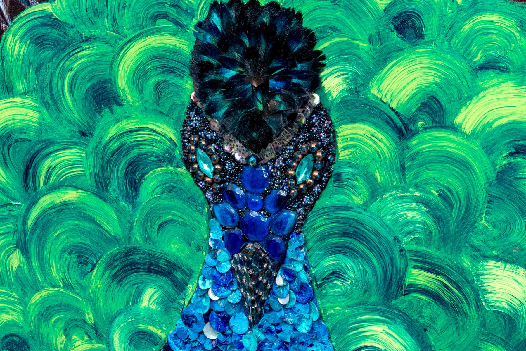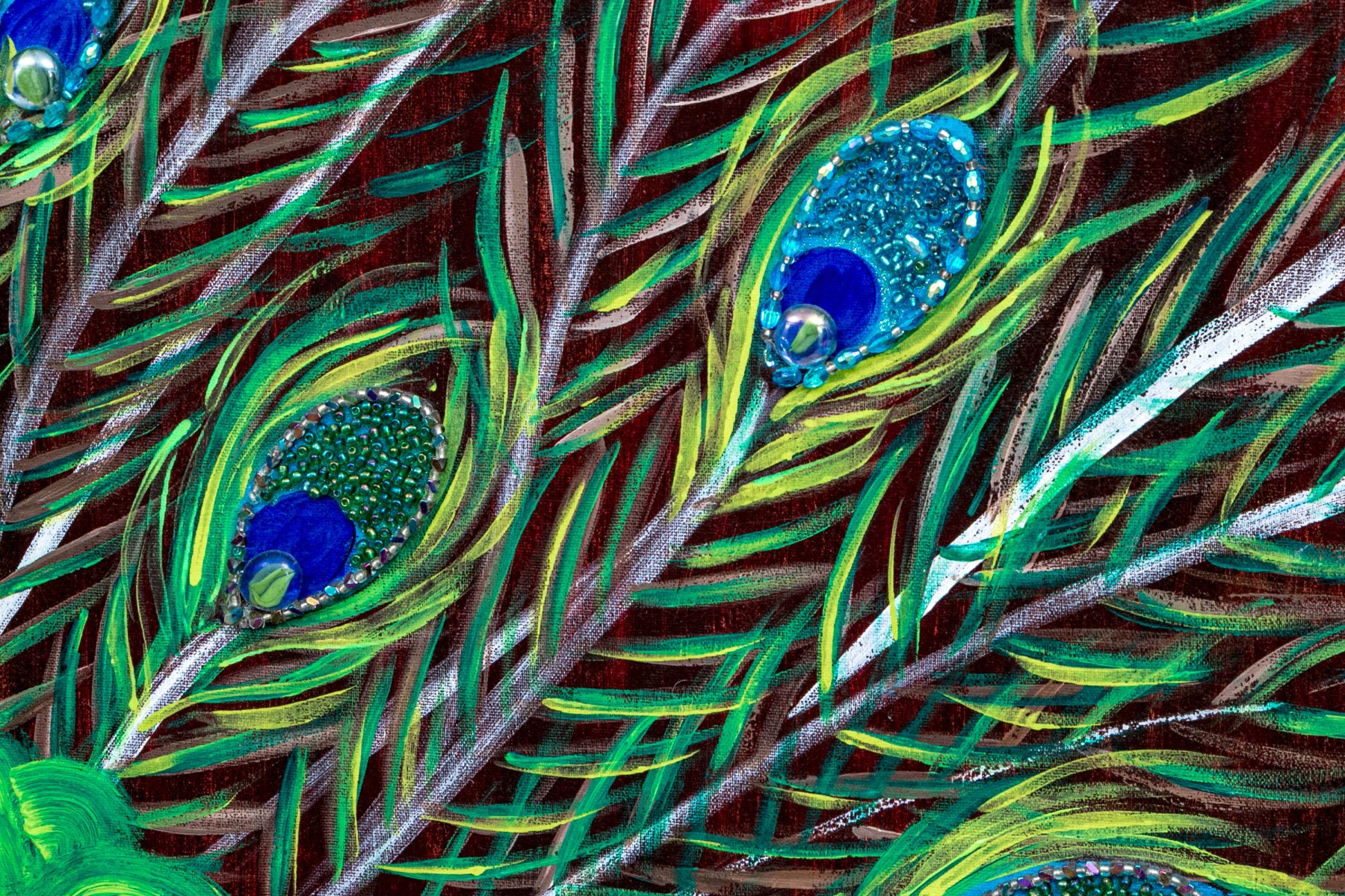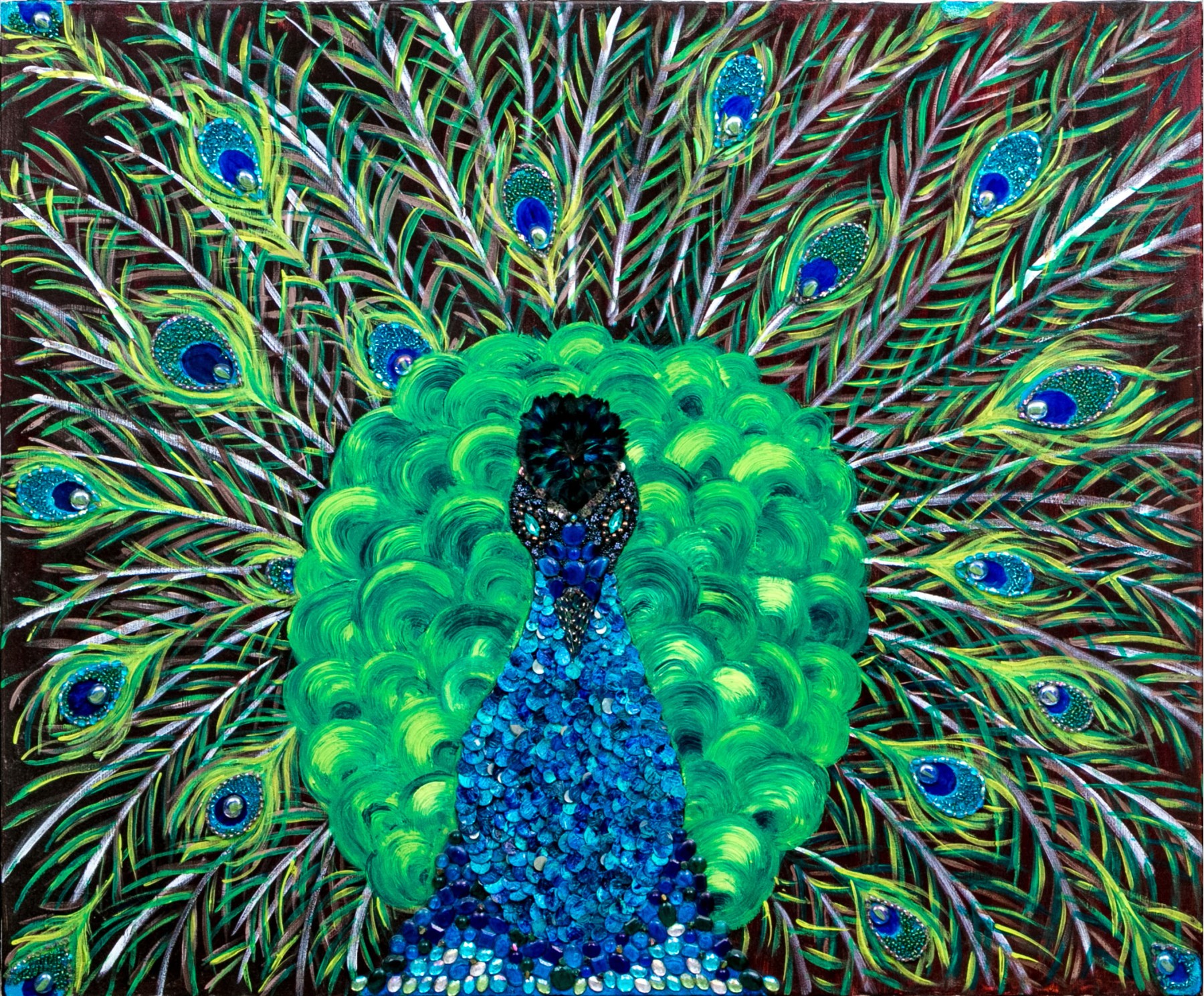 The work is a fabulous depiction of a peacock displaying its wonderful tail feathers.