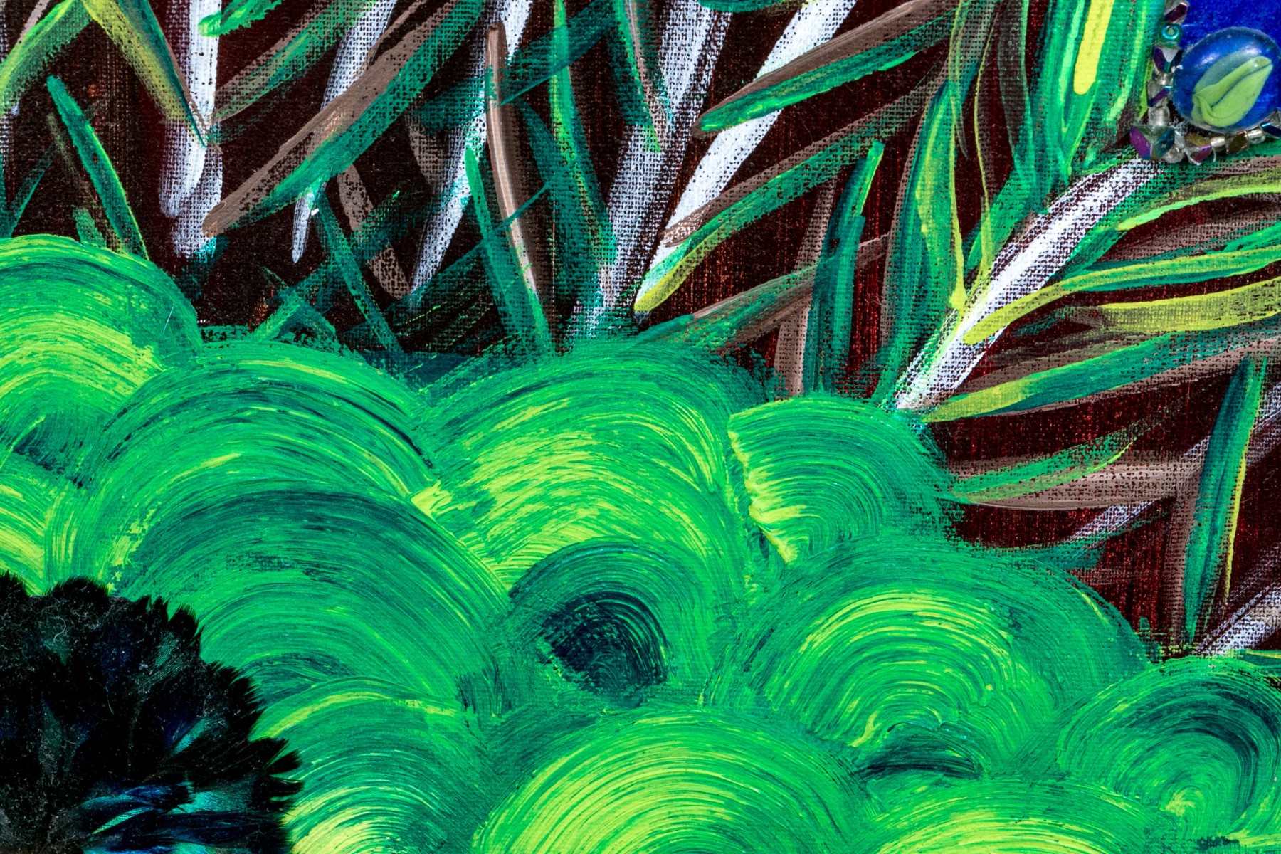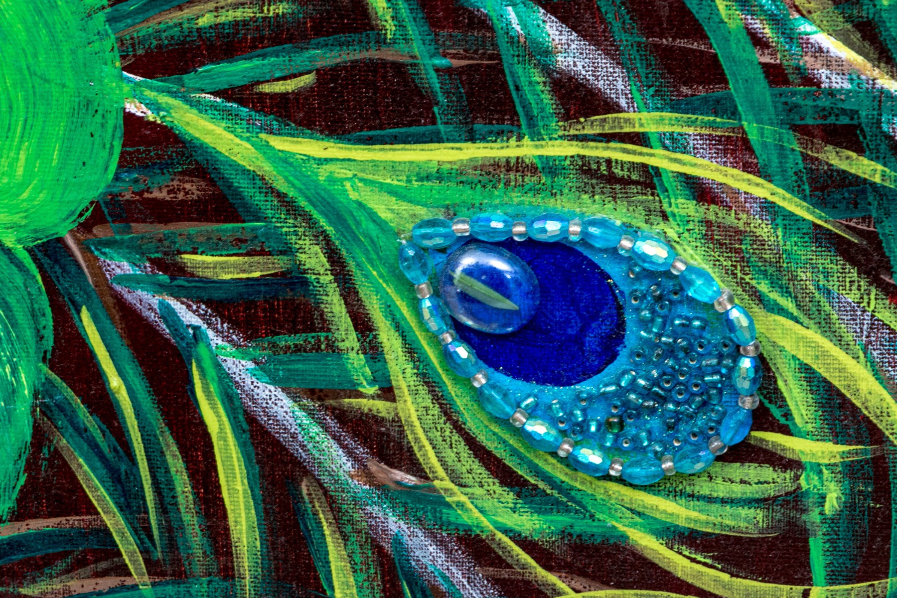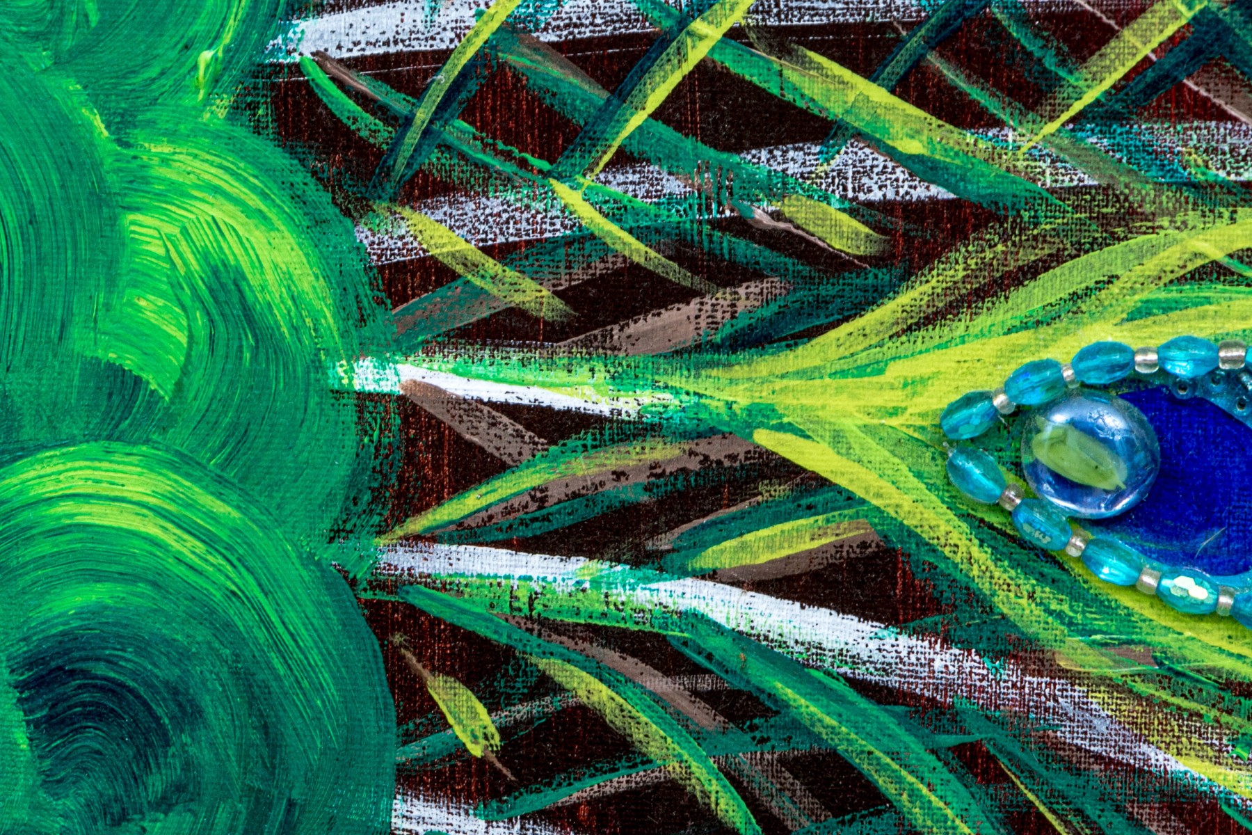 Mixed media on canvas including paint, together with applied beads and feathers amongst other media.