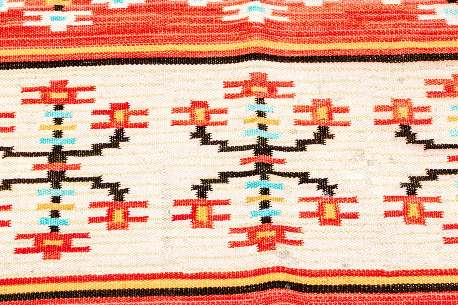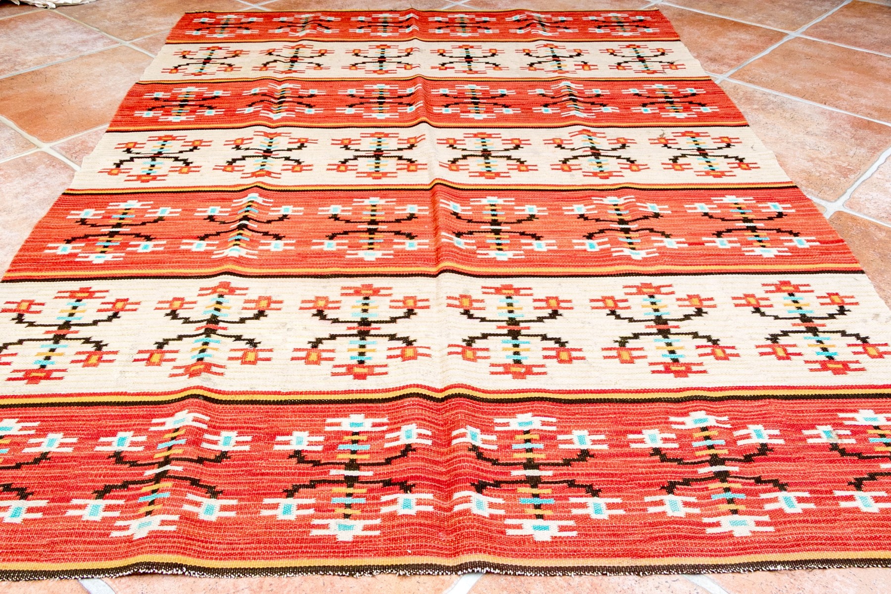 A striking flatweave wool area rug showcasing alternating red and gray-white stripes with branching floral motifs in white, blue, orange, and red.