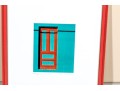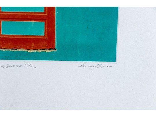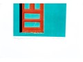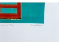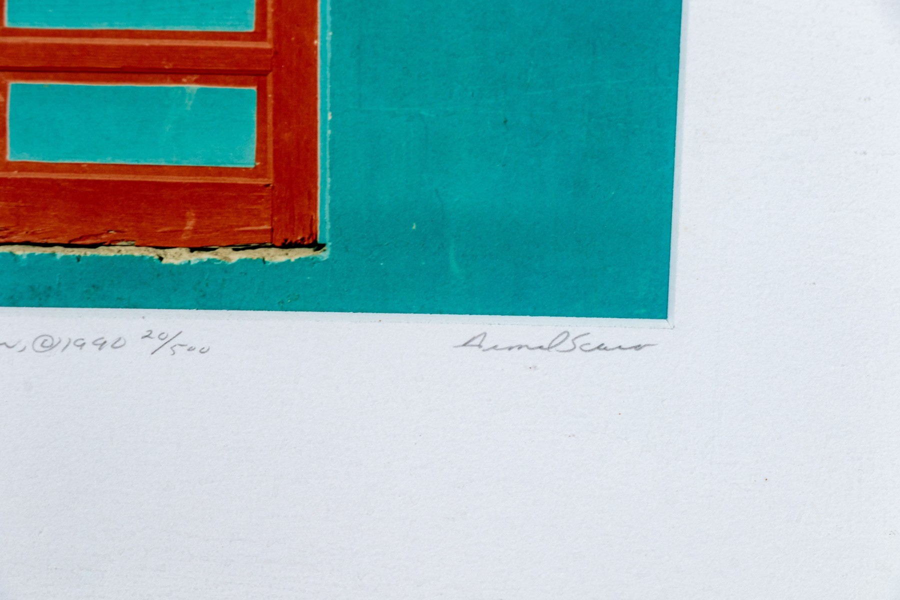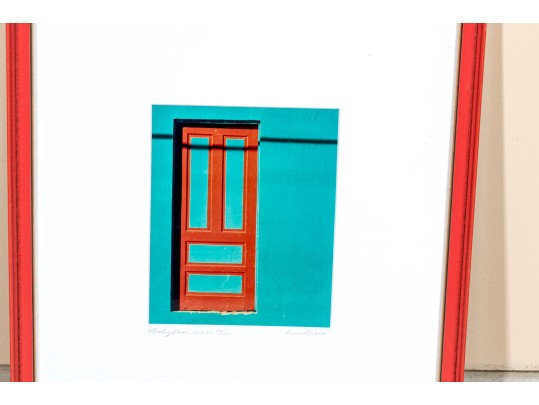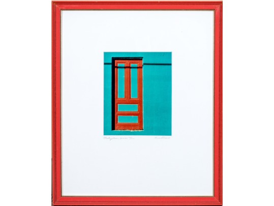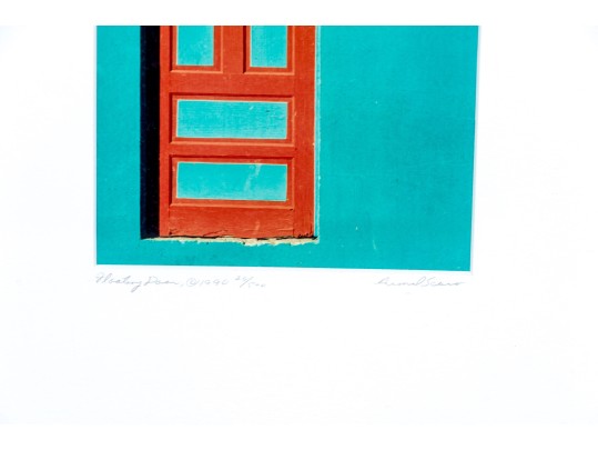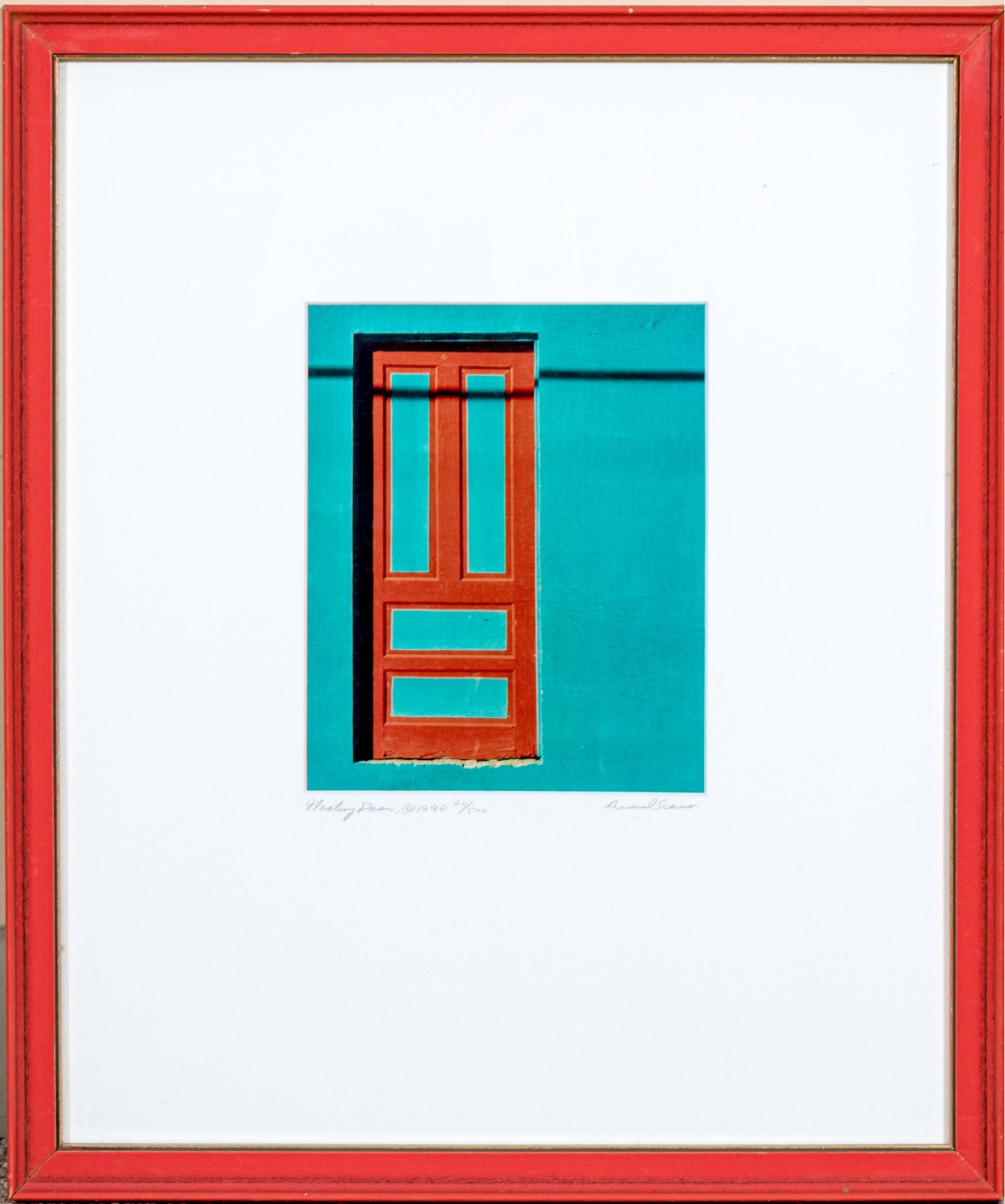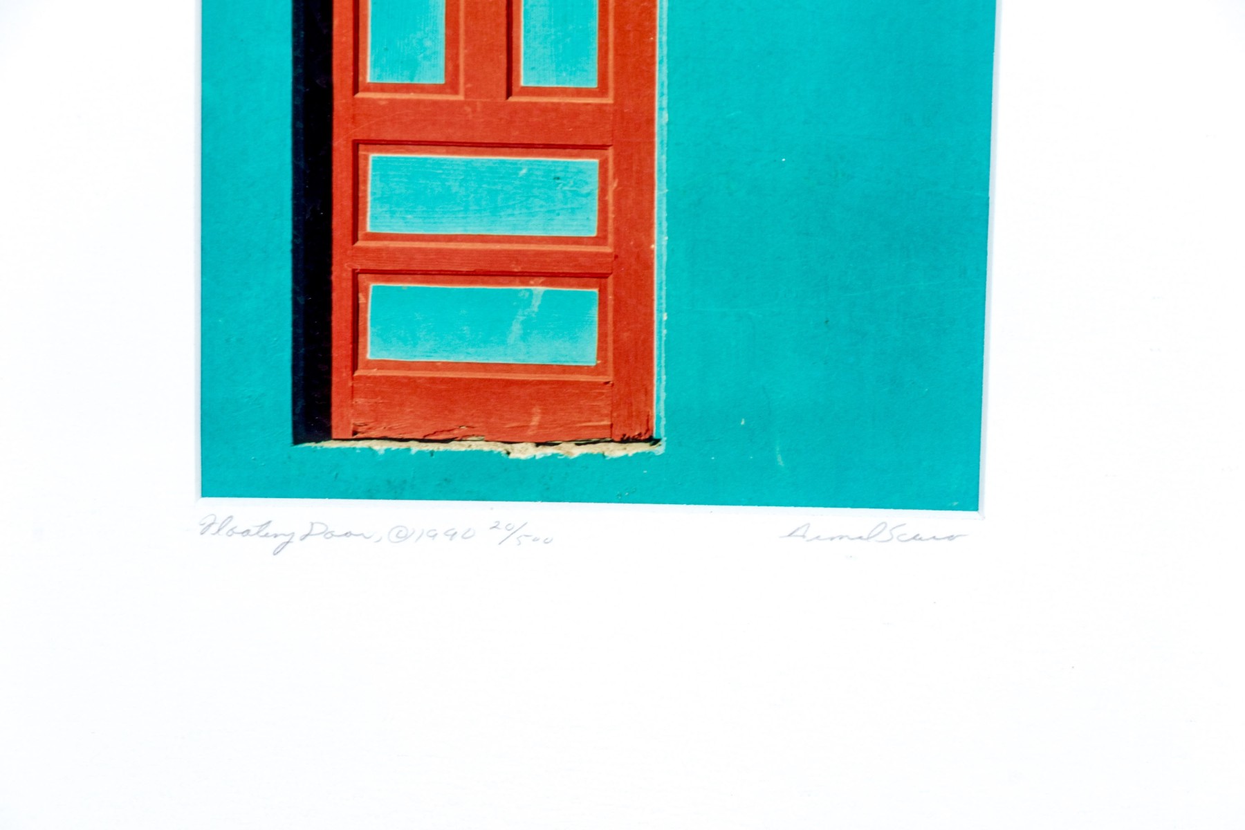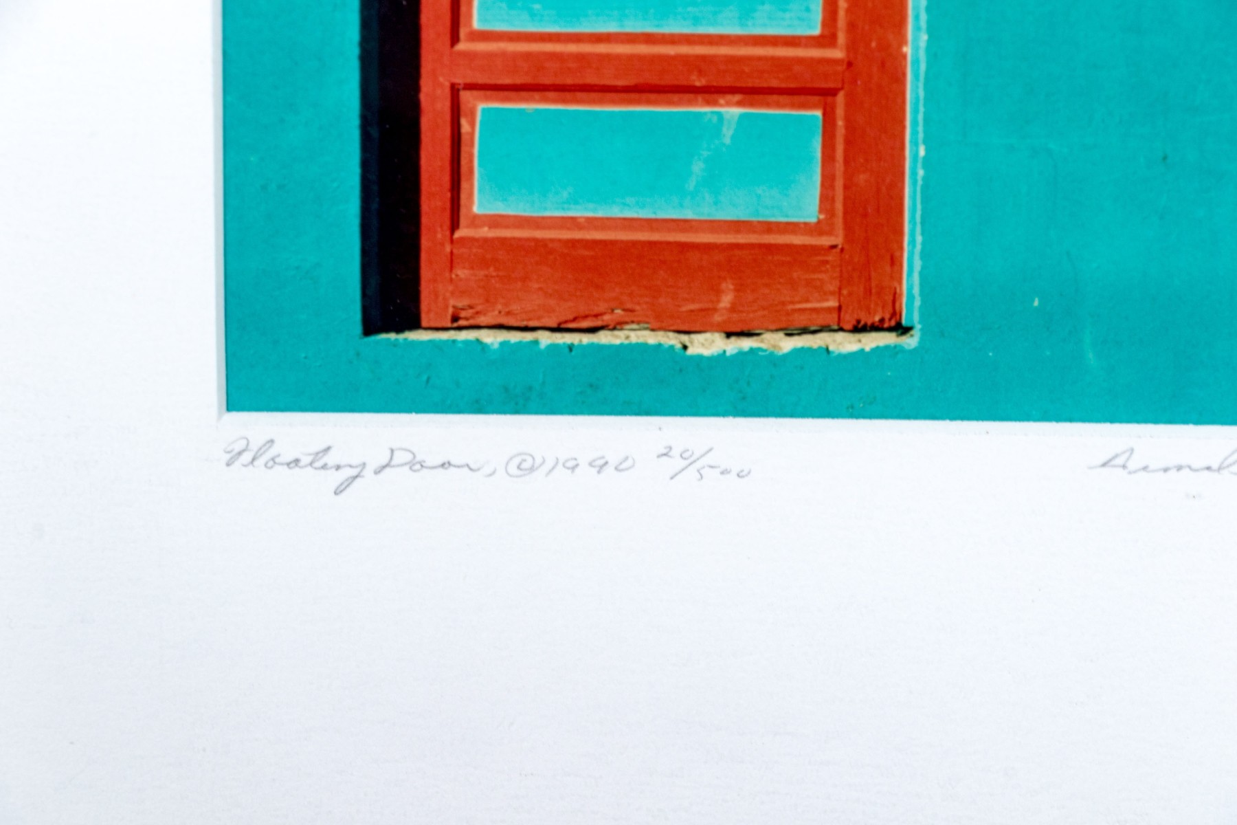 A striking print entitled "Floating Door" depicting a red door with teal paneling against a teal background, overlaid by the distorted shadow of a line across the top. Pencil signed lower right, titled and numbered 20/50 lower left.