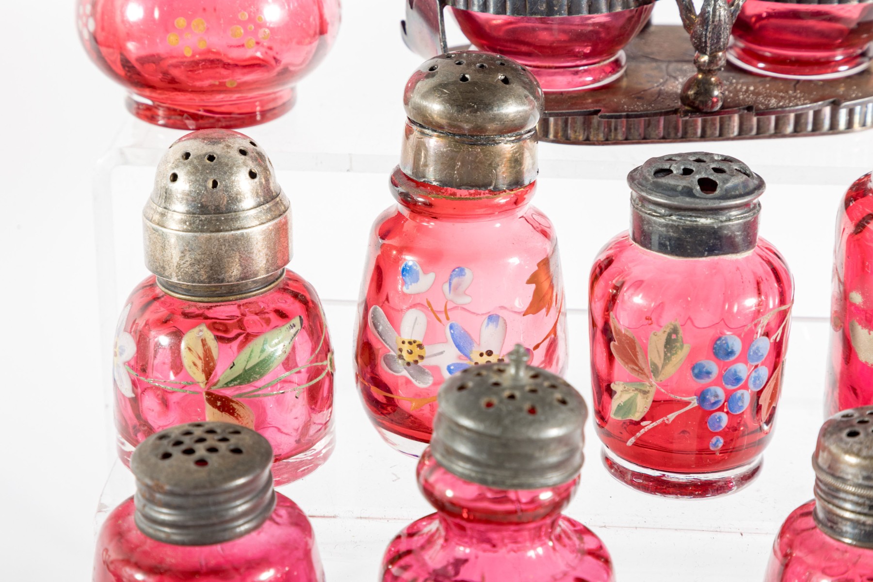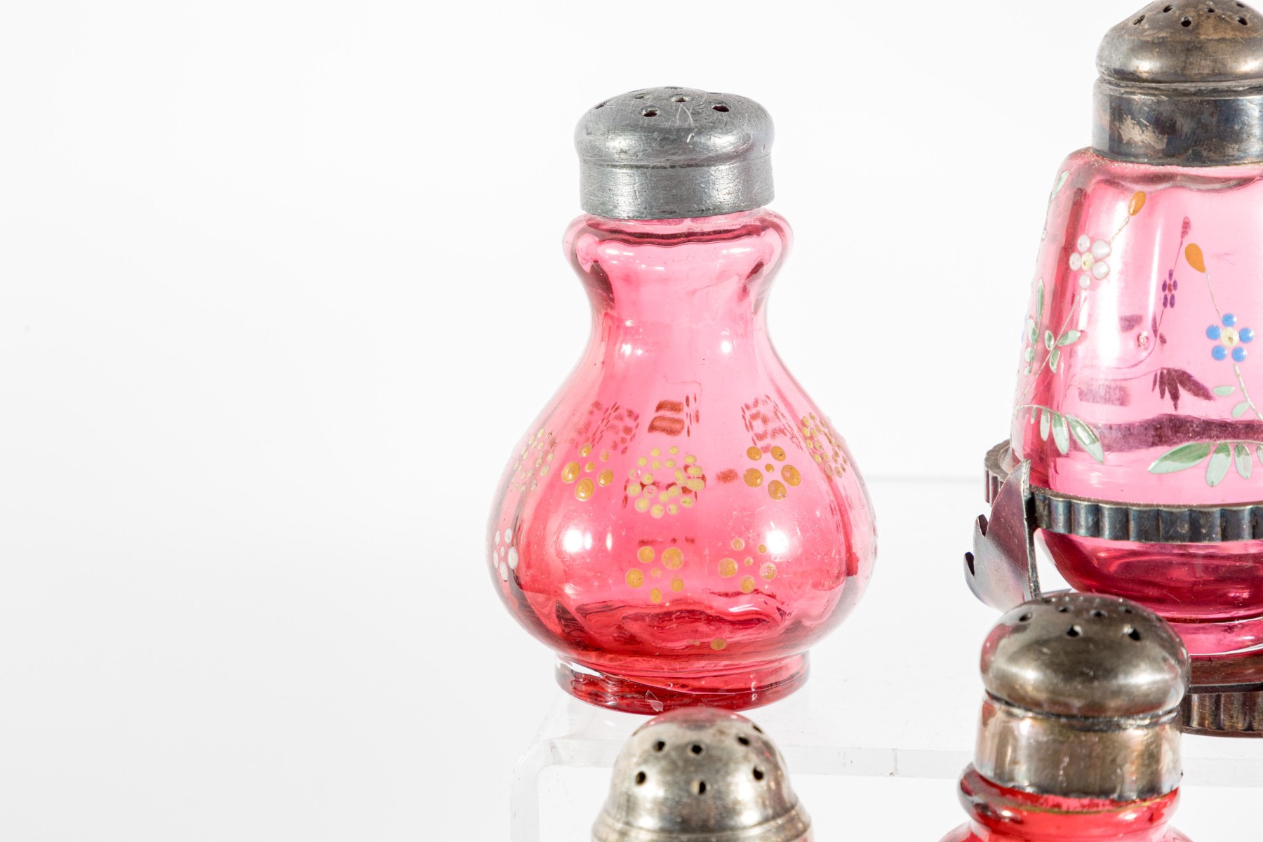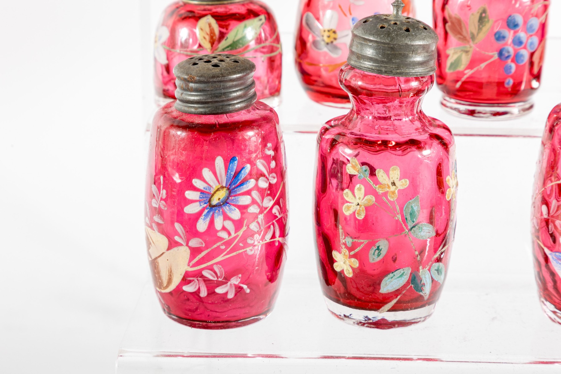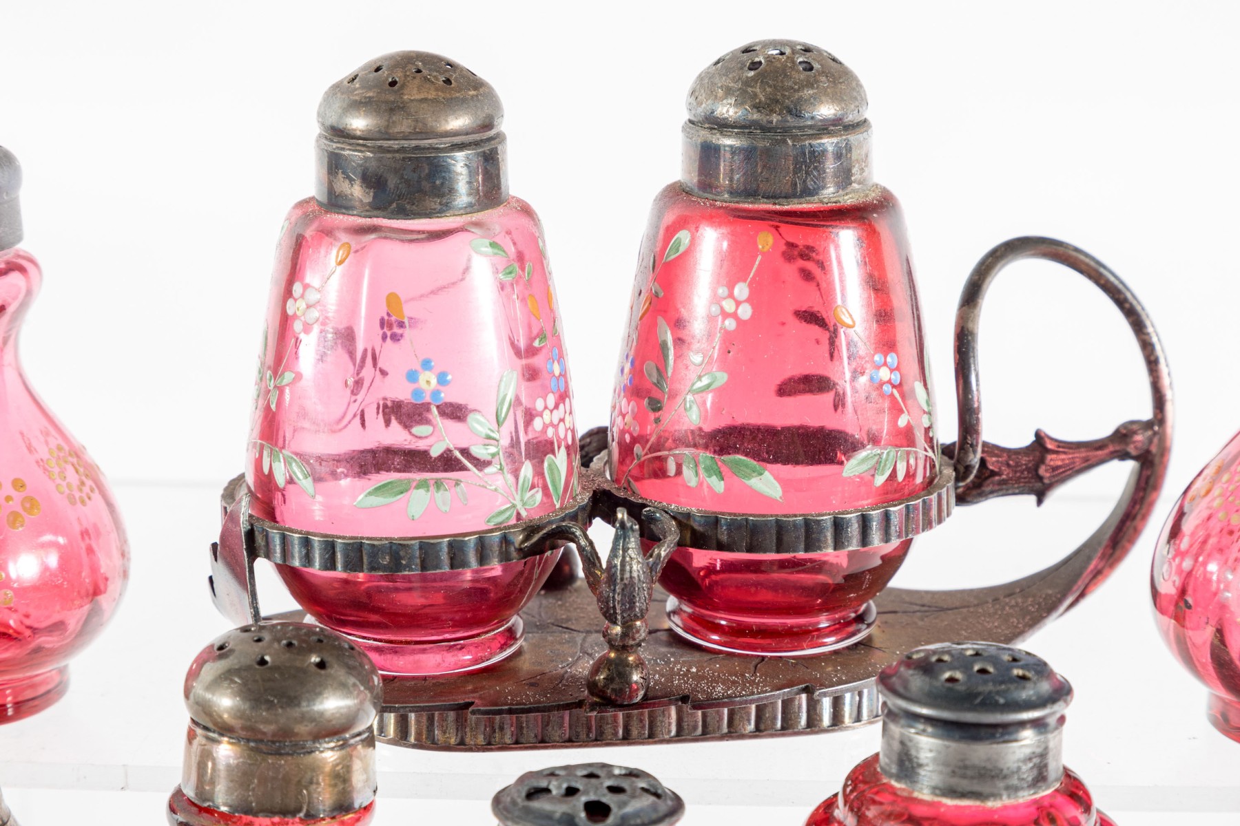 A collection of vintage cranberry depression glass salt and pepper shakers hand-decorated with floral designs. Includes five pairs and three singles. One pair features a leaf-shaped silver plated cruet stand.
