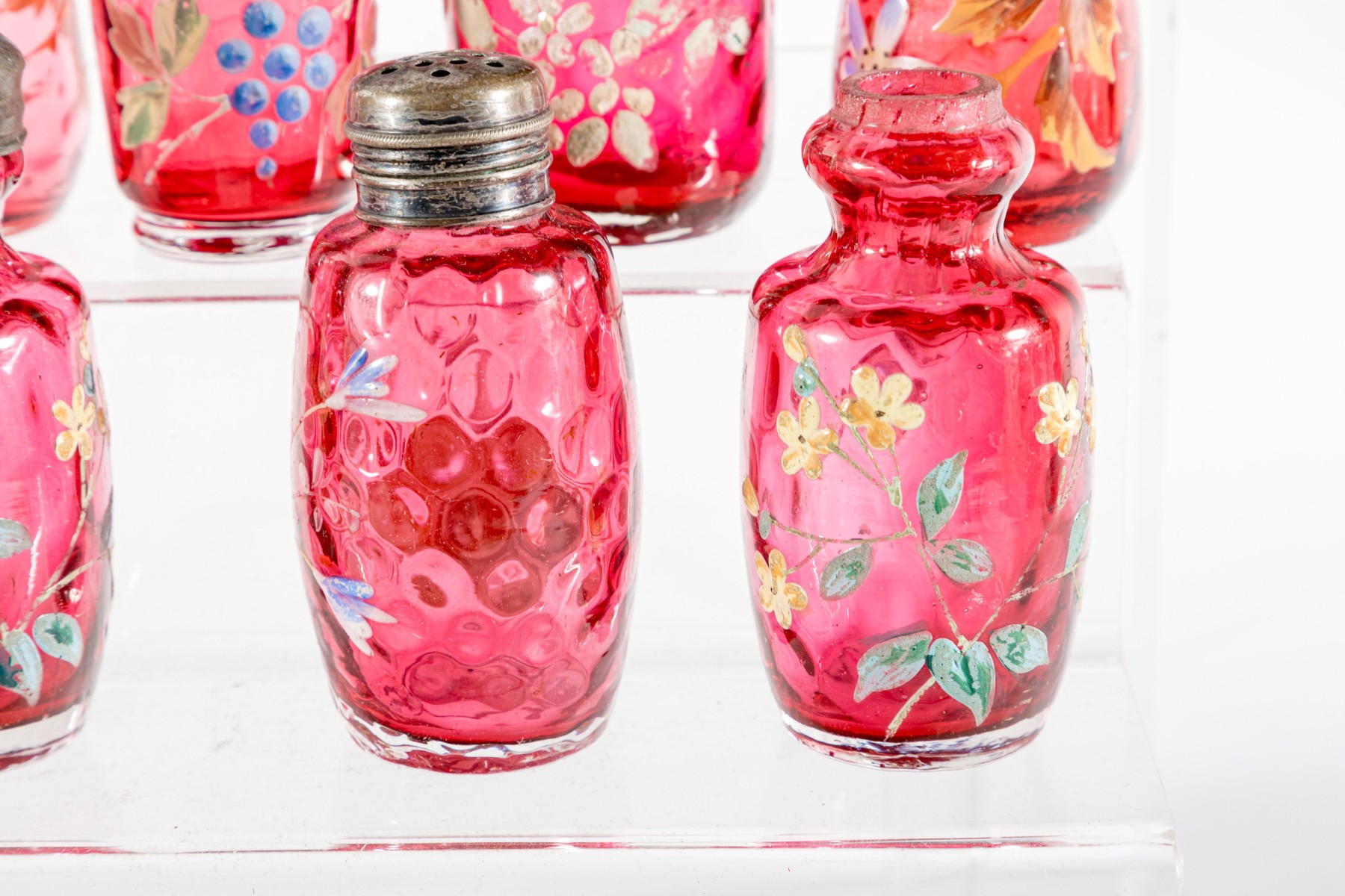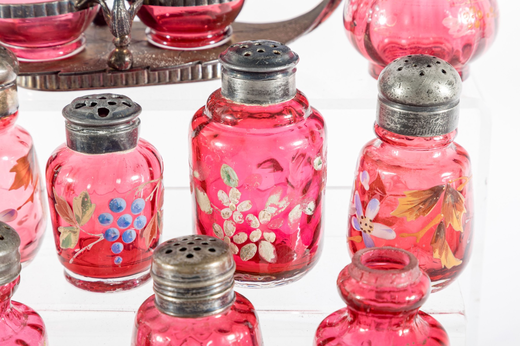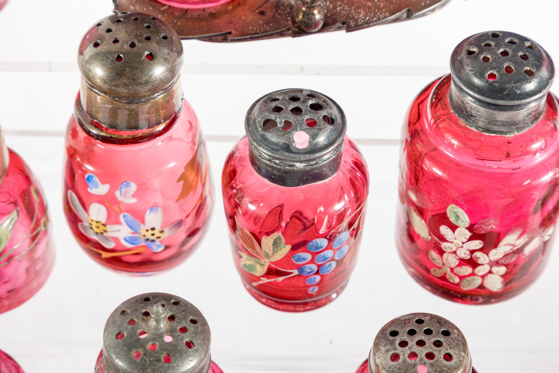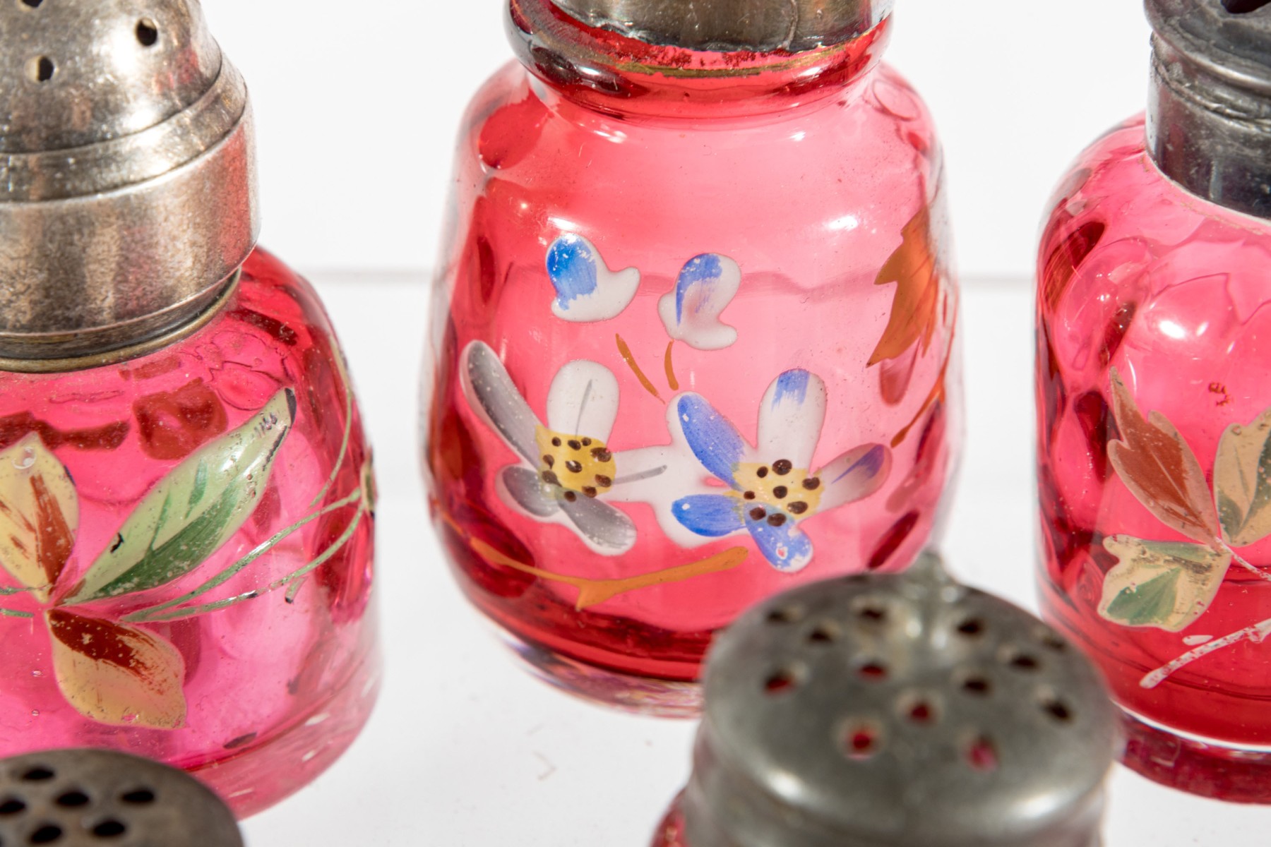 A collection of vintage cranberry depression glass salt and pepper shakers hand-decorated with floral designs. Includes five pairs and three singles. One pair features a leaf-shaped silver plated cruet stand.