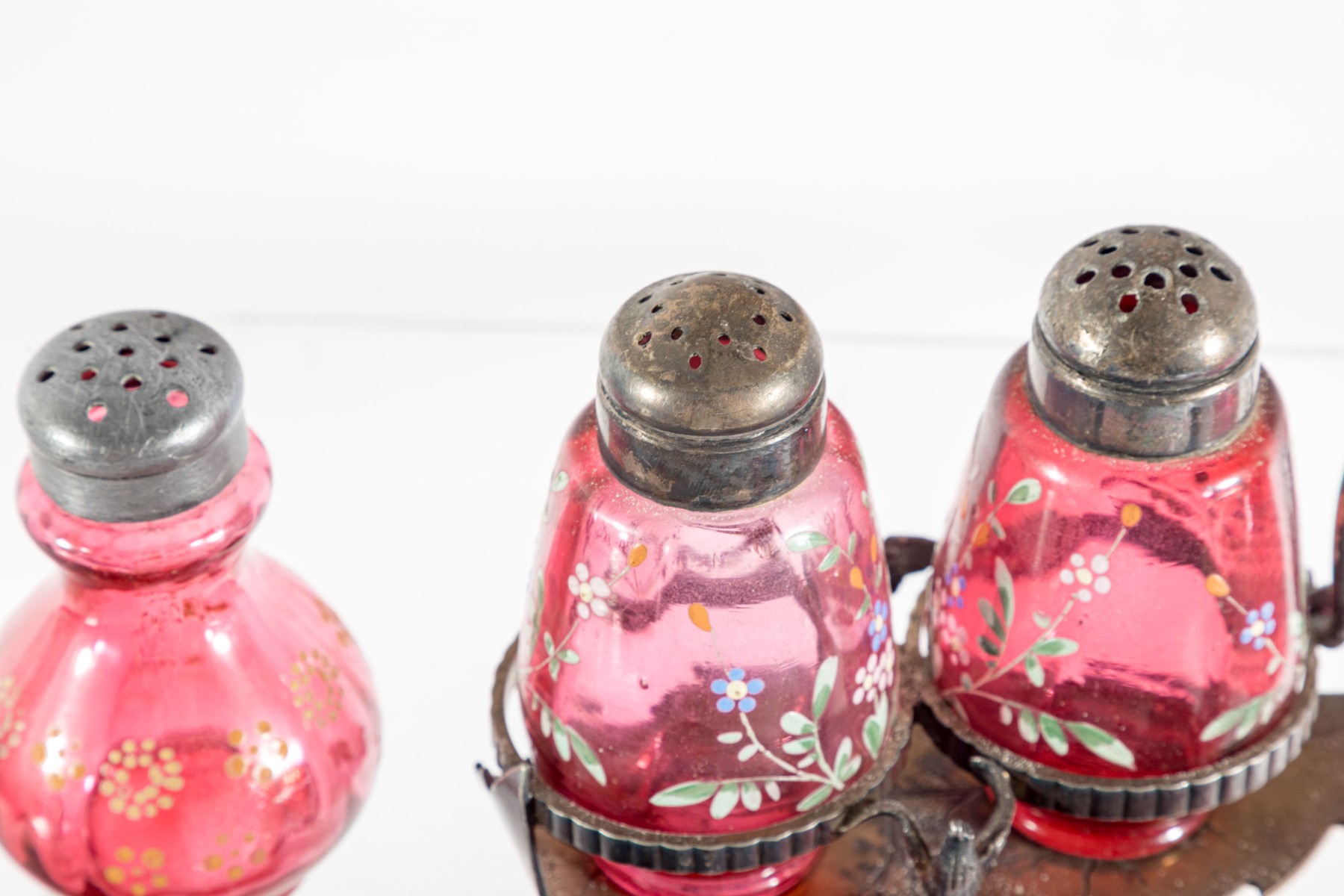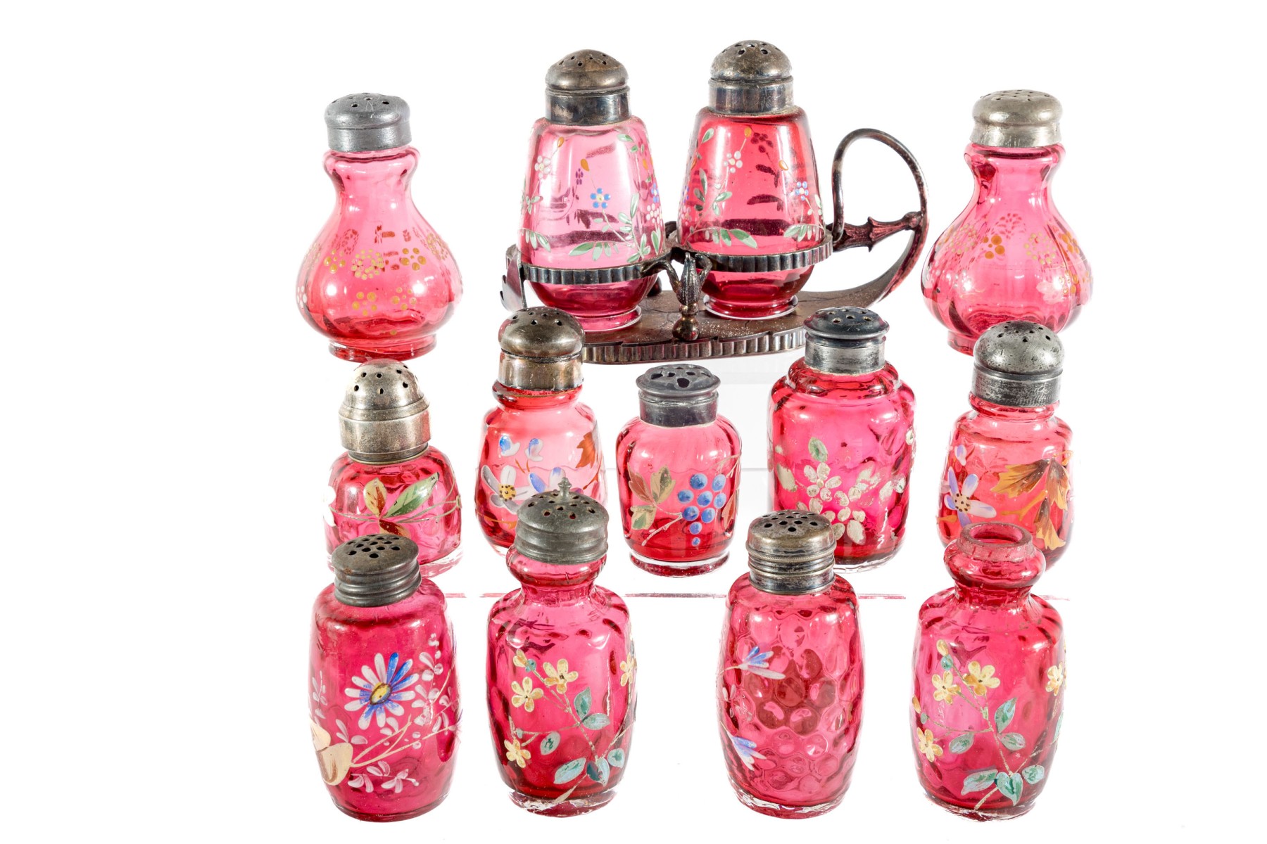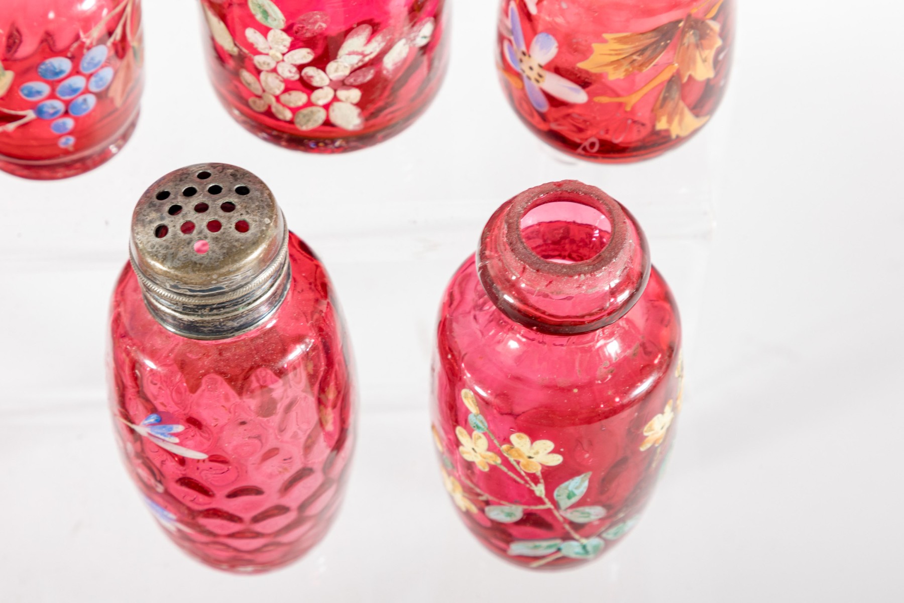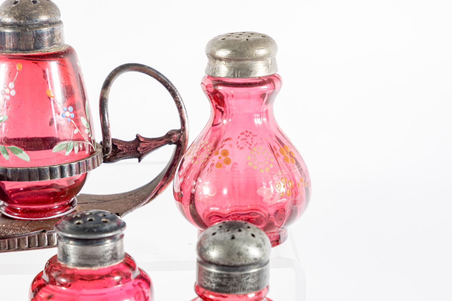 A collection of vintage cranberry depression glass salt and pepper shakers hand-decorated with floral designs. Includes five pairs and three singles. One pair features a leaf-shaped silver plated cruet stand.