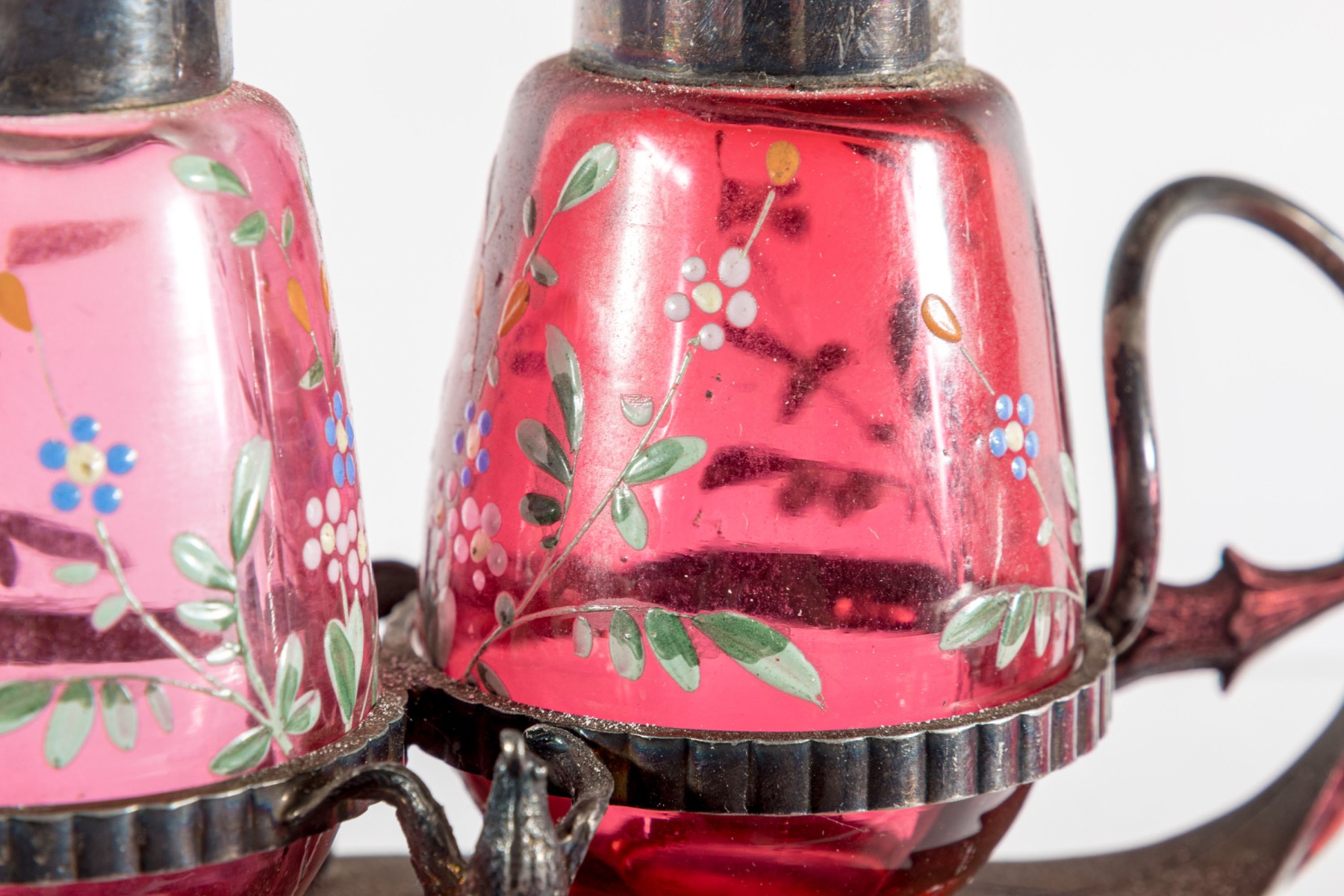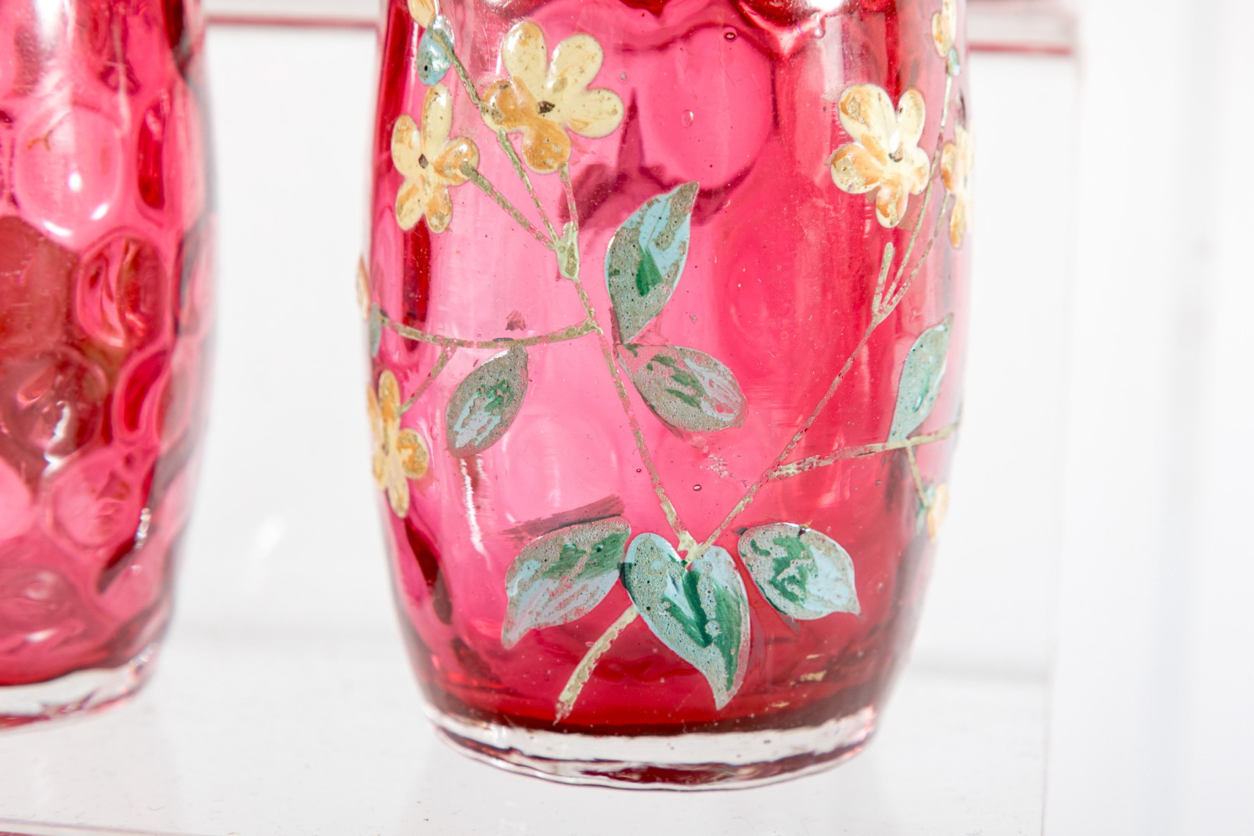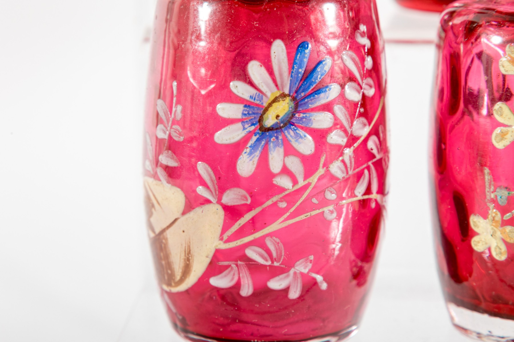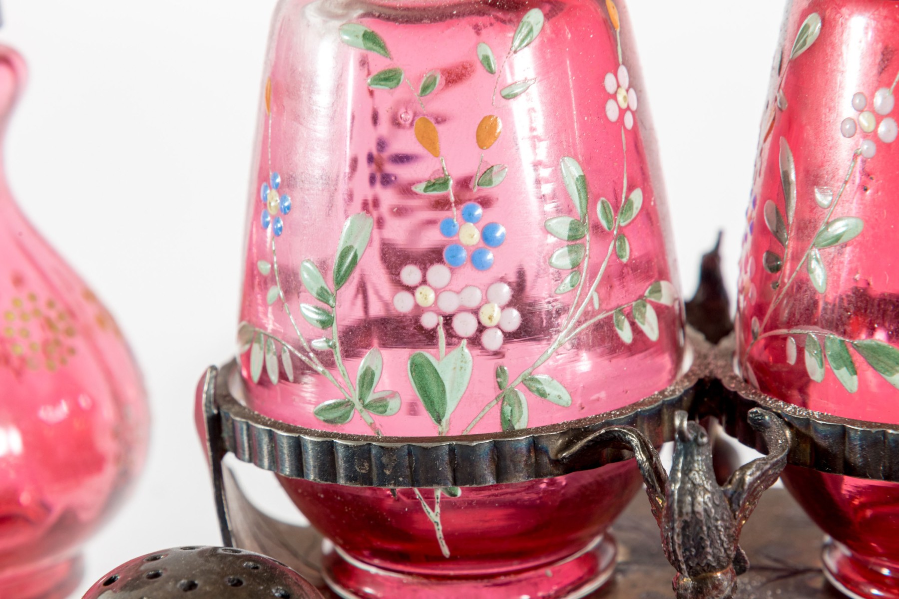 A collection of vintage cranberry depression glass salt and pepper shakers hand-decorated with floral designs. Includes five pairs and three singles. One pair features a leaf-shaped silver plated cruet stand.