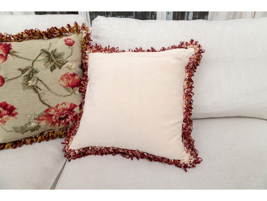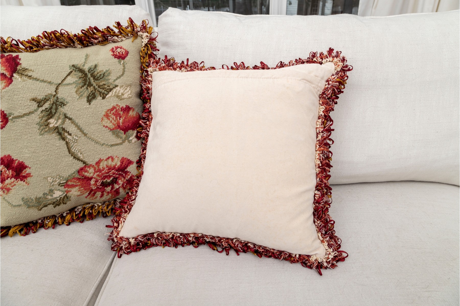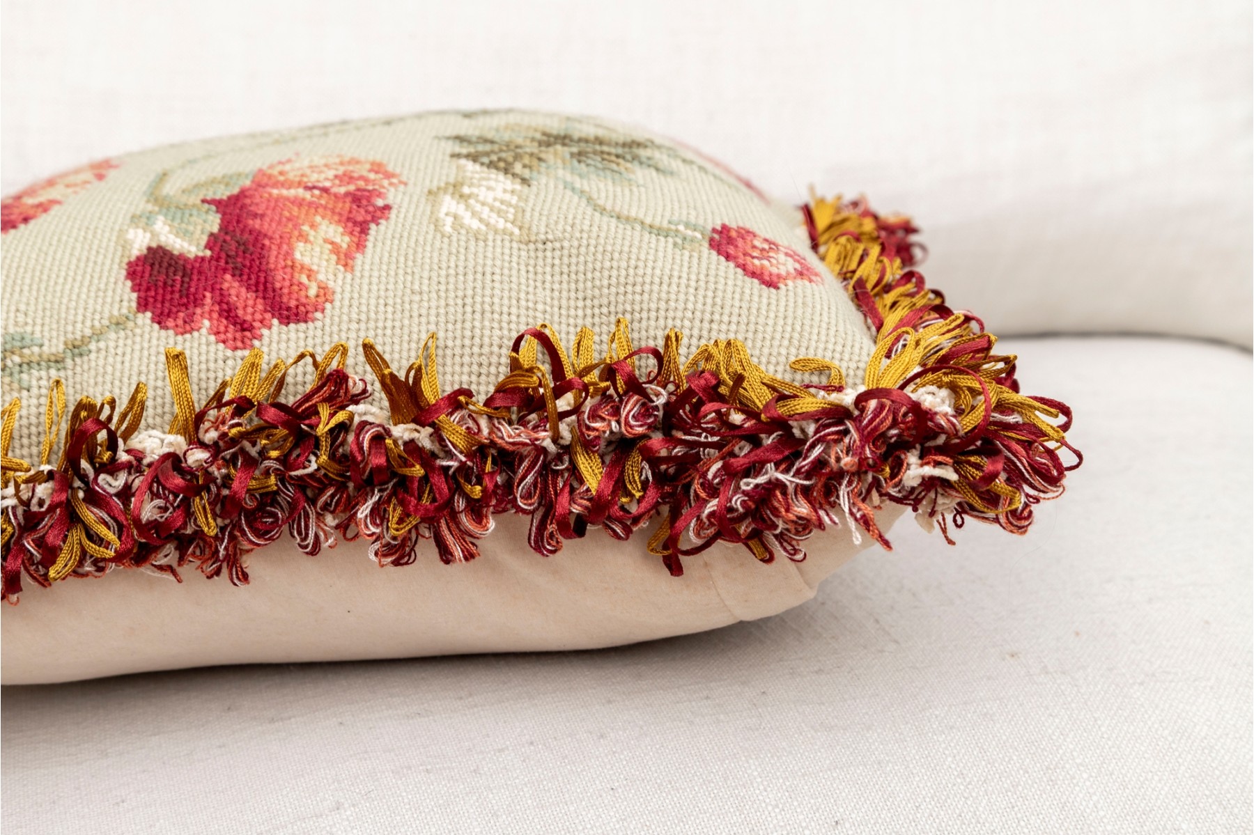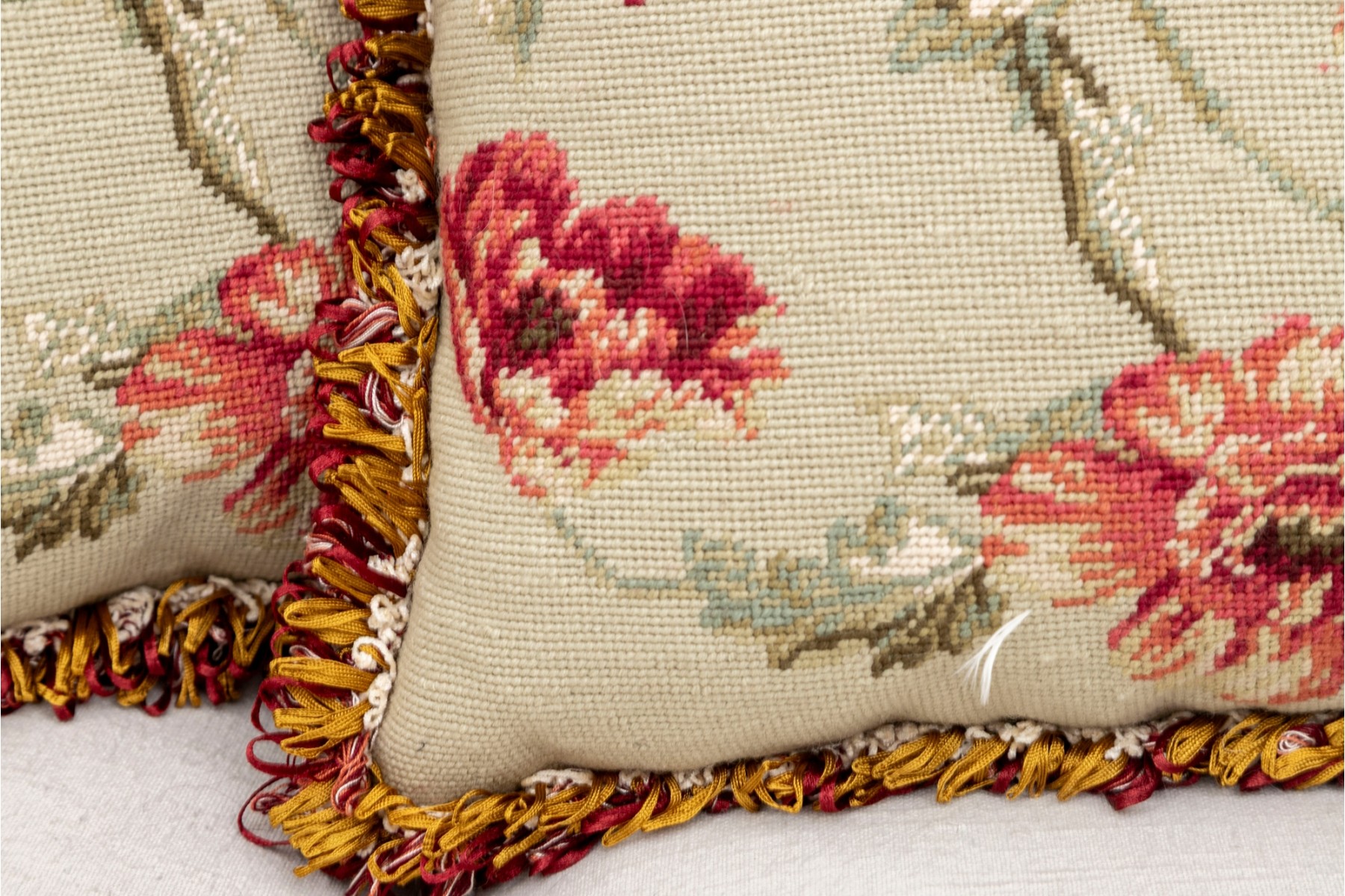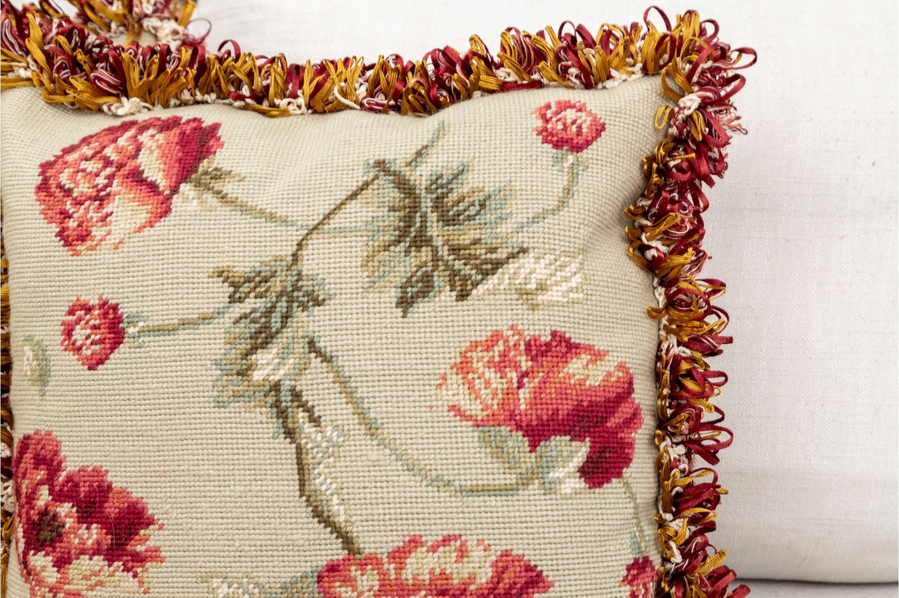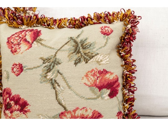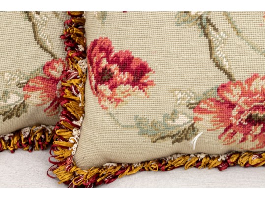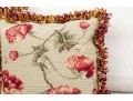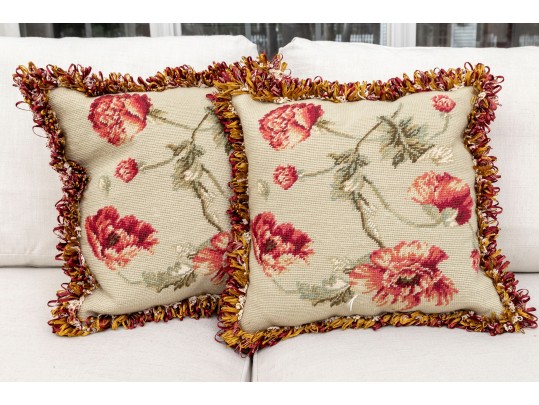 A pair of fine needlepoint throw pillows with fringe, adorned with fabulous floral motifs.