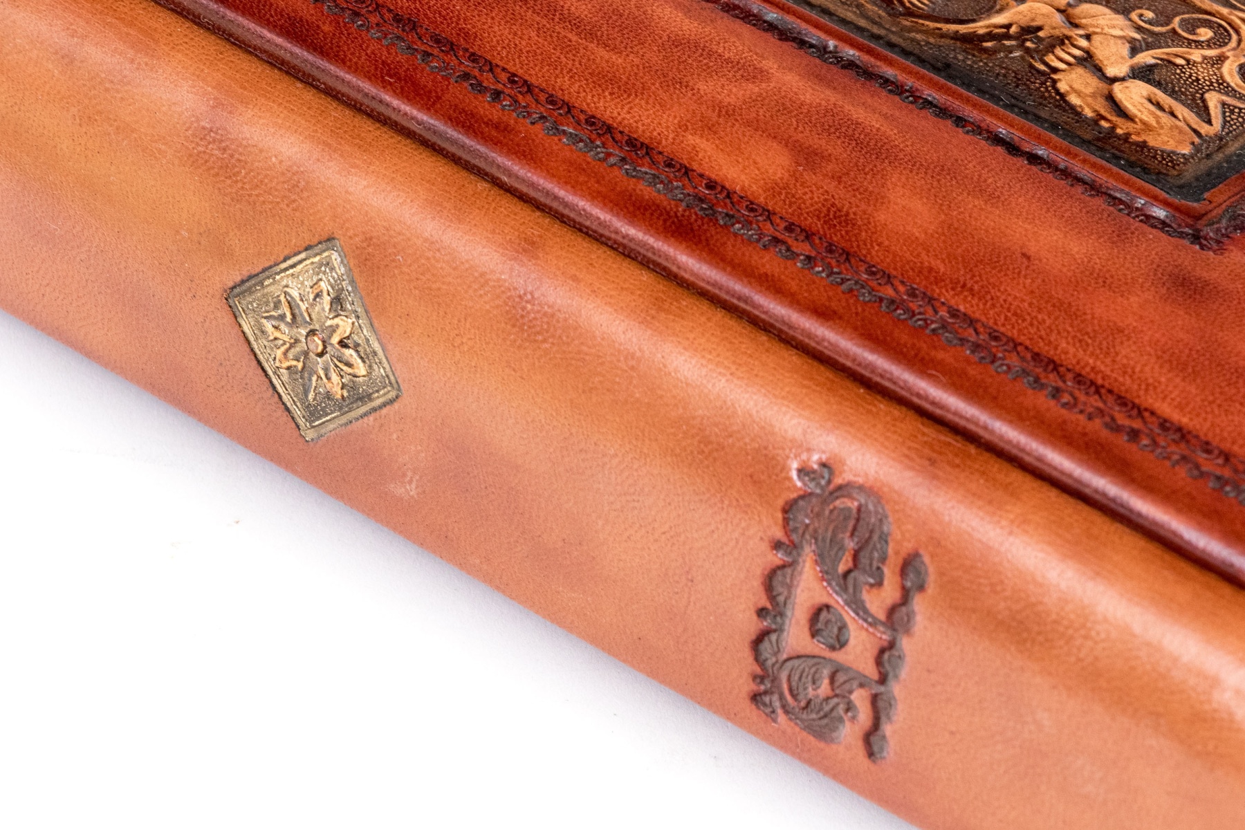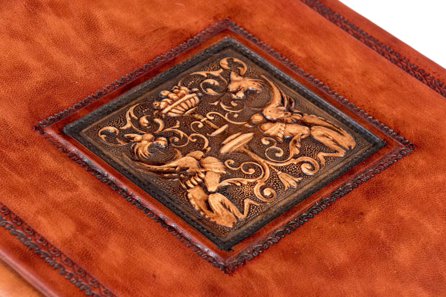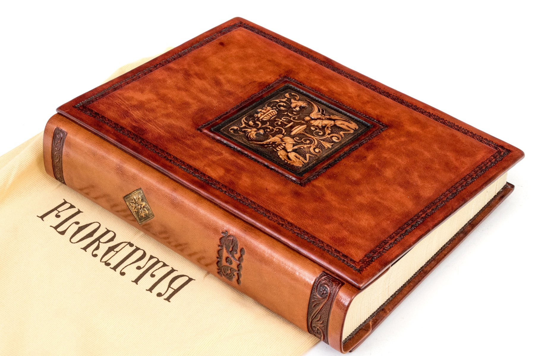 A gorgeous Florentia picture album featuring a warm-toned medium brown leather hardcover tooled with decorative trims and detailed with a square heraldic scene at the center front. Includes a dust bag.