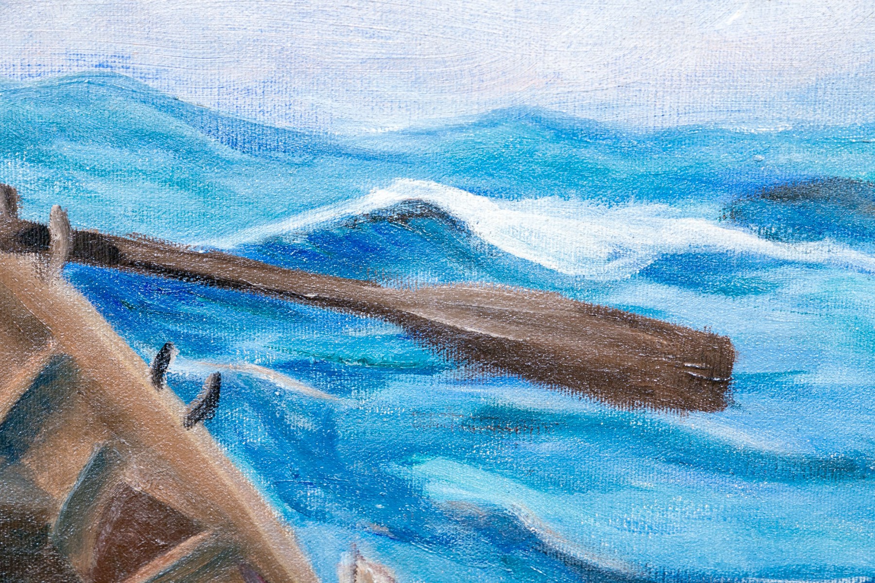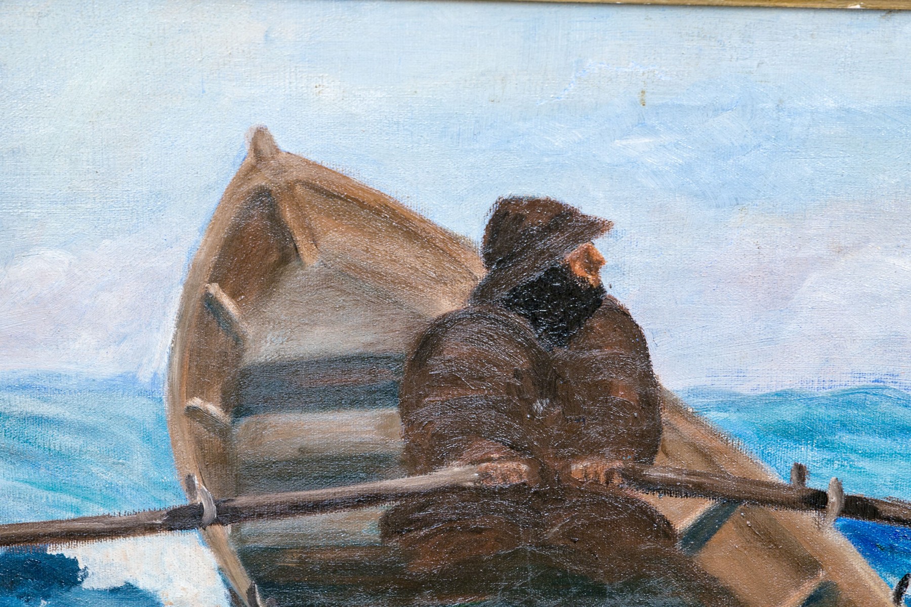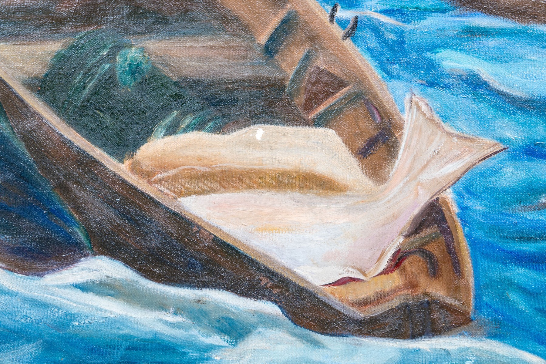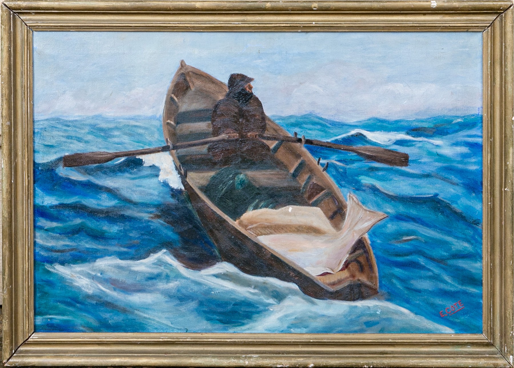 A vibrant oil painting reproduction of Winslow Homer's "Fog Warning". Signed on lower right " E. Cote".