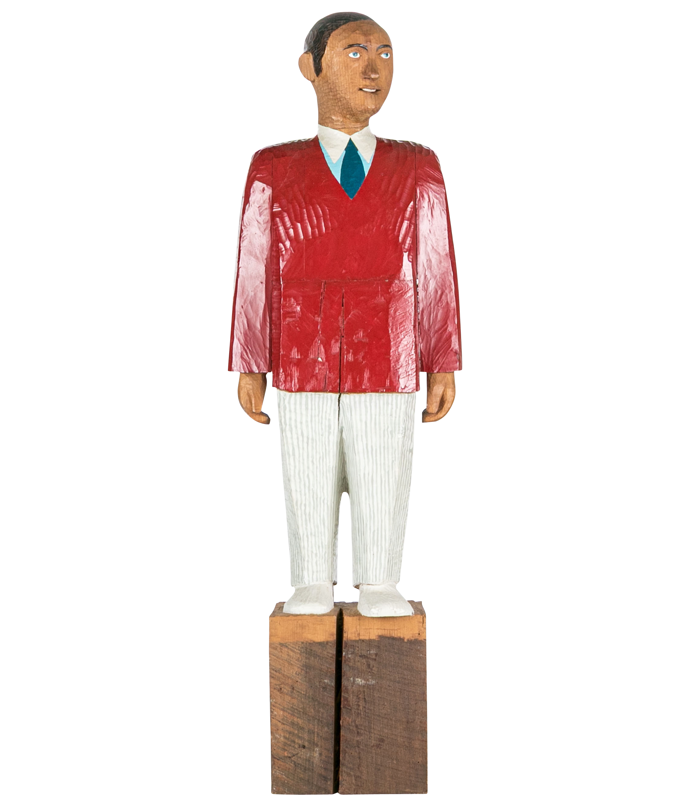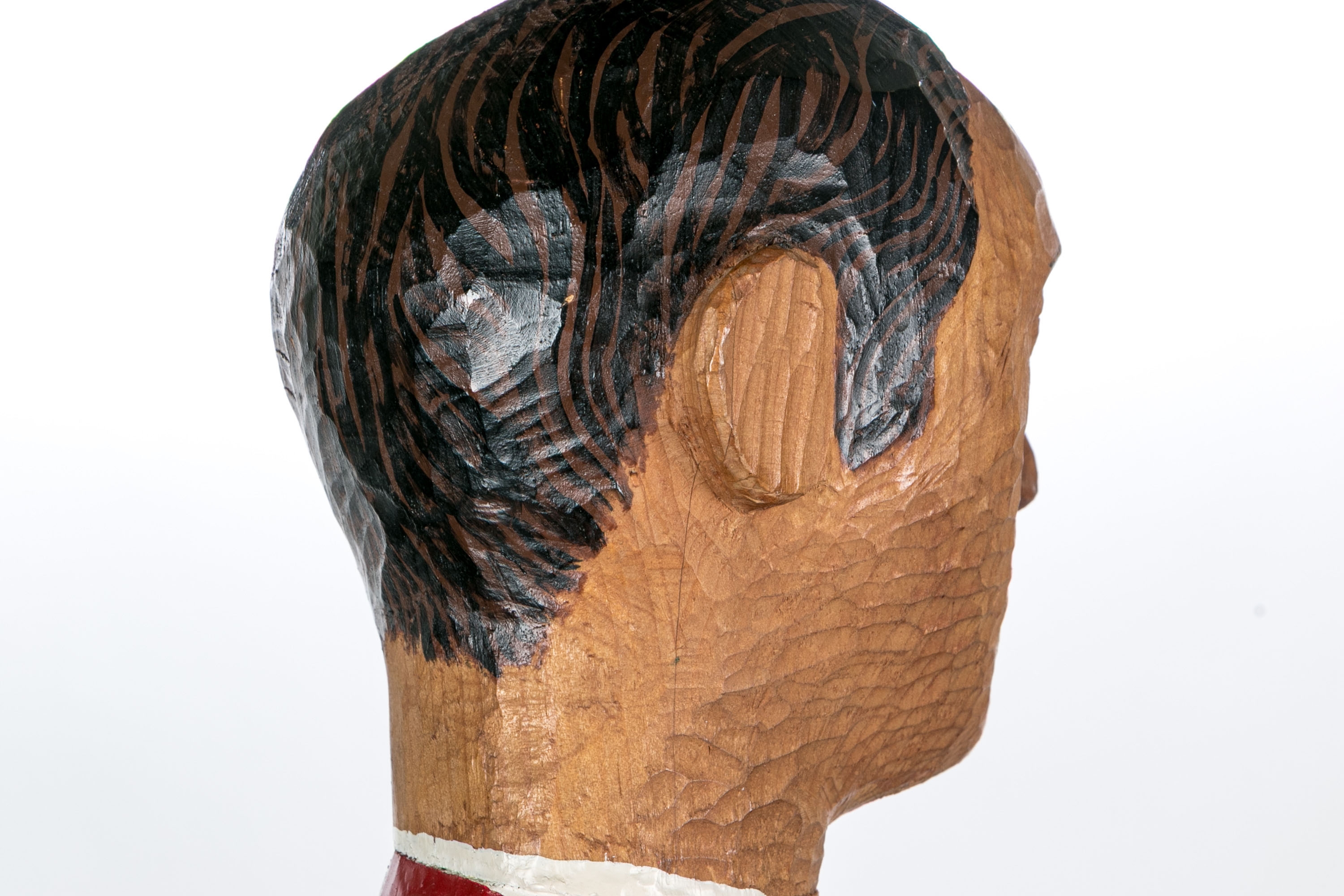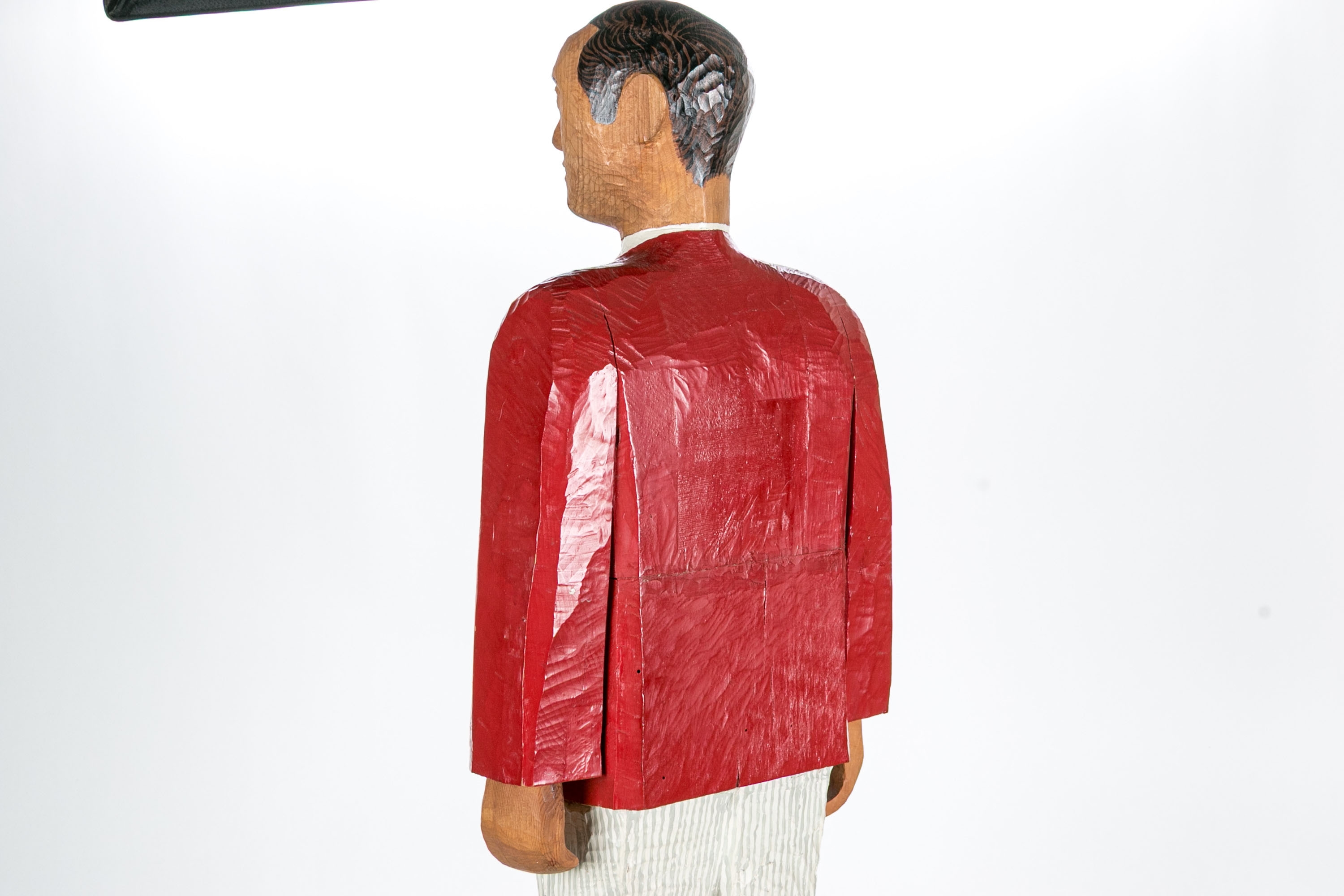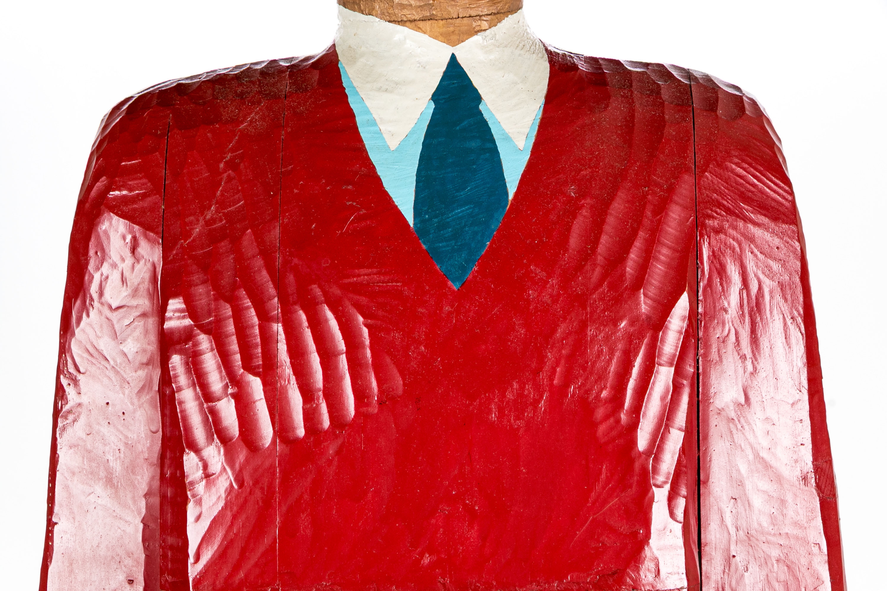 This is a vintage folk art wood carving sculpture of a man. The sculpture is painted and depicts a man in a red jacket, white striped pants, and a blue tie and is surmounted on a pedestal plinth.