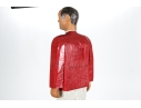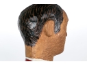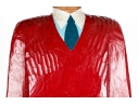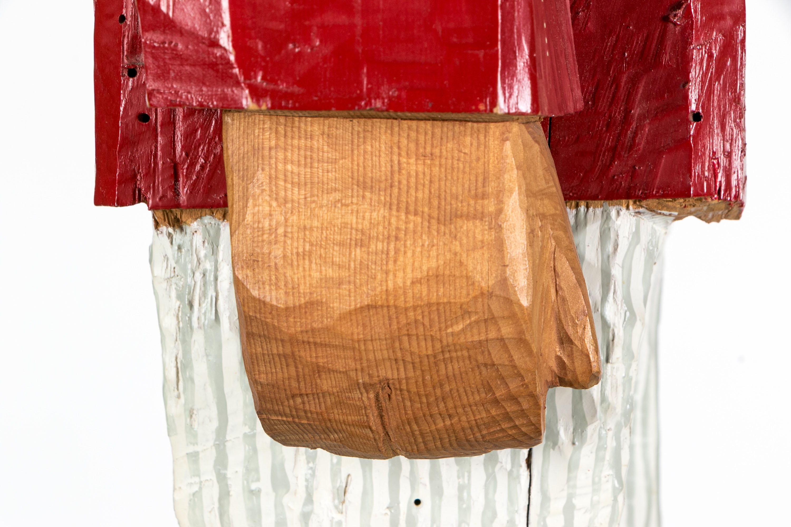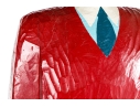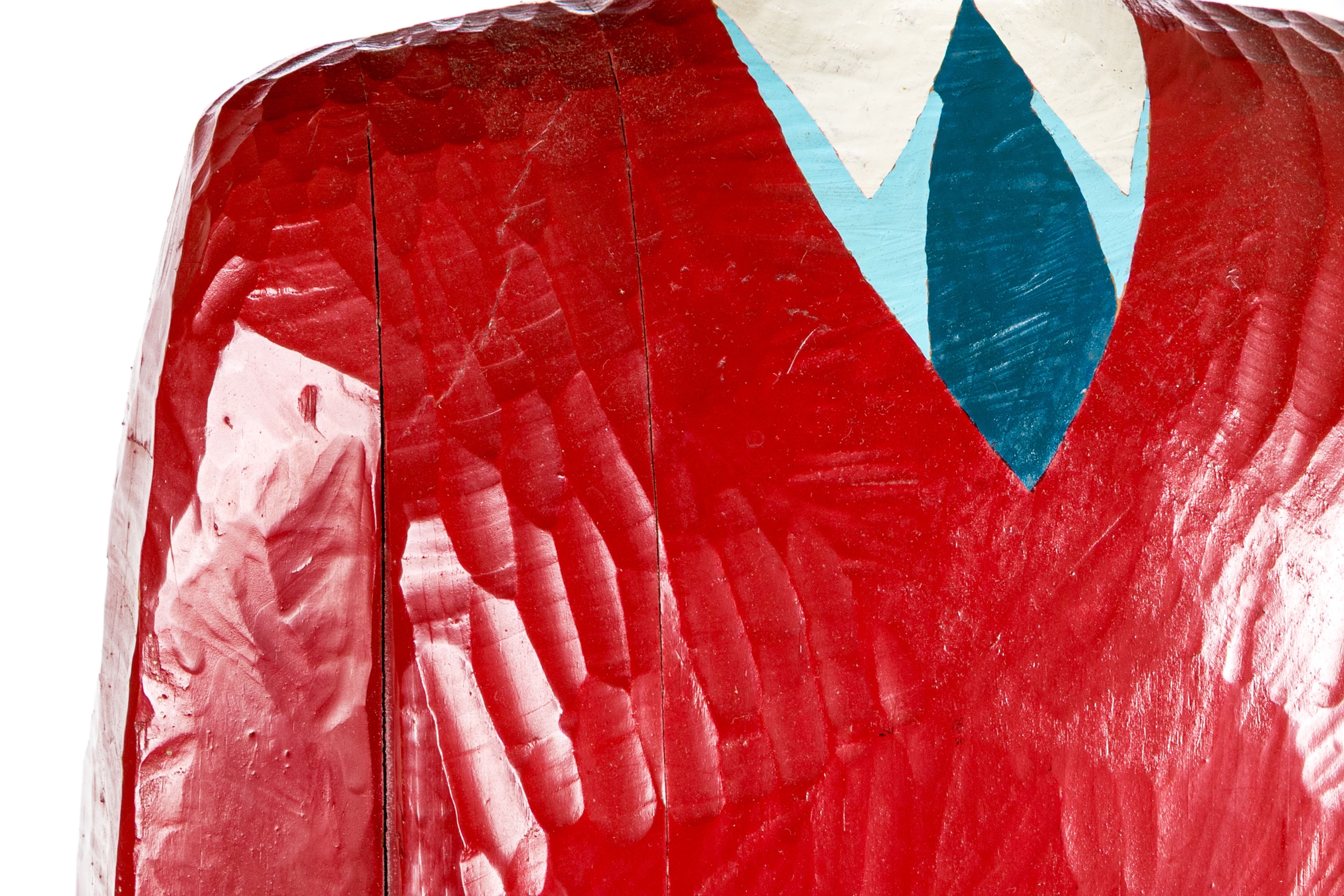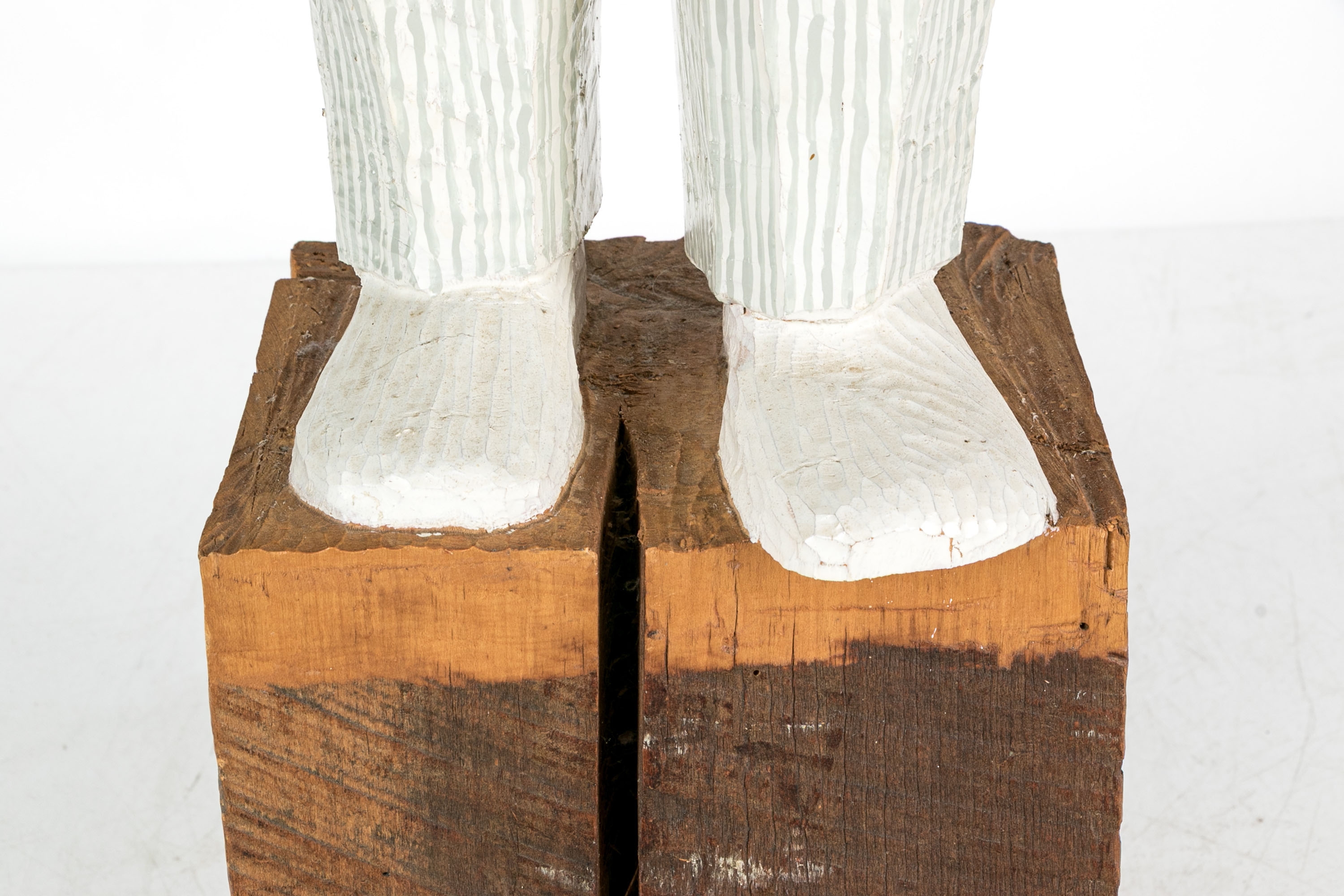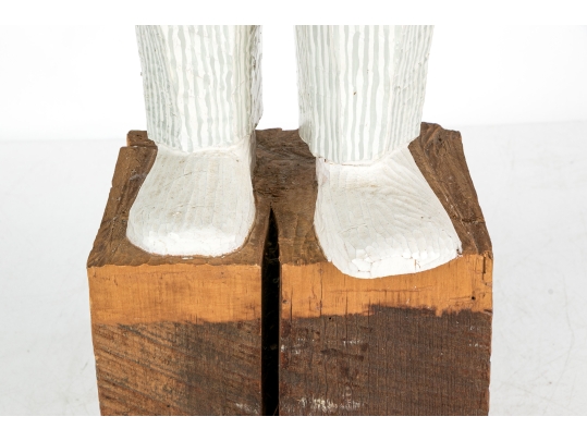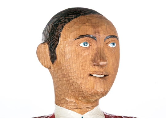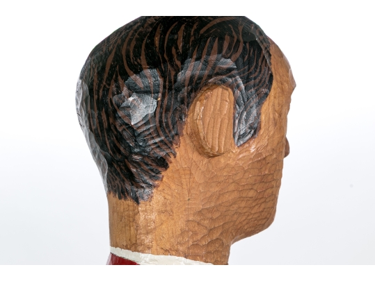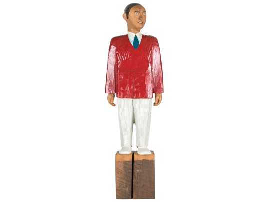 This is a vintage folk art wood carving sculpture of a man. The sculpture is painted and depicts a man in a red jacket, white striped pants, and a blue tie and is surmounted on a pedestal plinth.