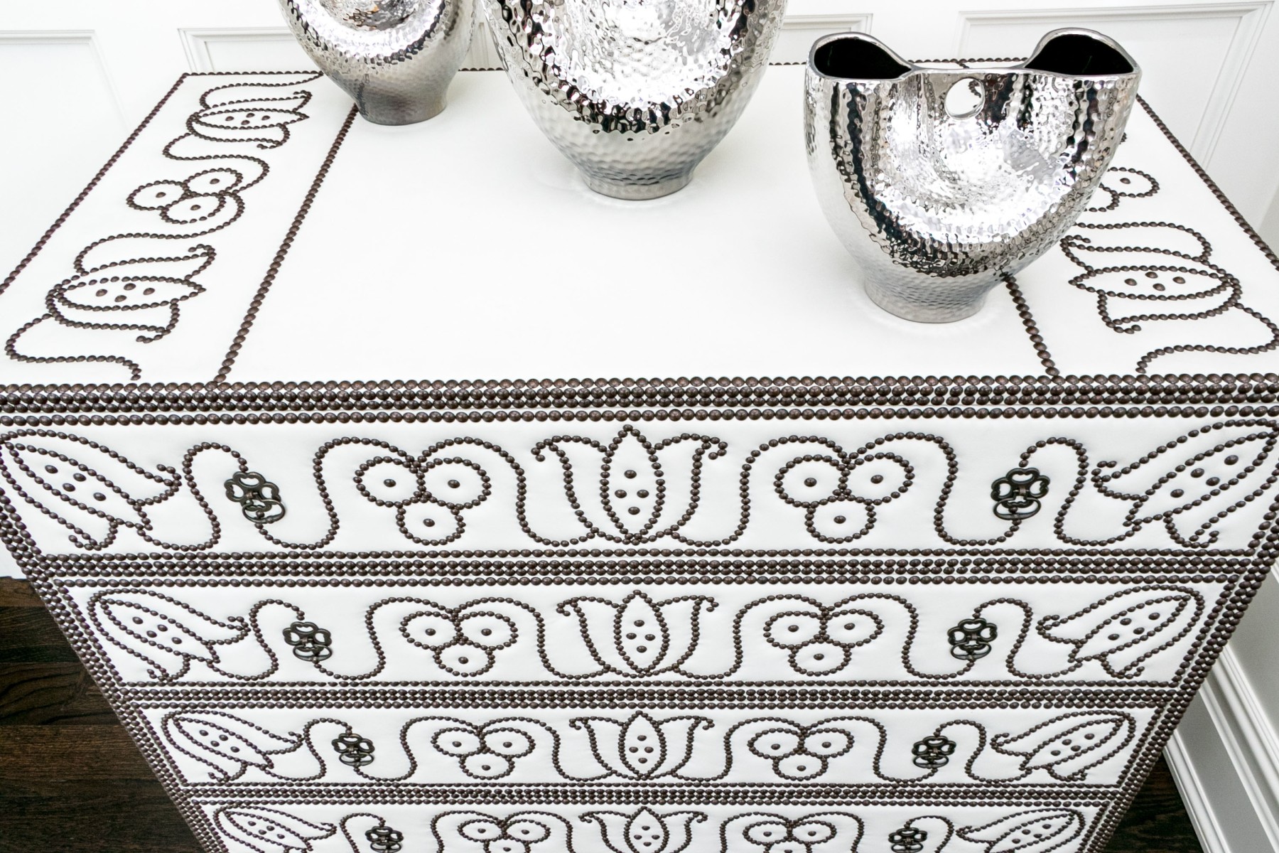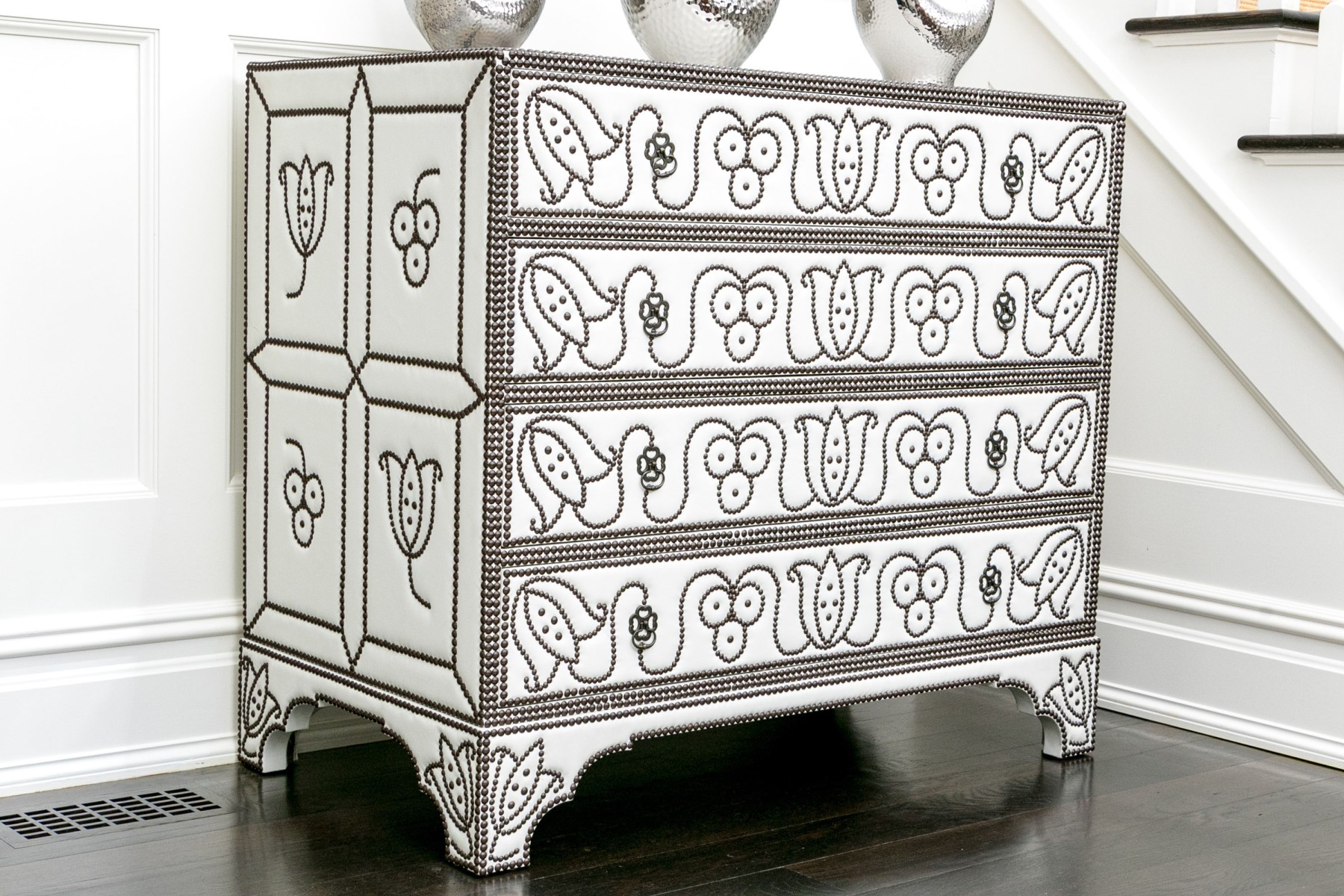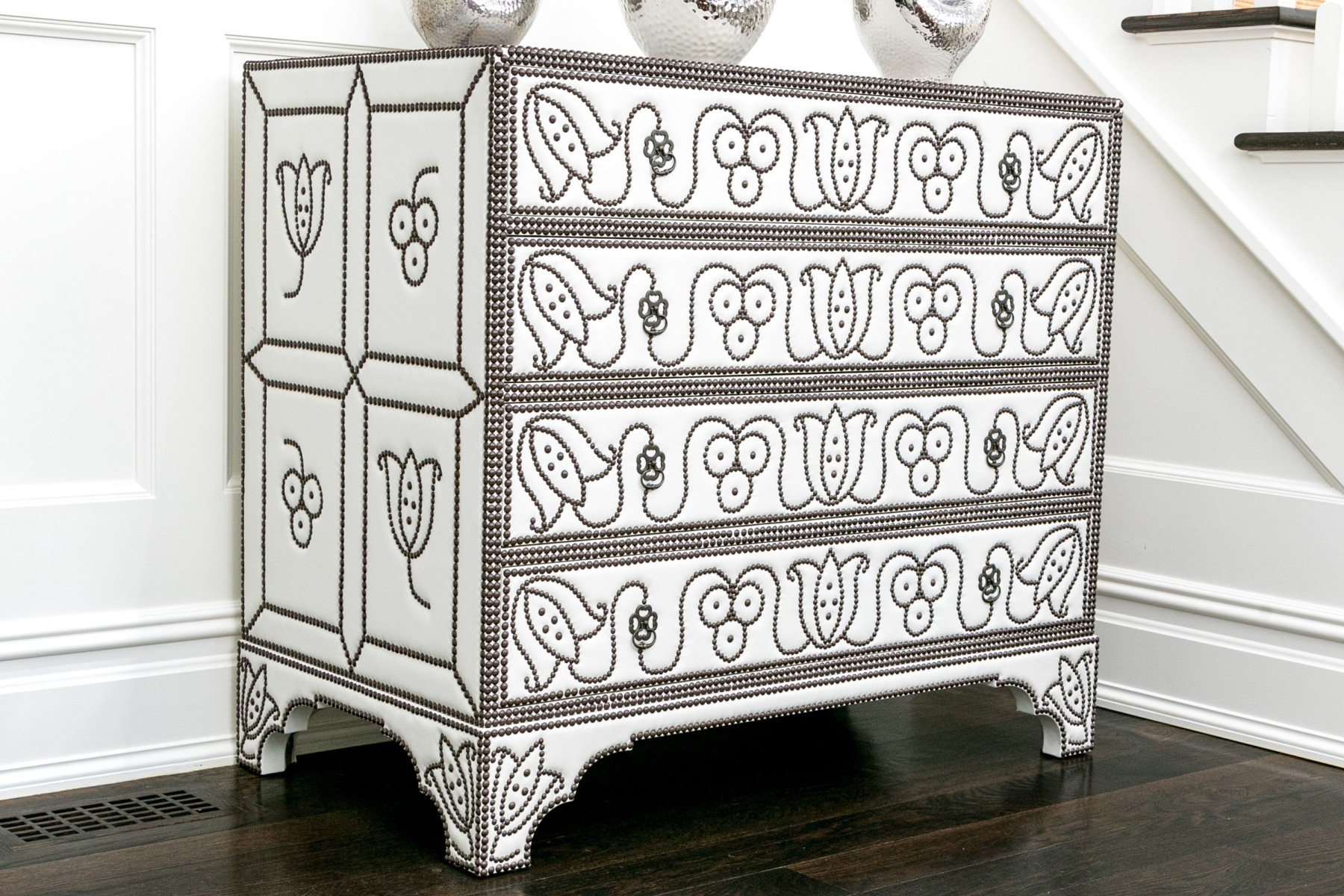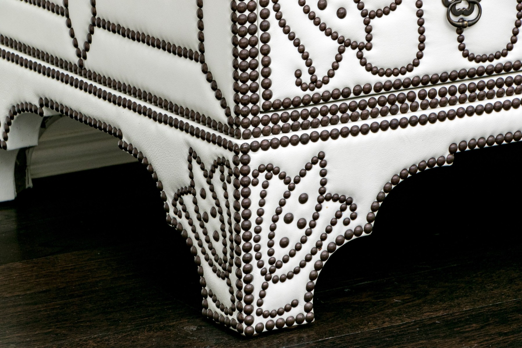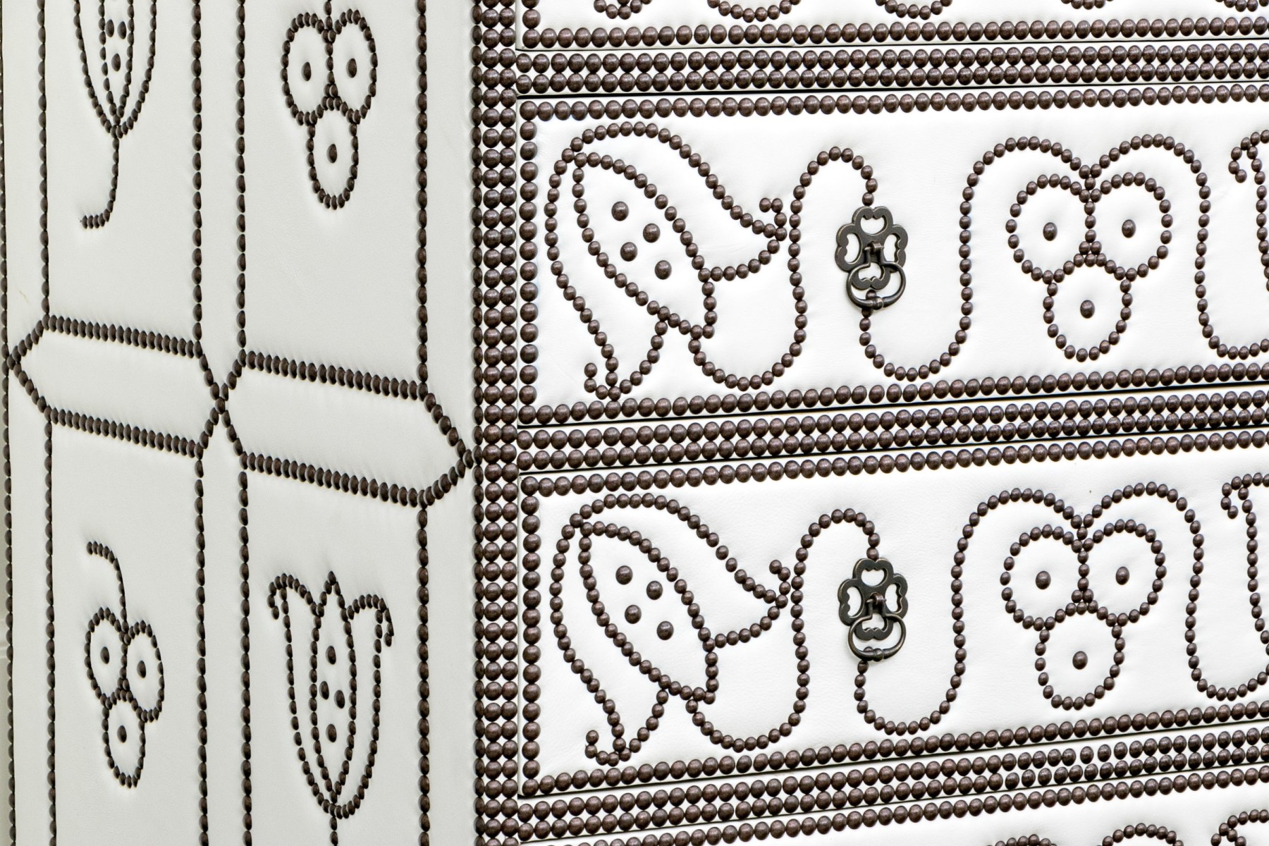 A striking Formations chest of drawers with a distinctive appearance blending tradition and modernity. The simple, rectangular profile is wrapped in white leather with eye-catching nailhead designs of traditional Dutch flower and berry motifs. The designs vine across four drawers, as well as along paneled designs on the sides and flourishes around bracket feet. The top is detailed with an open center flanked by vining borders, completing the design.