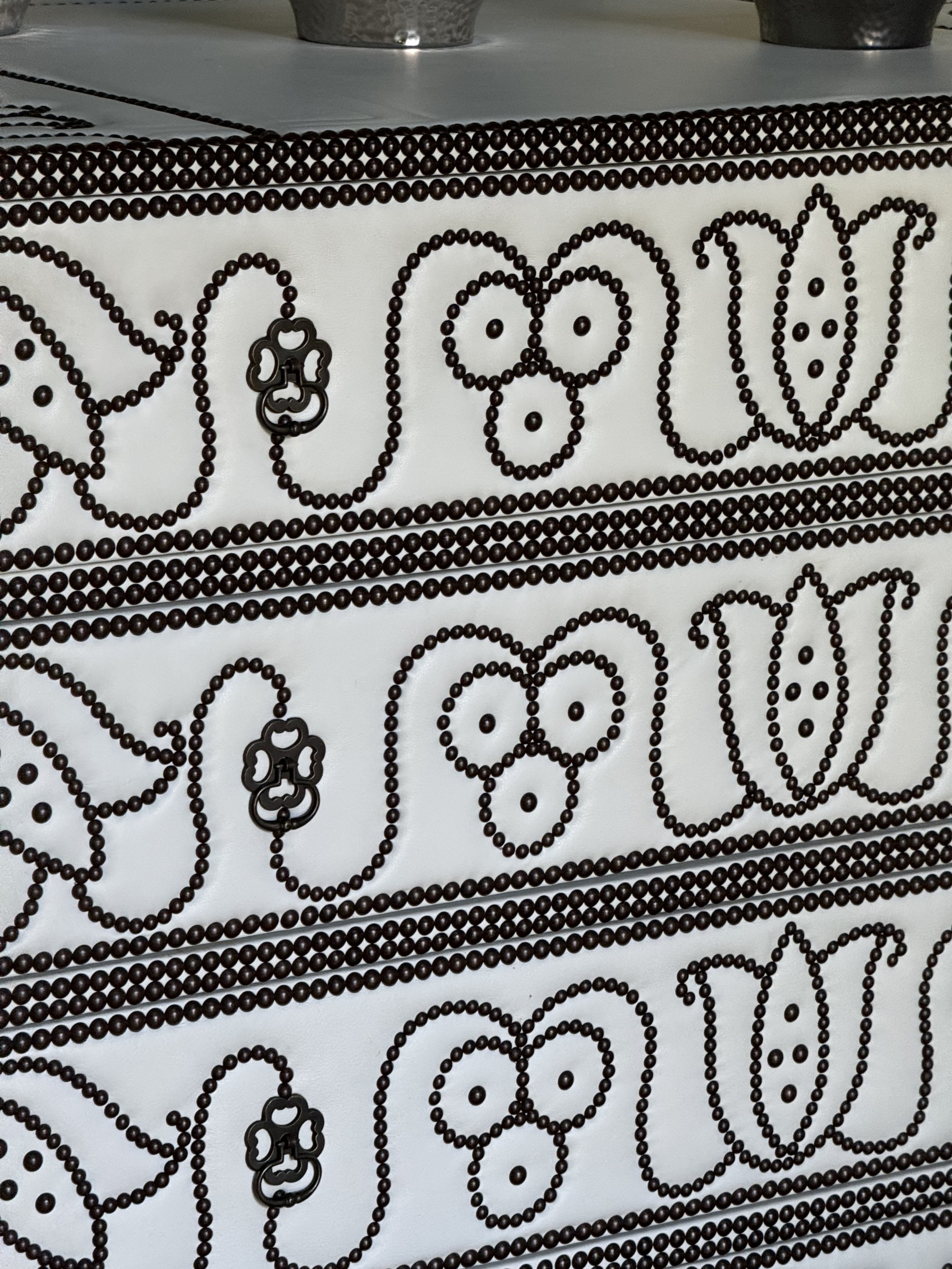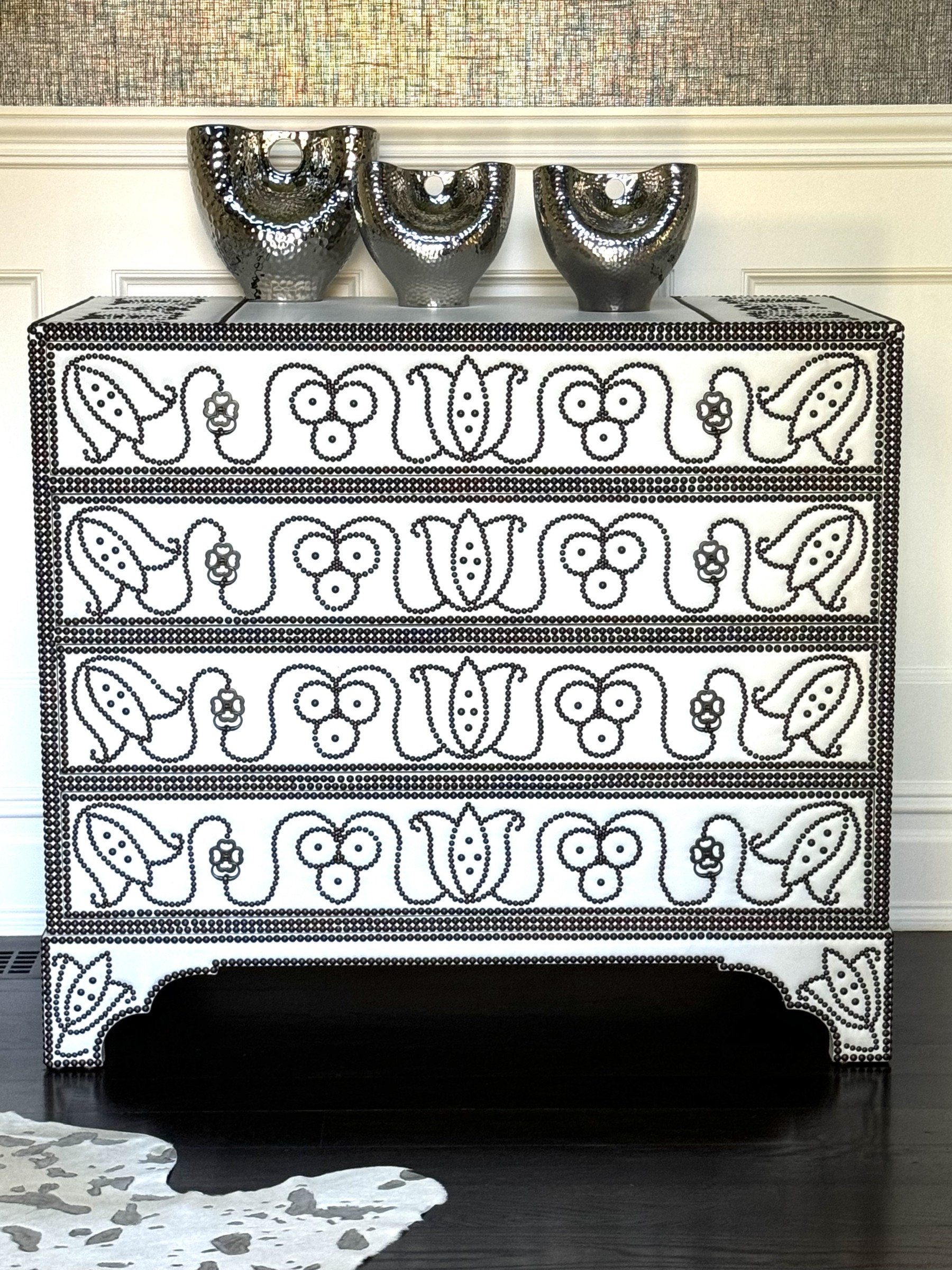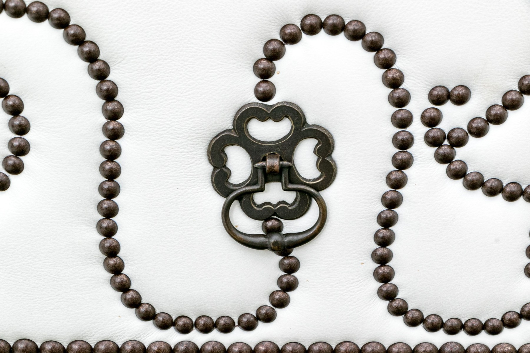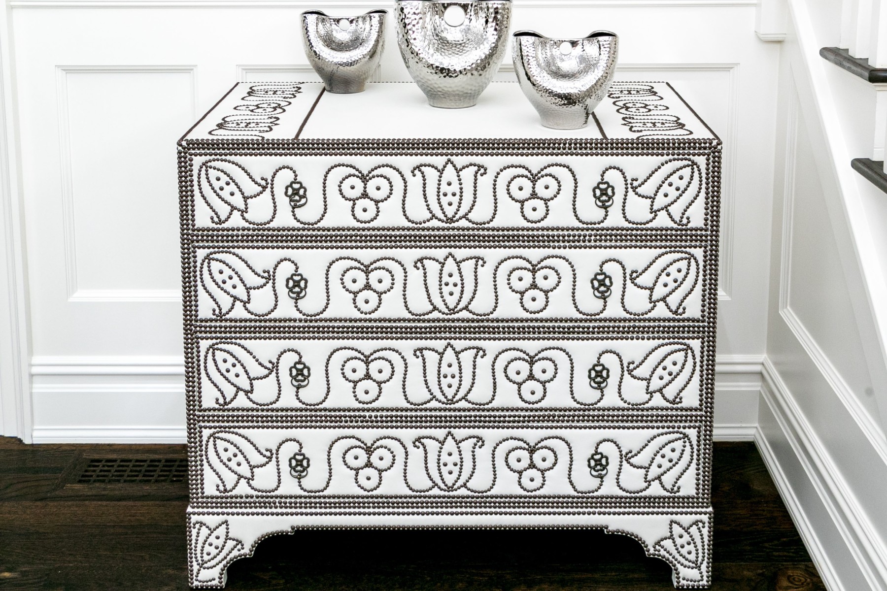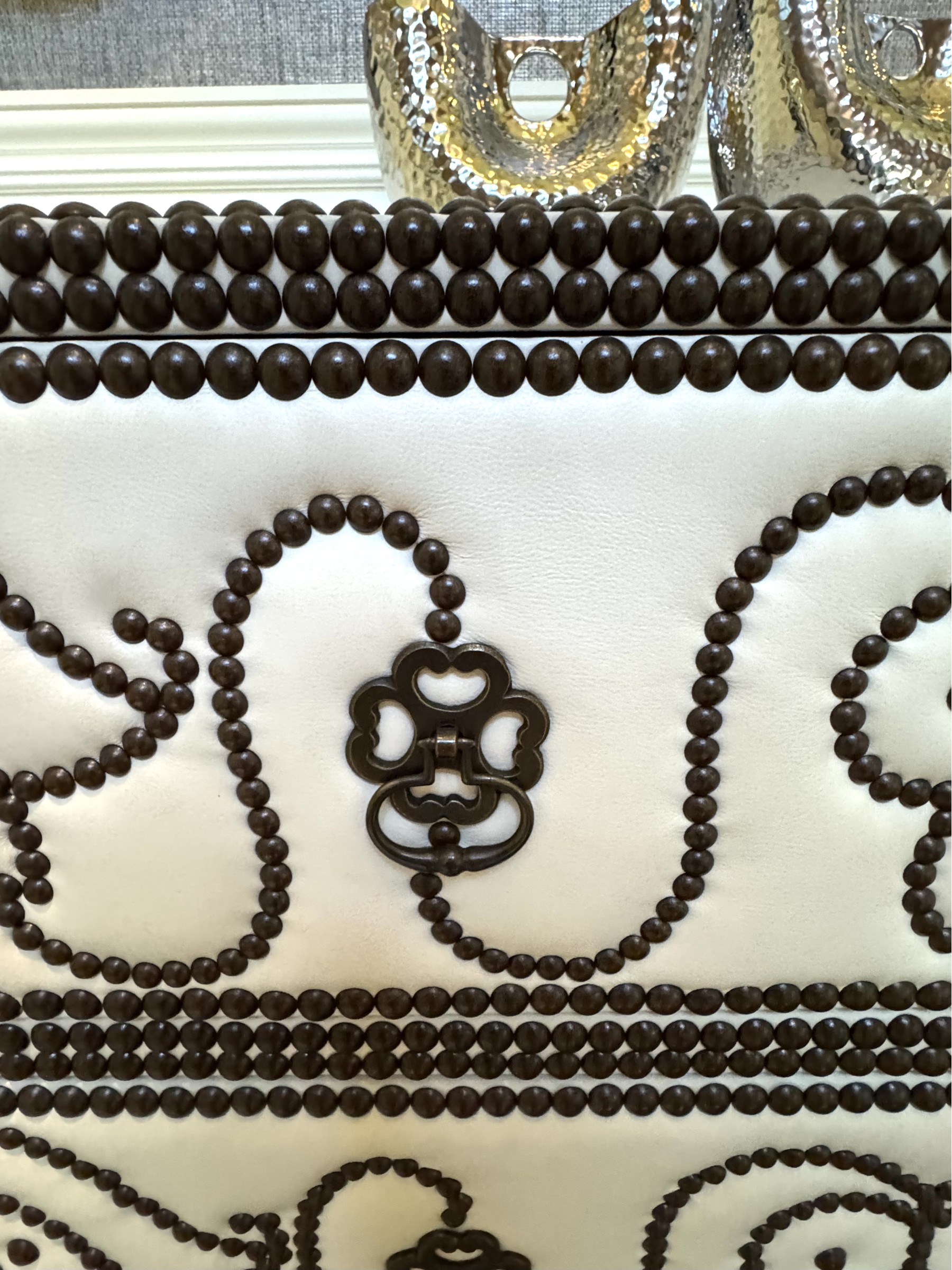A striking Formations chest of drawers with a distinctive appearance blending tradition and modernity. The simple, rectangular profile is wrapped in white leather with eye-catching nailhead designs of traditional Dutch flower and berry motifs. The designs vine across four drawers, as well as along paneled designs on the sides and flourishes around bracket feet. The top is detailed with an open center flanked by vining borders, completing the design.