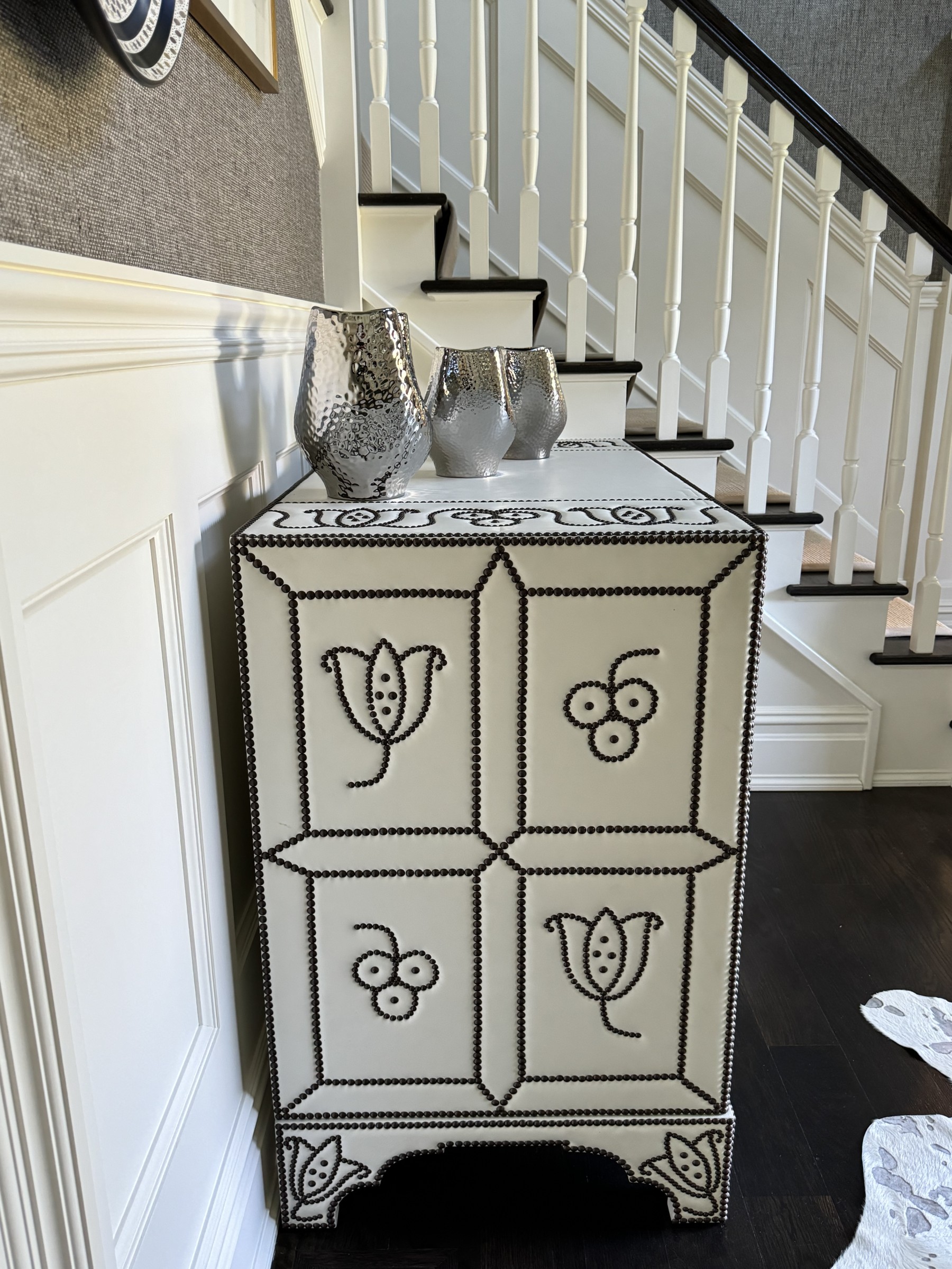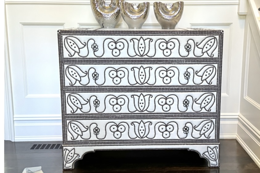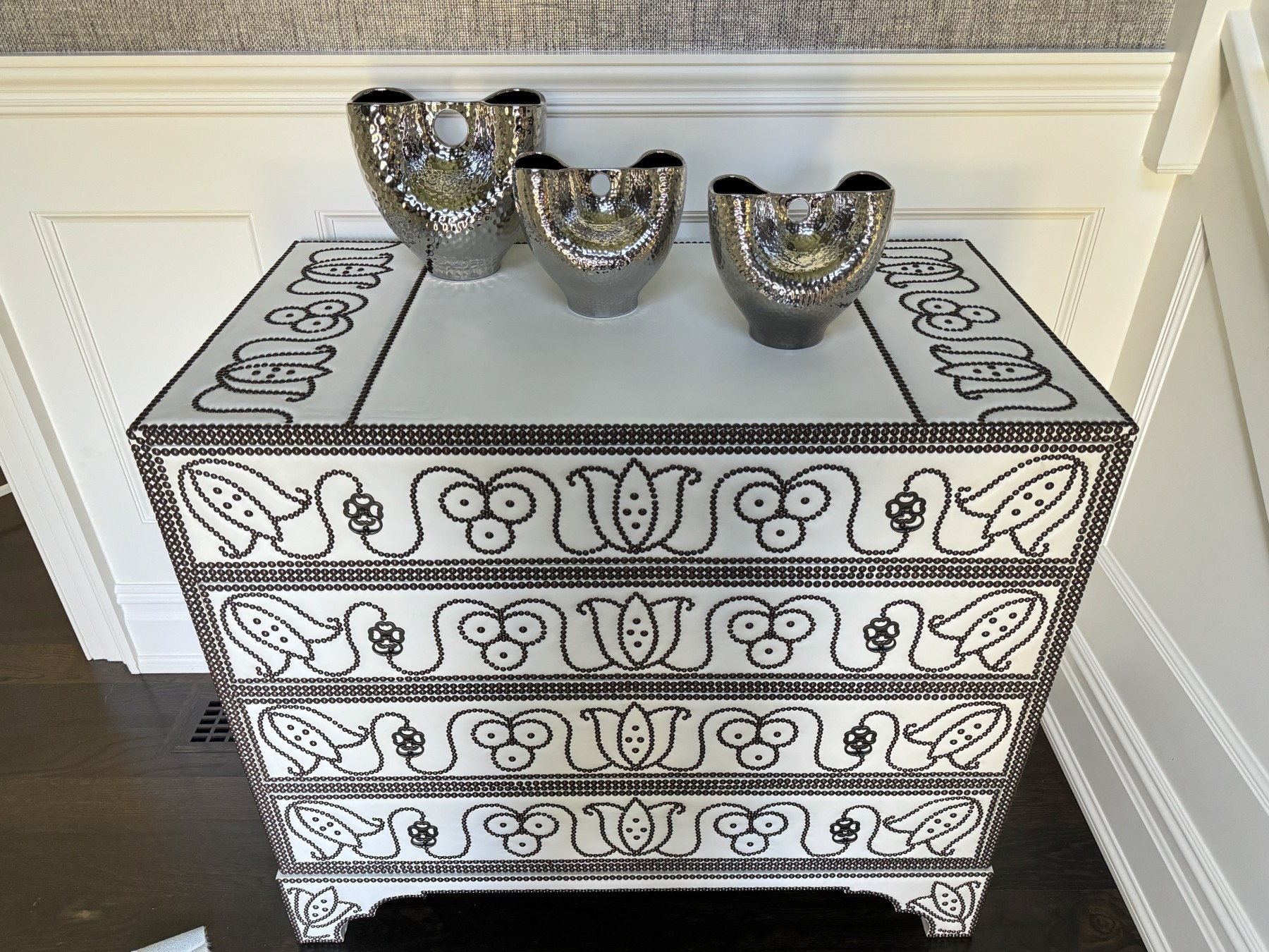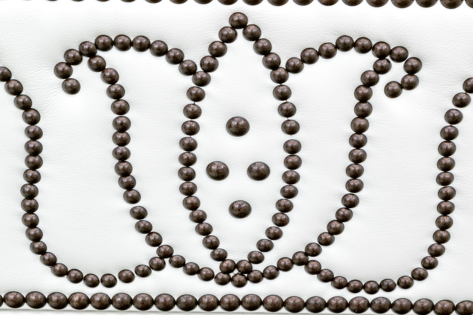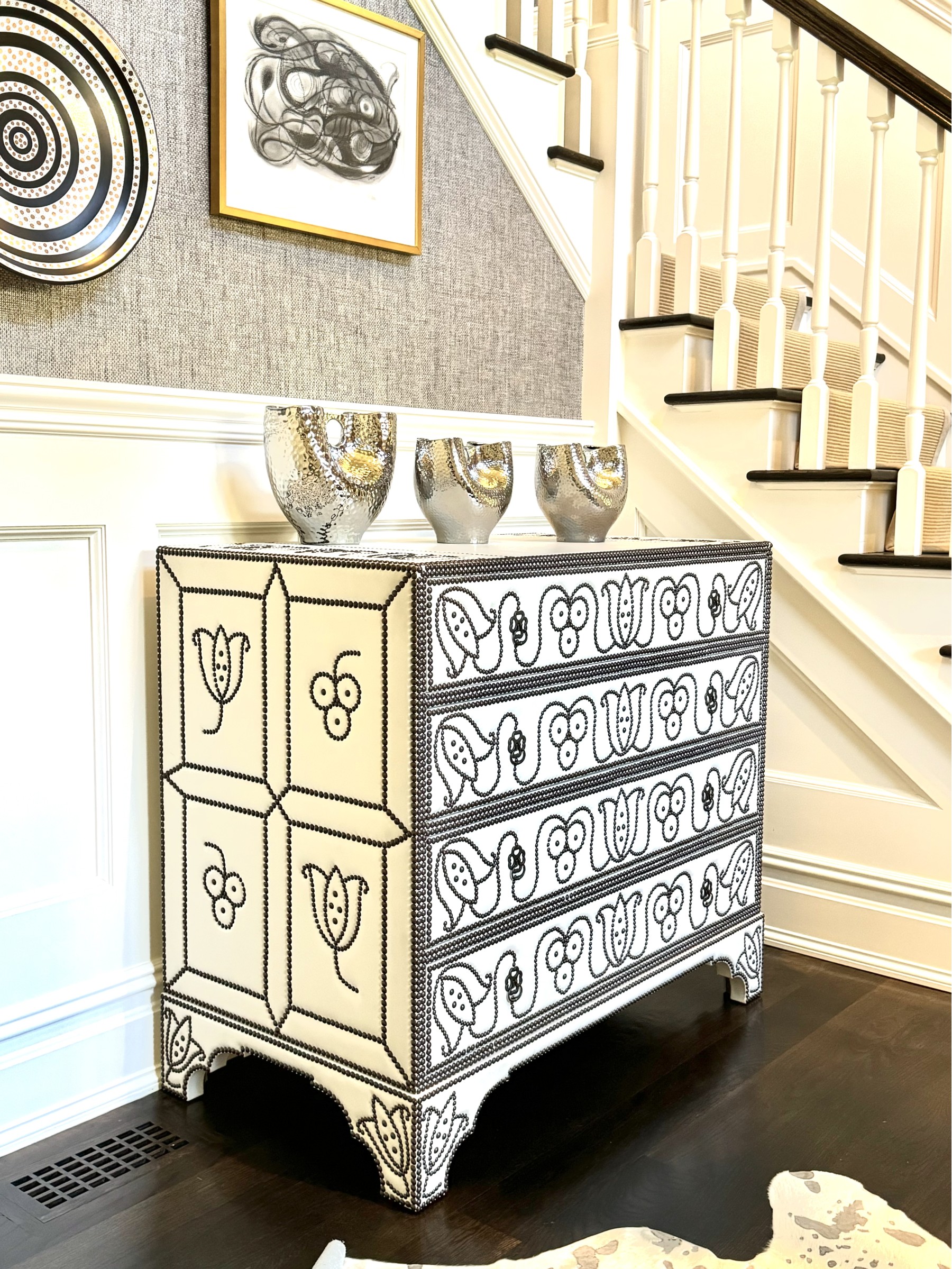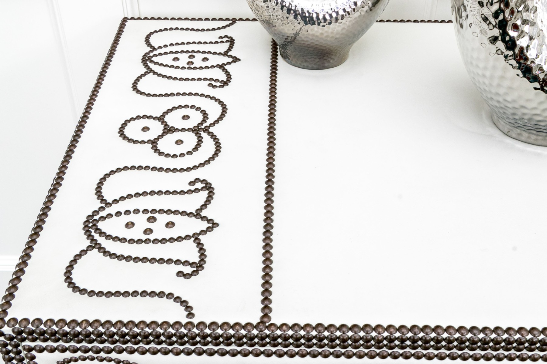 A striking Formations chest of drawers with a distinctive appearance blending tradition and modernity. The simple, rectangular profile is wrapped in white leather with eye-catching nailhead designs of traditional Dutch flower and berry motifs. The designs vine across four drawers, as well as along paneled designs on the sides and flourishes around bracket feet. The top is detailed with an open center flanked by vining borders, completing the design.