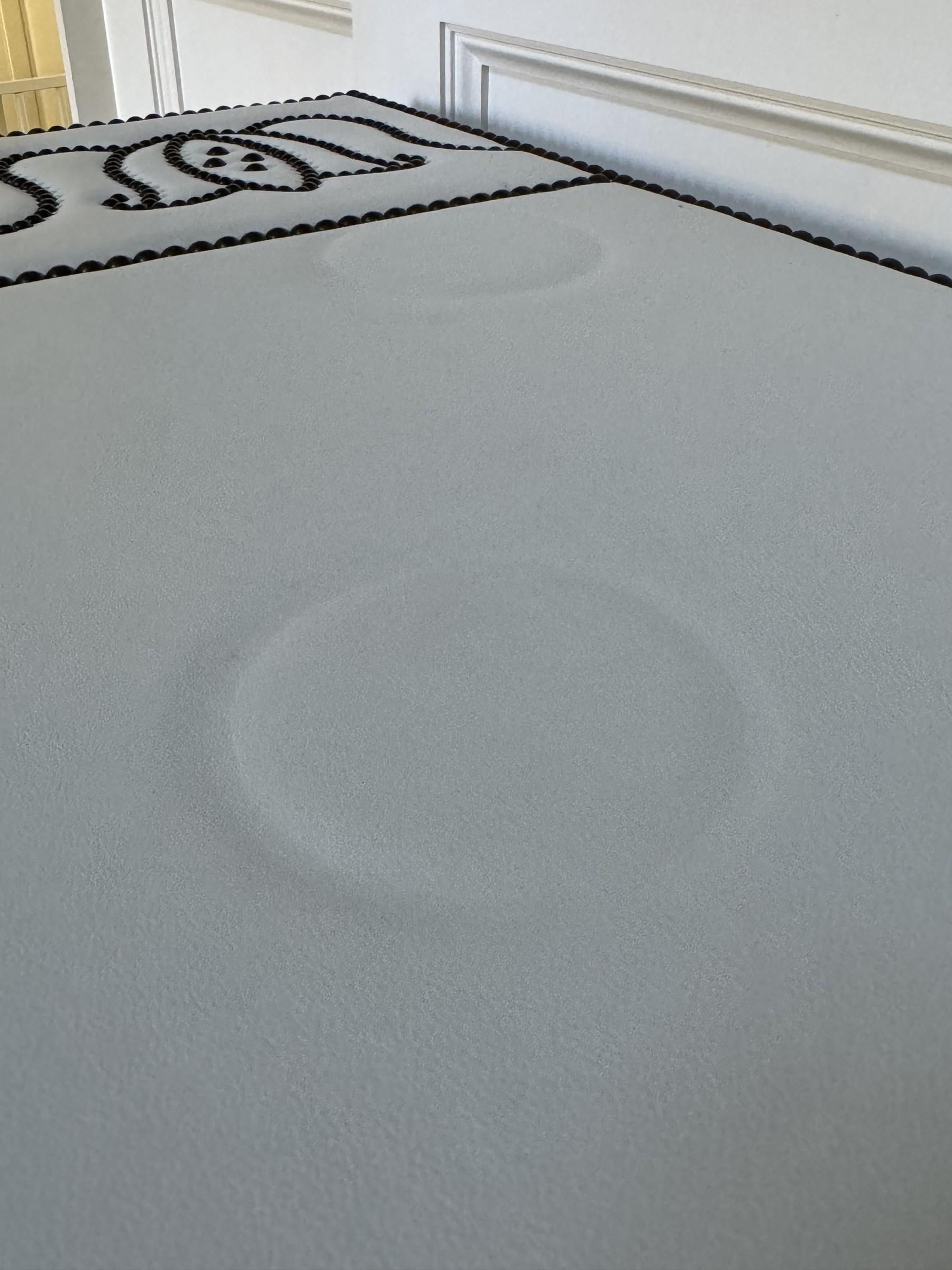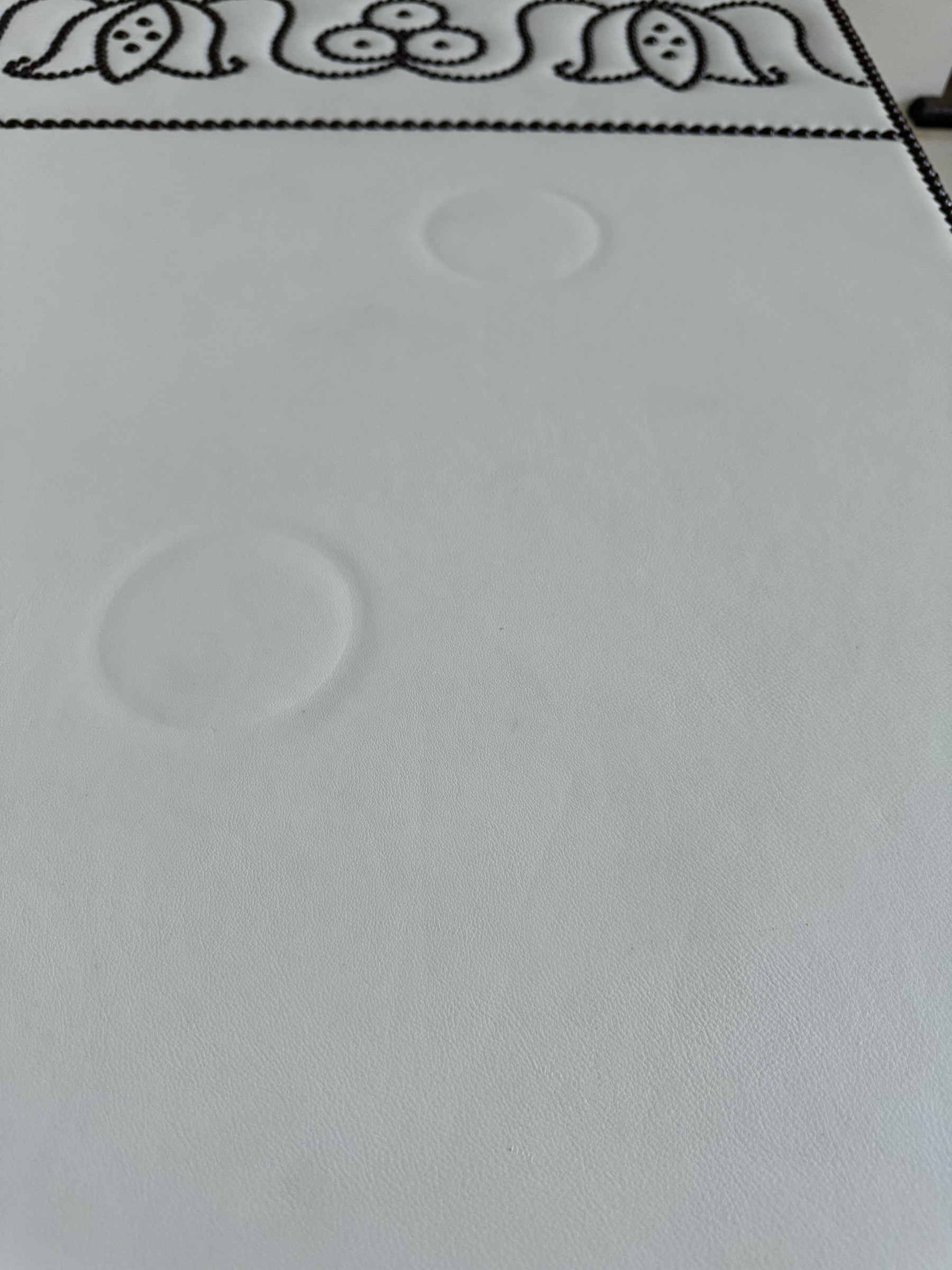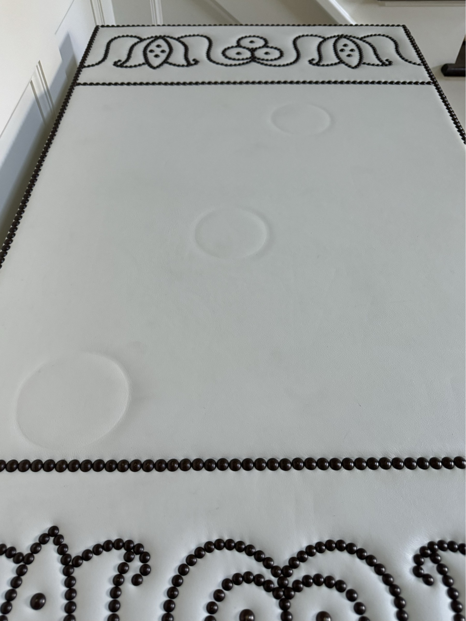 Presents well overall, from a pristine and well maintained home. The three decorative jars atop it have left subtle indents to the leather, which may relax with time.