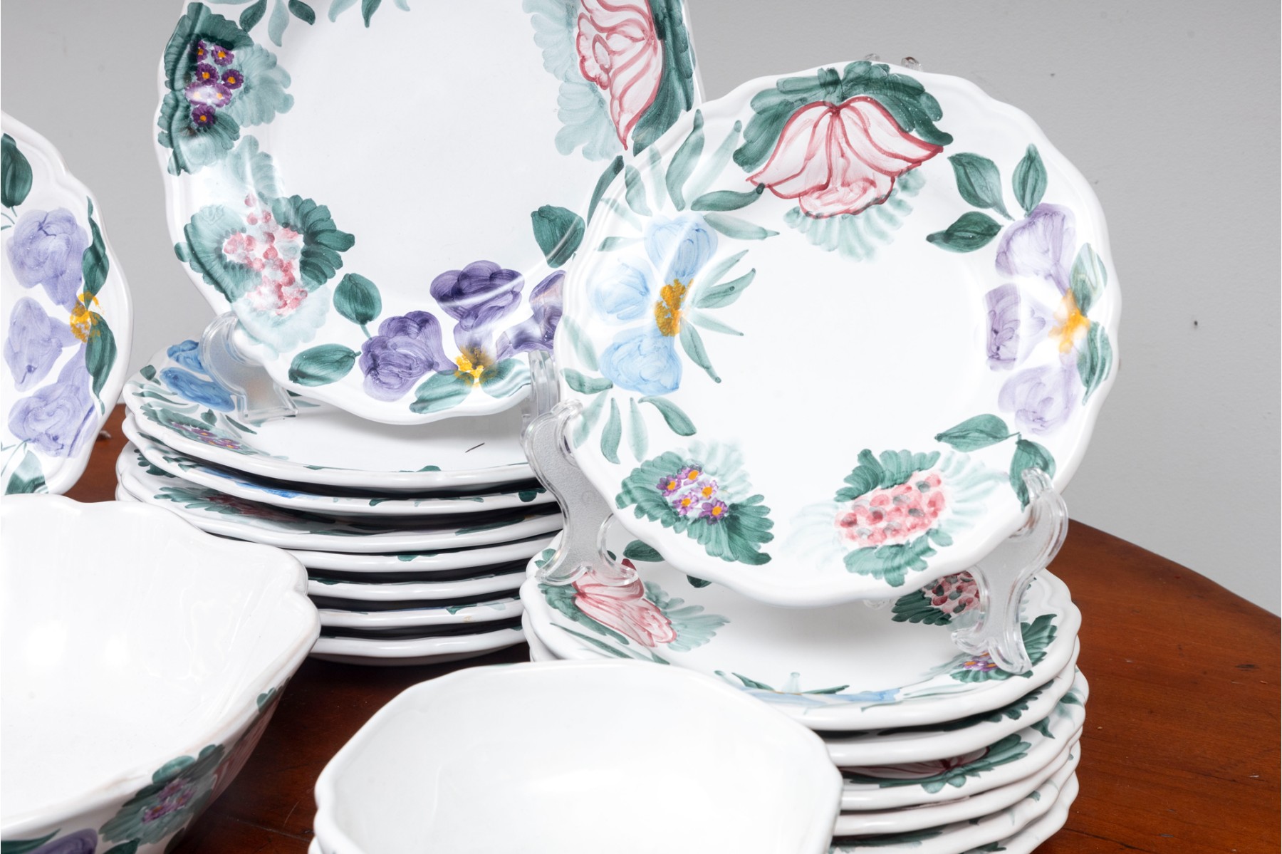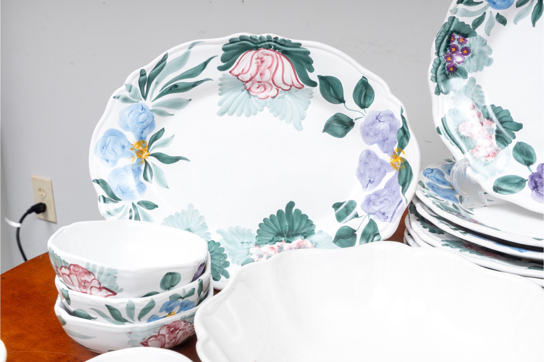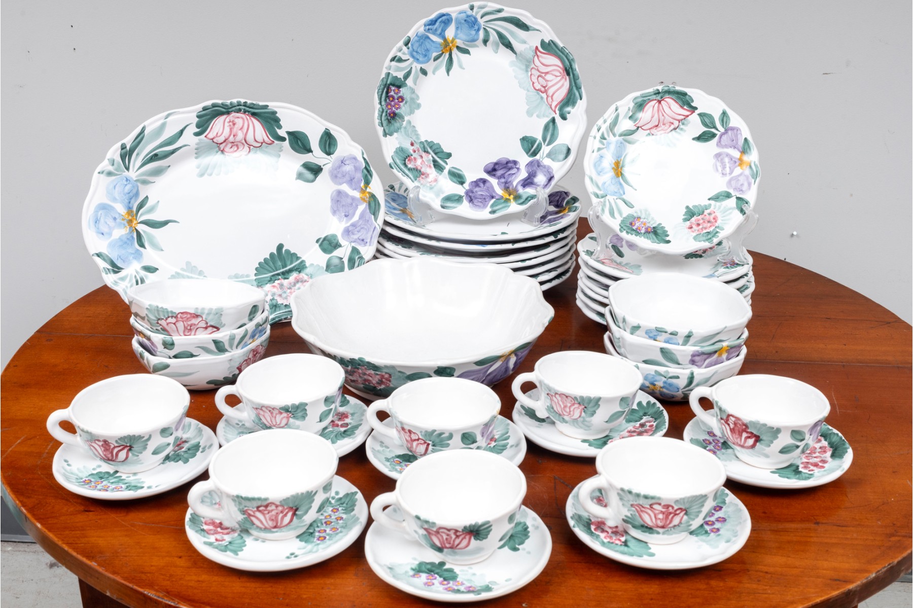 A service for eight, hand-painted Fortebaccia Caramiche Italian dish set emblazoned with beautiful polychrome florals throughout over a pure white glaze. See photos for details