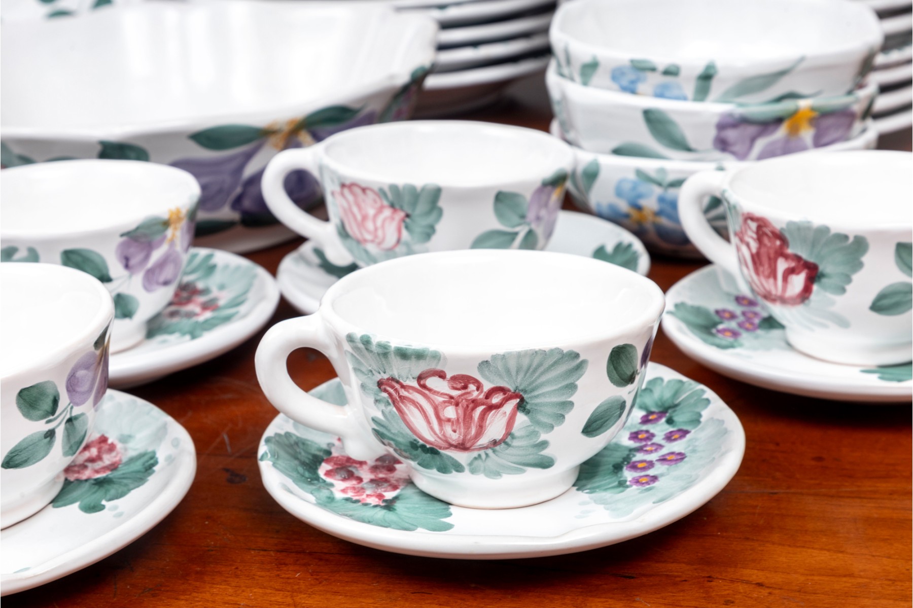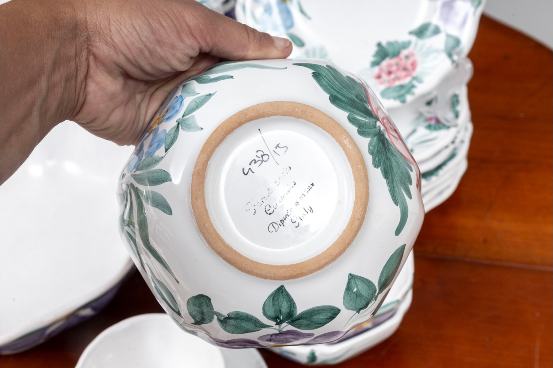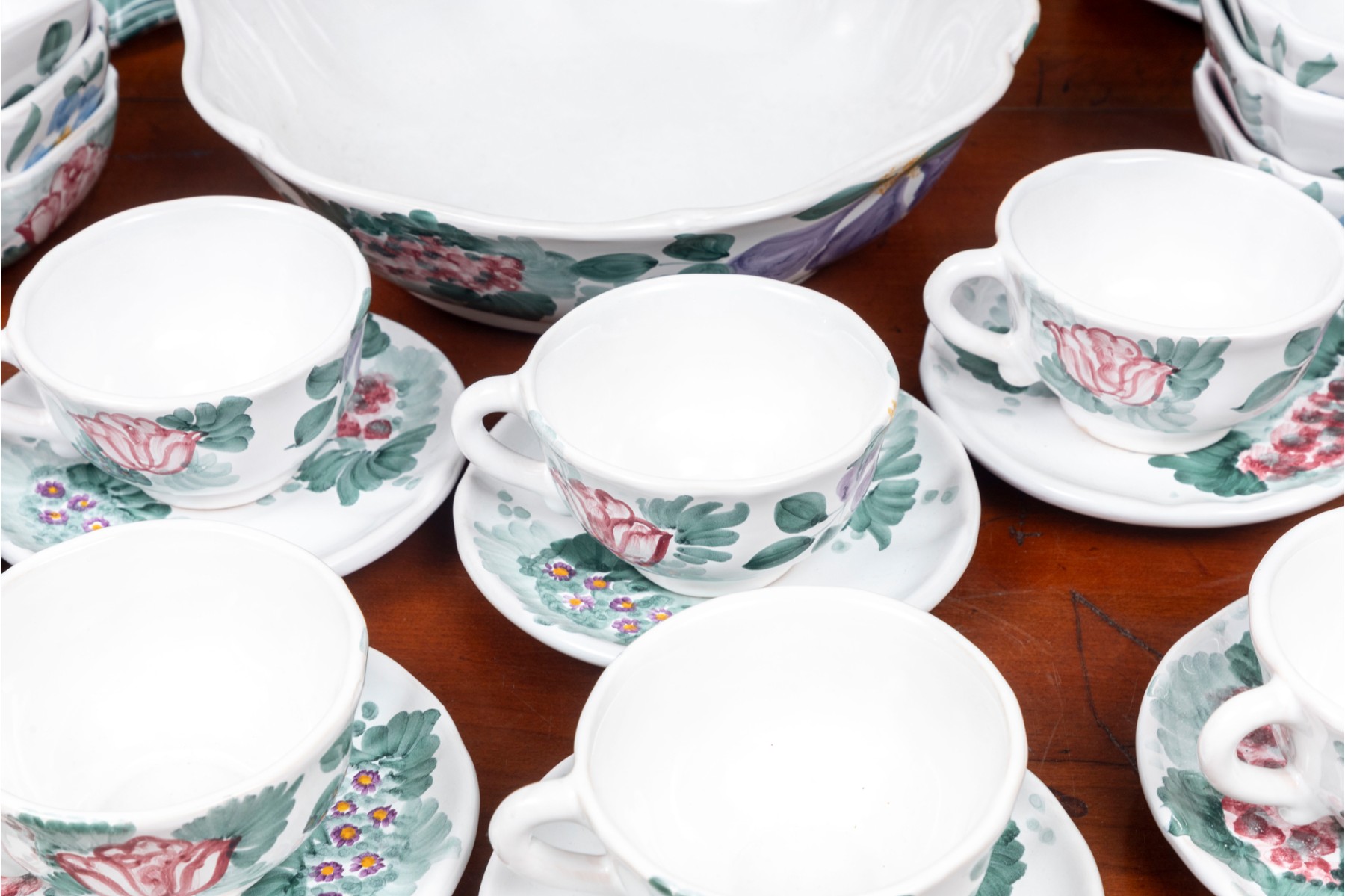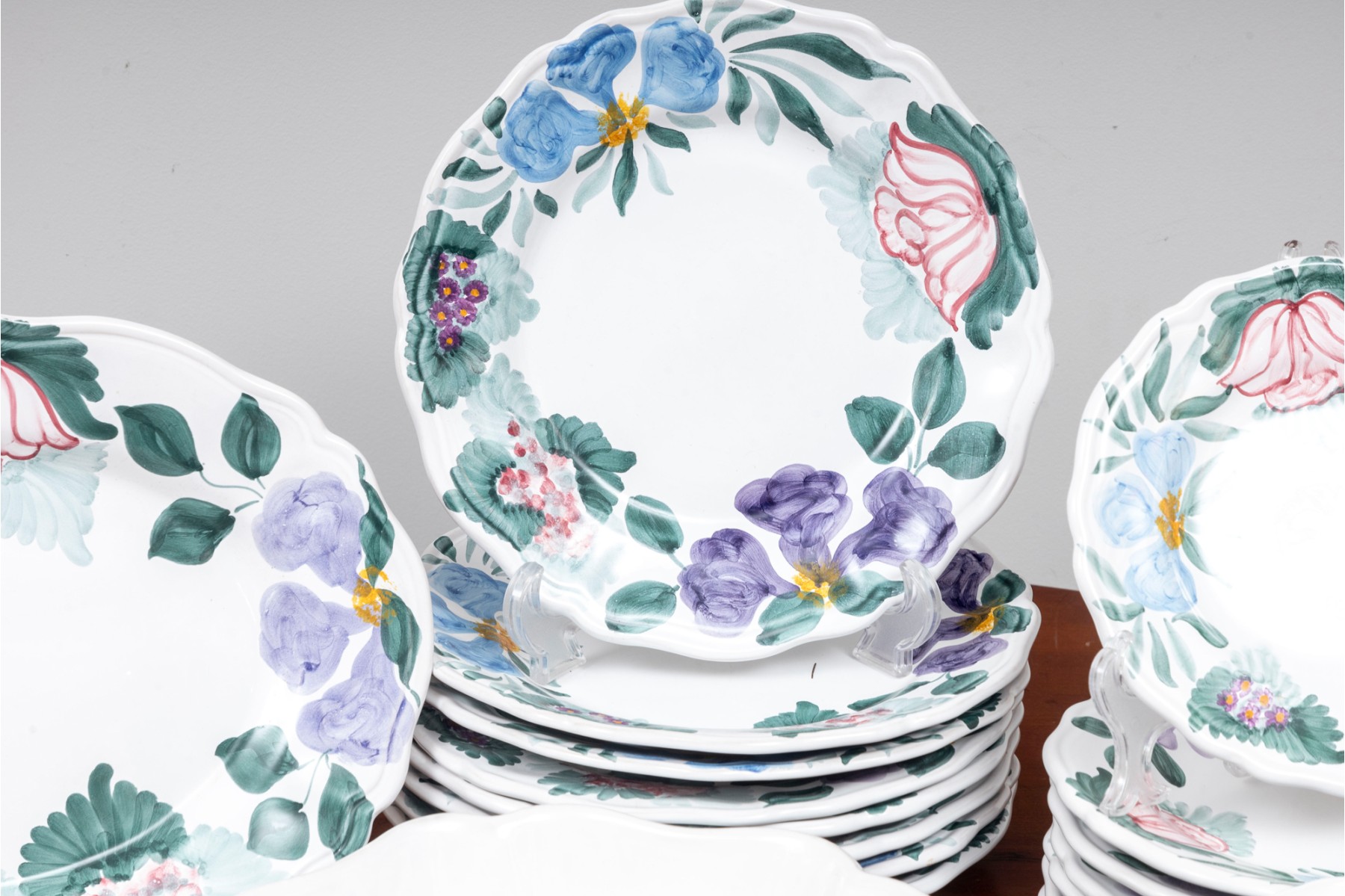 A service for eight, hand-painted Fortebaccia Caramiche Italian dish set emblazoned with beautiful polychrome florals throughout over a pure white glaze. See photos for details