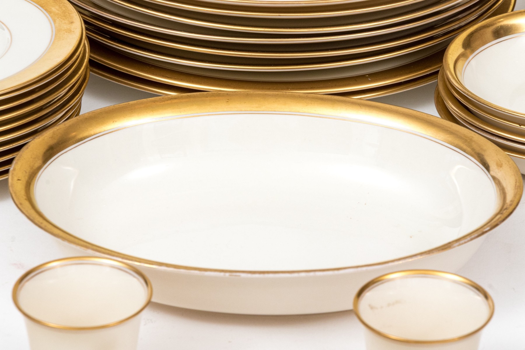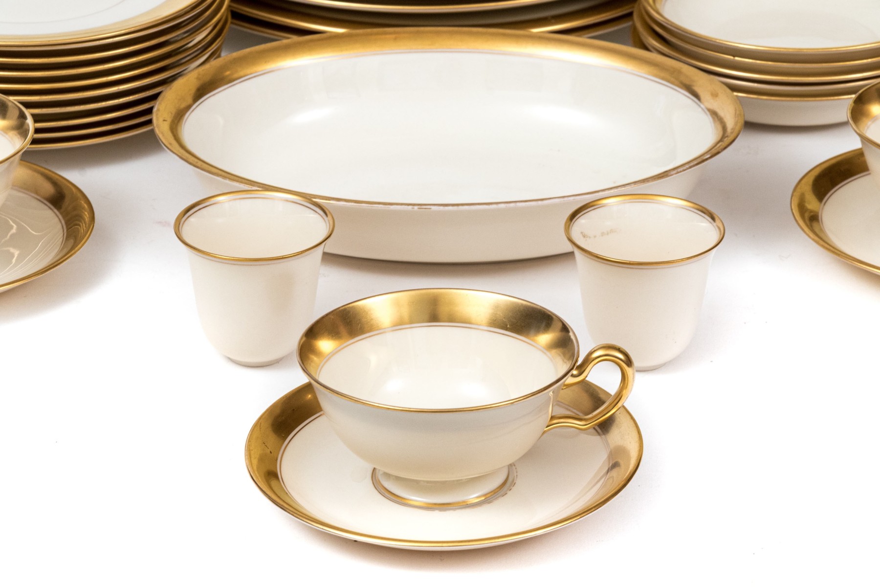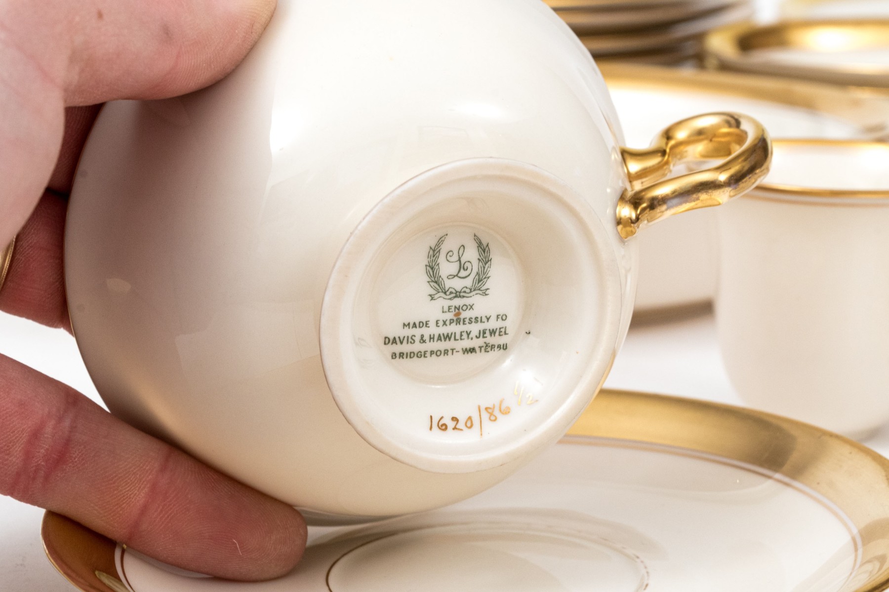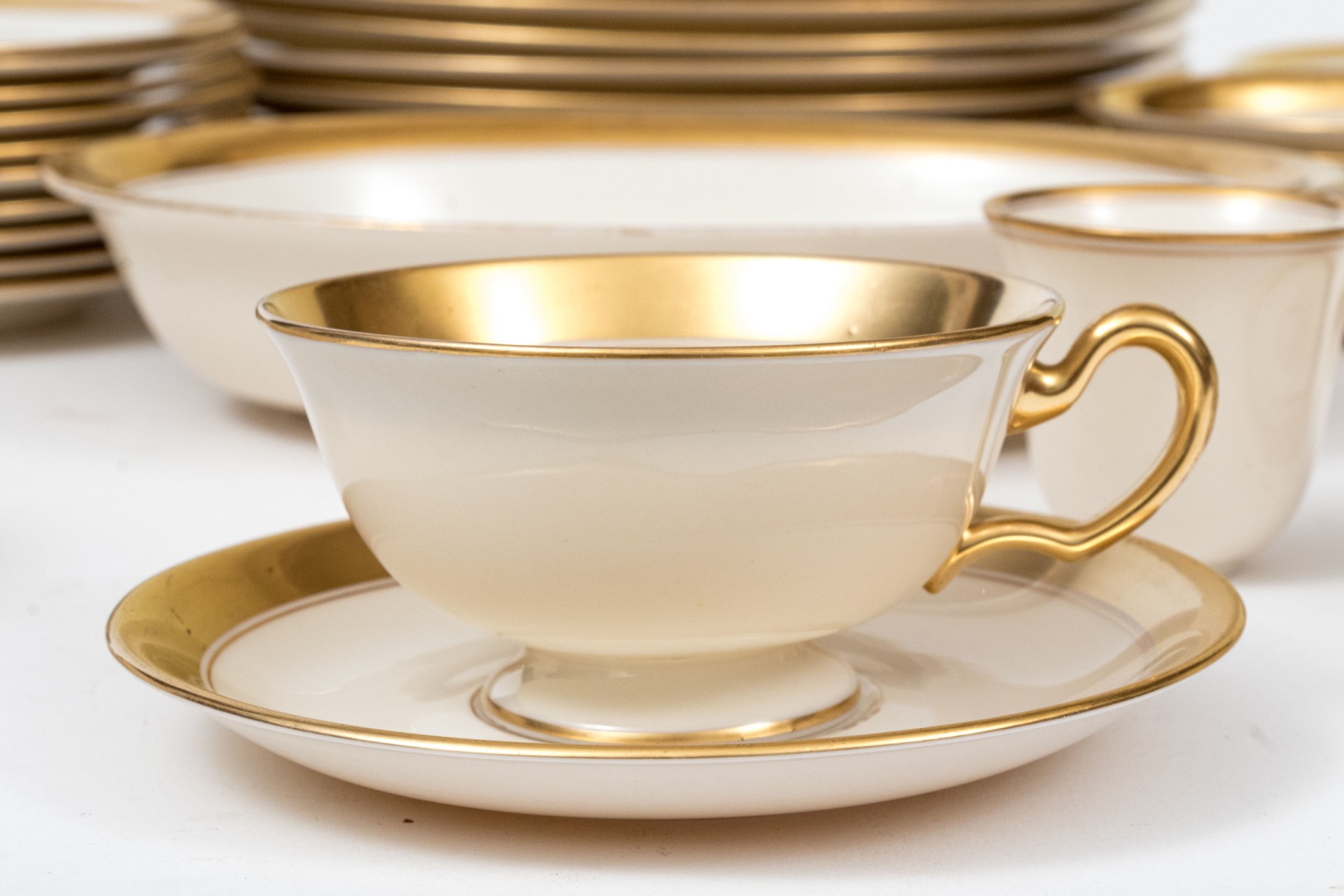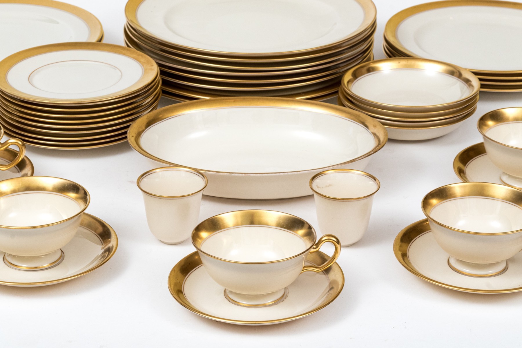 An extensive collection of Lenox "86 1-2" china service made expressly for Davis & Hawley Jewelers, Bridgeport-Waterbury, Connecticut. The pieces features sleek, cream white bodies with richly gilt rims followed by thin gilt stripes.